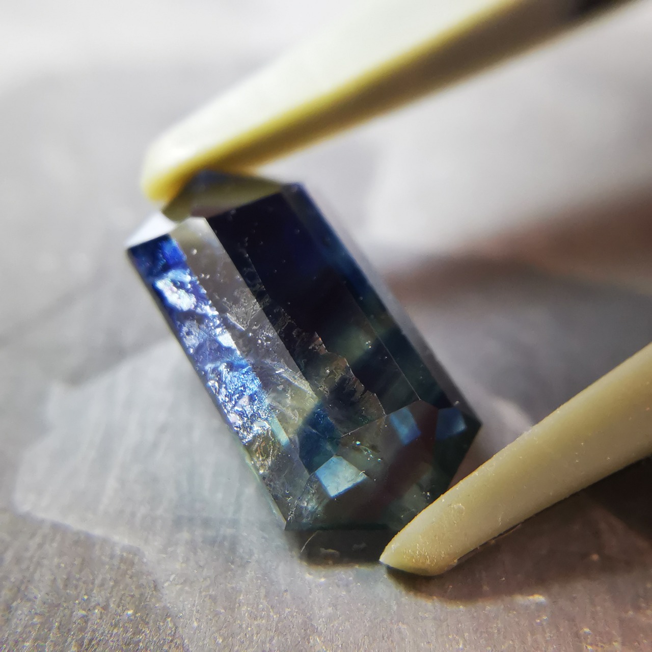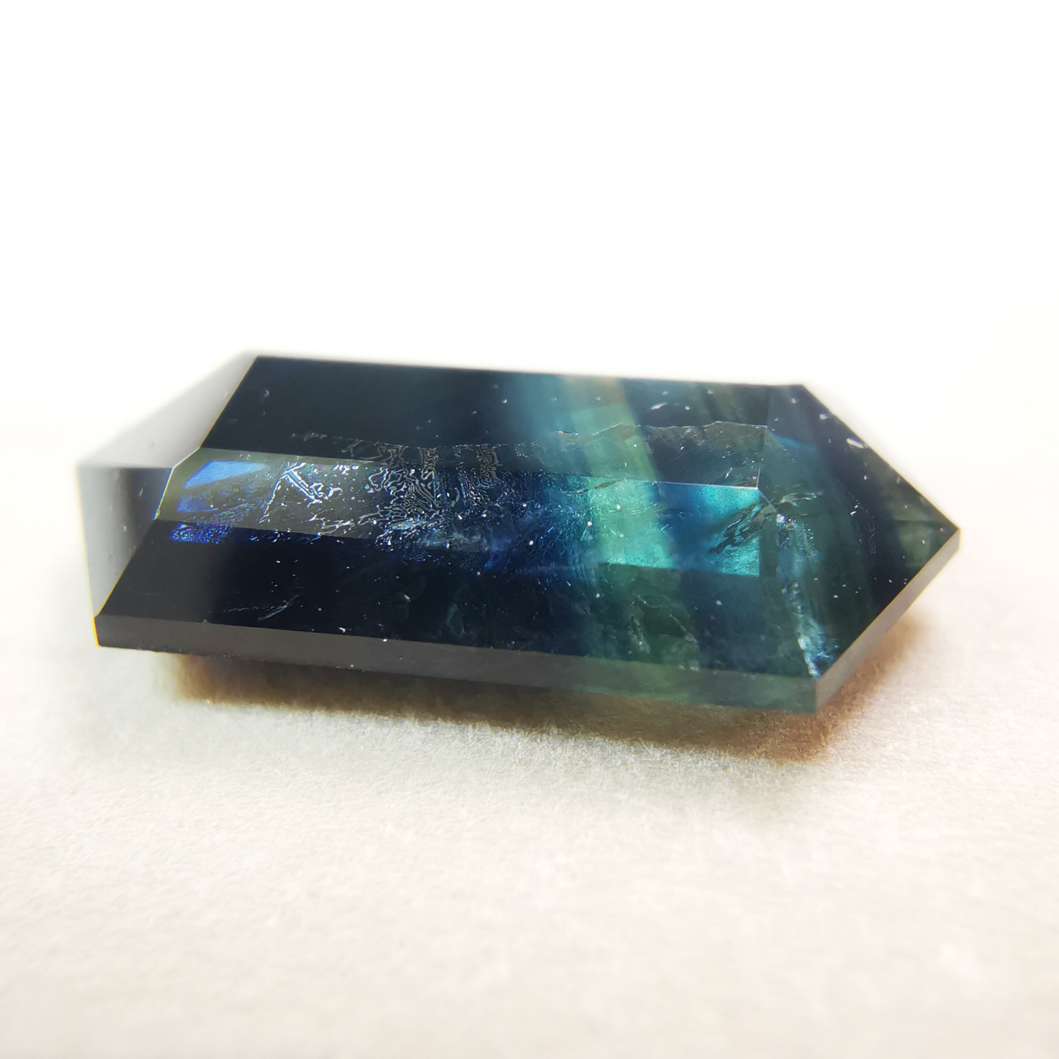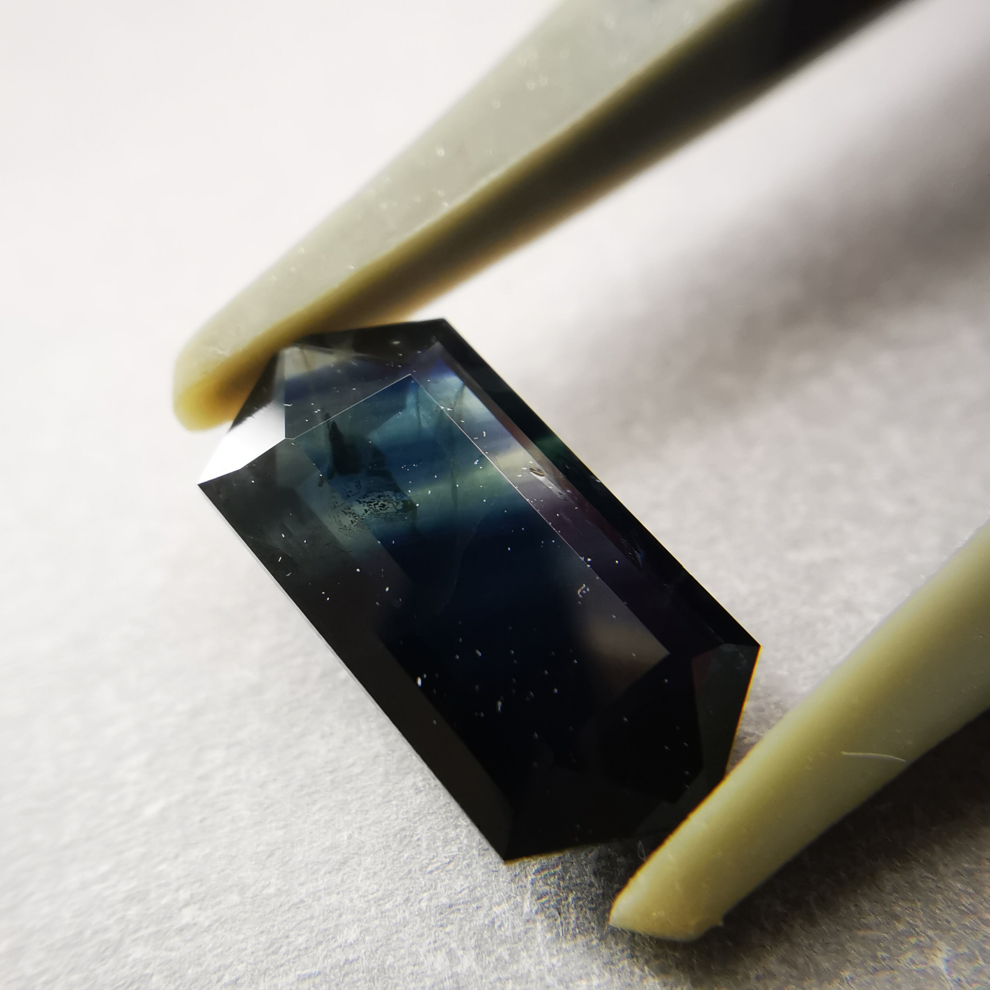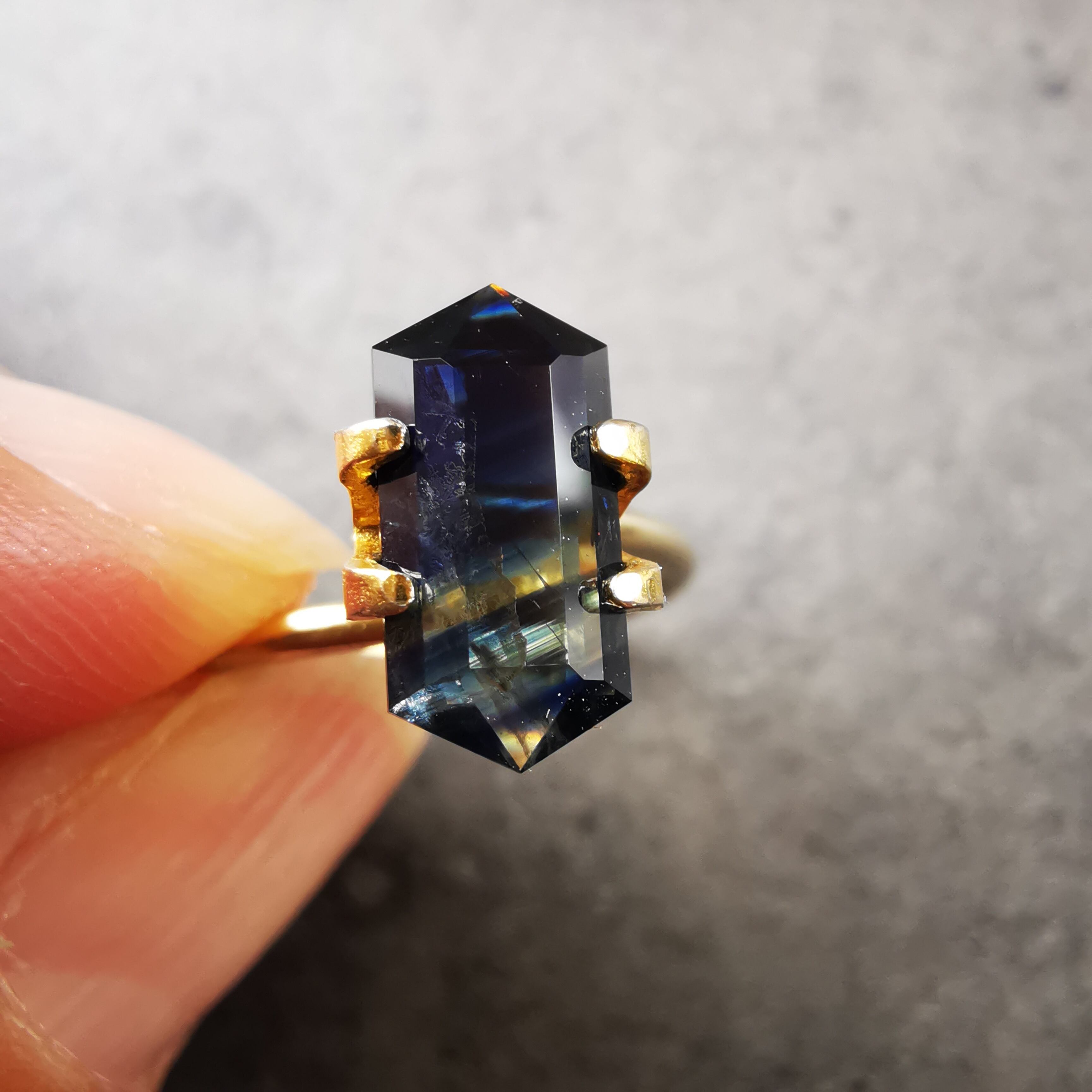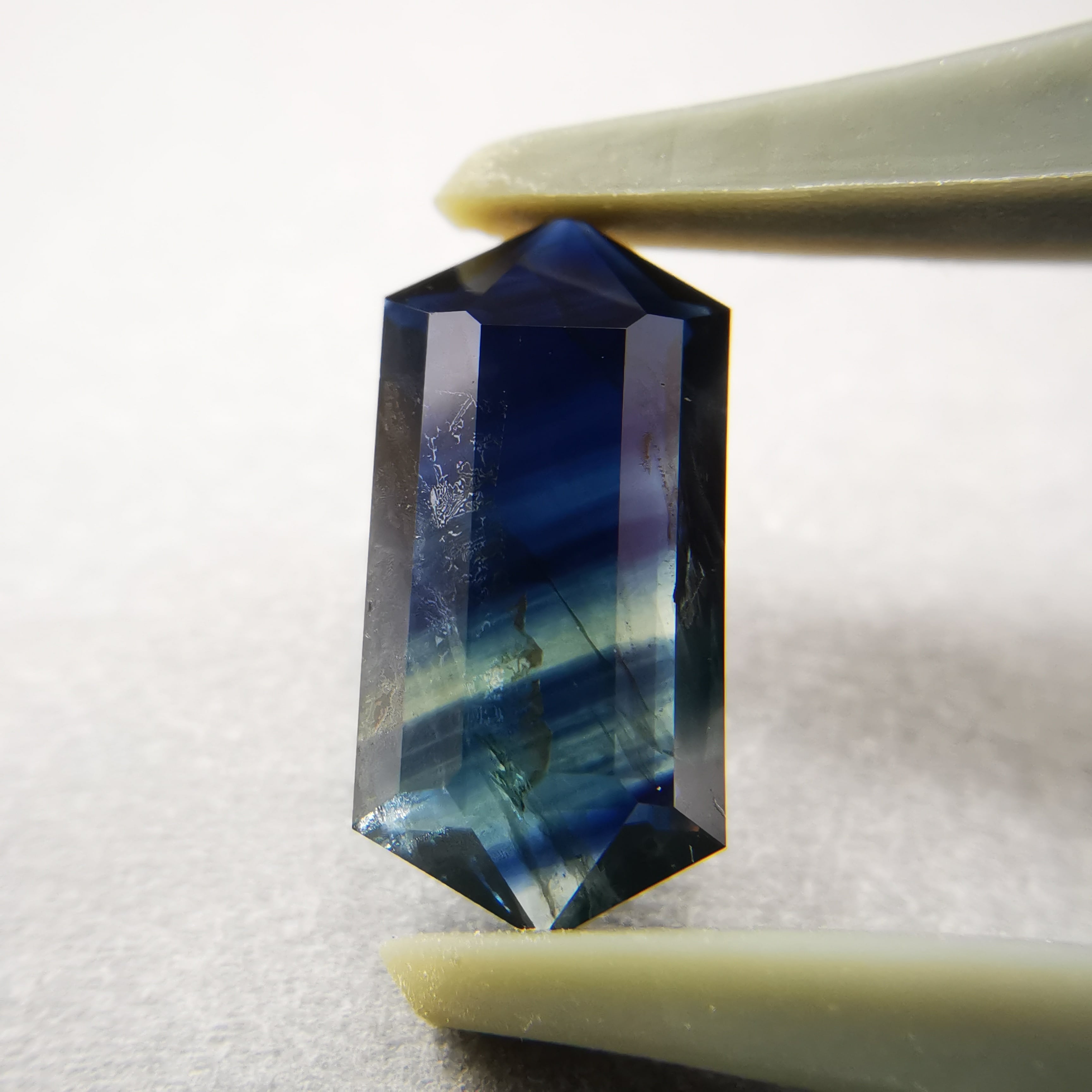 オーストラリア産らしい、暗く硬派な濃藍色が、下に行くにつれて縞模様を描くサファイアです。