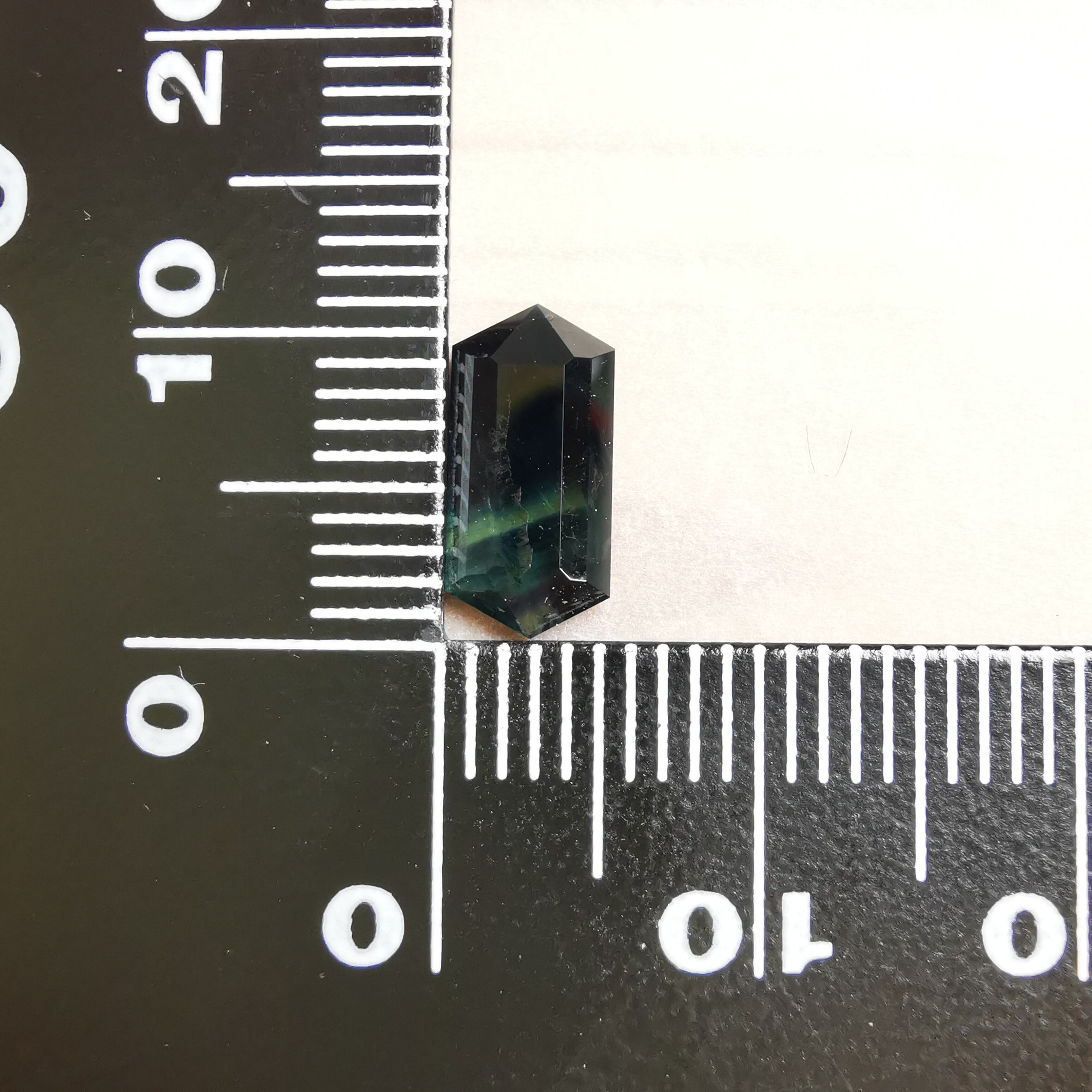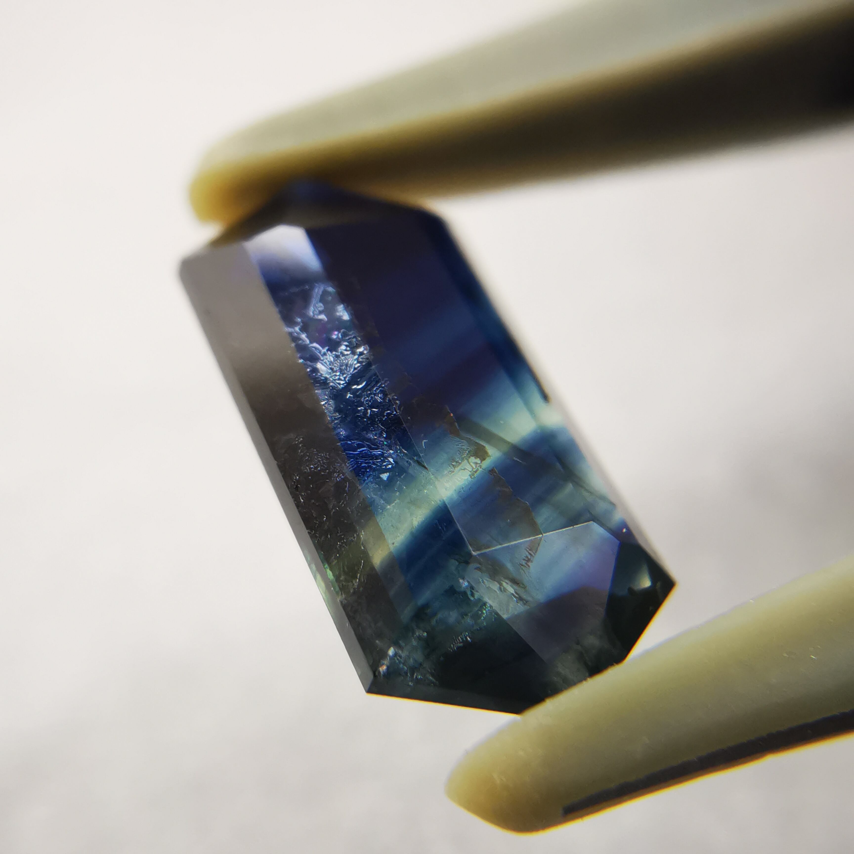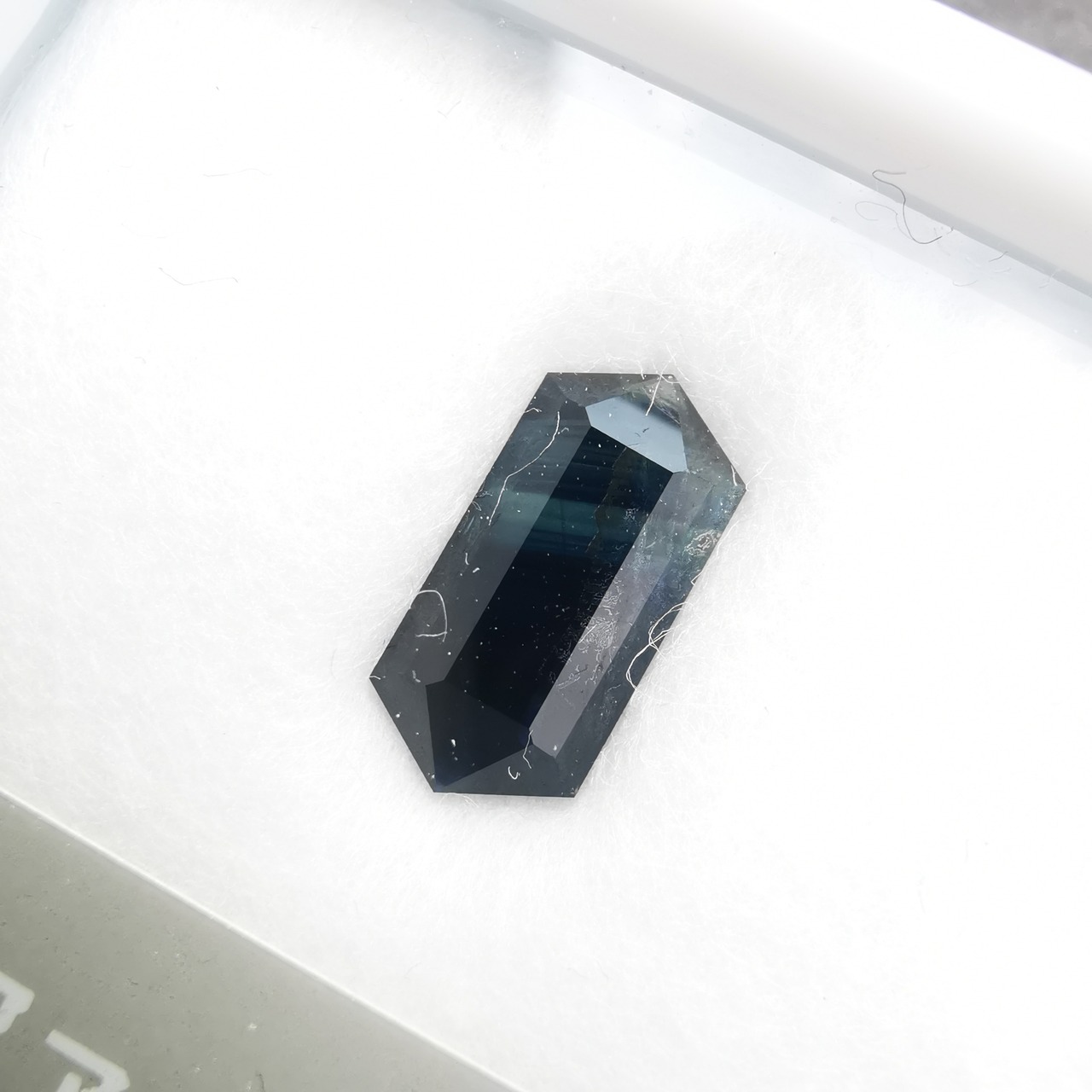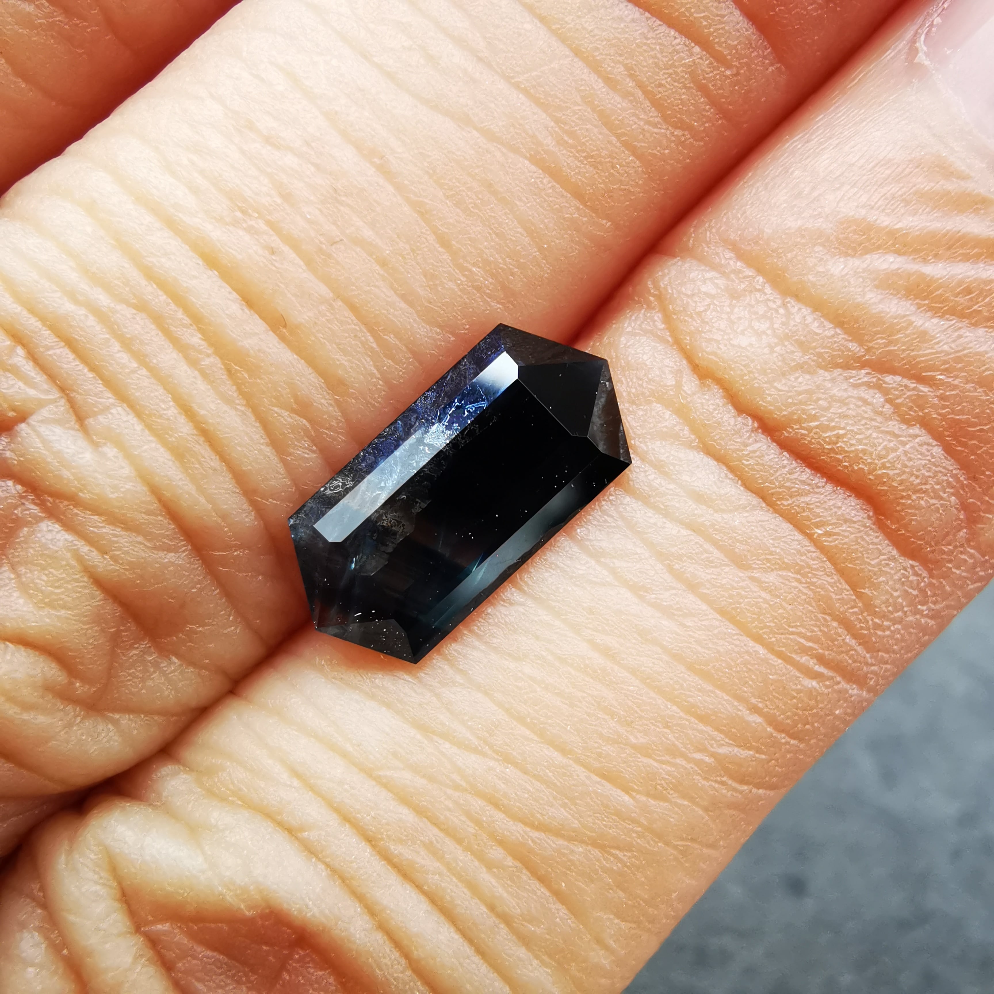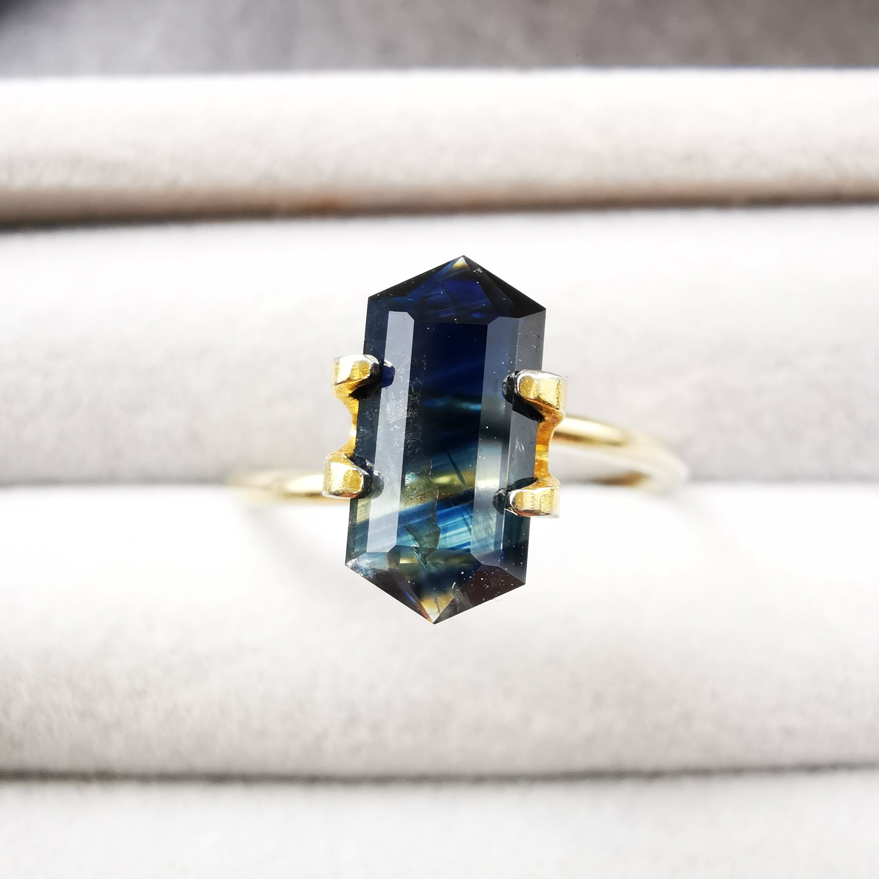 オーストラリア産らしい、暗く硬派な濃藍色が、下に行くにつれて縞模様を描くサファイアです。