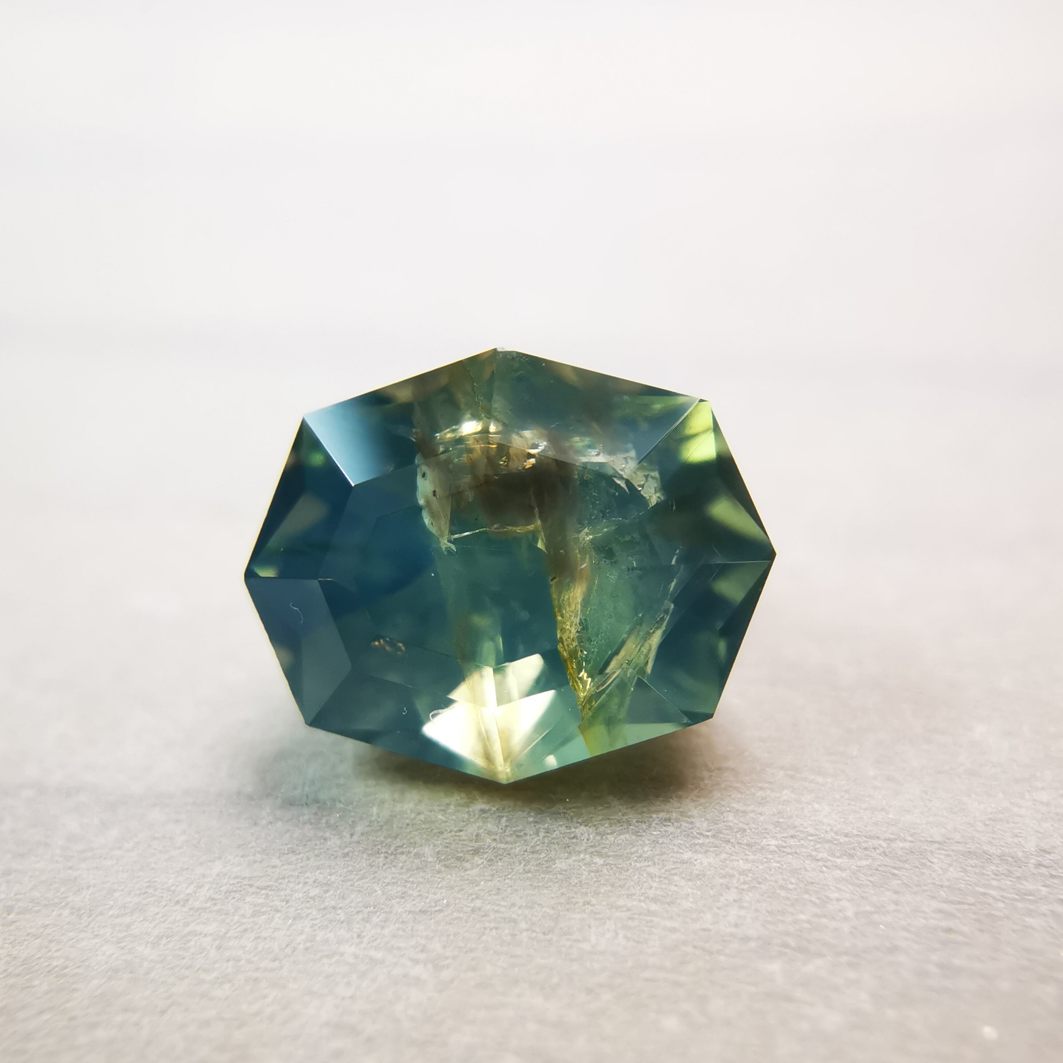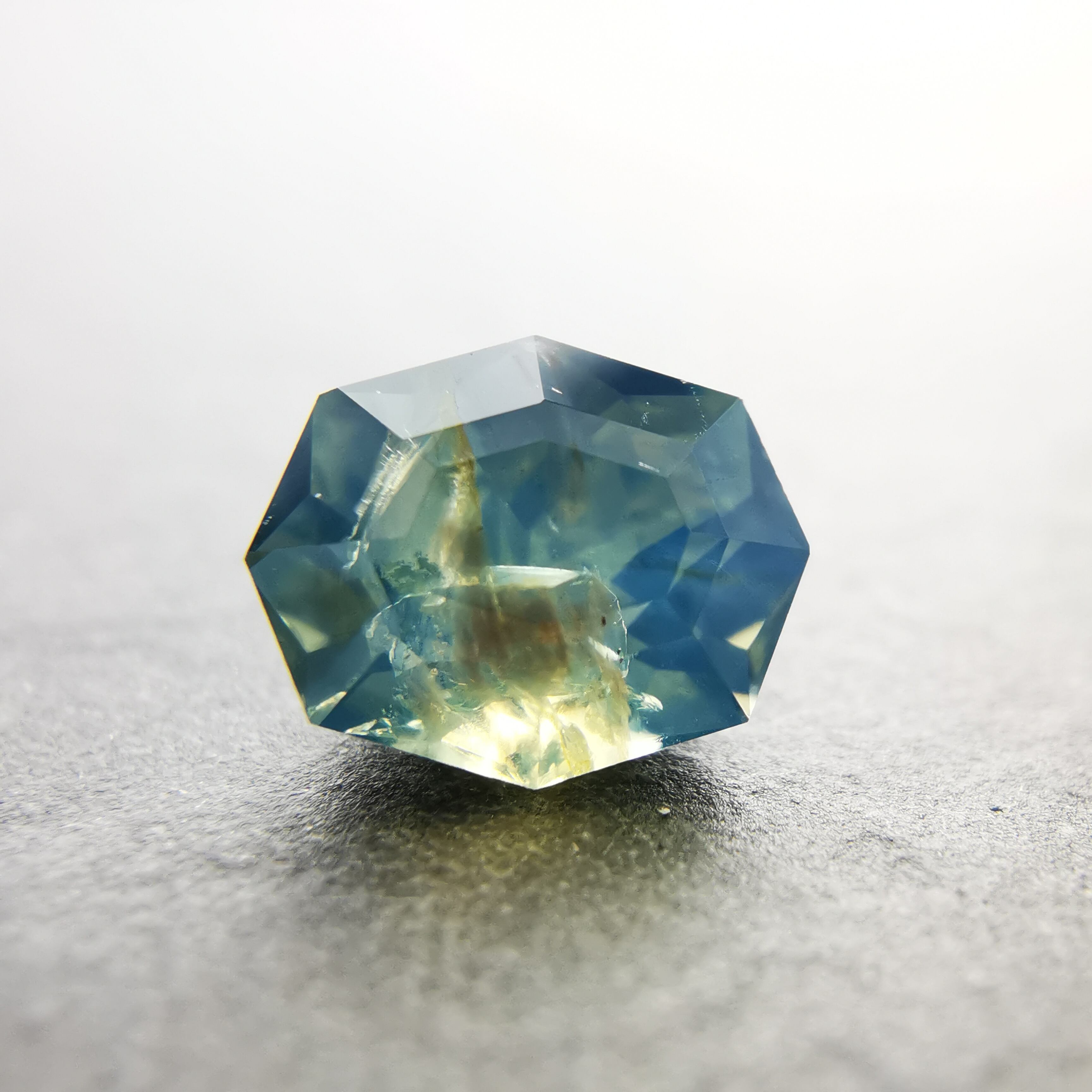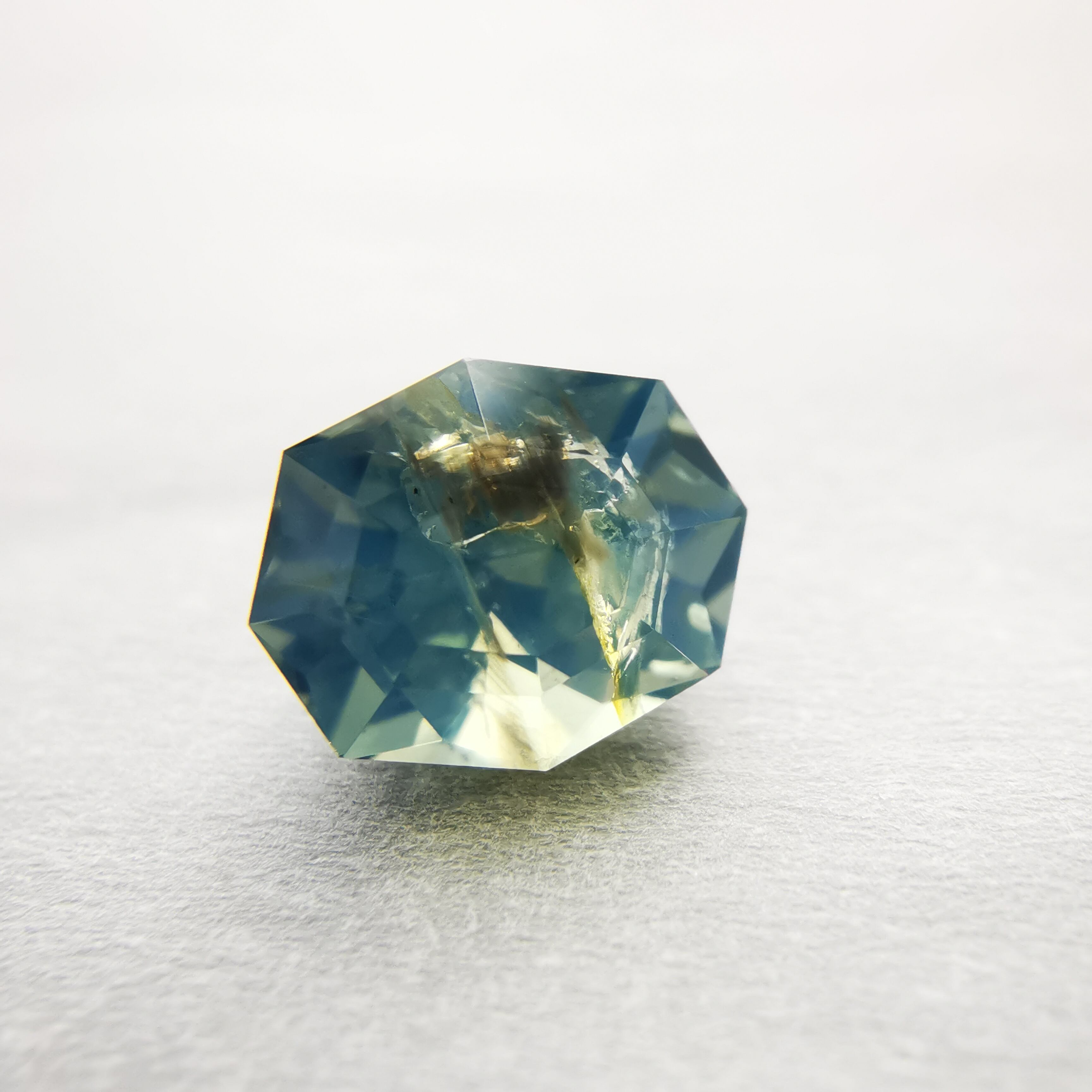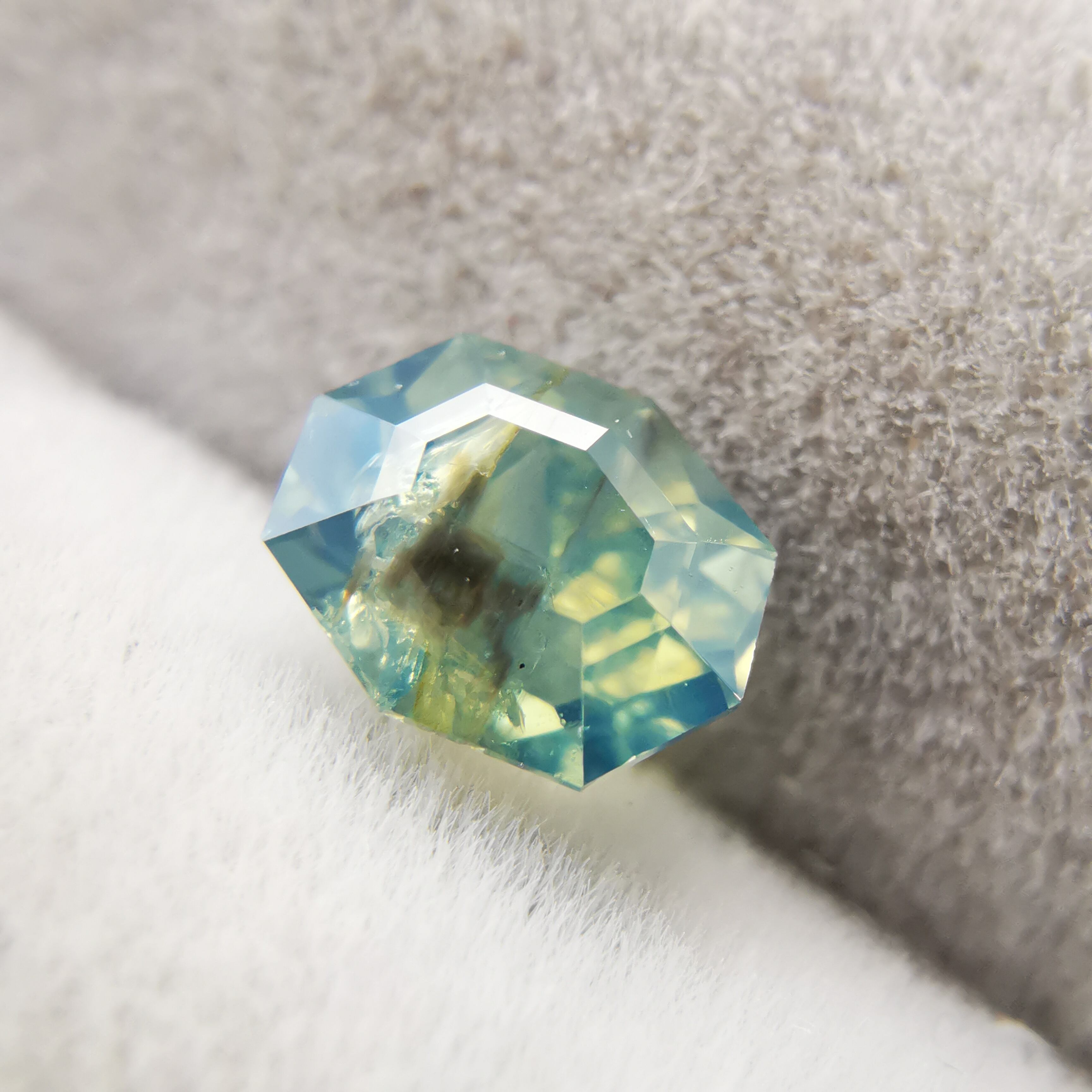 肉眼で見える黒っぽいインクルージョンあり、部分的に表面に達する