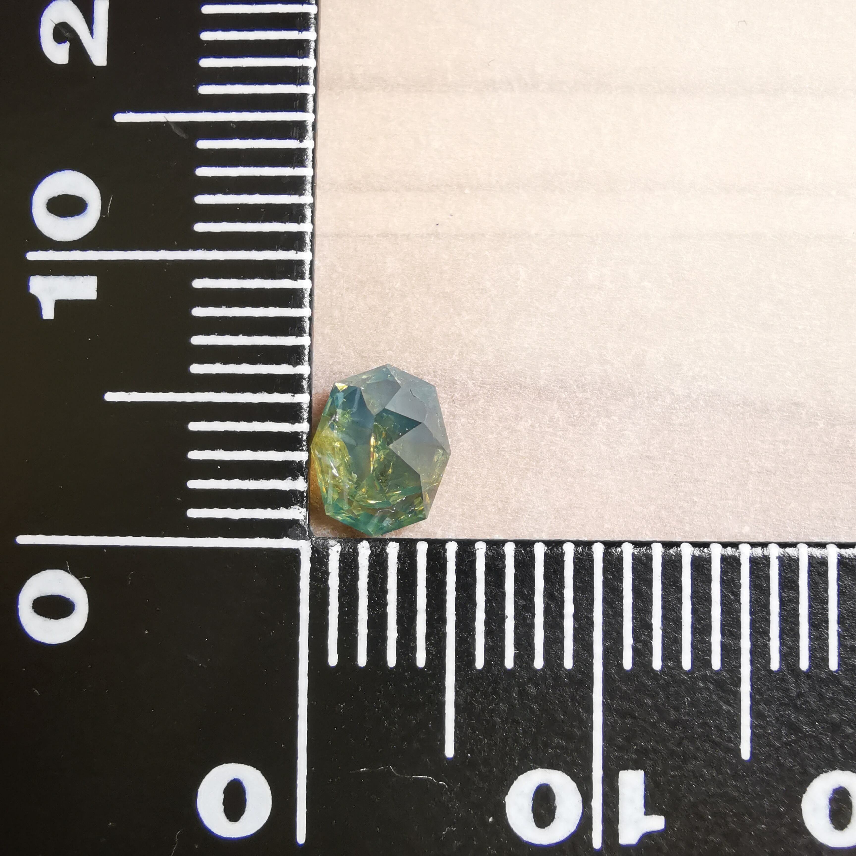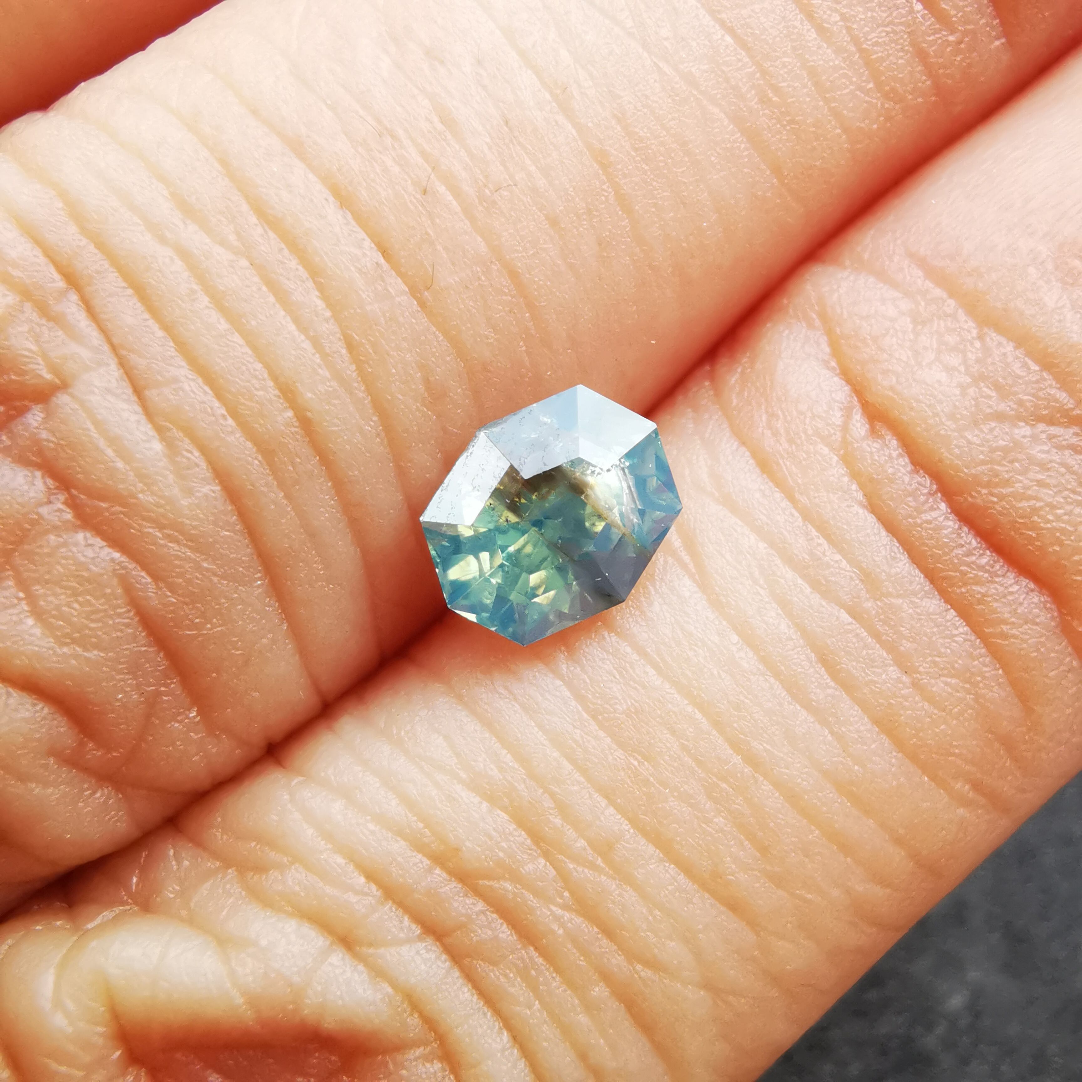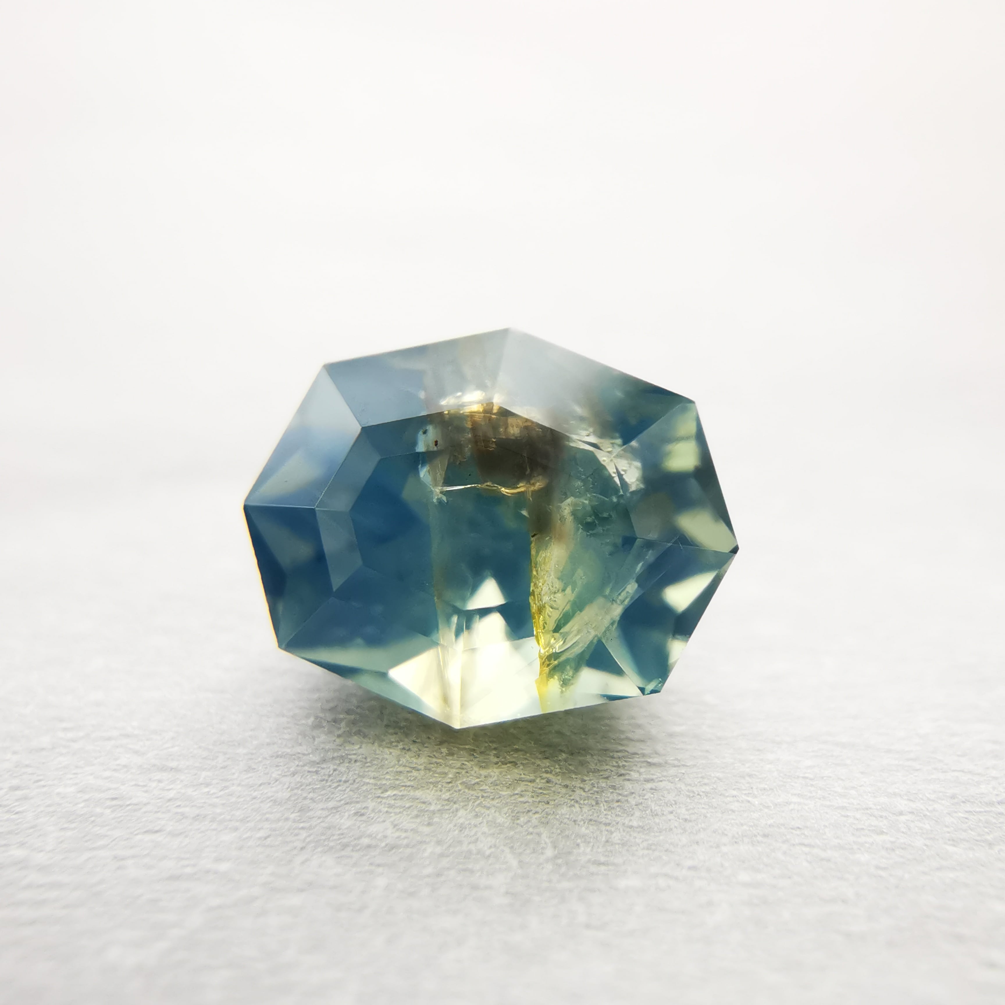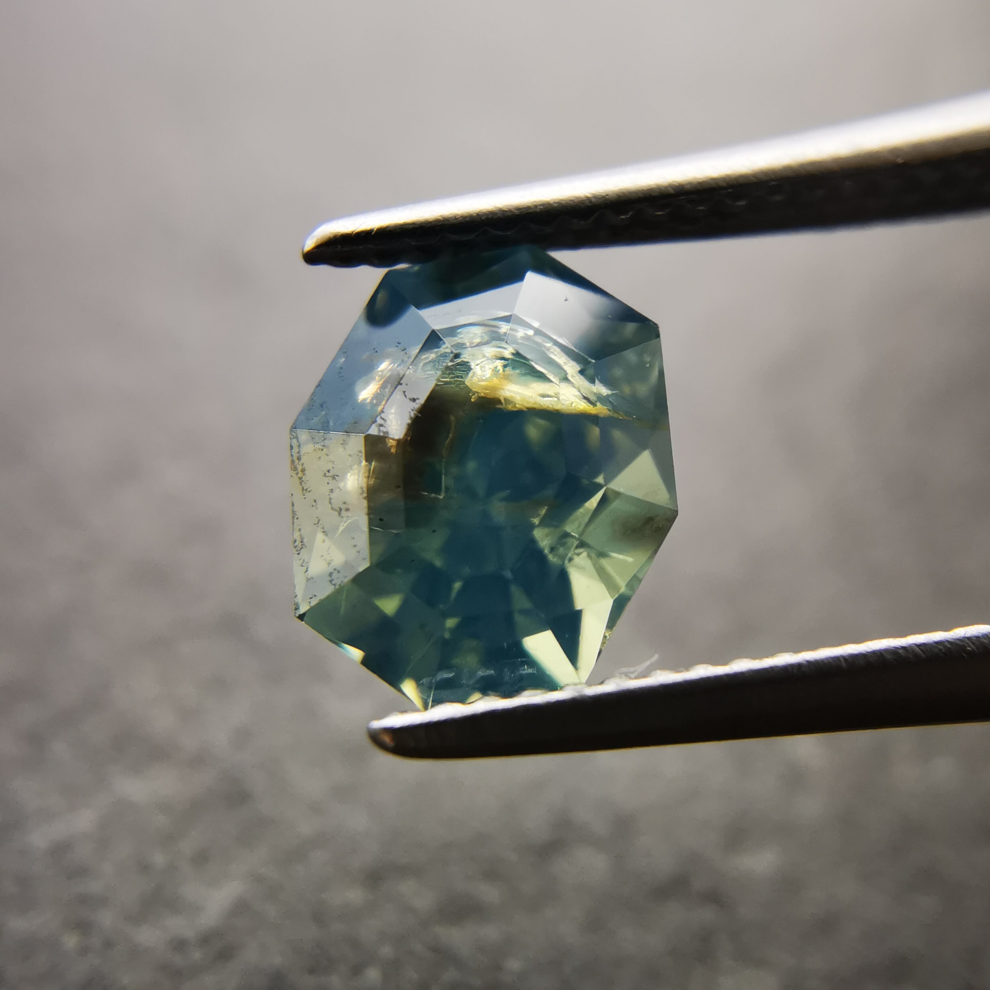 肉眼で見える黒っぽいインクルージョンあり、部分的に表面に達する