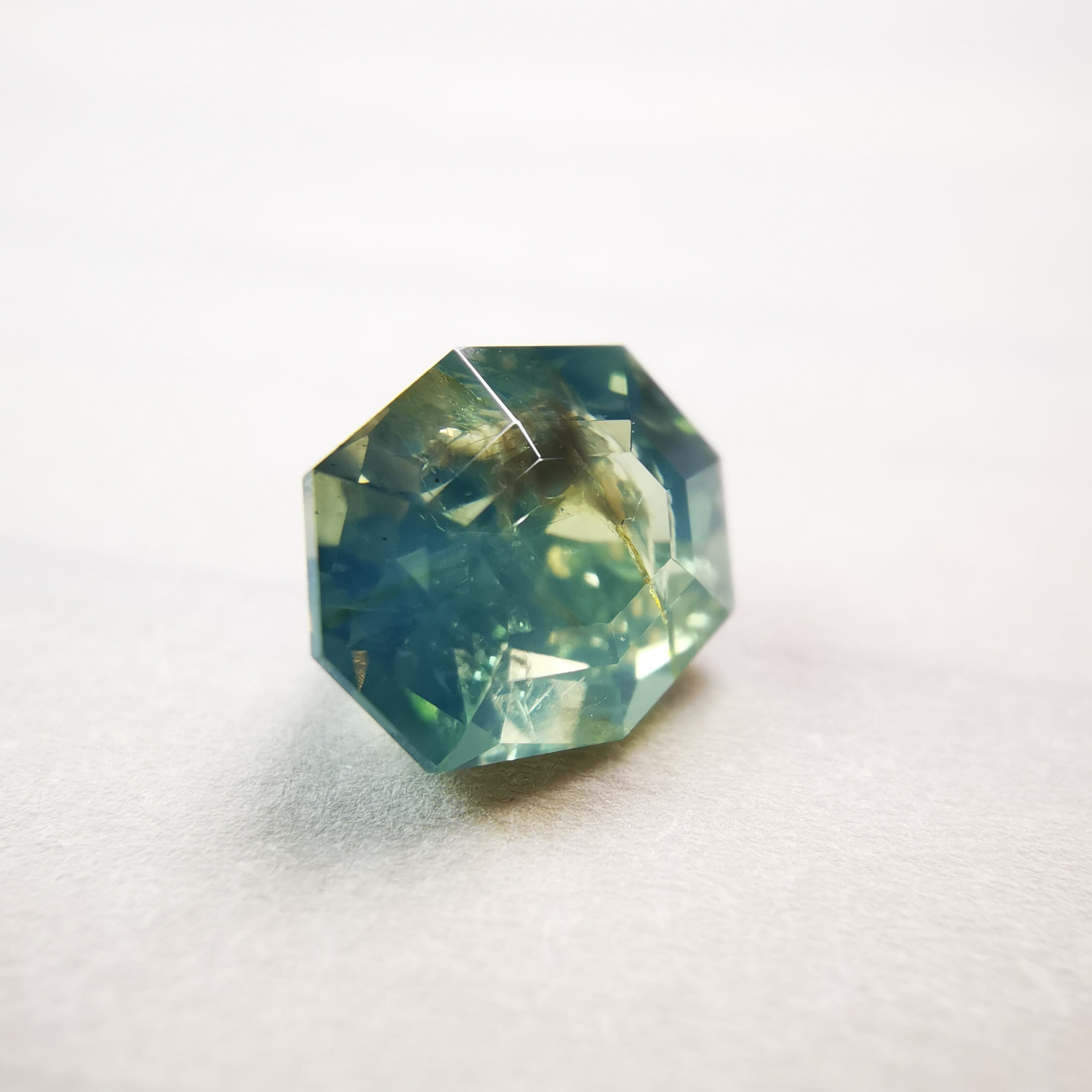 グリーンにホワイトを一滴垂らしたような、ふわりと夢見ごこちなカラーに、ダークでワイルドなインクルージョンが入っている、このコントラストが魅力です。