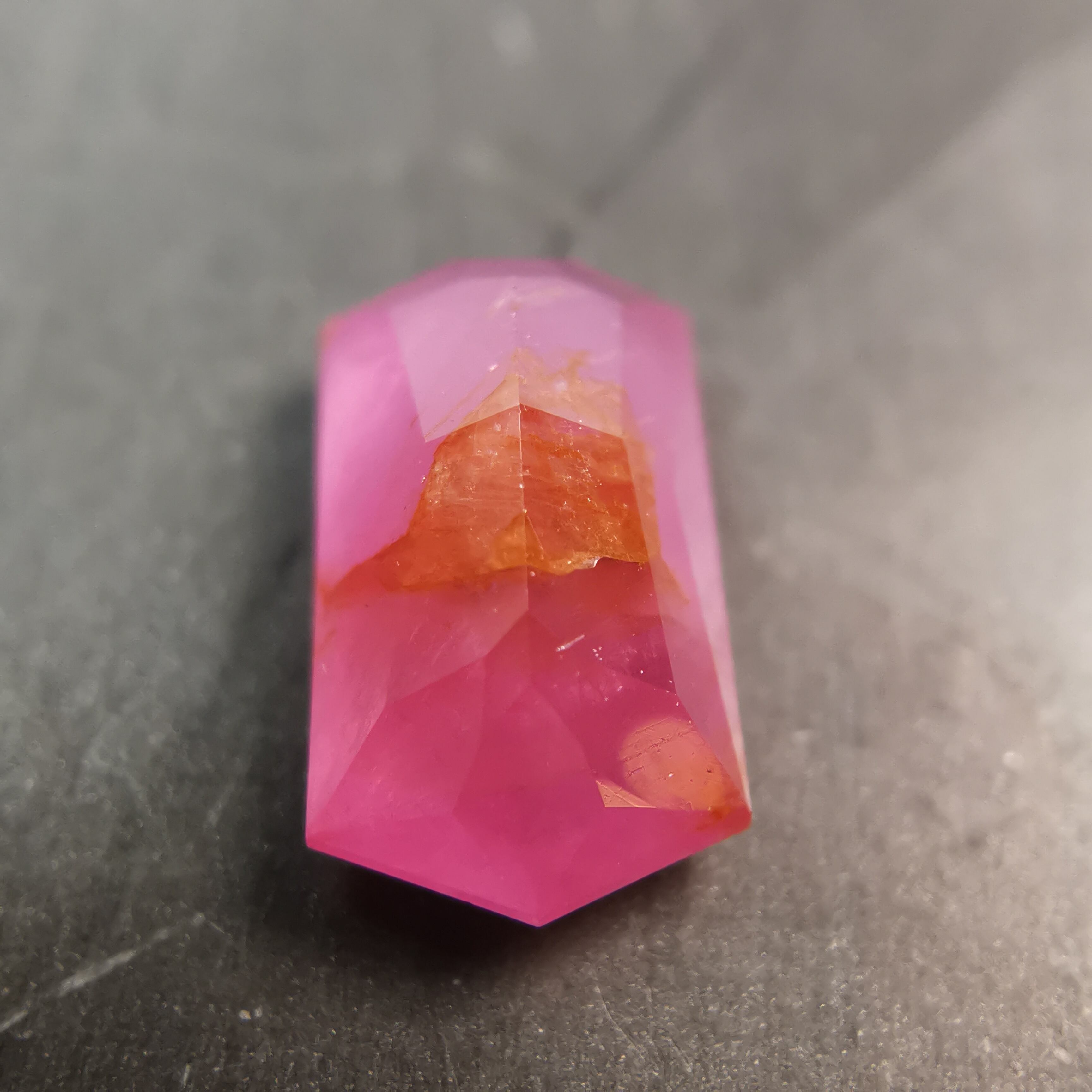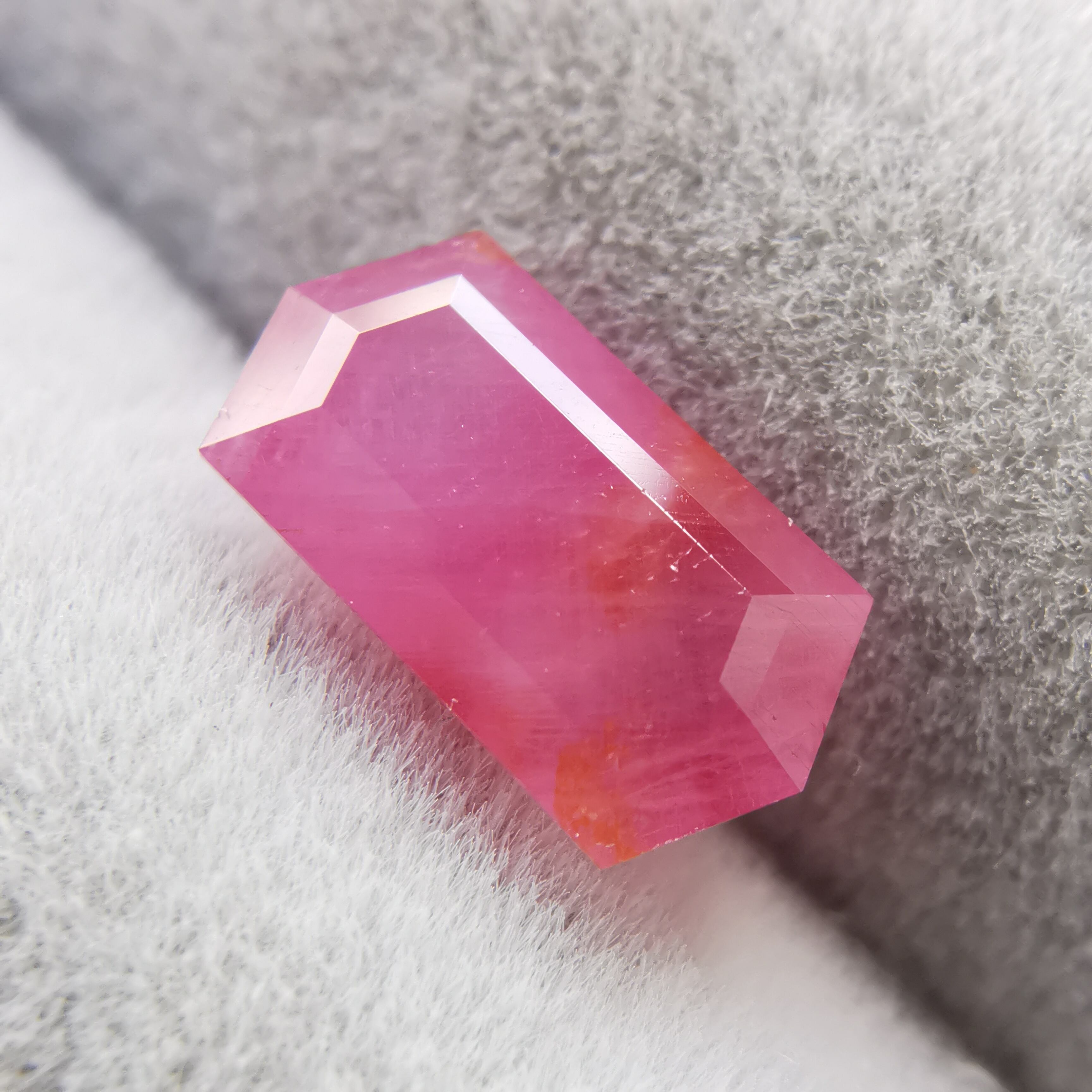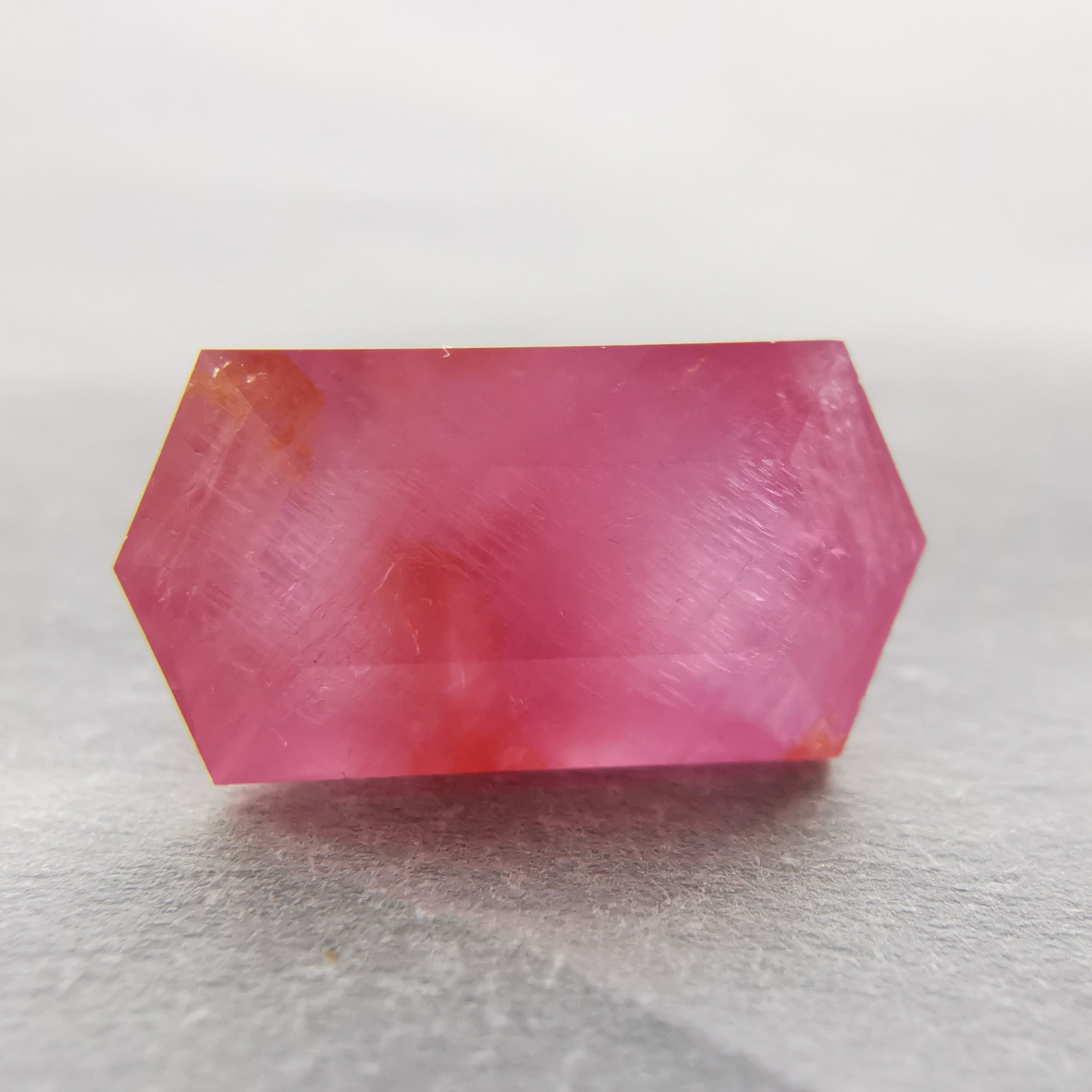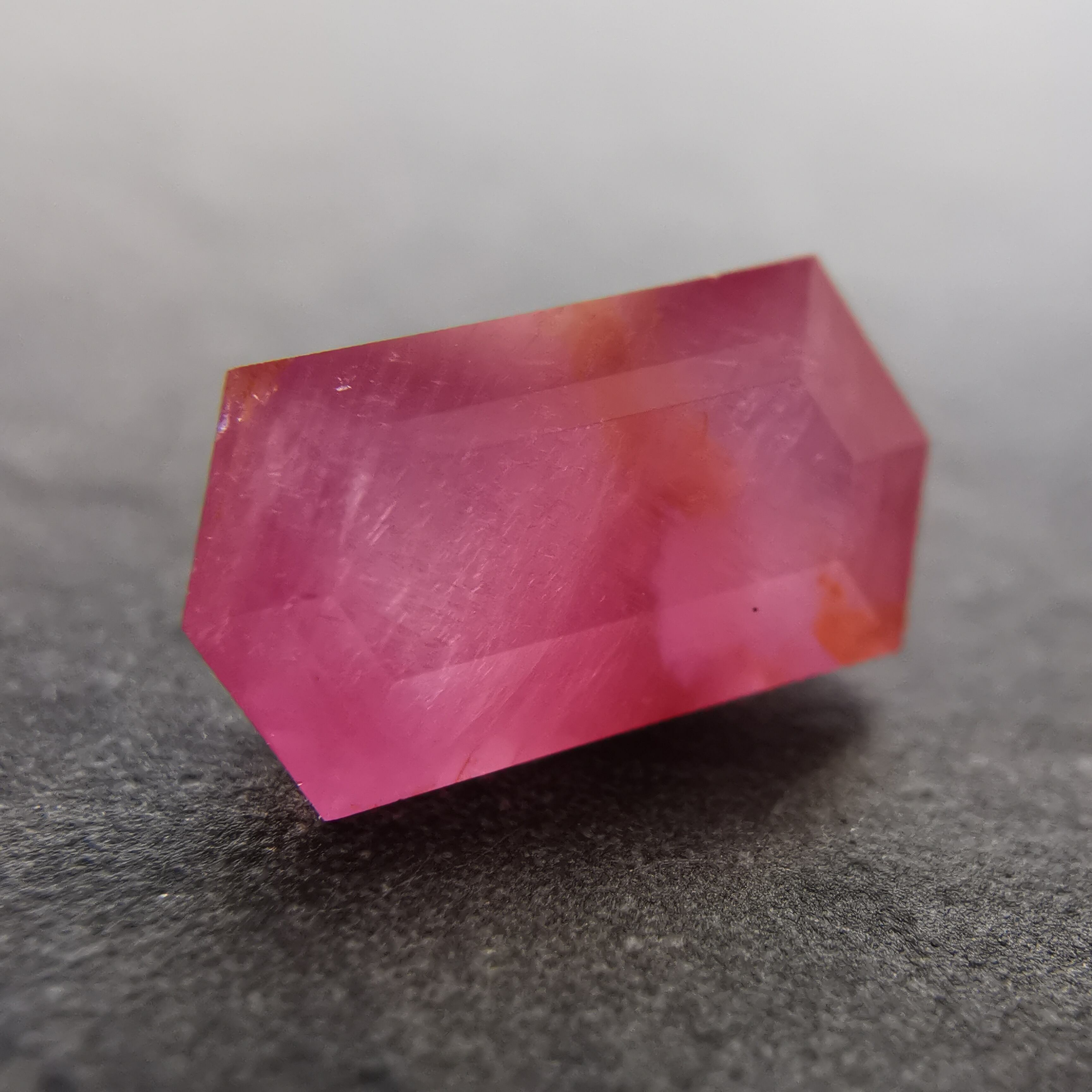 鮮やかなピンク色/チェリーピンクに、ホワイトとオレンジのモヤモヤが入った不透明のサファイアです。