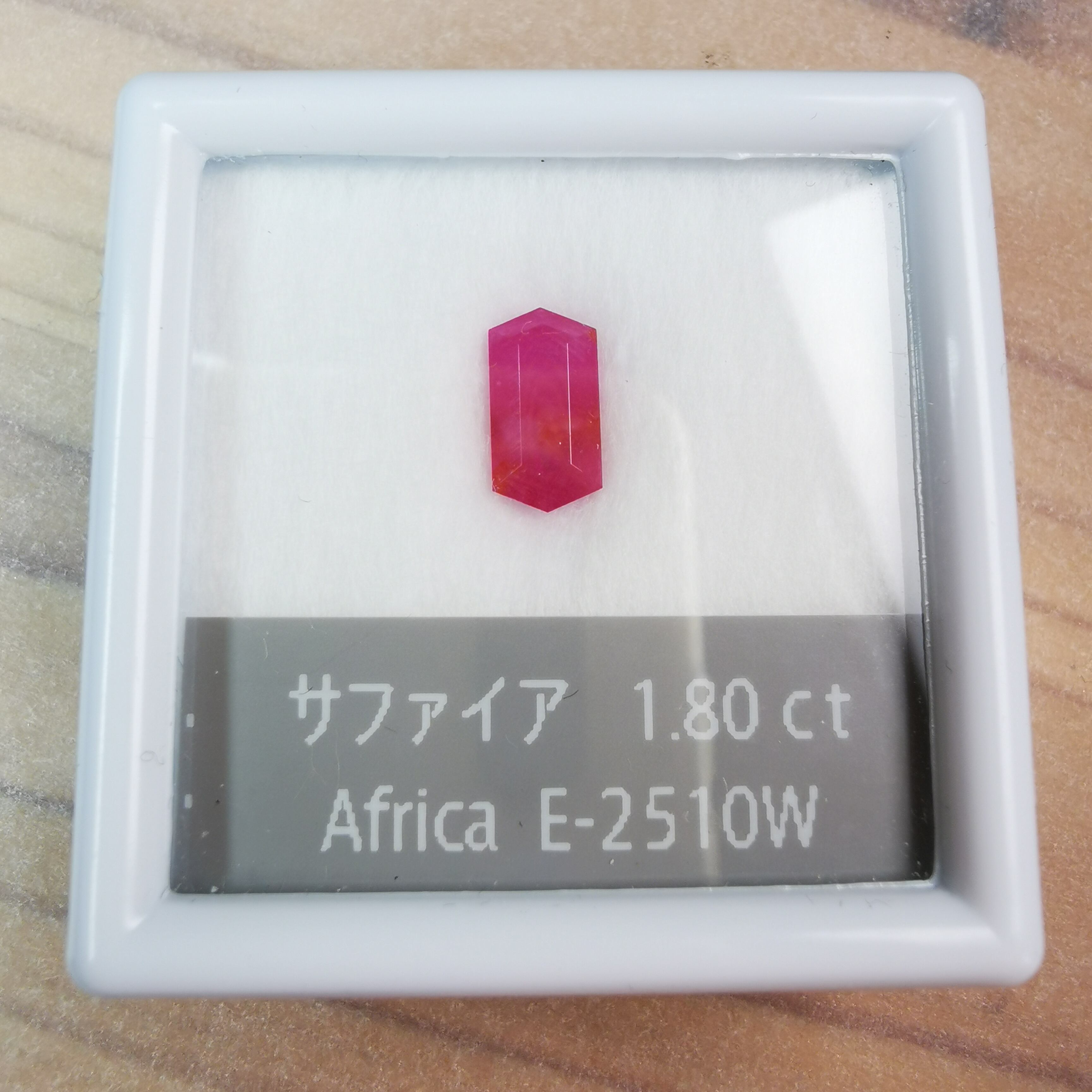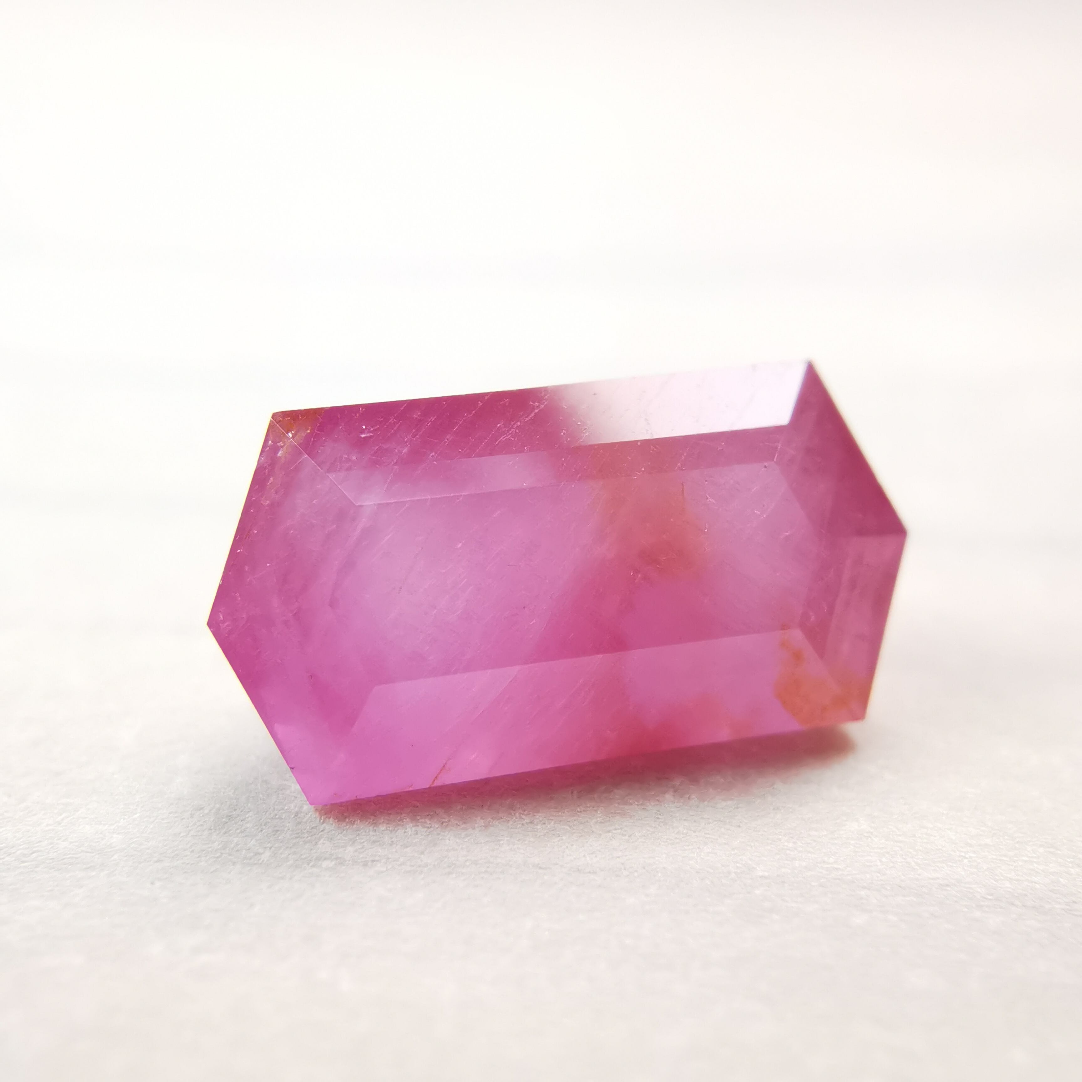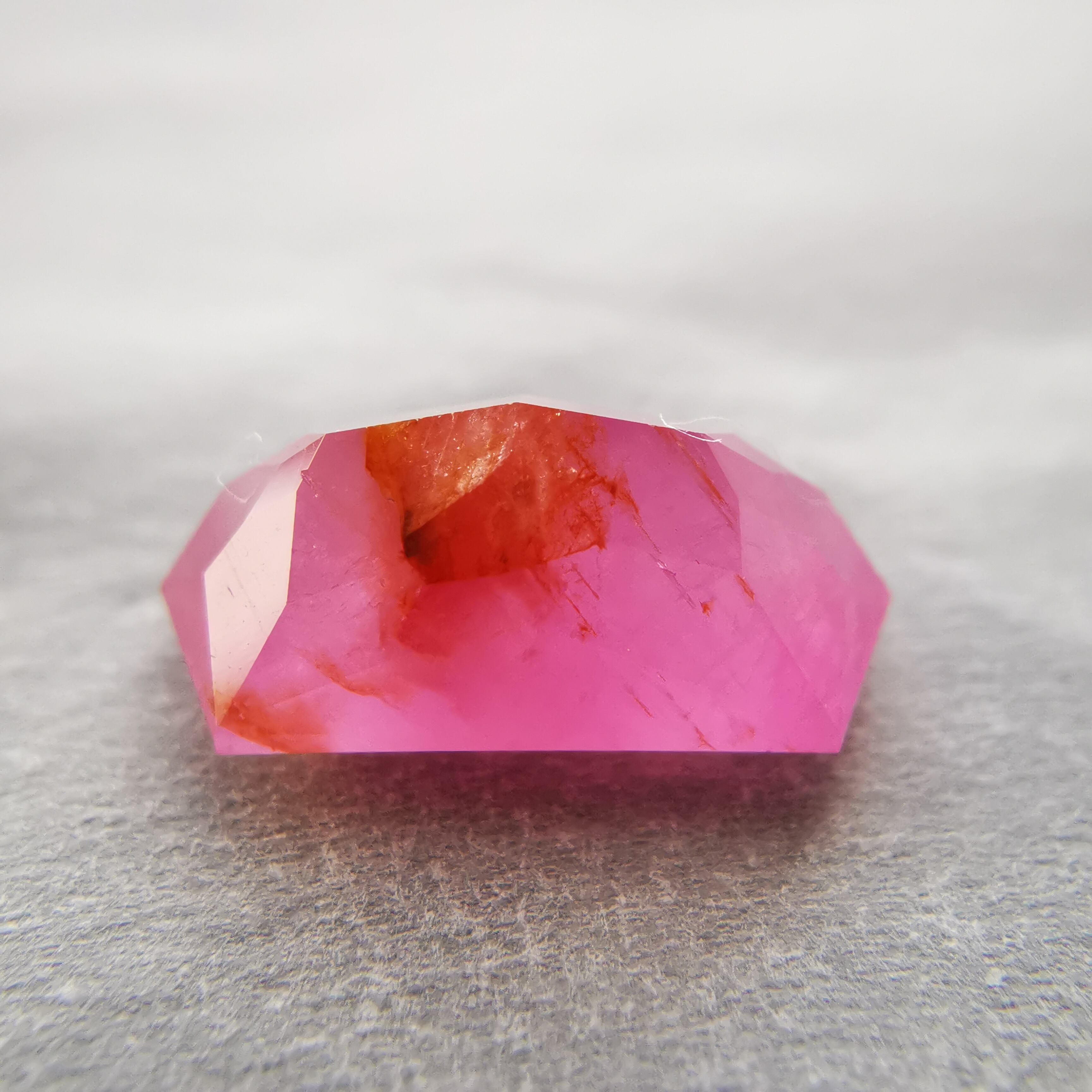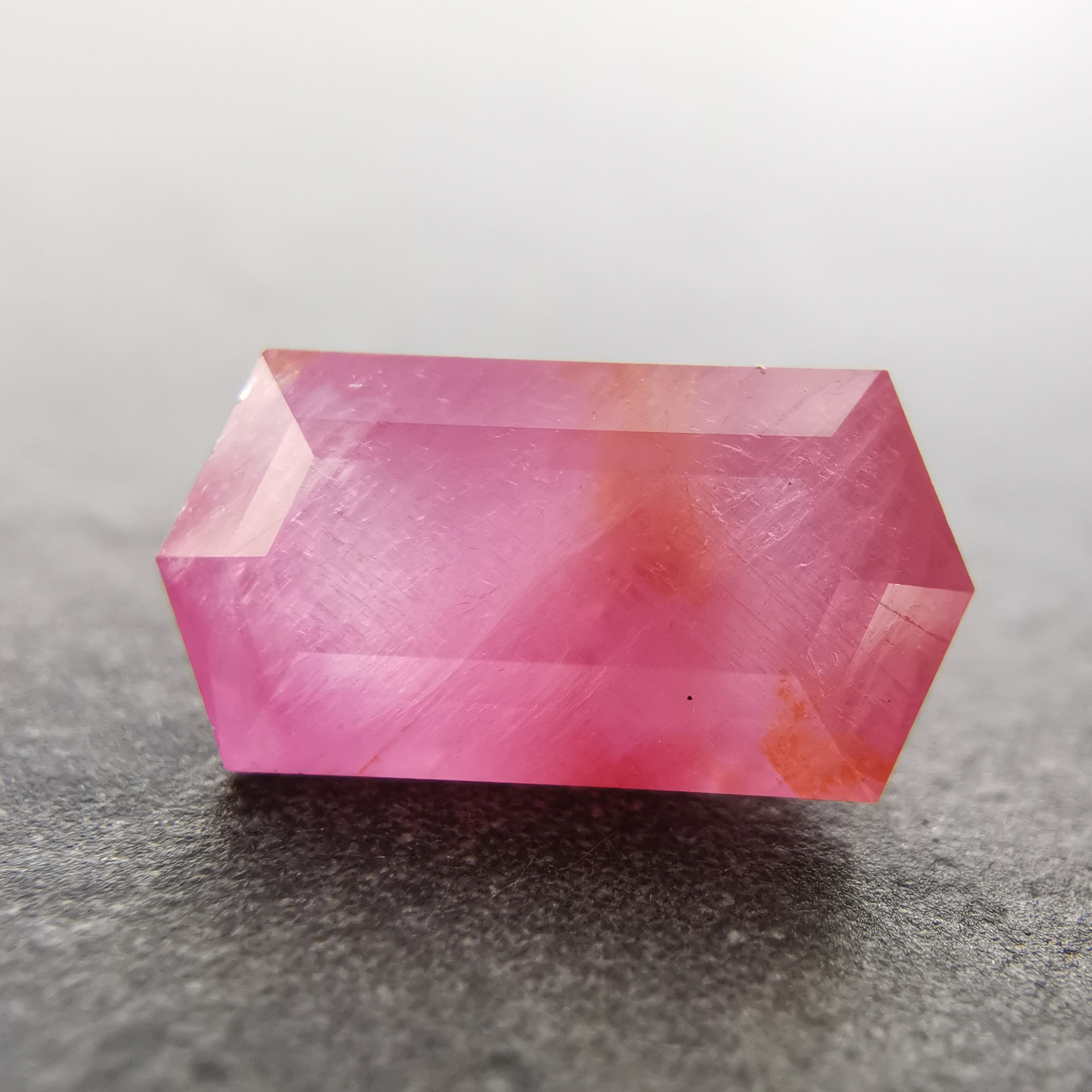 鮮やかなピンク色/チェリーピンクに、ホワイトとオレンジのモヤモヤが入った不透明のサファイアです。