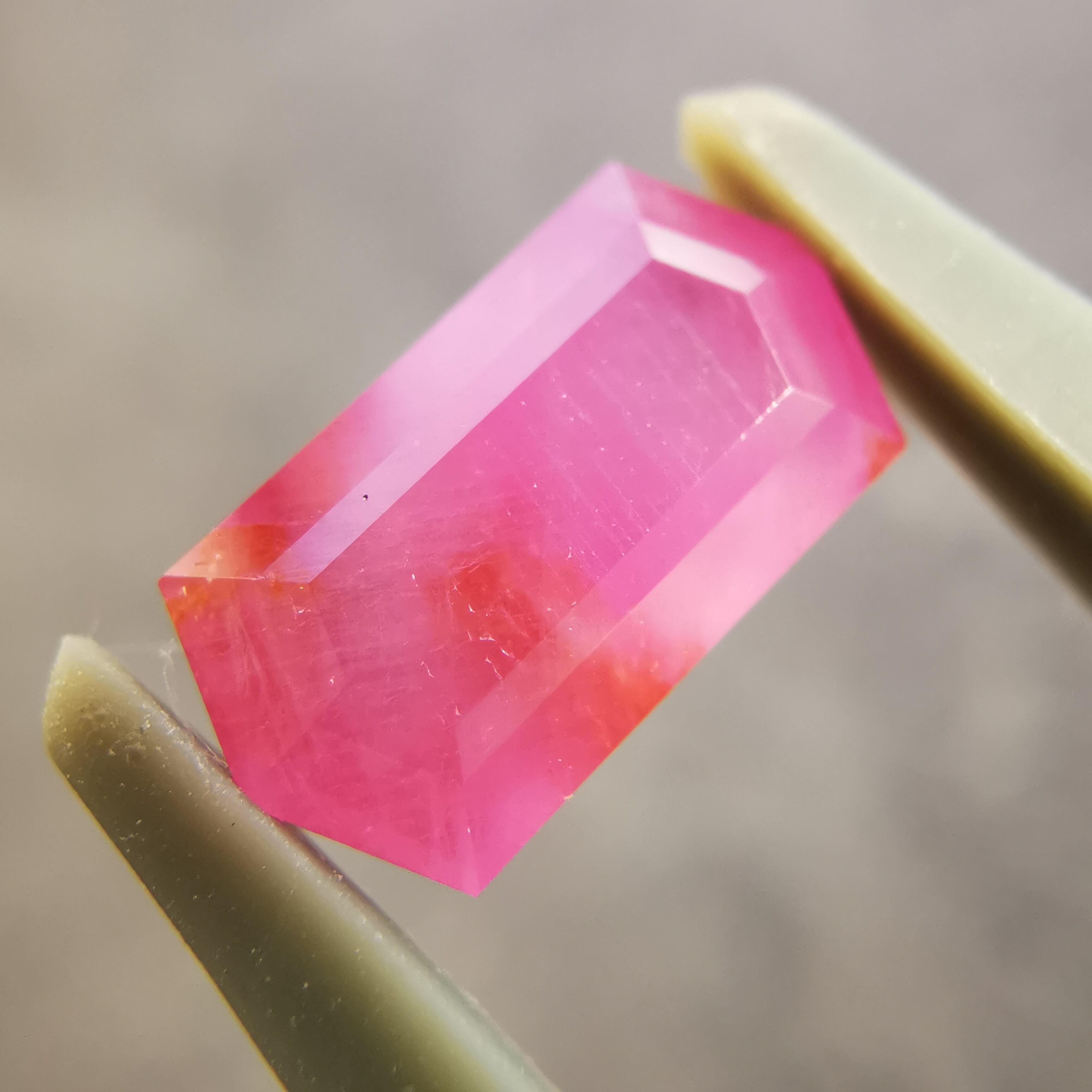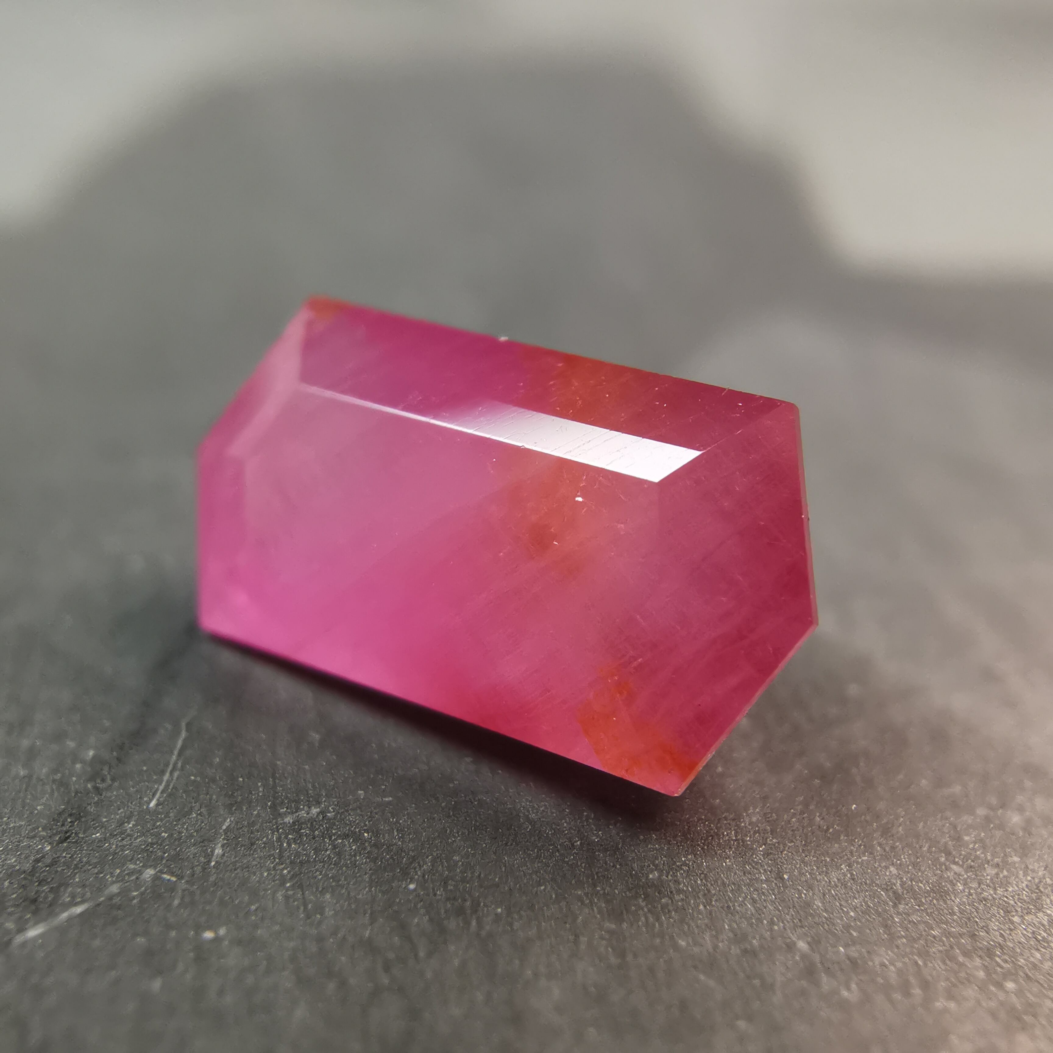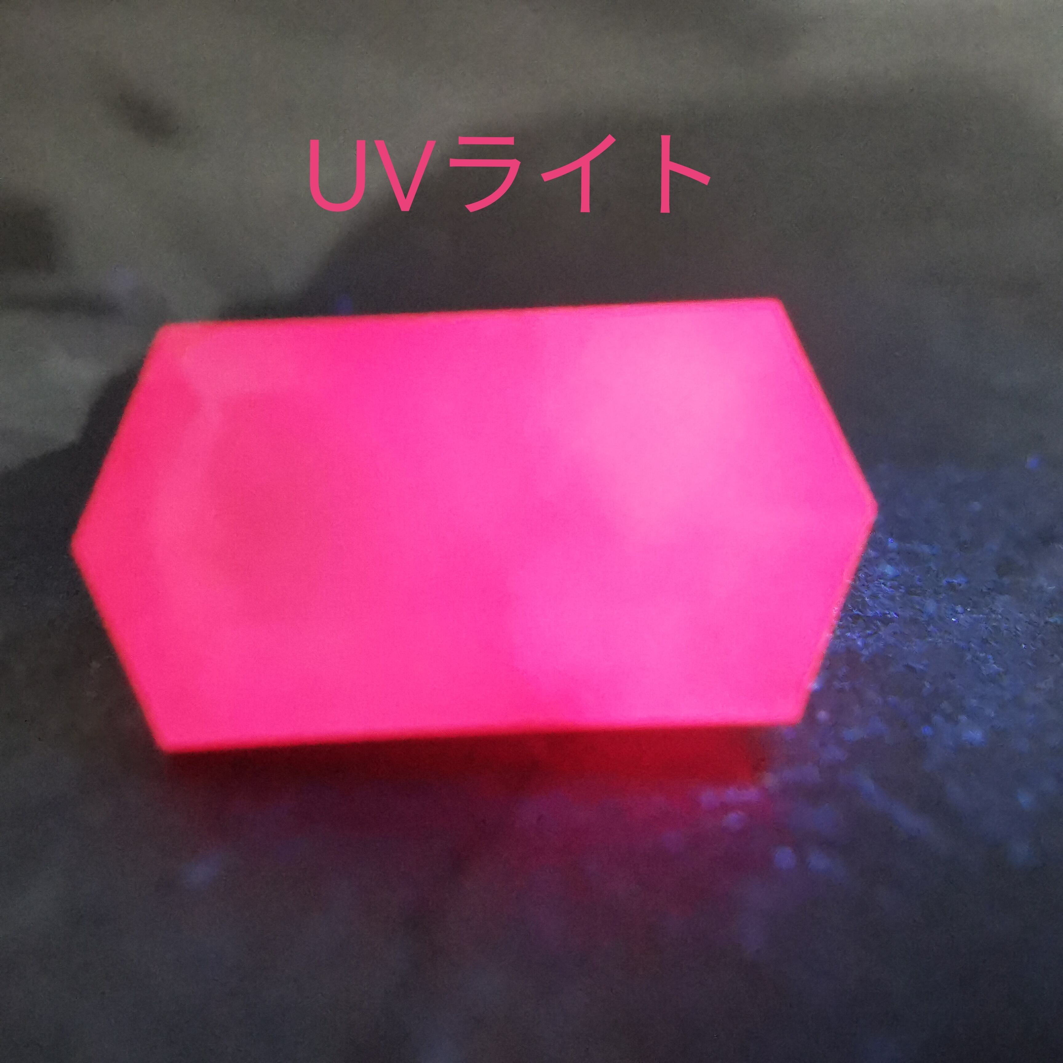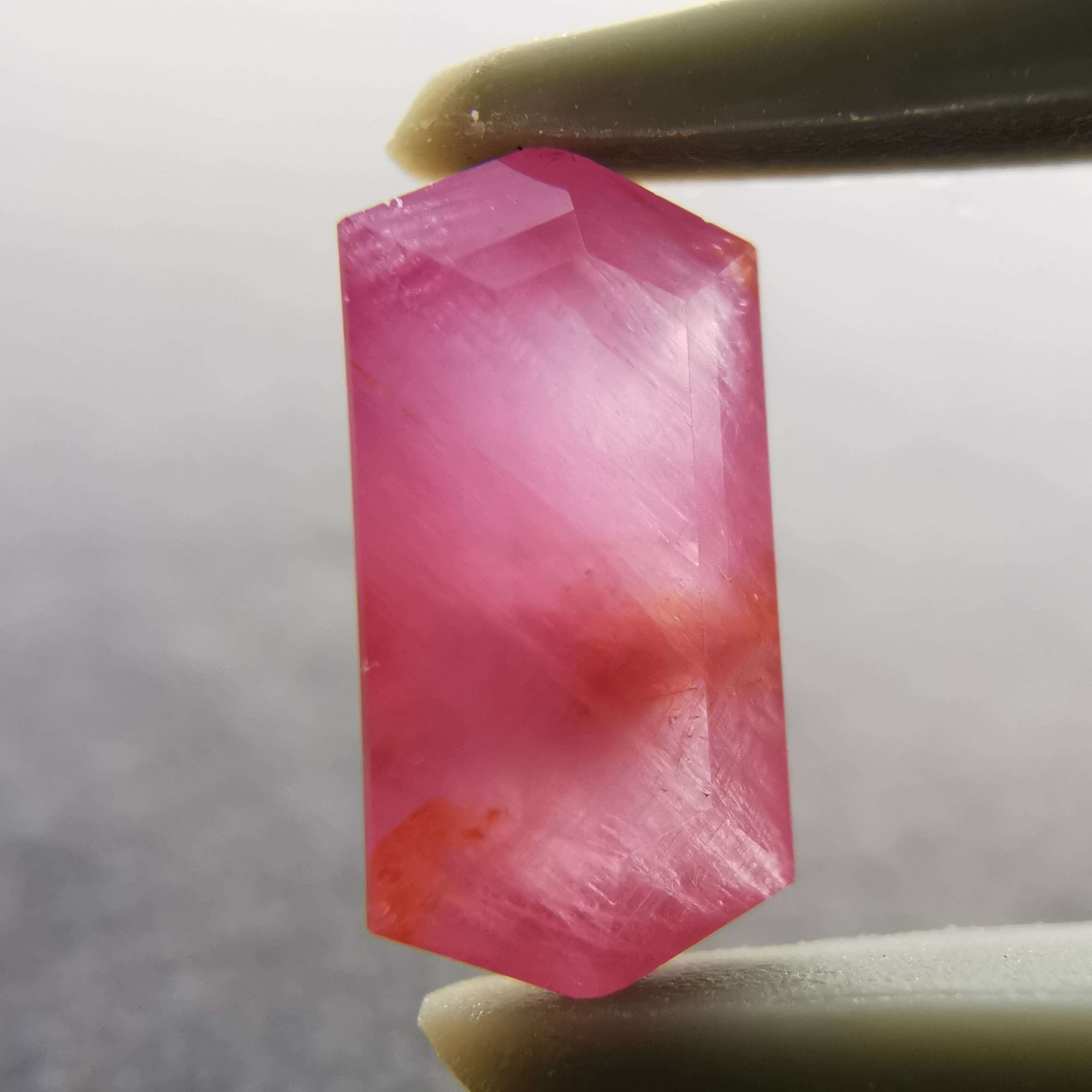 鮮やかなピンク色/チェリーピンクに、ホワイトとオレンジのモヤモヤが入った不透明のサファイアです。