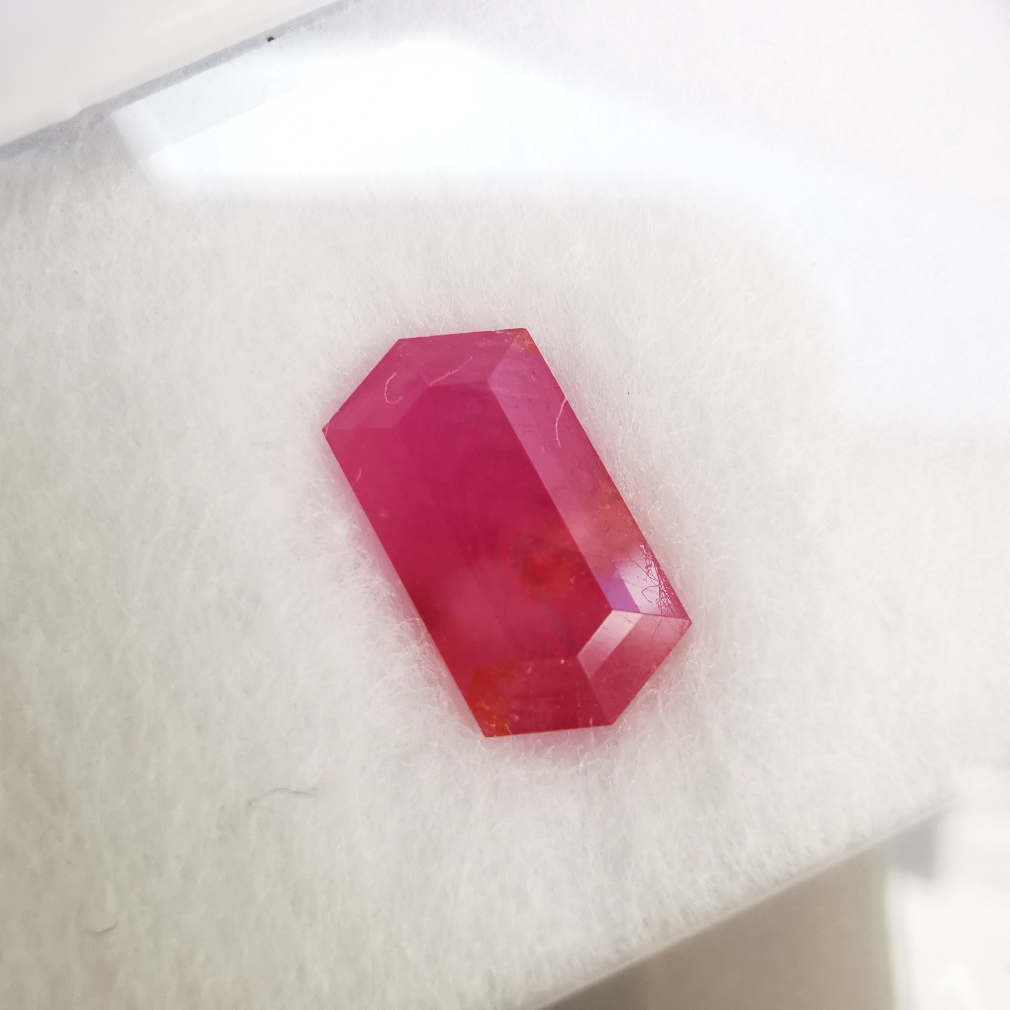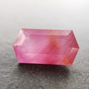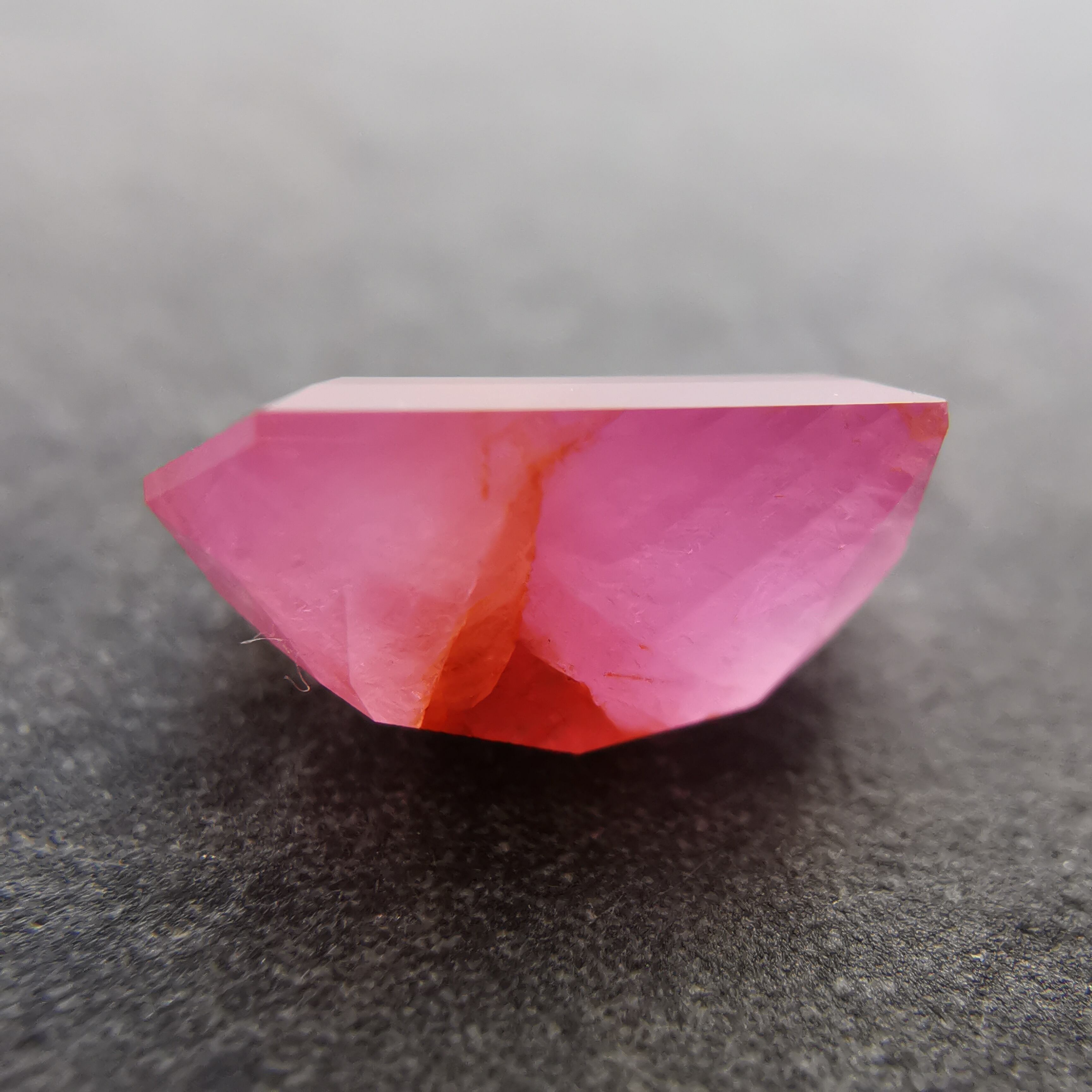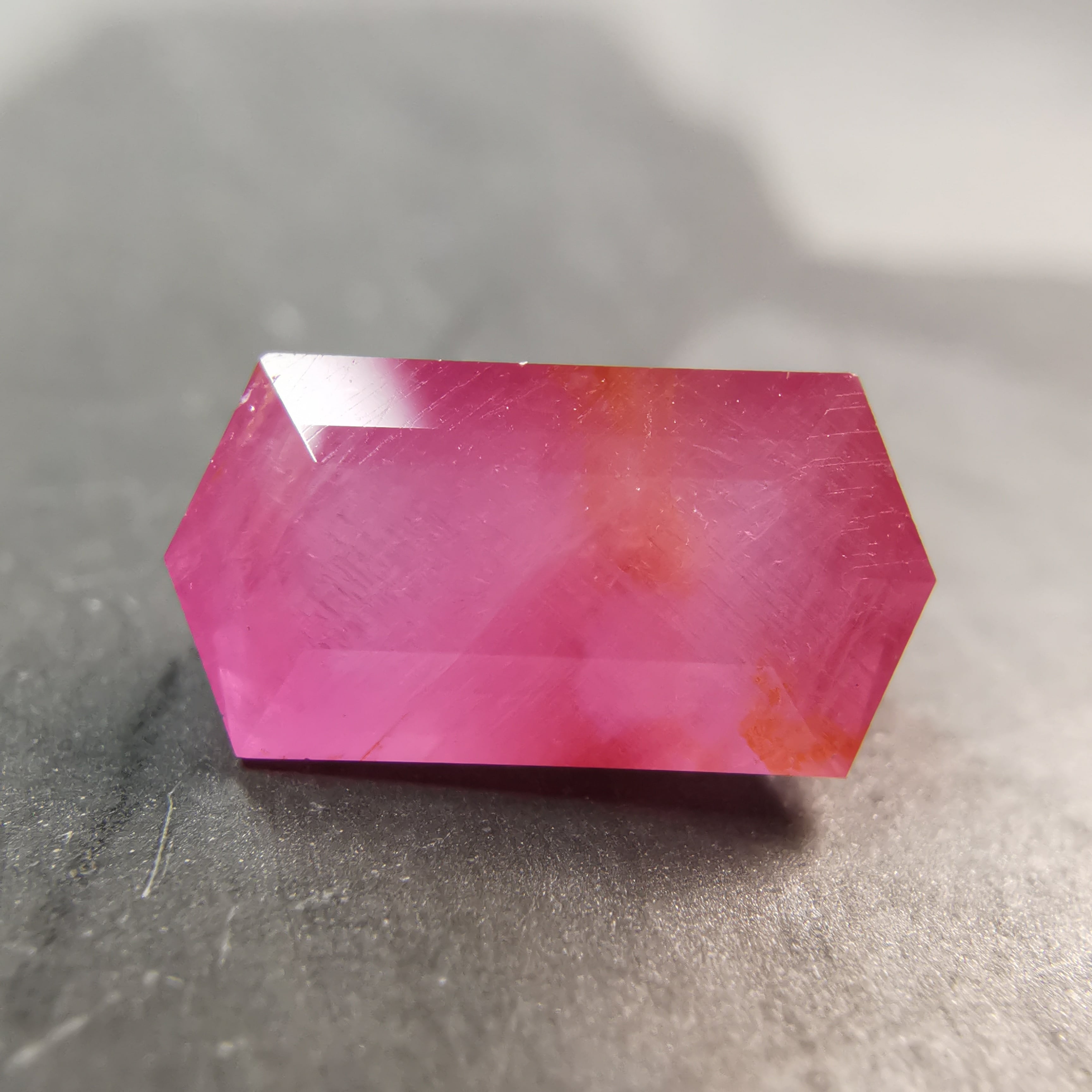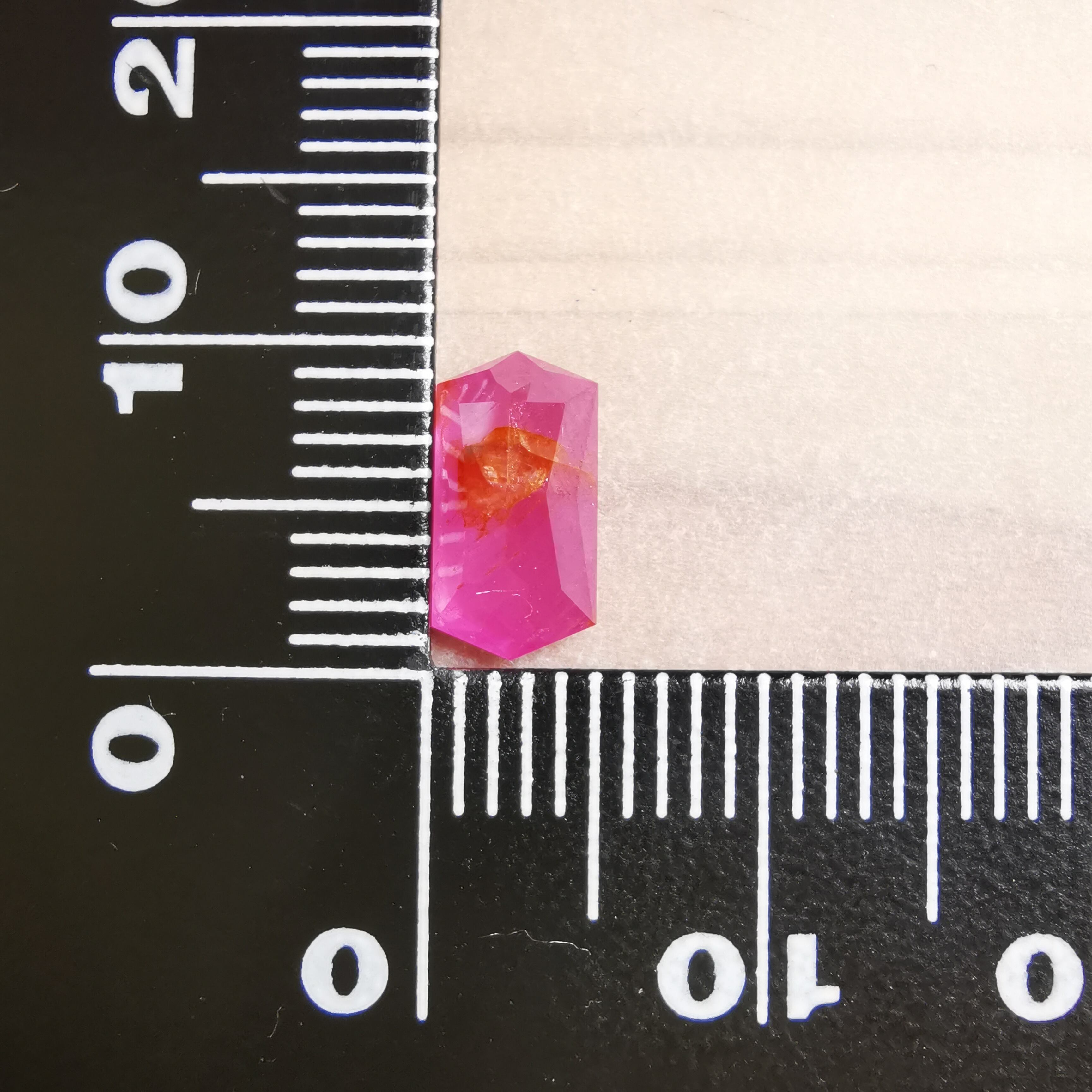 鮮やかなピンク色/チェリーピンクに、ホワイトとオレンジのモヤモヤが入った不透明のサファイアです。