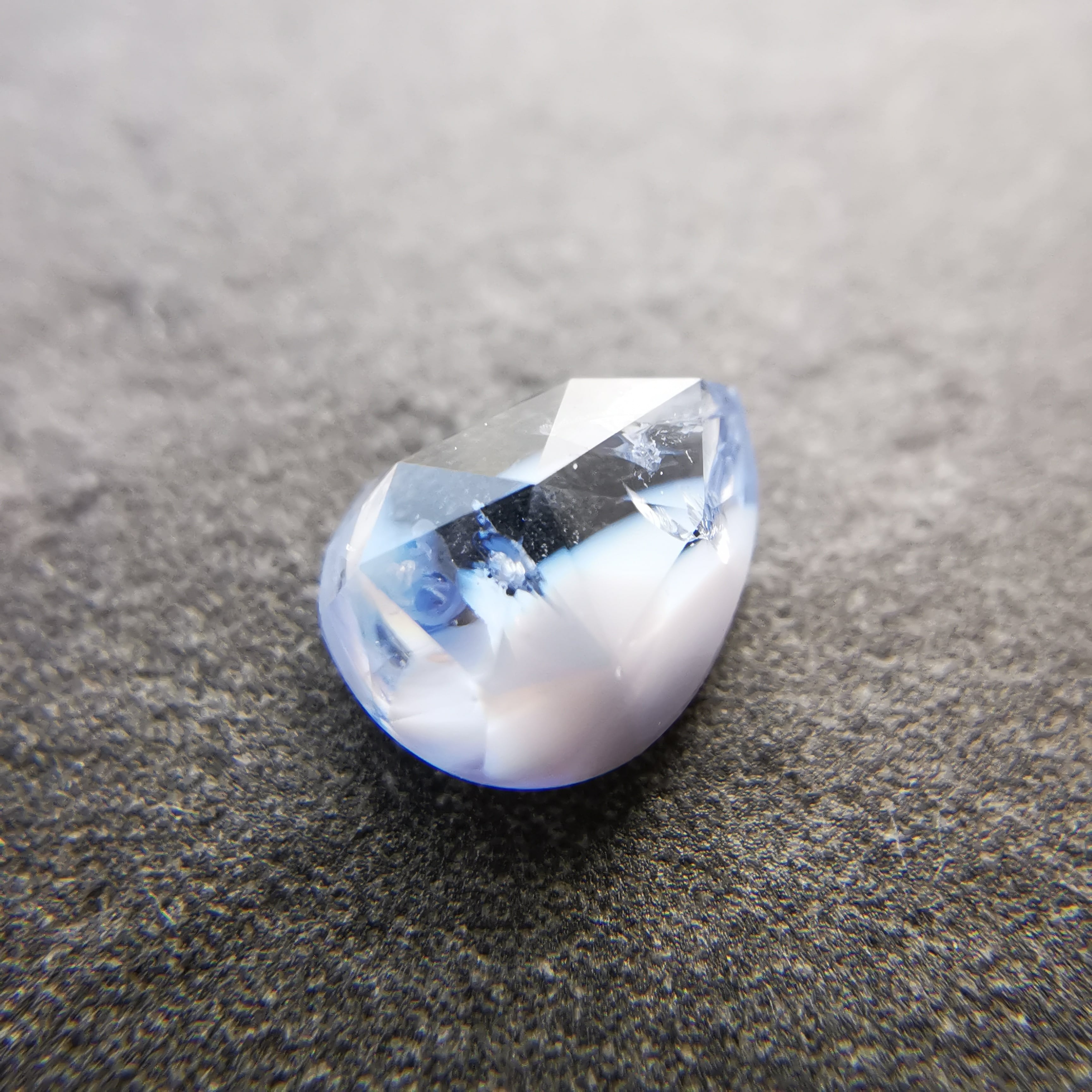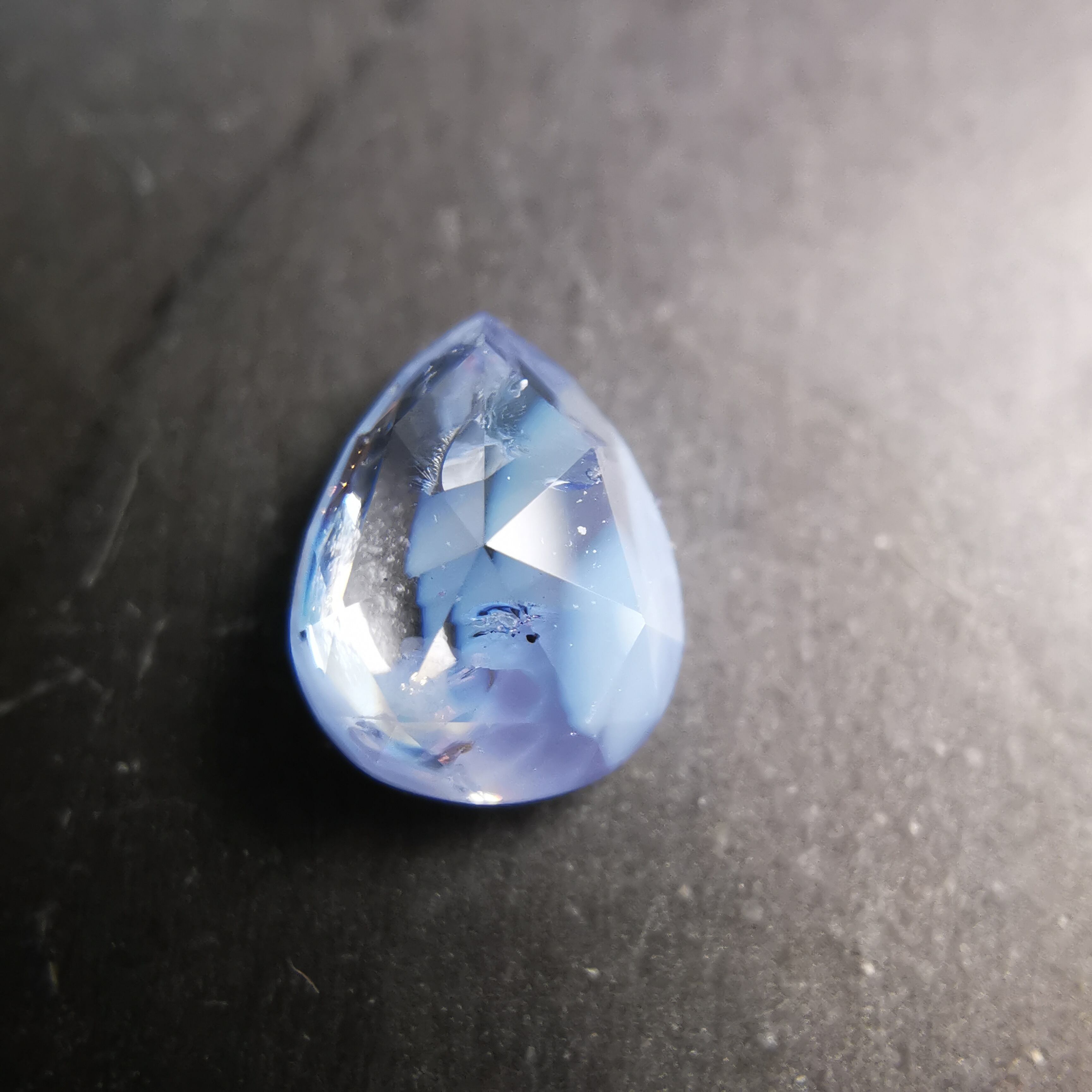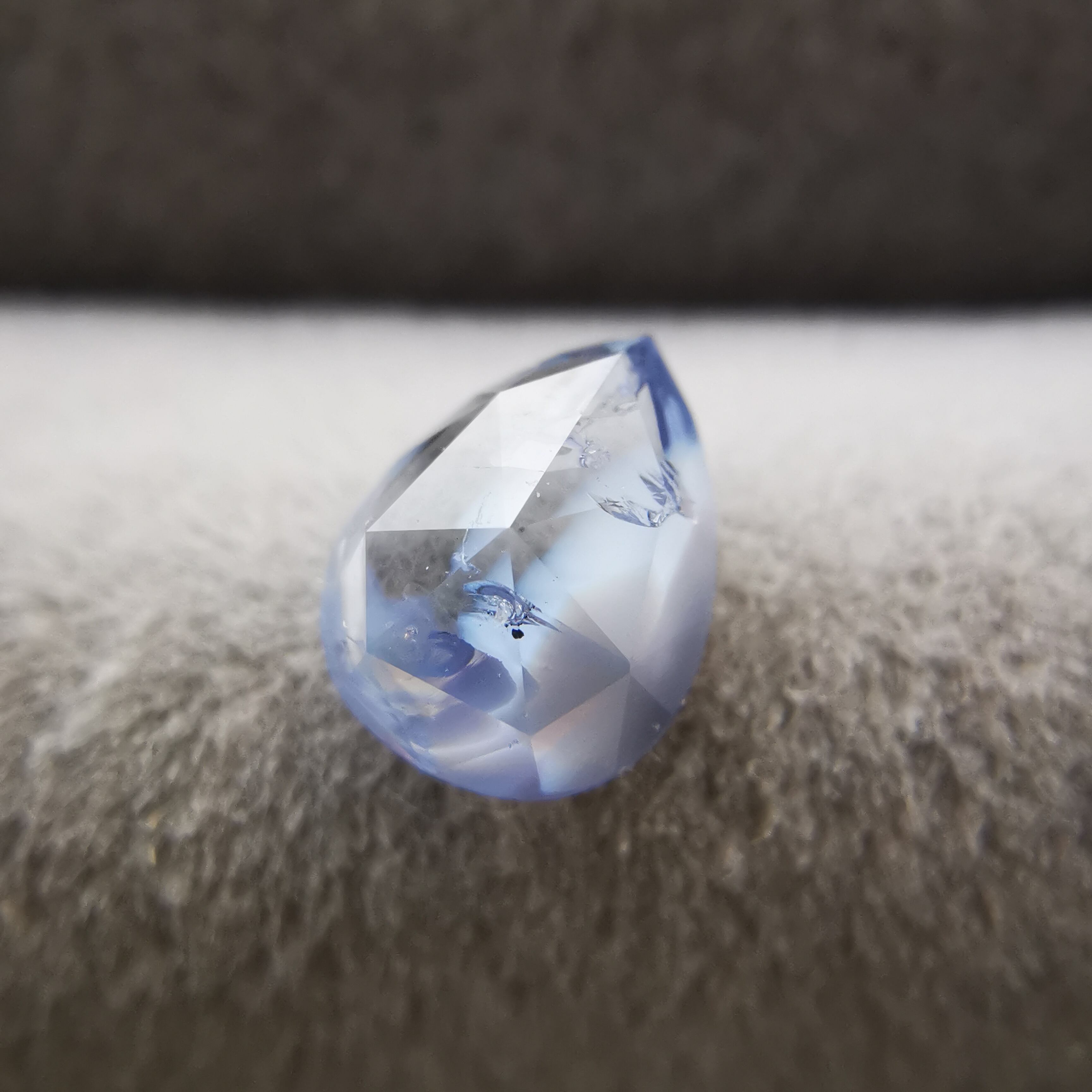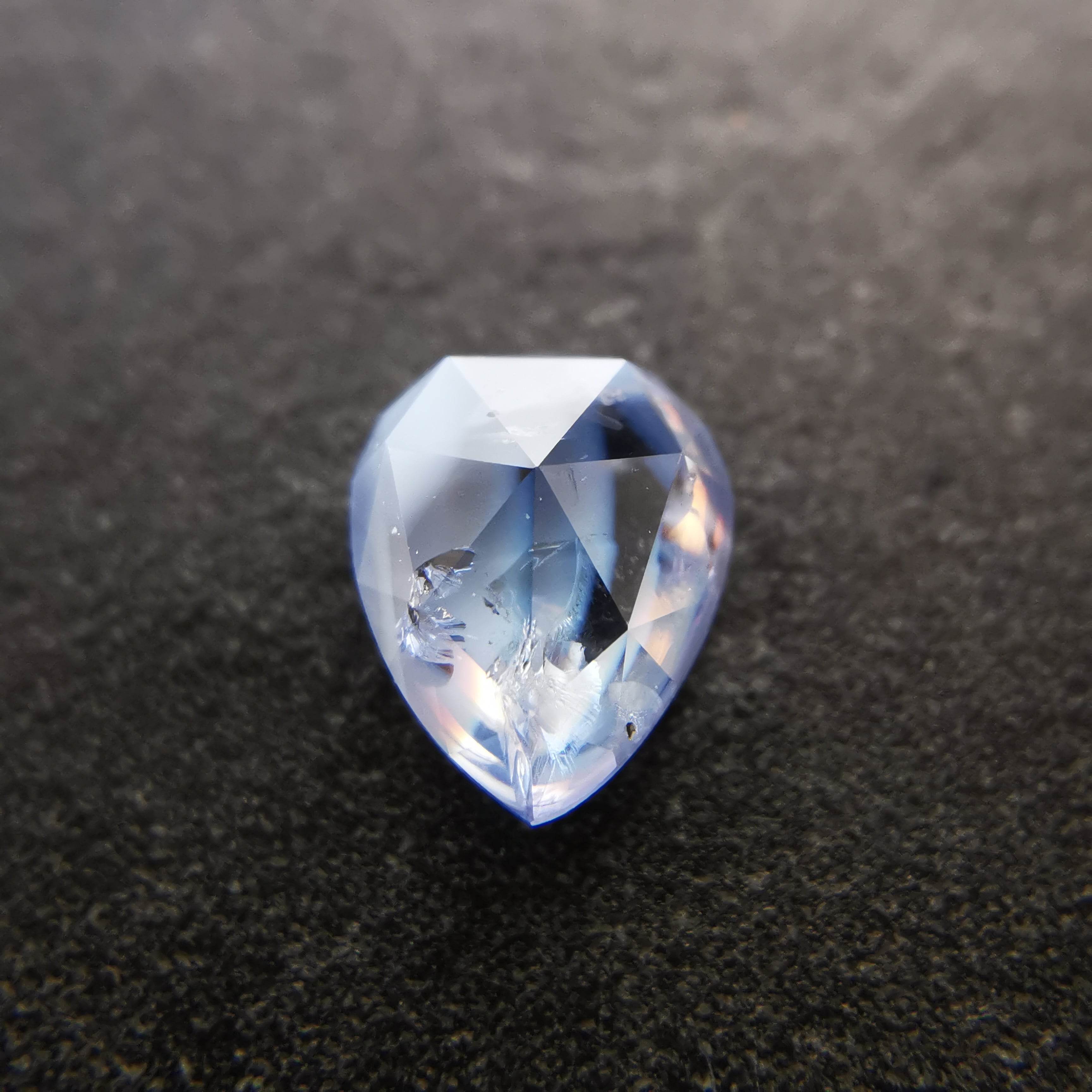 これまでにもいくつか紹介してきた、ローズカットのペアシェイプ、濃厚なグレーが印象的なサファイアロットの中の一石です。