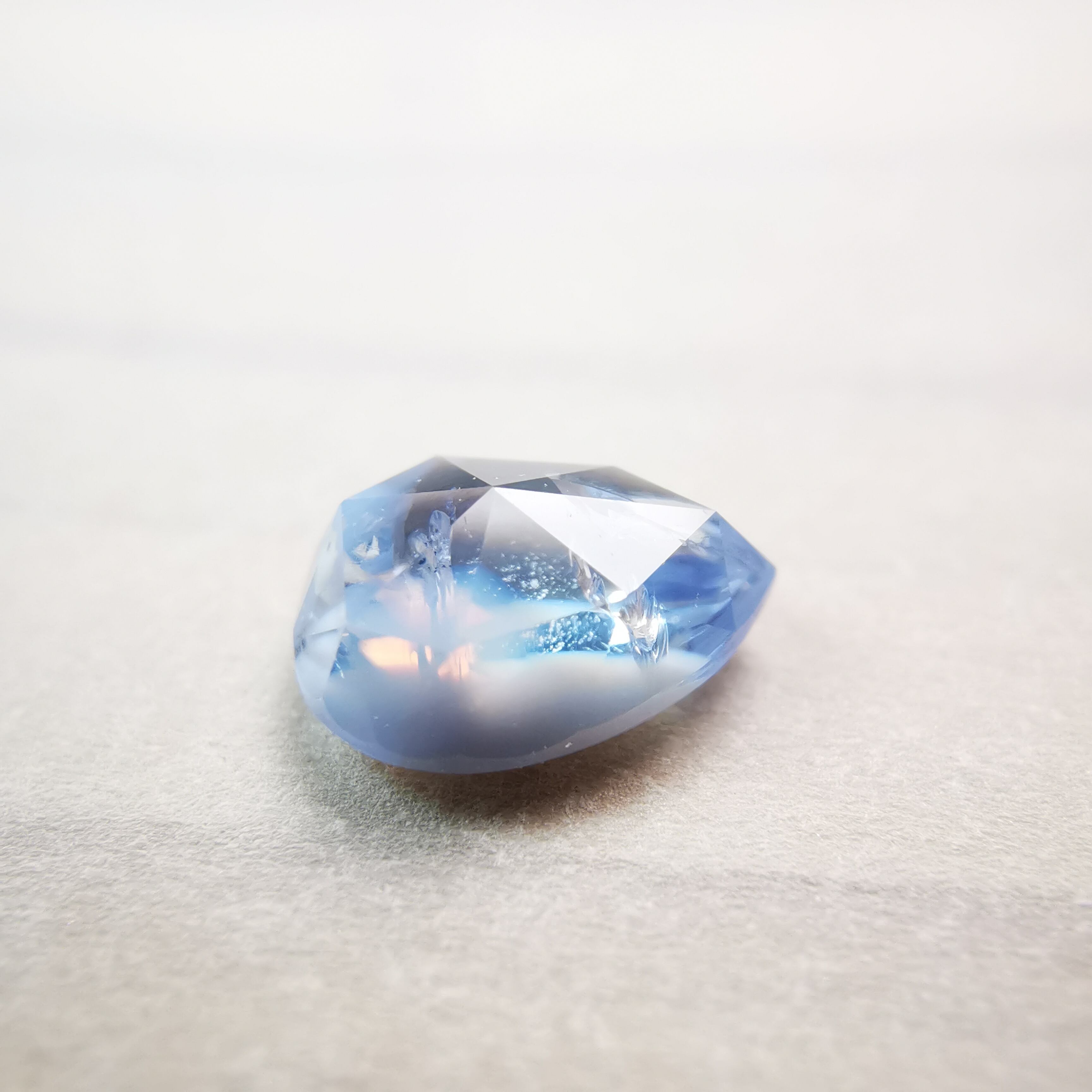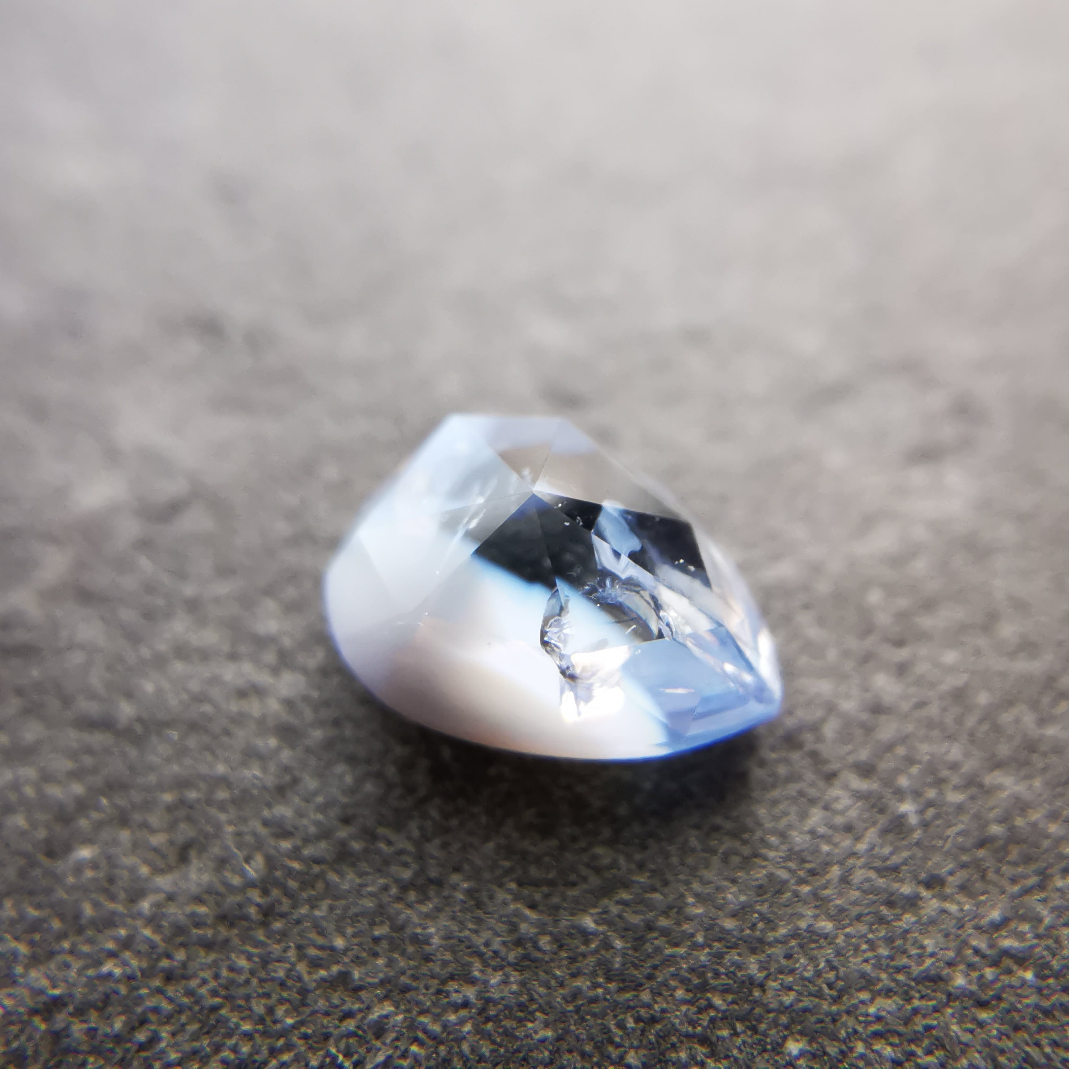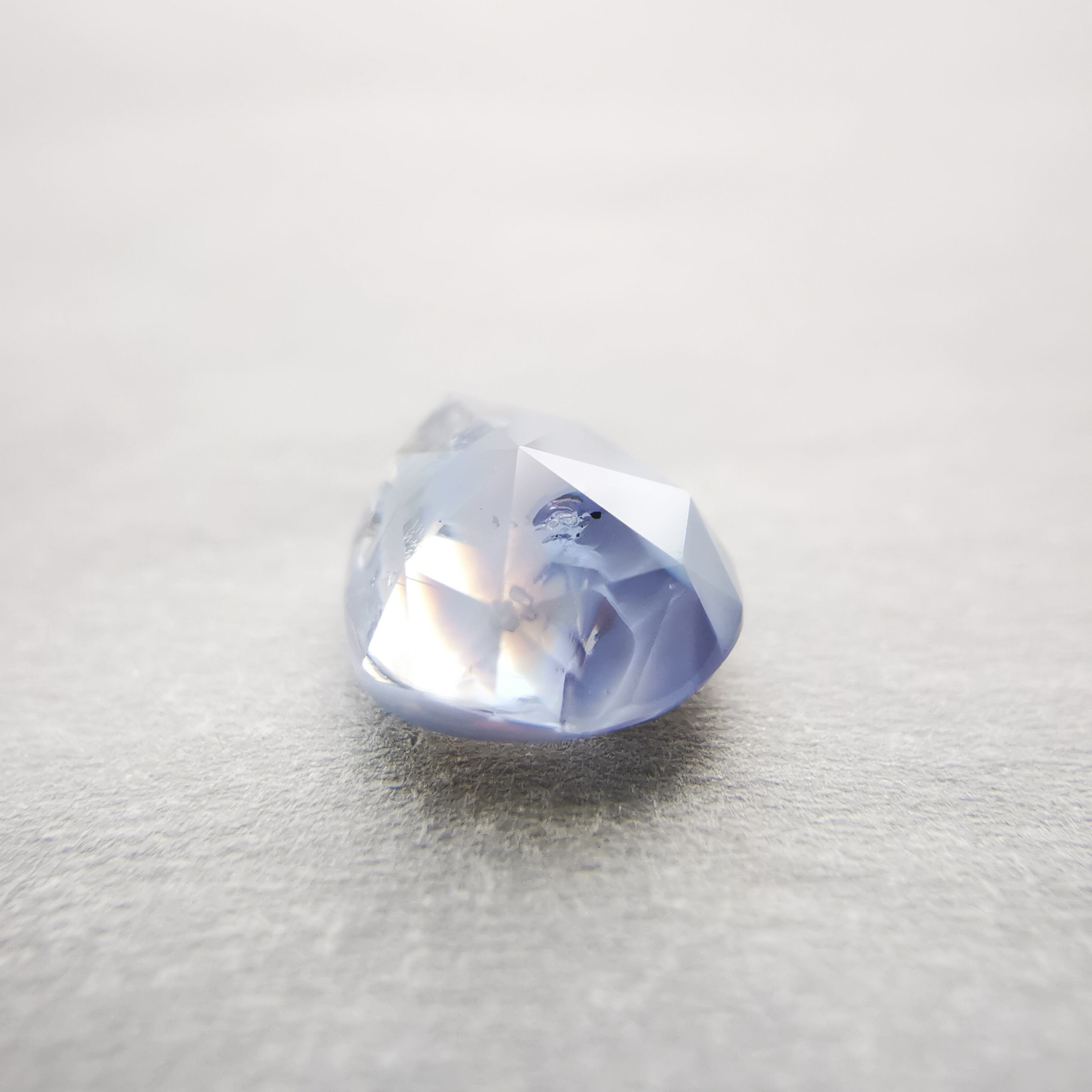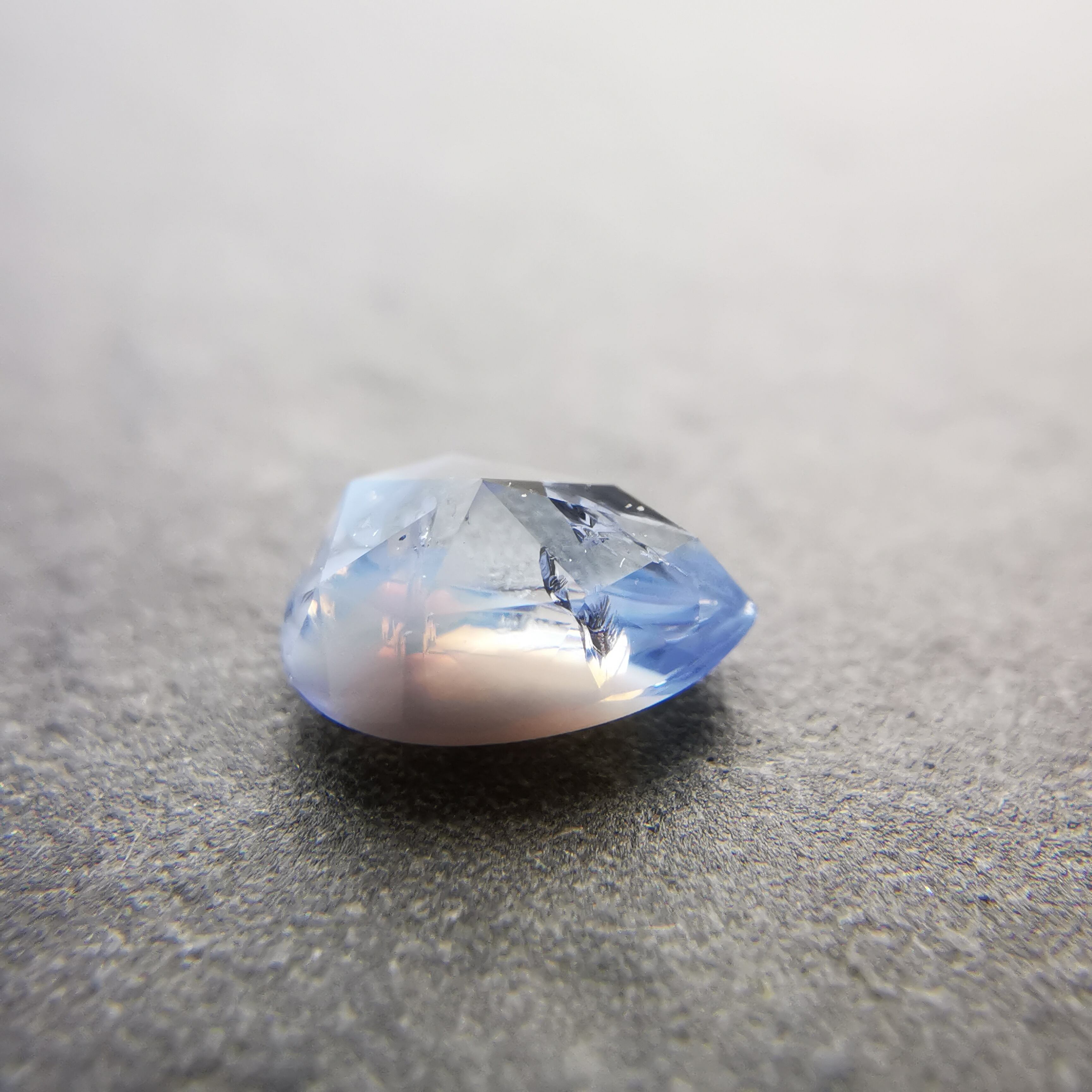 ごくごく淡い澄んだブルーに、青みの明るい灰色/スカイグレーがじわりと入ったサファイアです。
