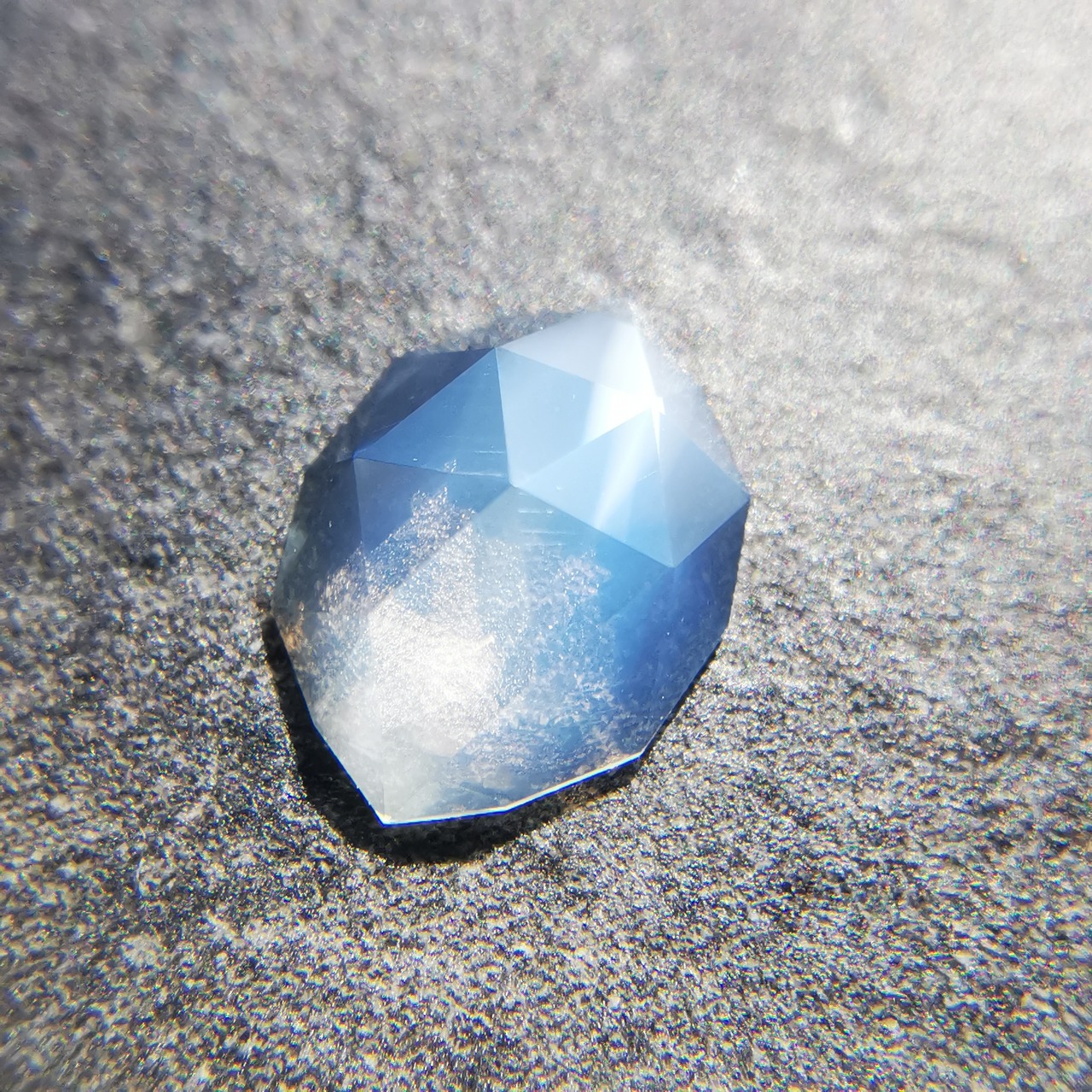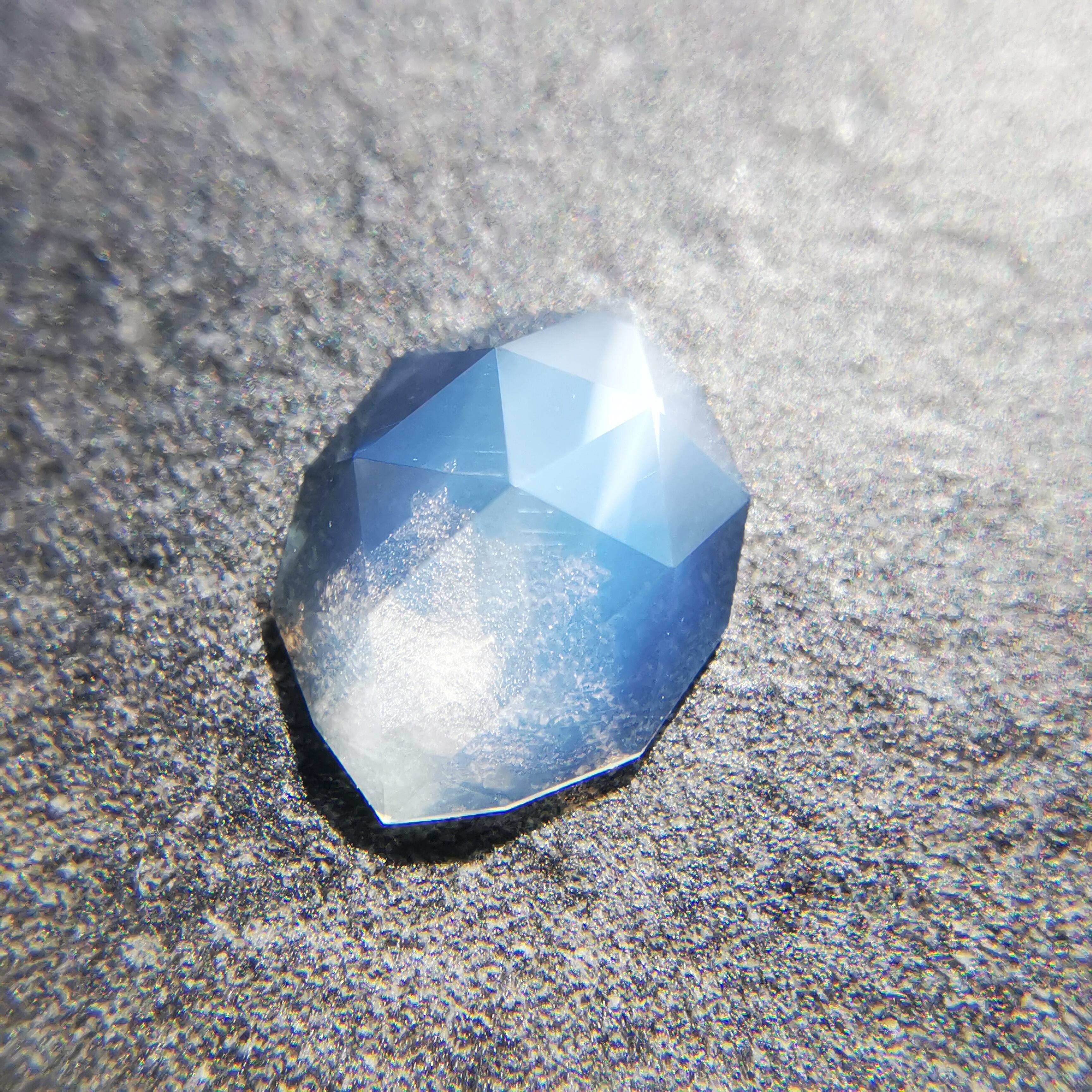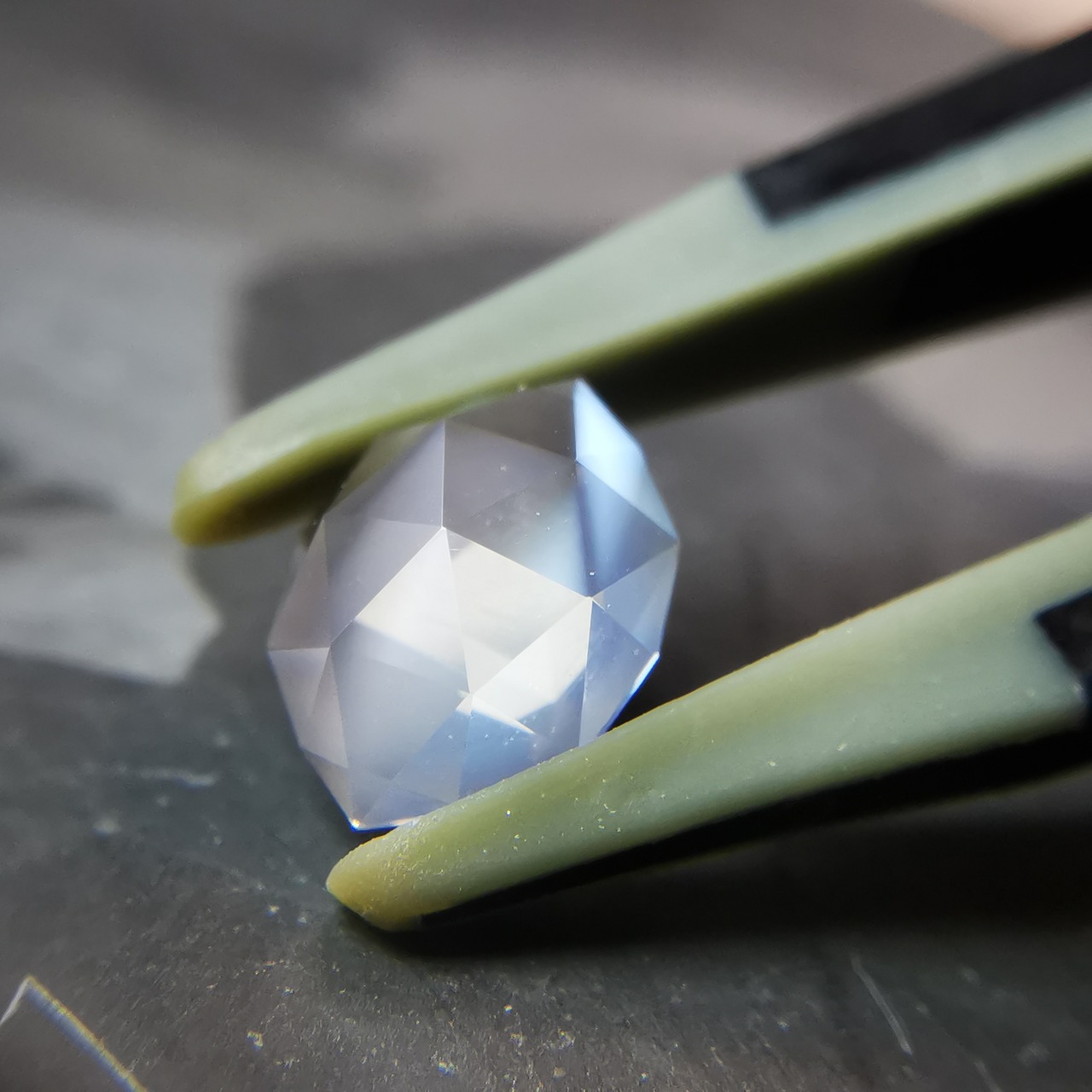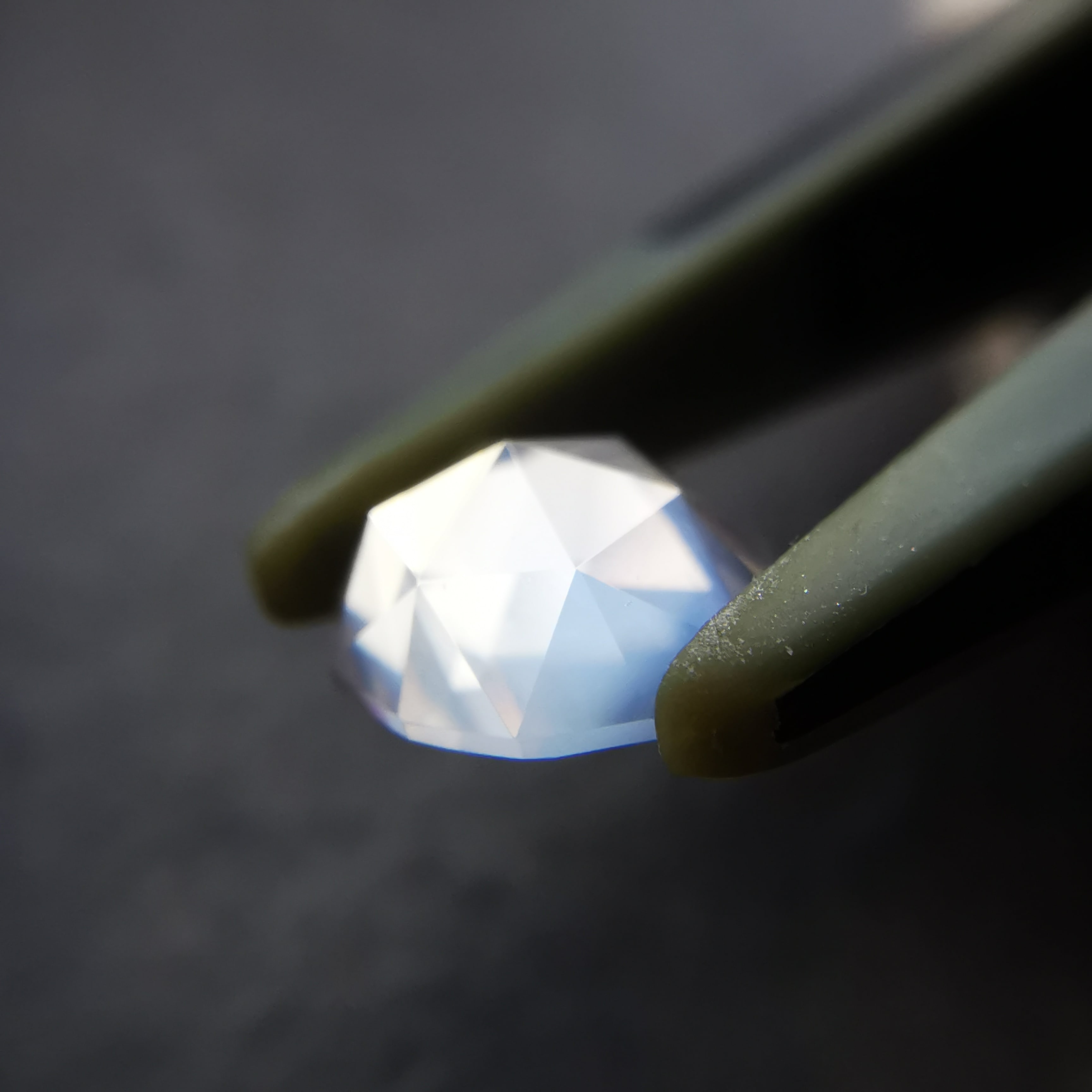 細かなローズカットのファセットの上を、メタリックにも感じるような青白いシラーが滑るように移動します。