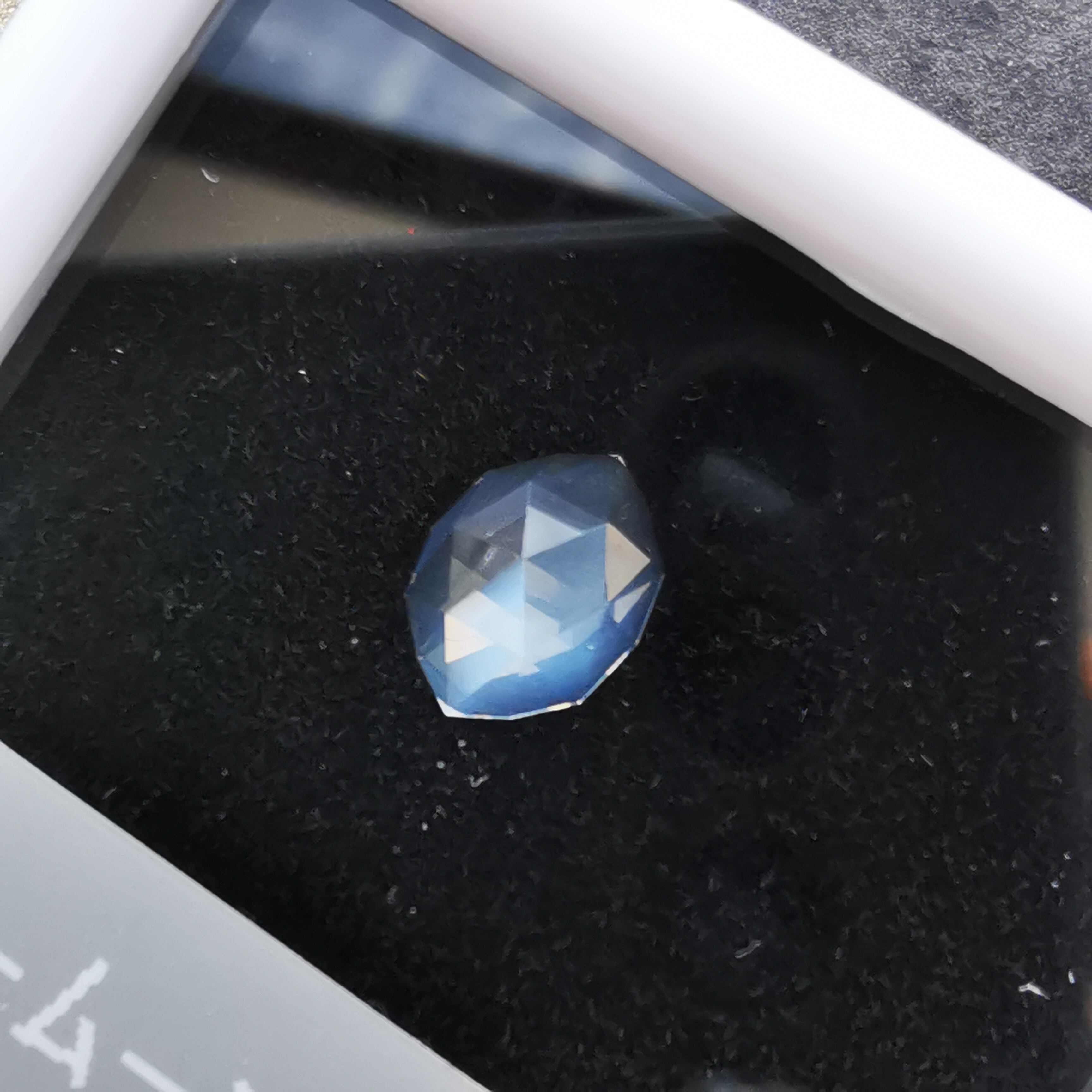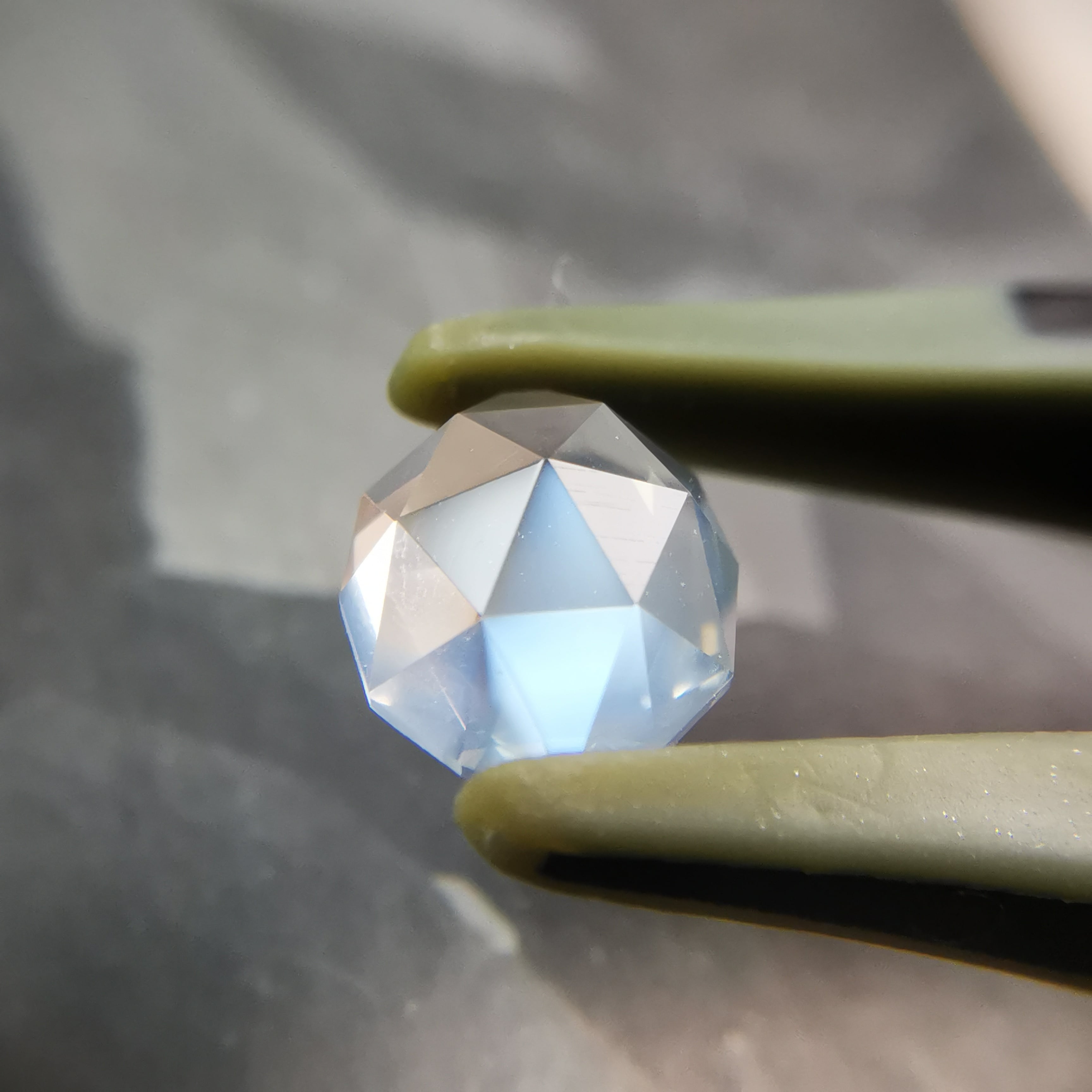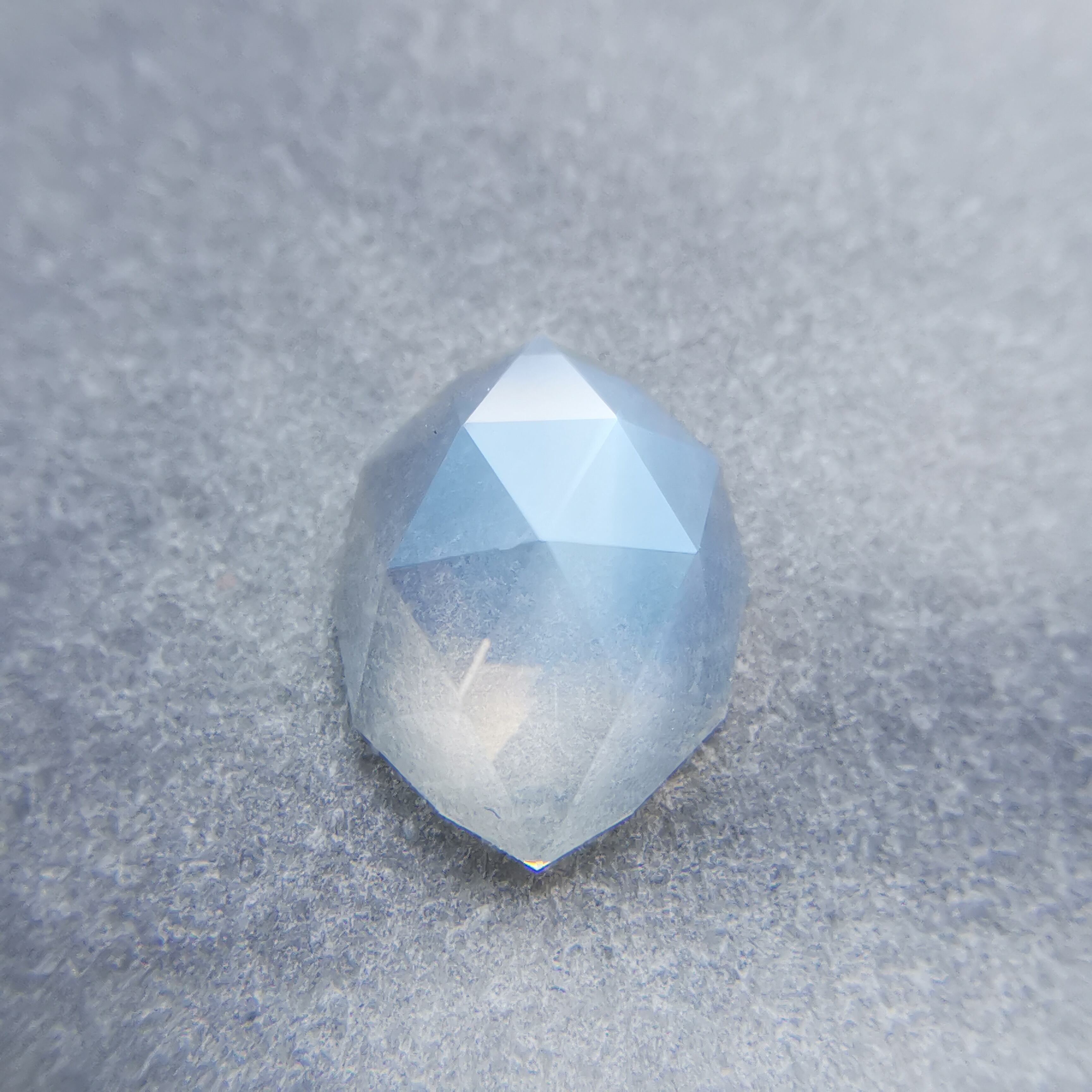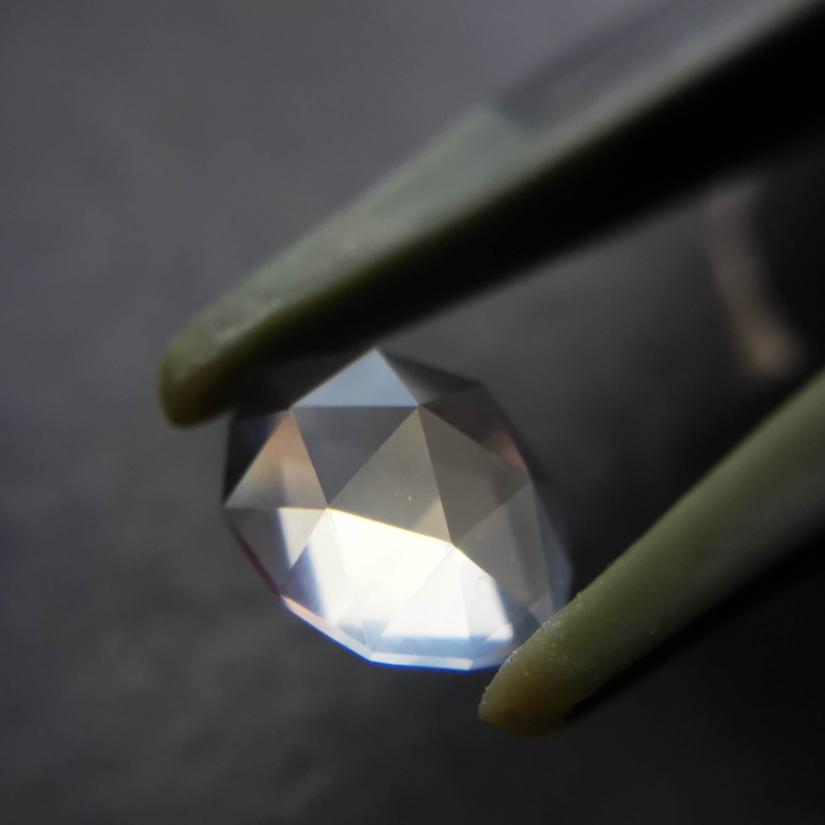 細かなローズカットのファセットの上を、メタリックにも感じるような青白いシラーが滑るように移動します。