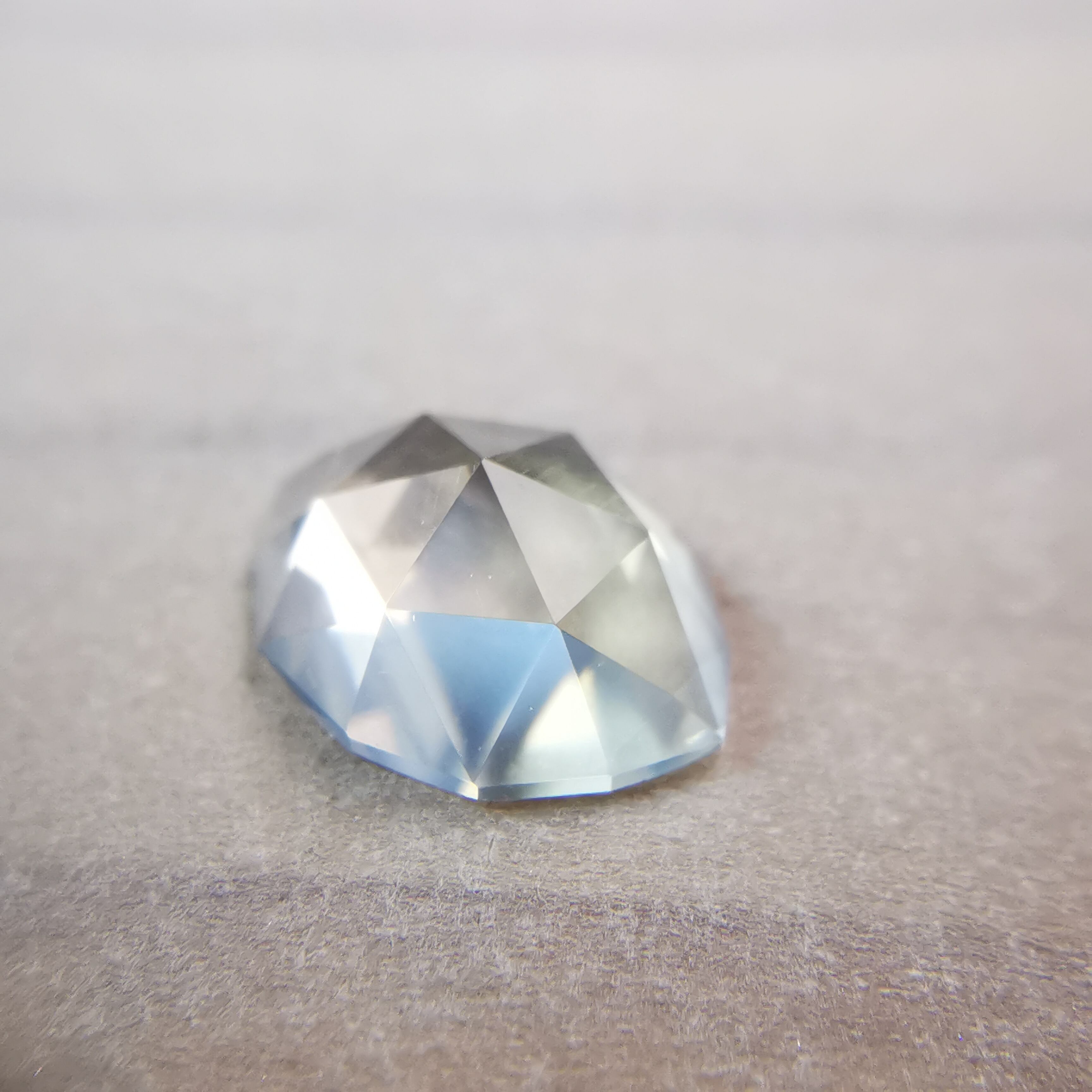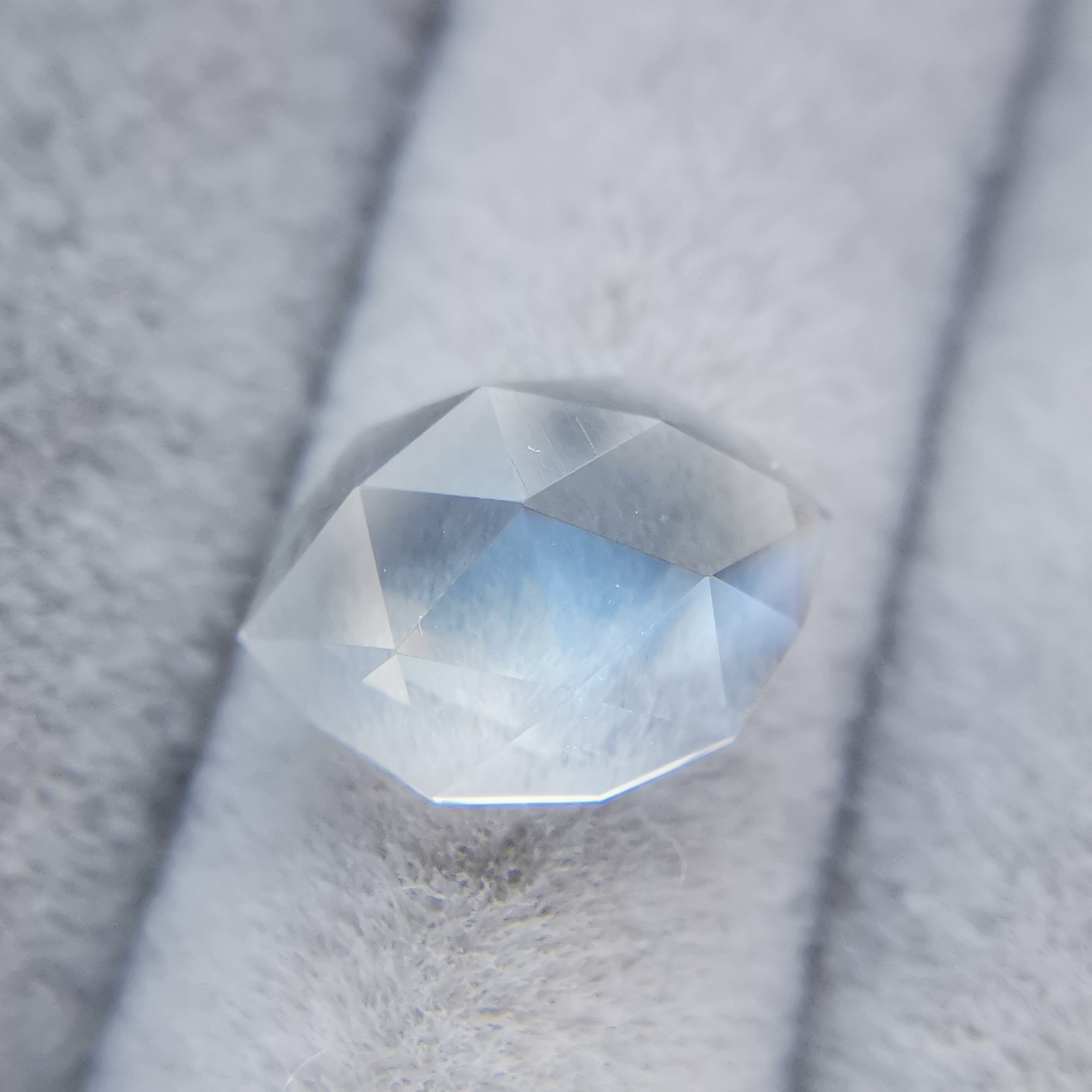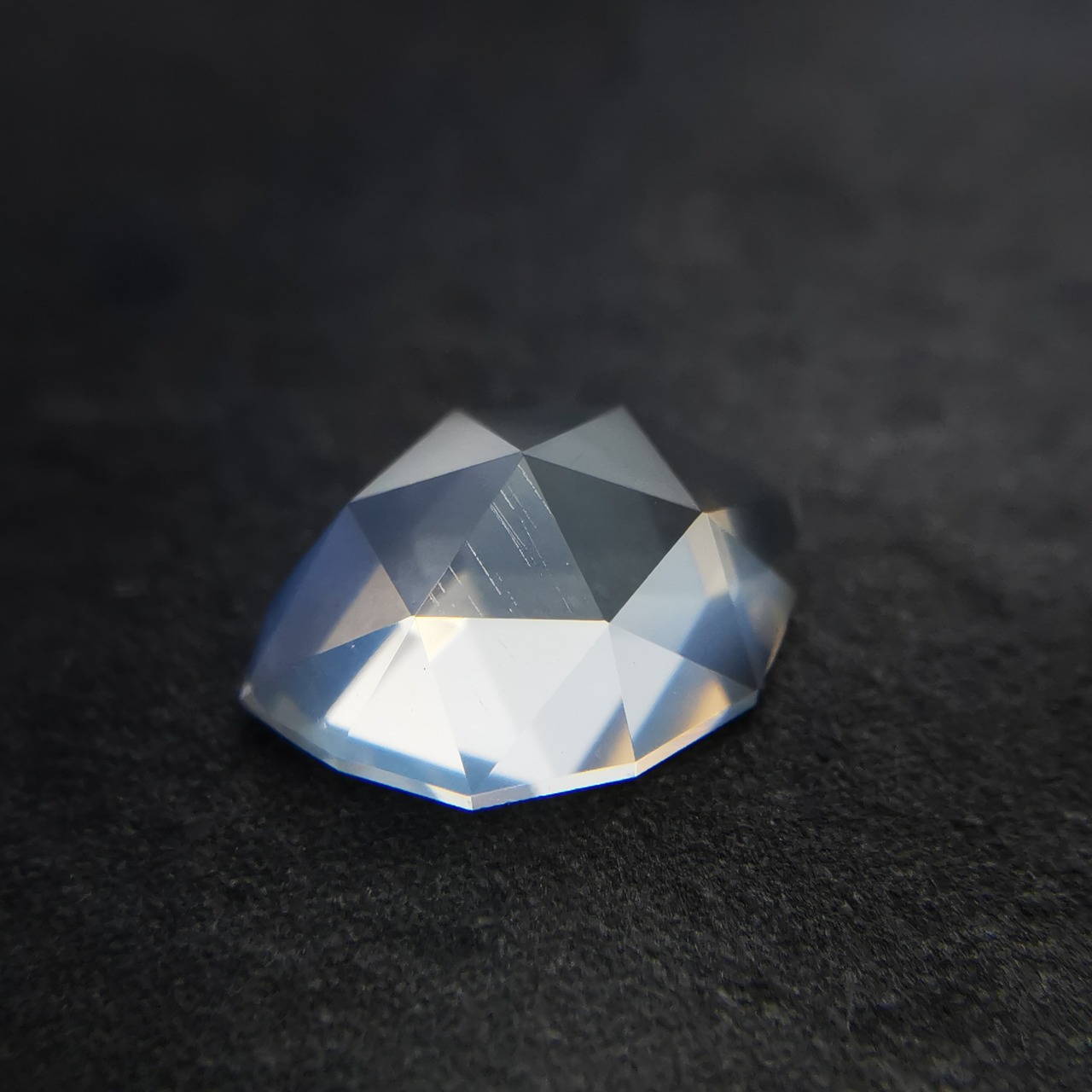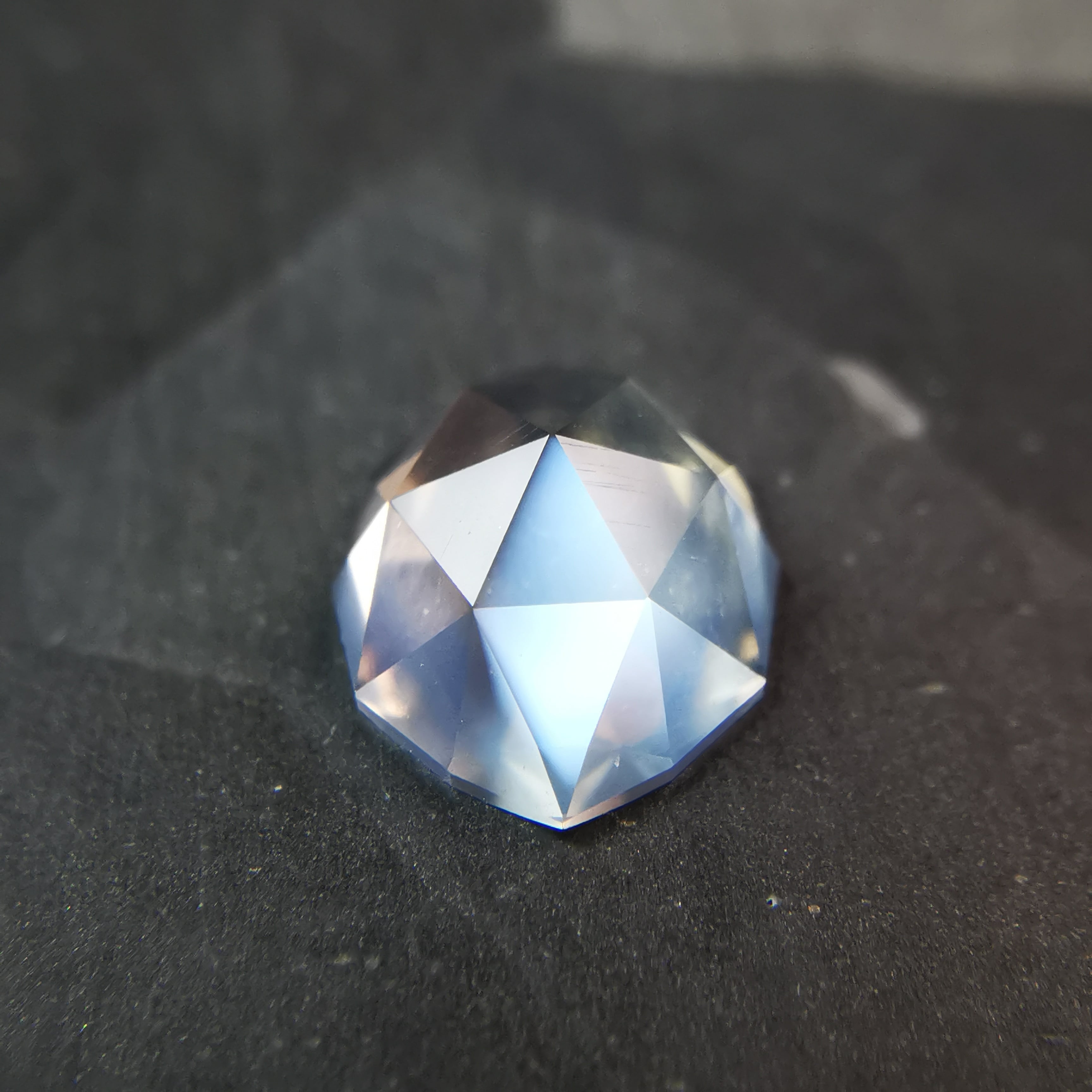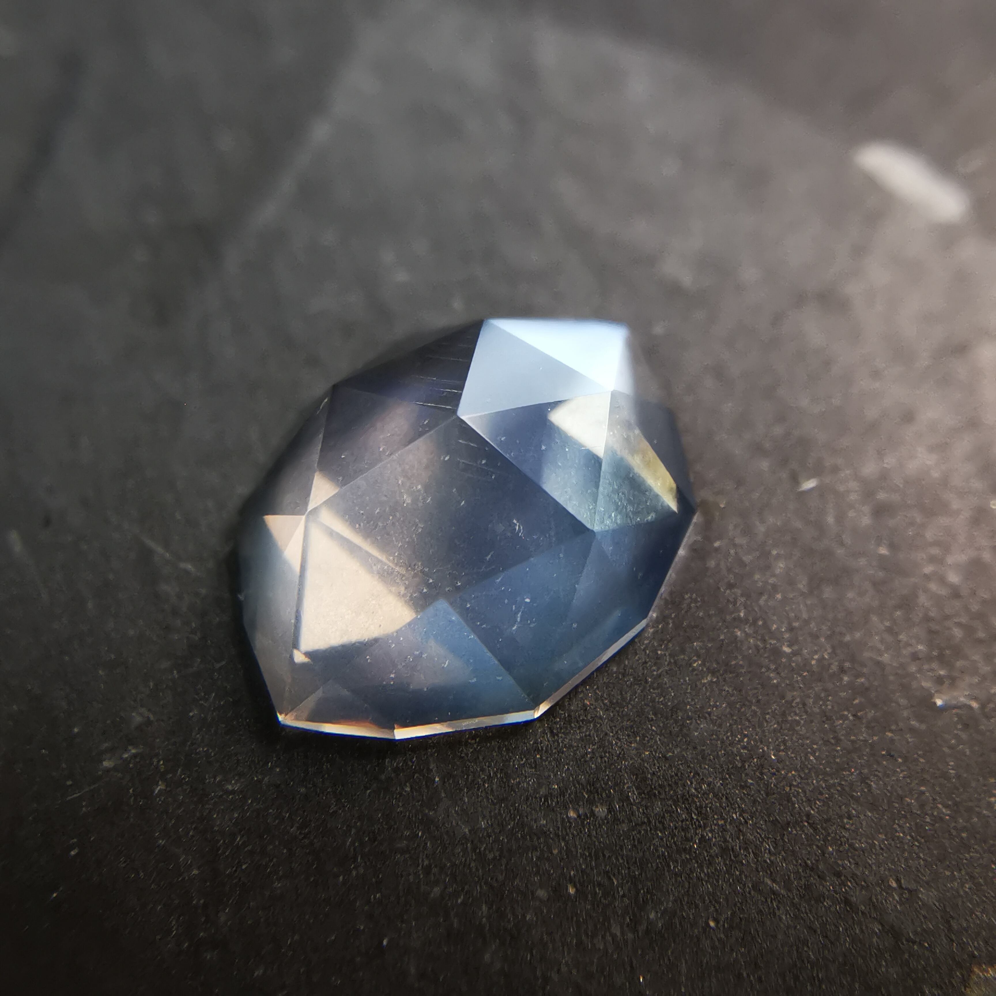 細かなローズカットのファセットの上を、メタリックにも感じるような青白いシラーが滑るように移動します。