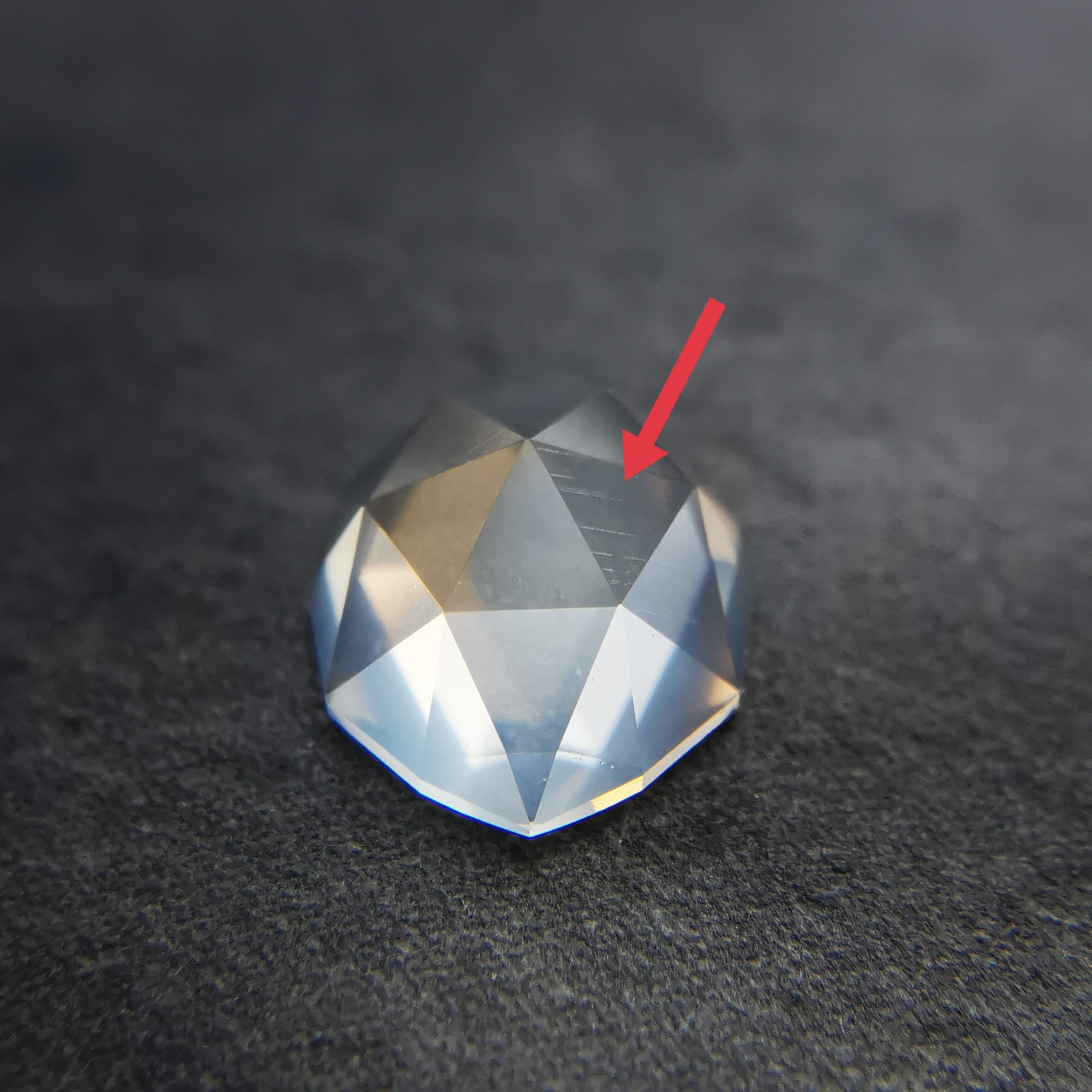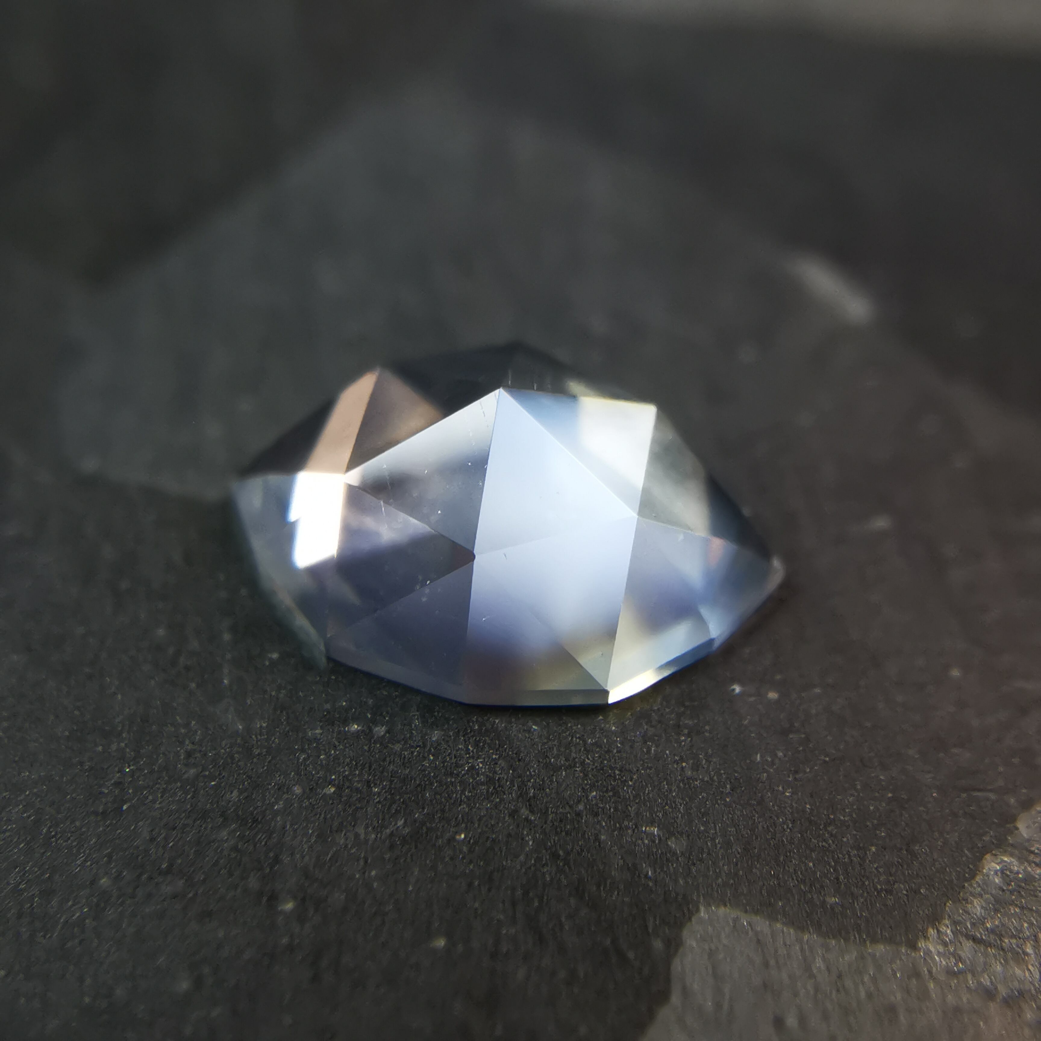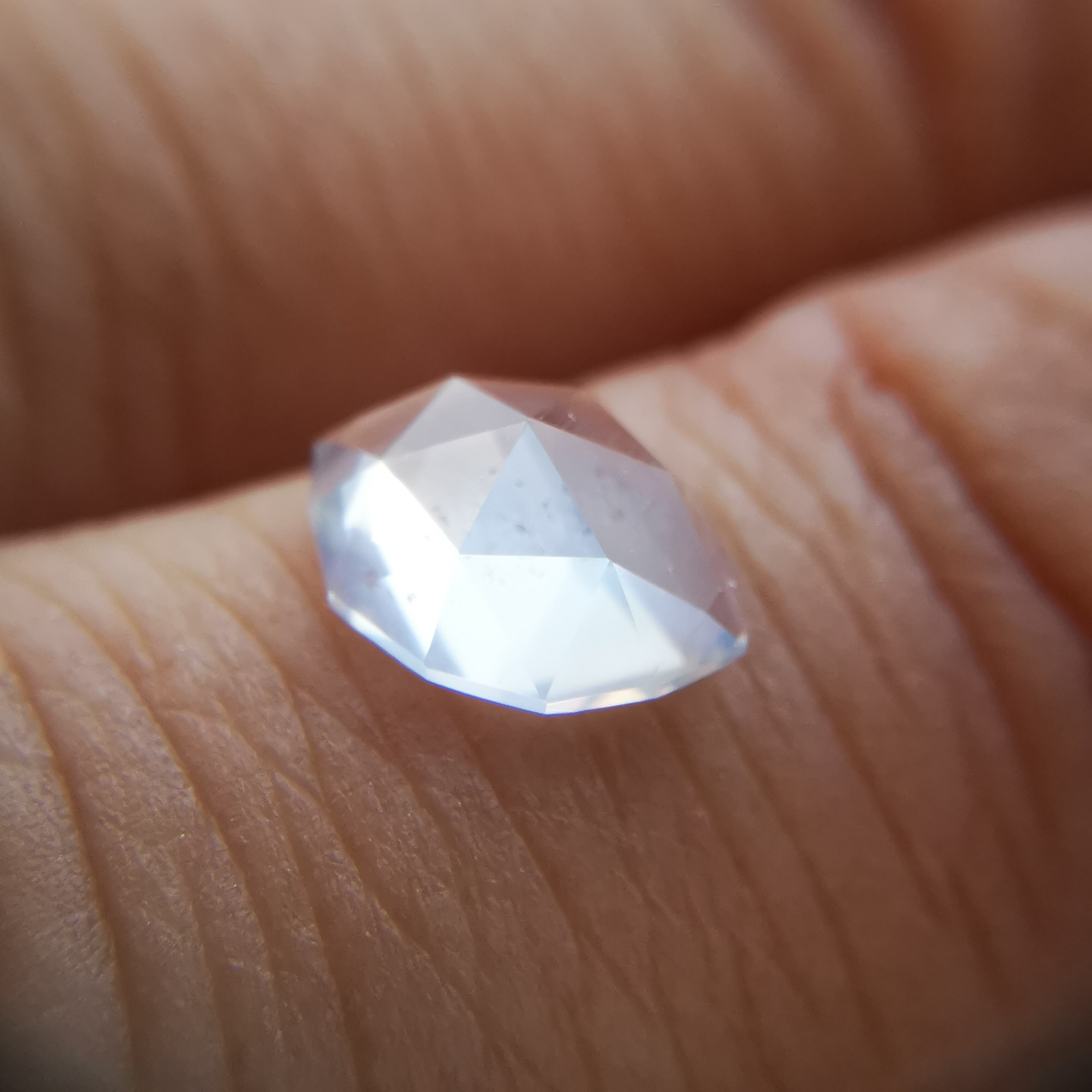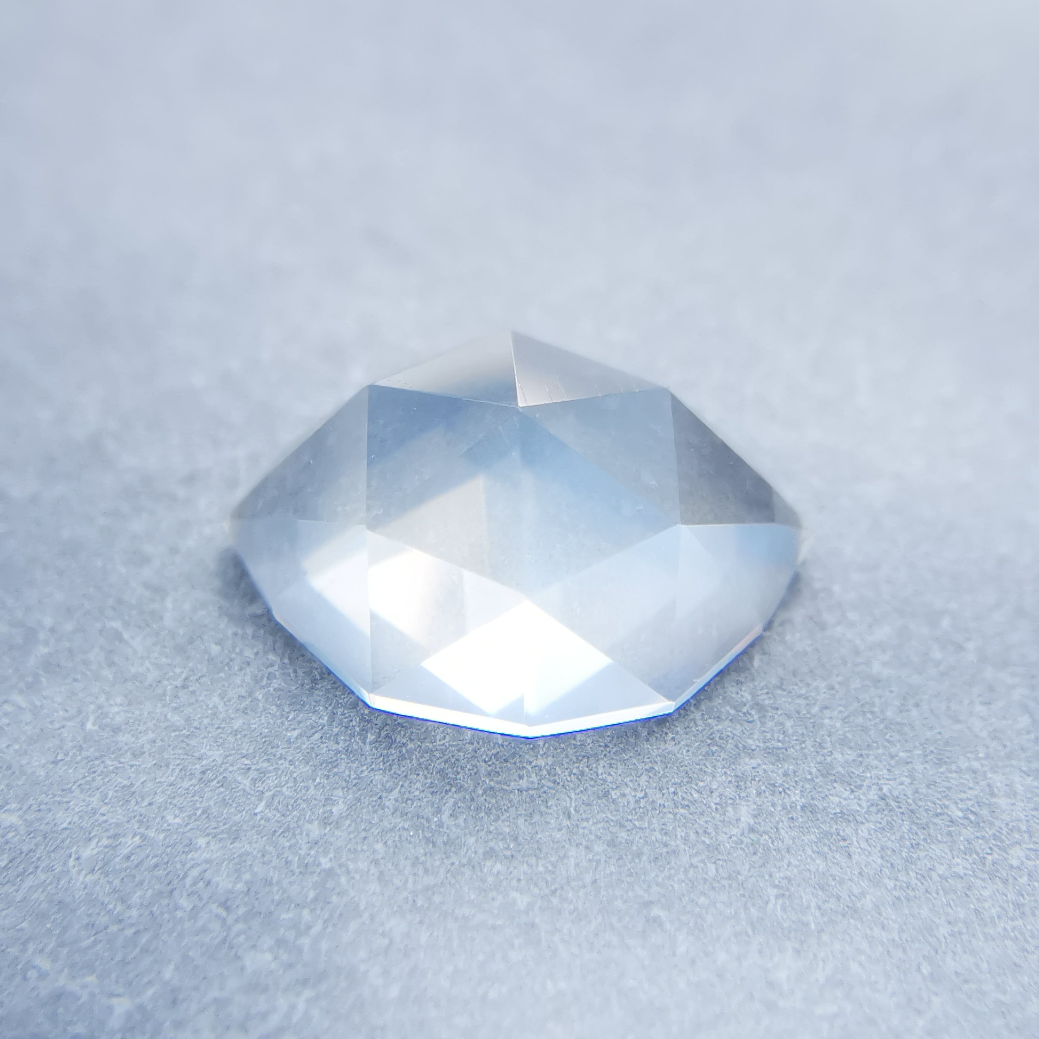 細かなローズカットのファセットの上を、メタリックにも感じるような青白いシラーが滑るように移動します。