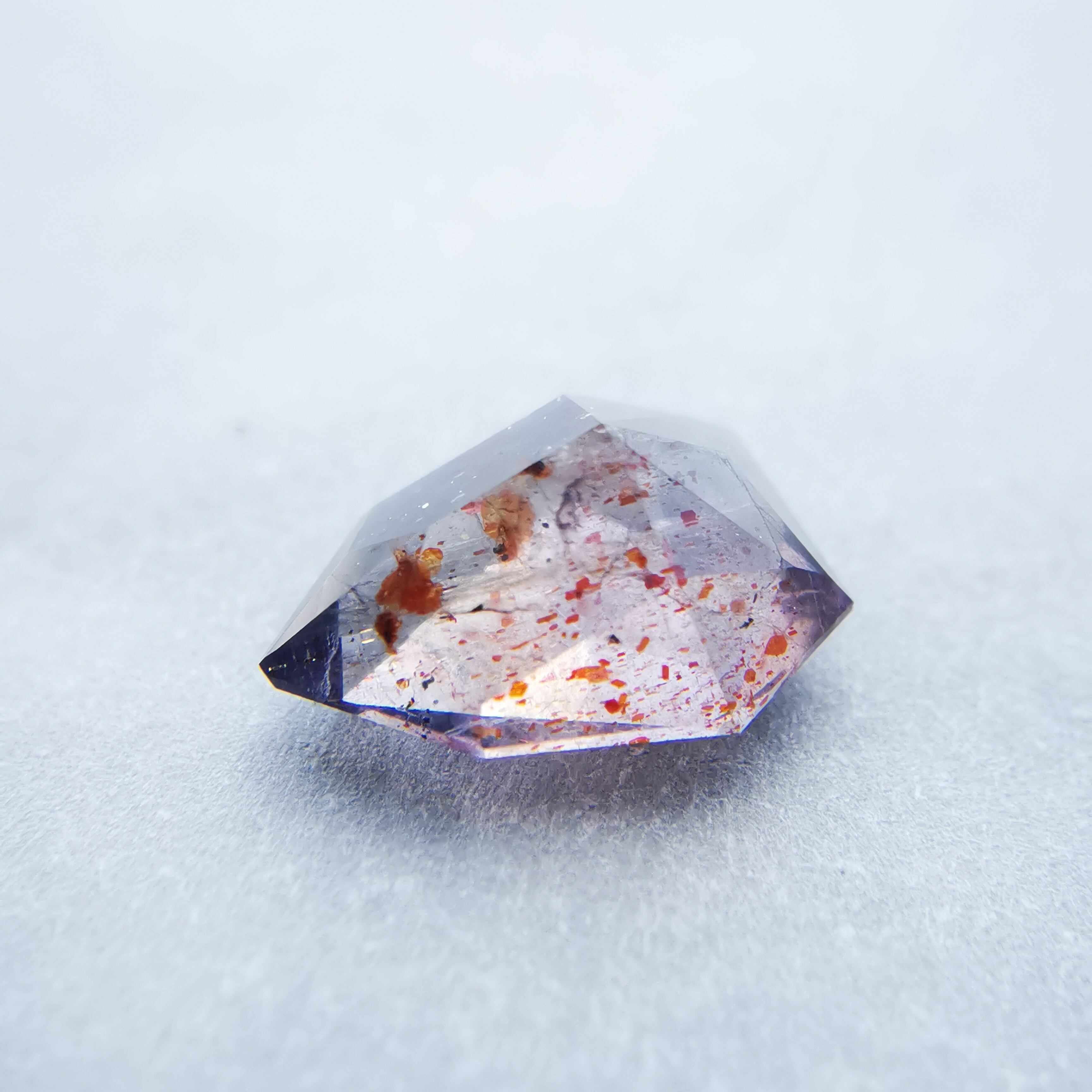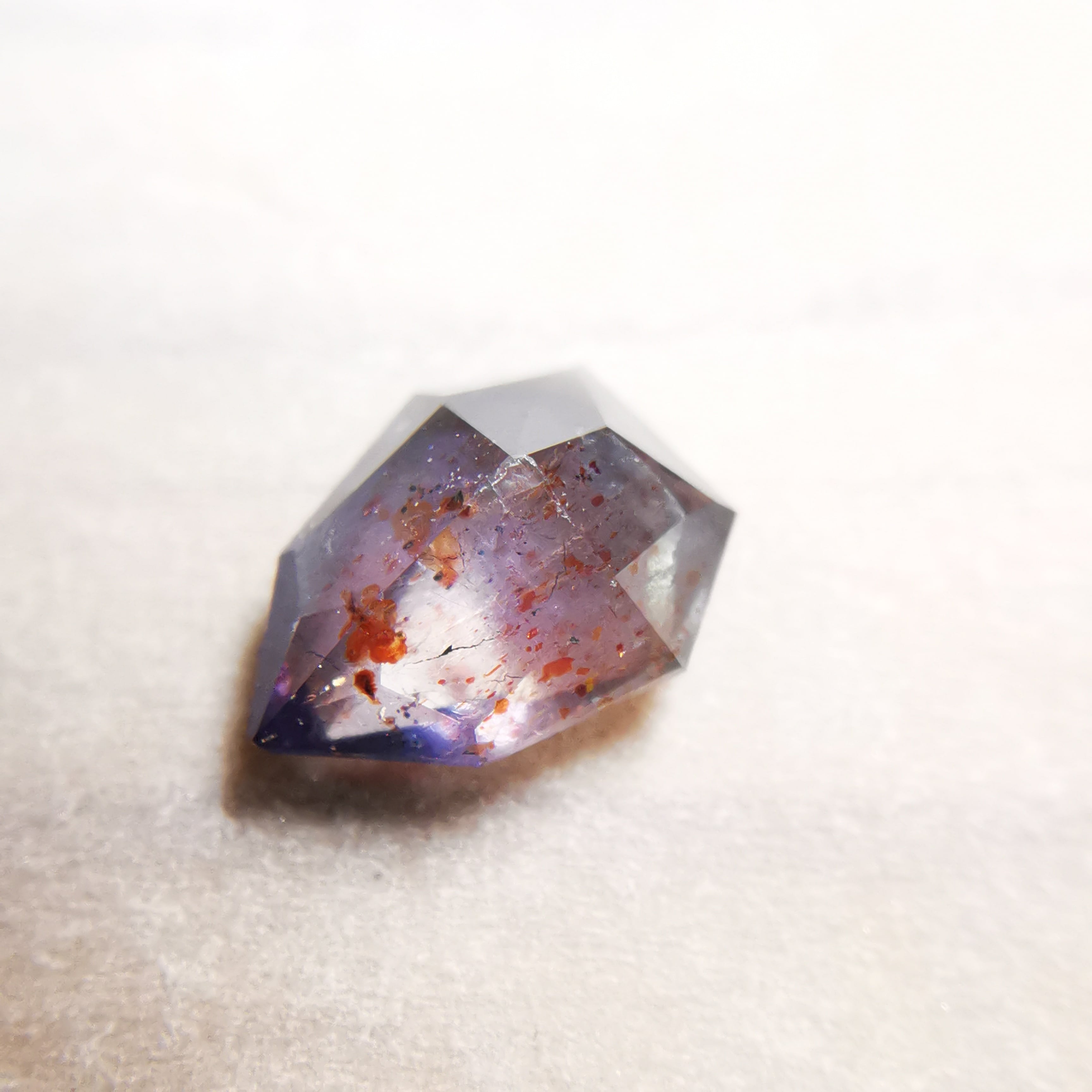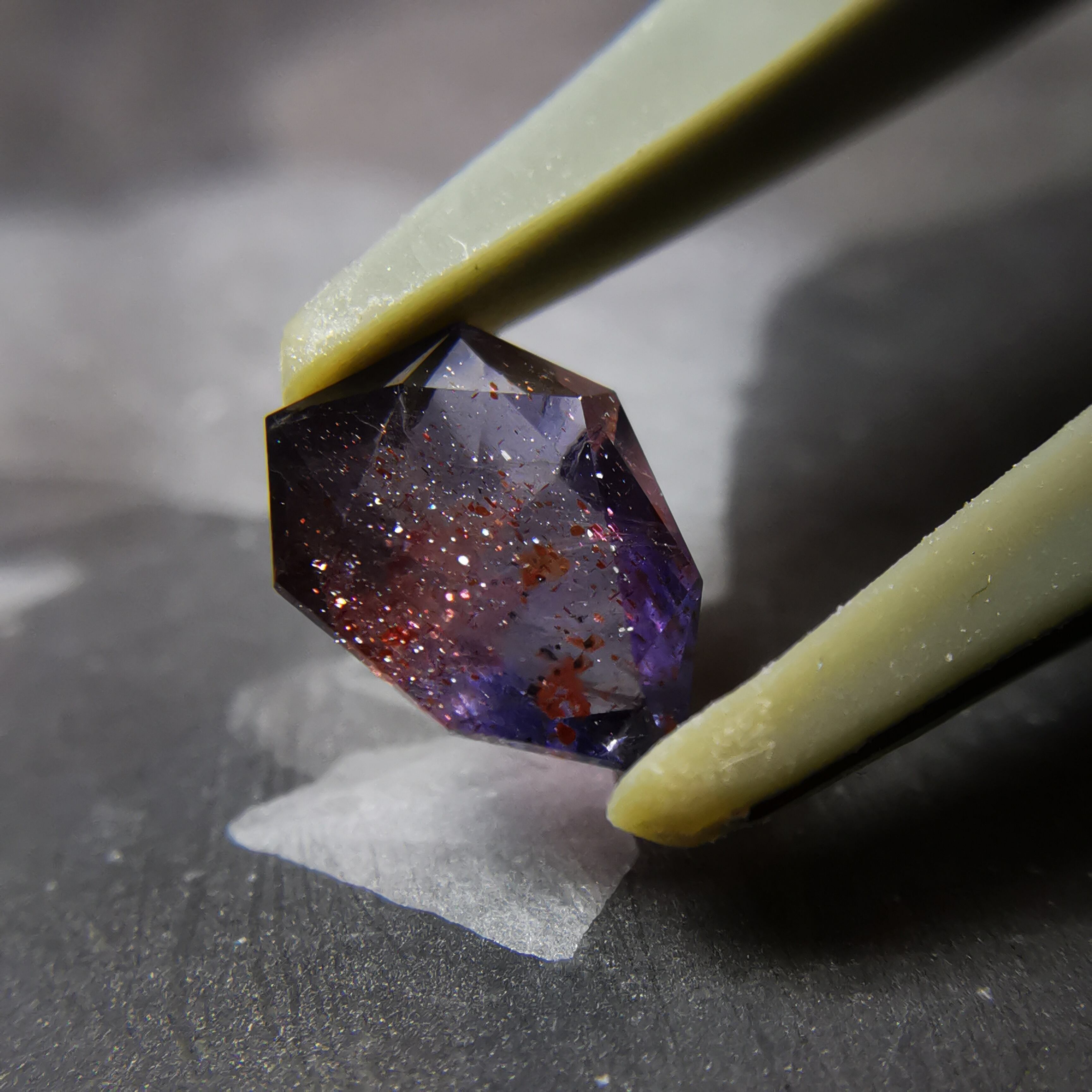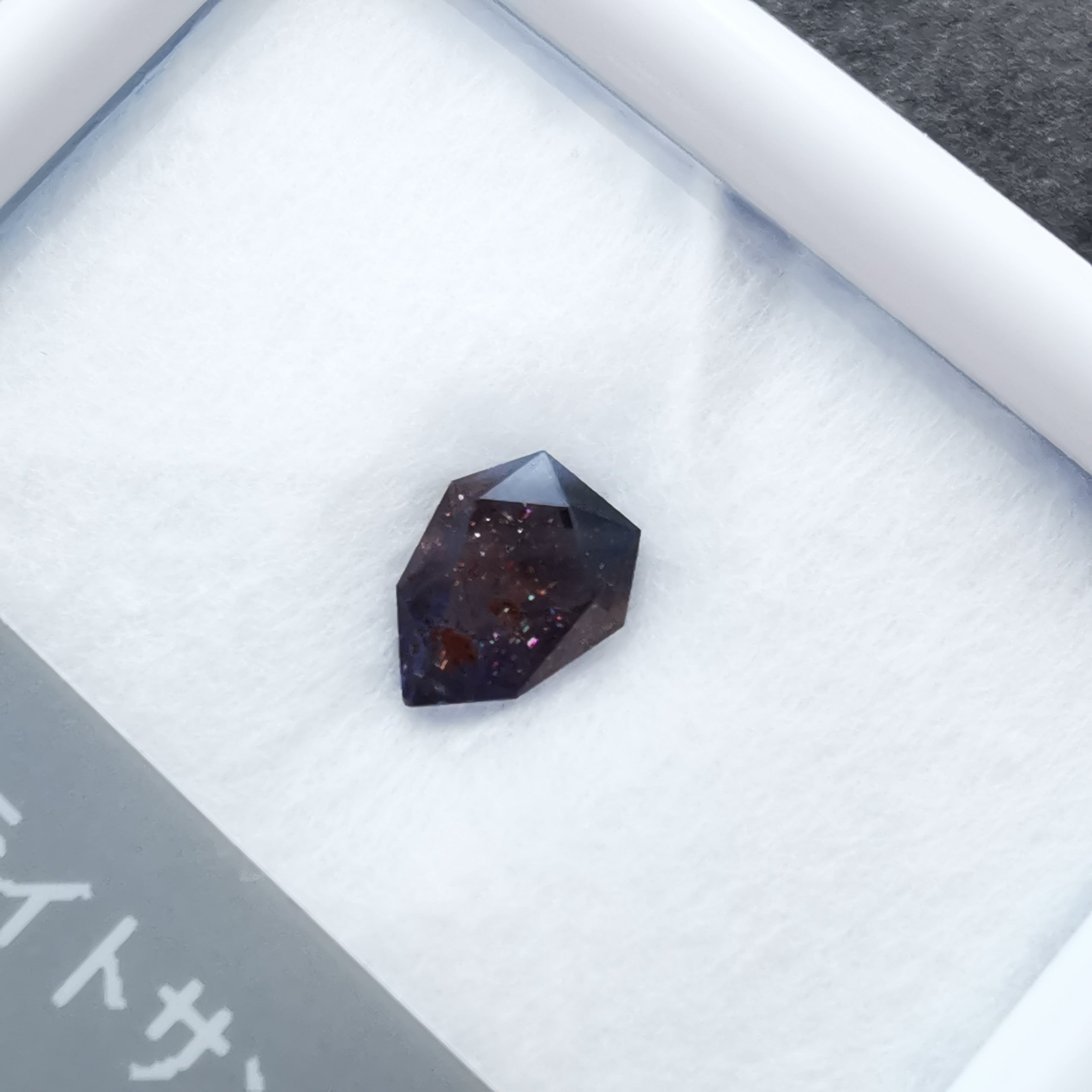 フェイスからも多色性を感じるような色みで、シールドカットの先端とおしりは暗く濃く、中心部は色が薄くなりキュレットがわずかに見通せるようです。