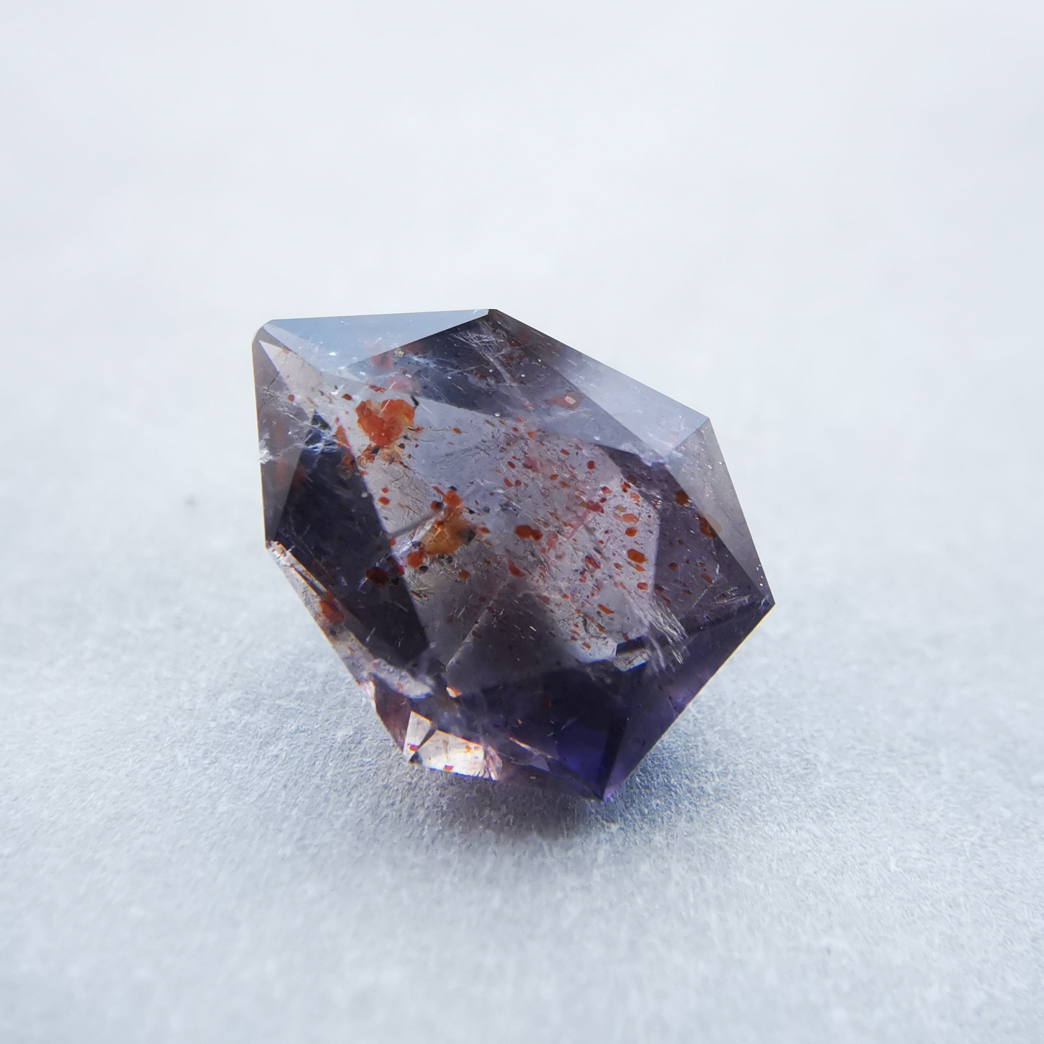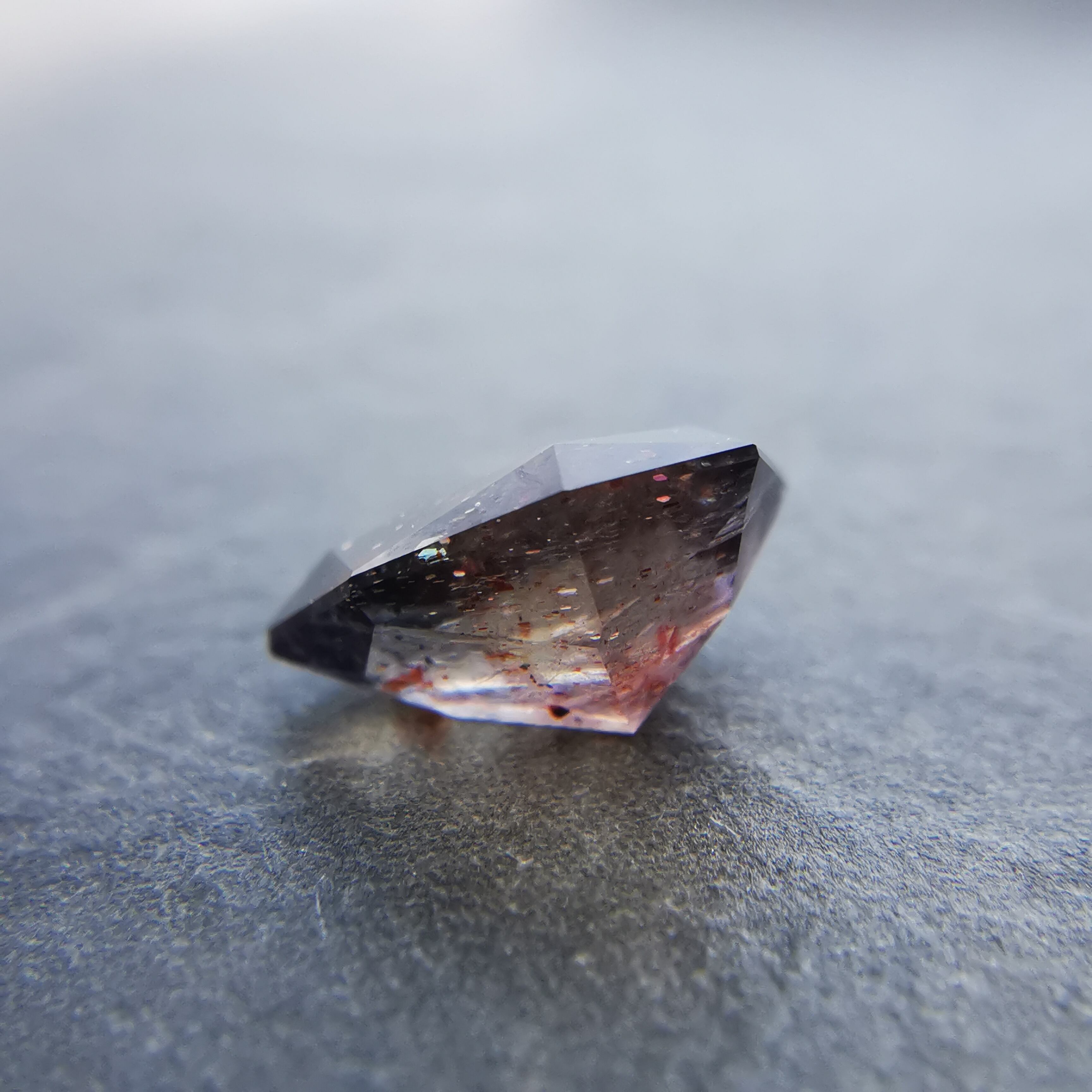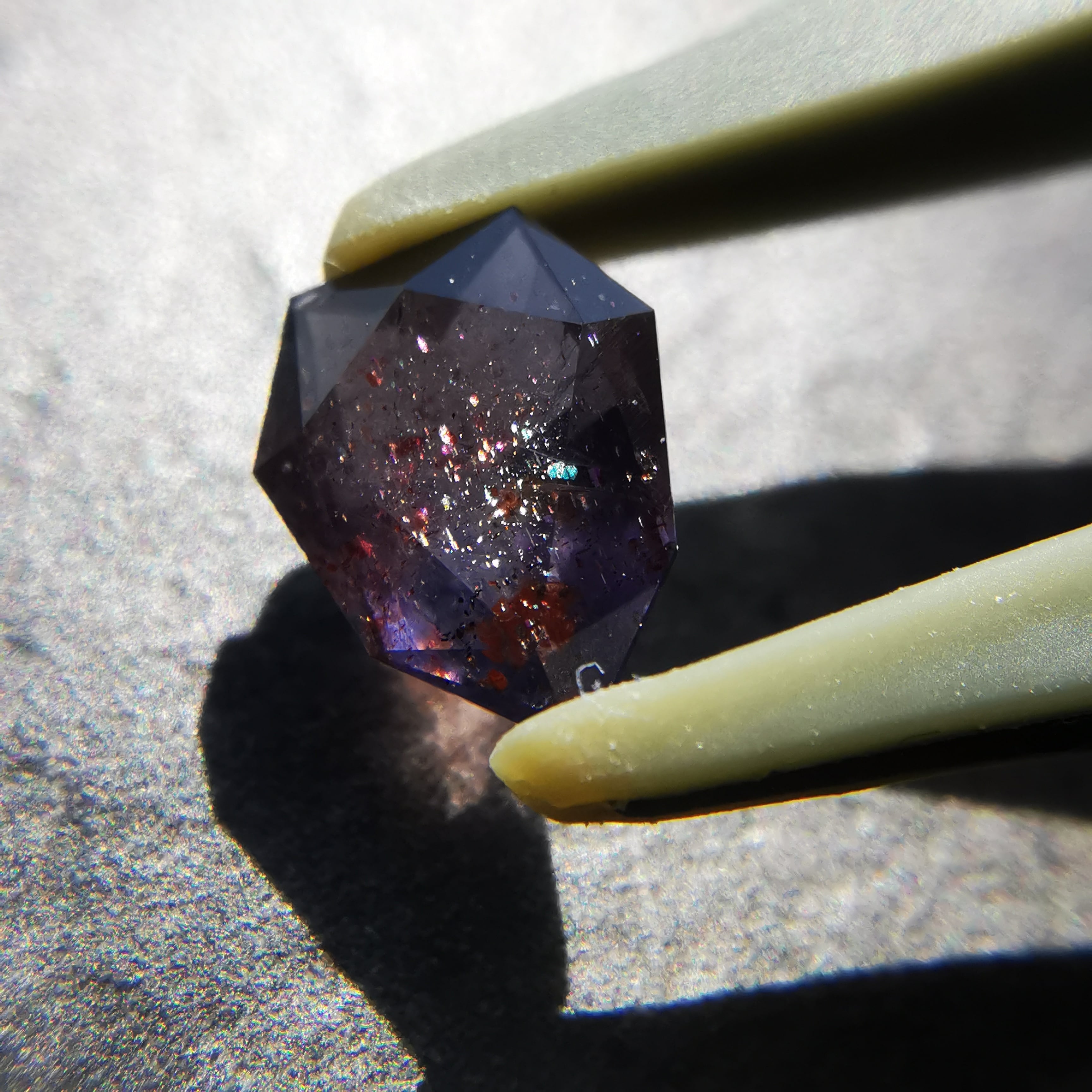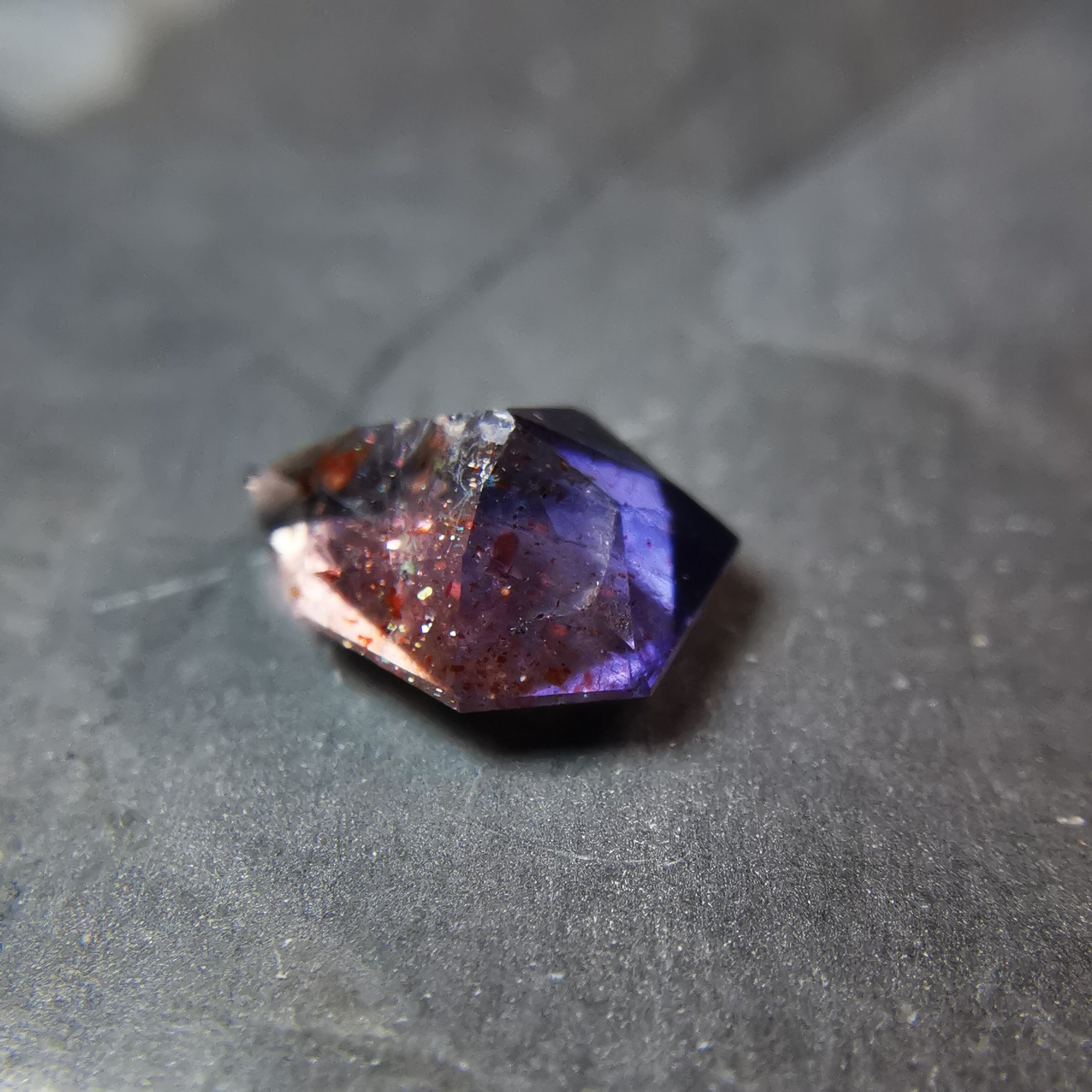 フェイスからも多色性を感じるような色みで、シールドカットの先端とおしりは暗く濃く、中心部は色が薄くなりキュレットがわずかに見通せるようです。