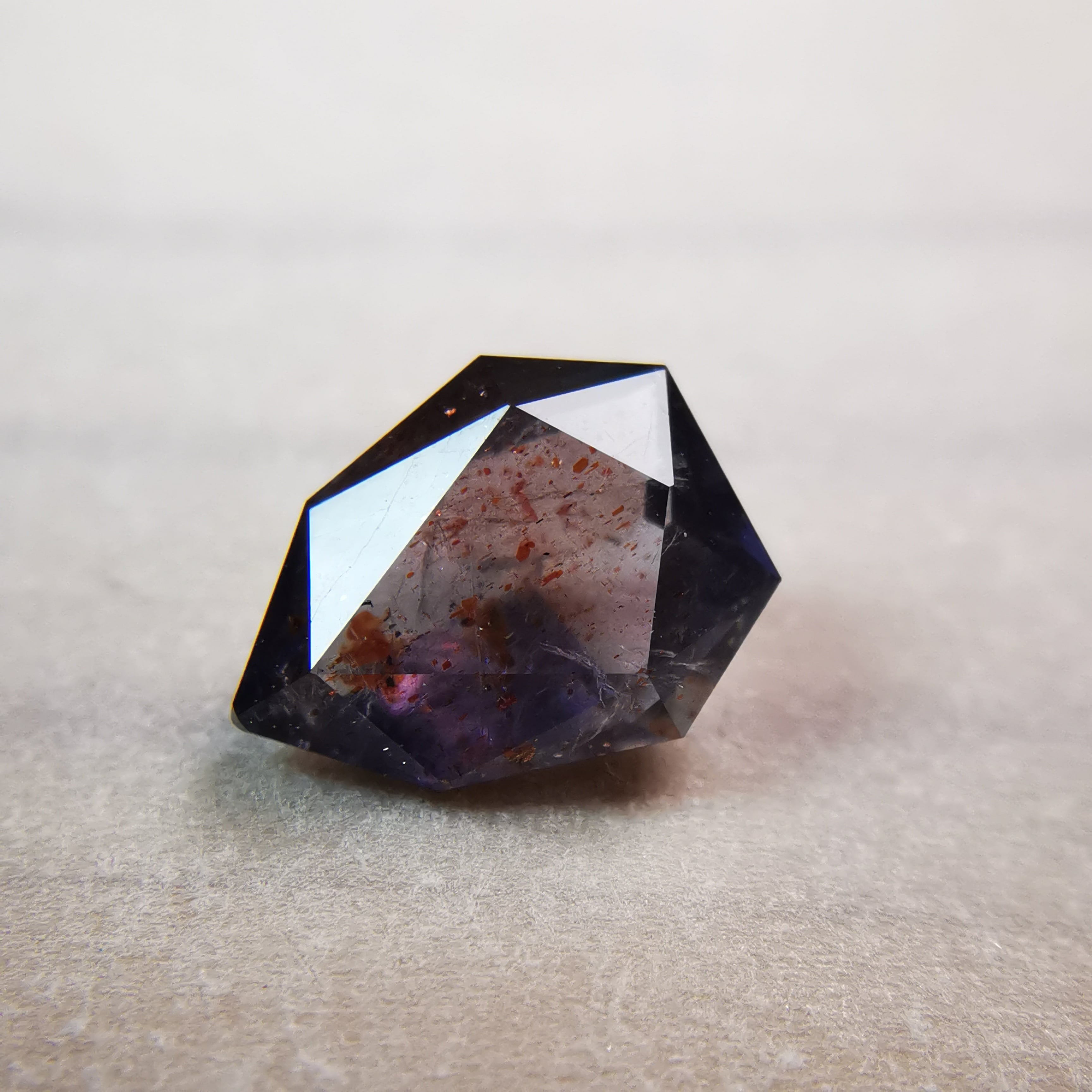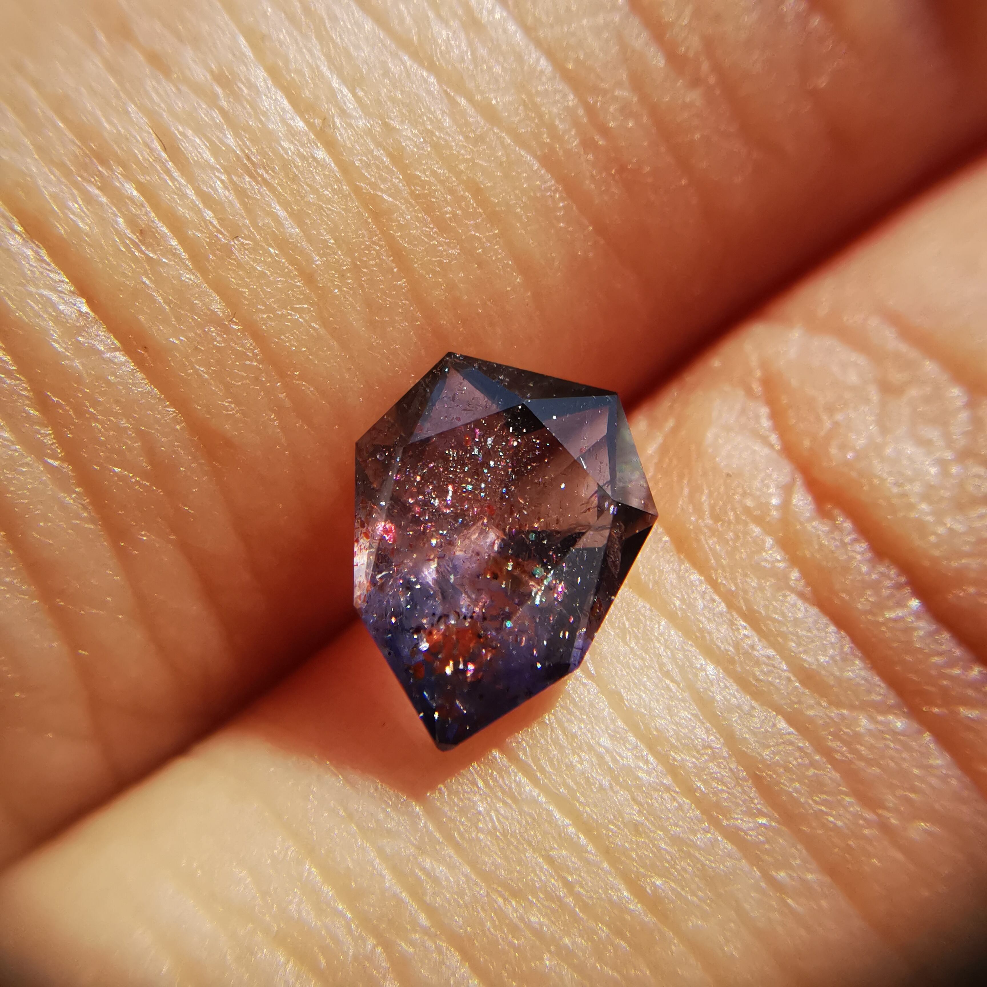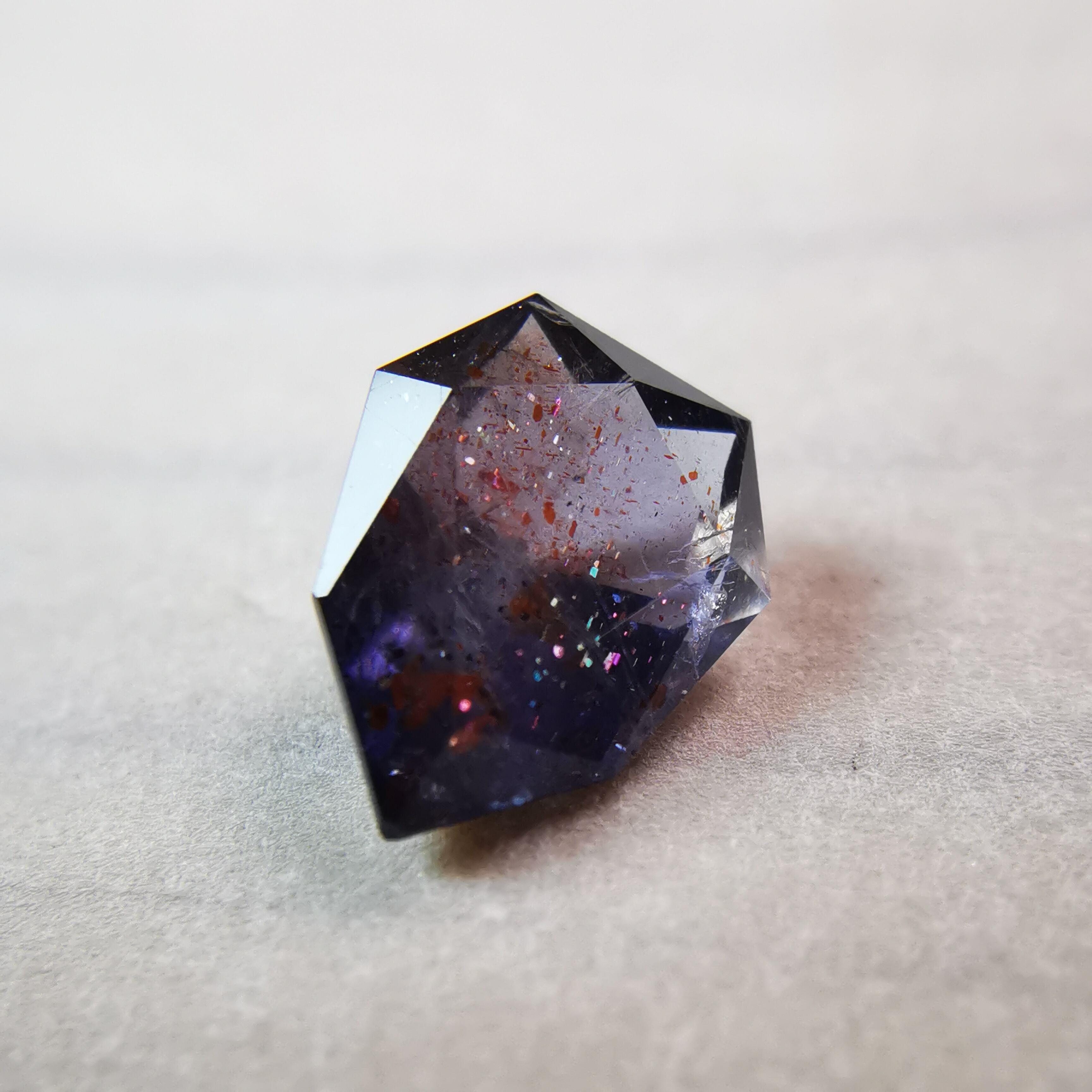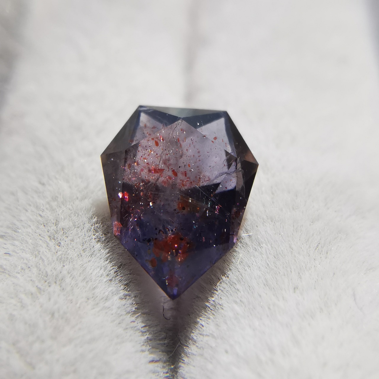 フェイスからも多色性を感じるような色みで、シールドカットの先端とおしりは暗く濃く、中心部は色が薄くなりキュレットがわずかに見通せるようです。