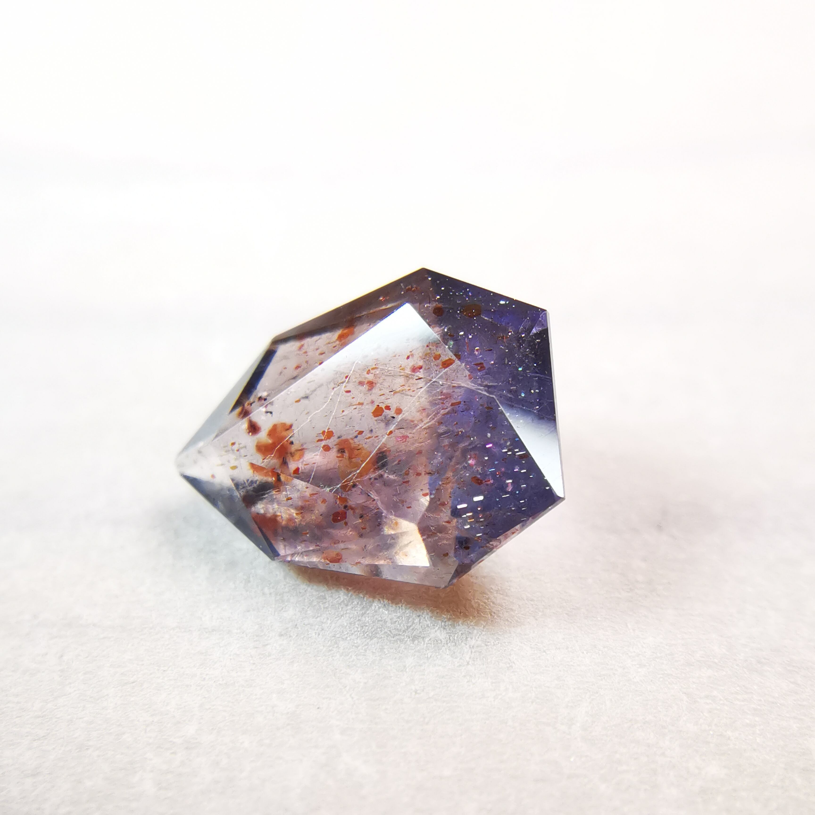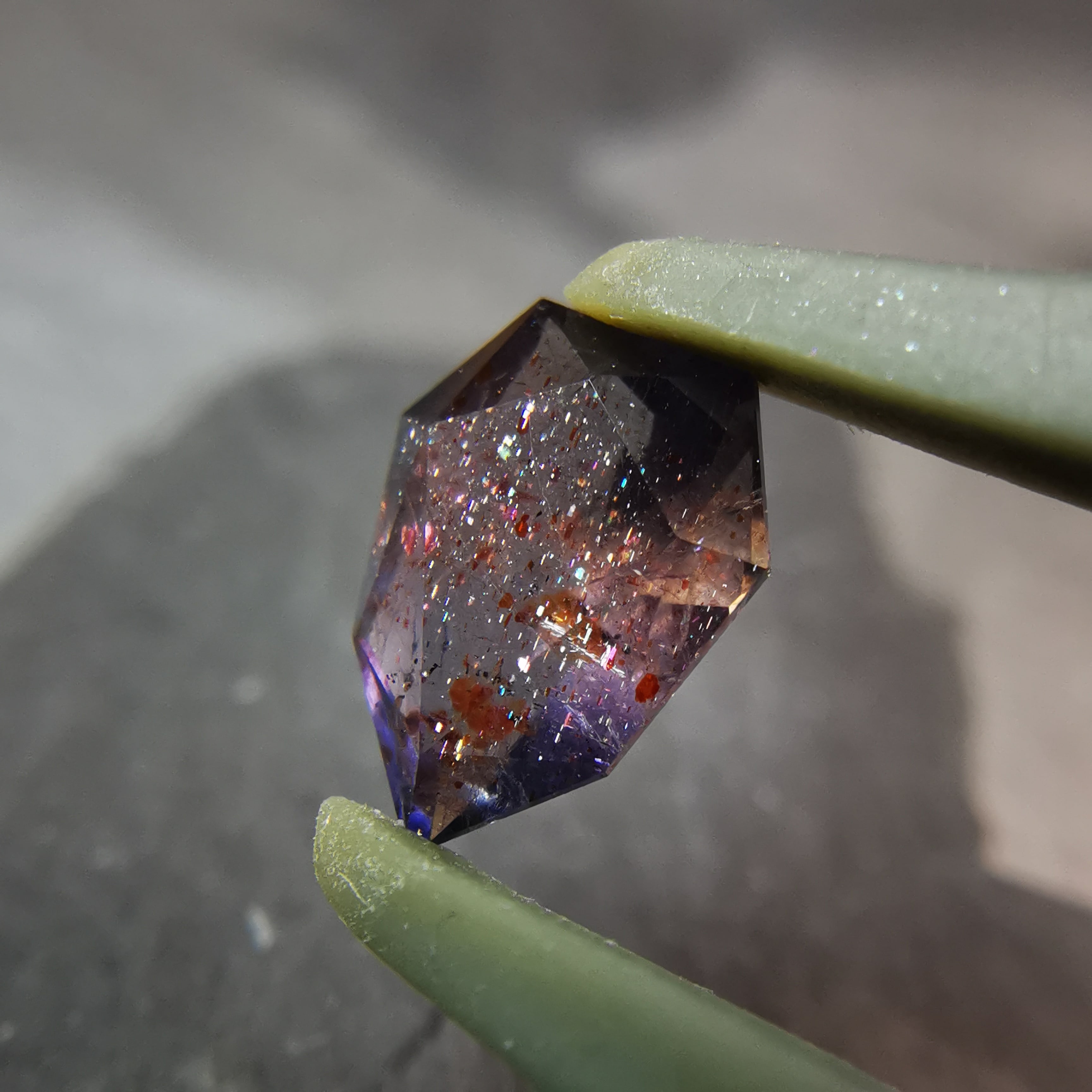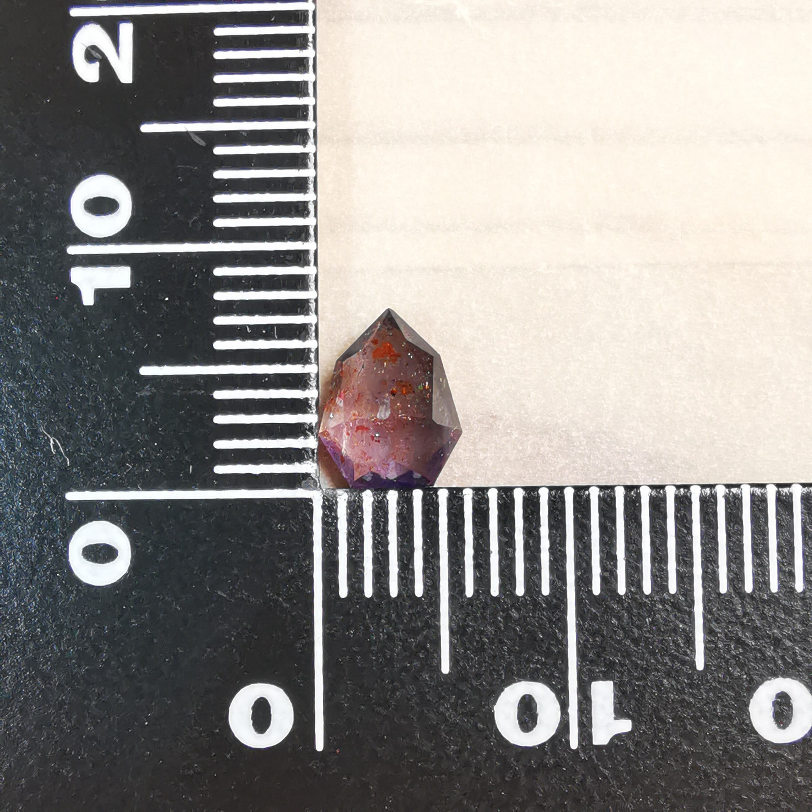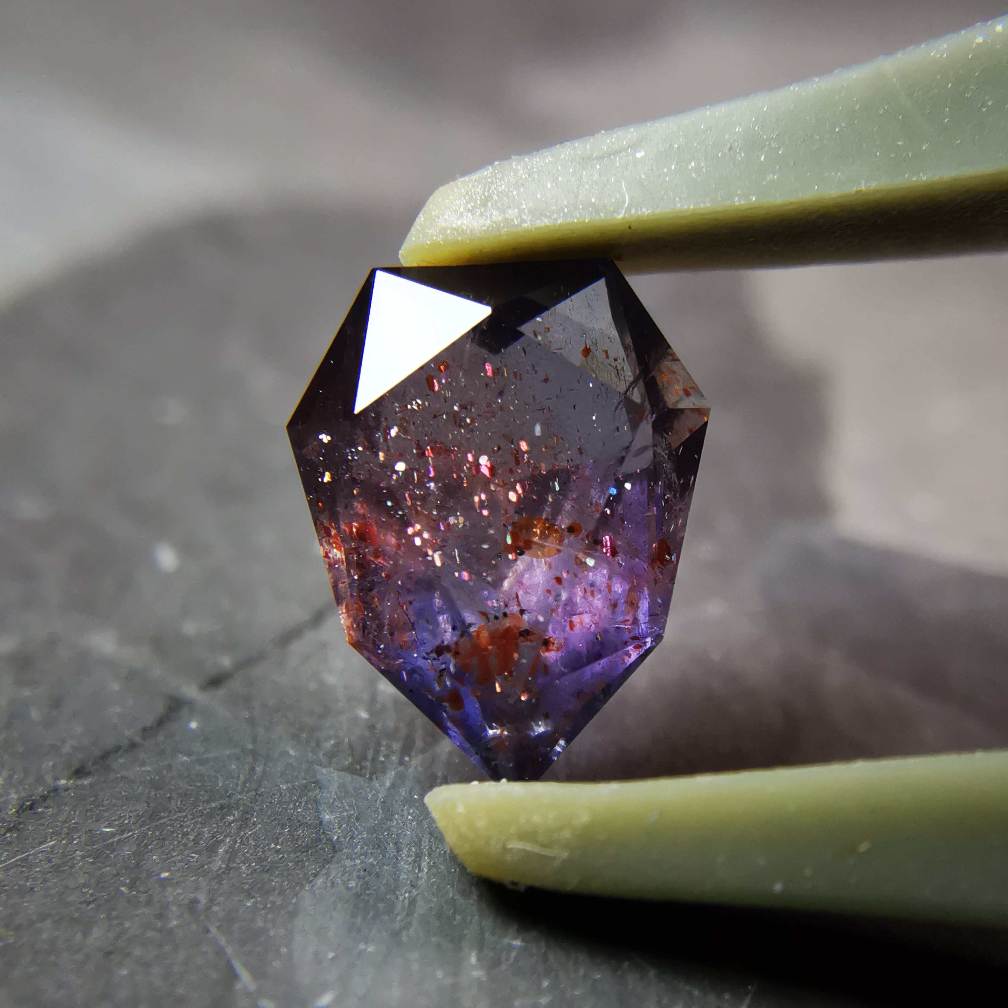 フェイスからも多色性を感じるような色みで、シールドカットの先端とおしりは暗く濃く、中心部は色が薄くなりキュレットがわずかに見通せるようです。