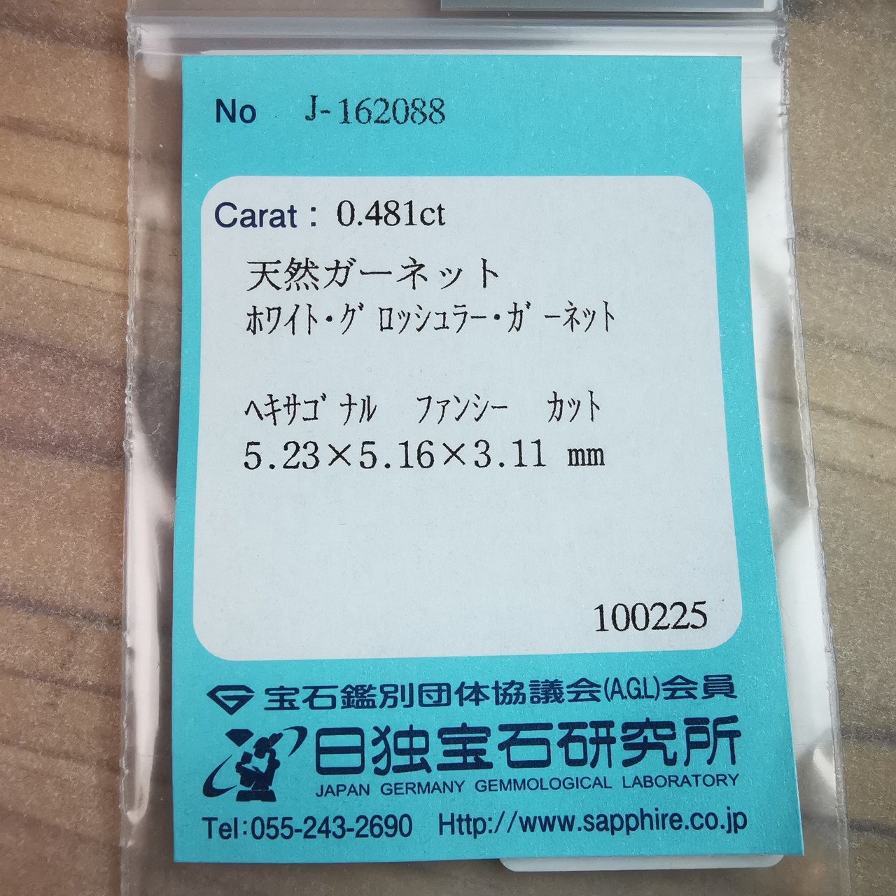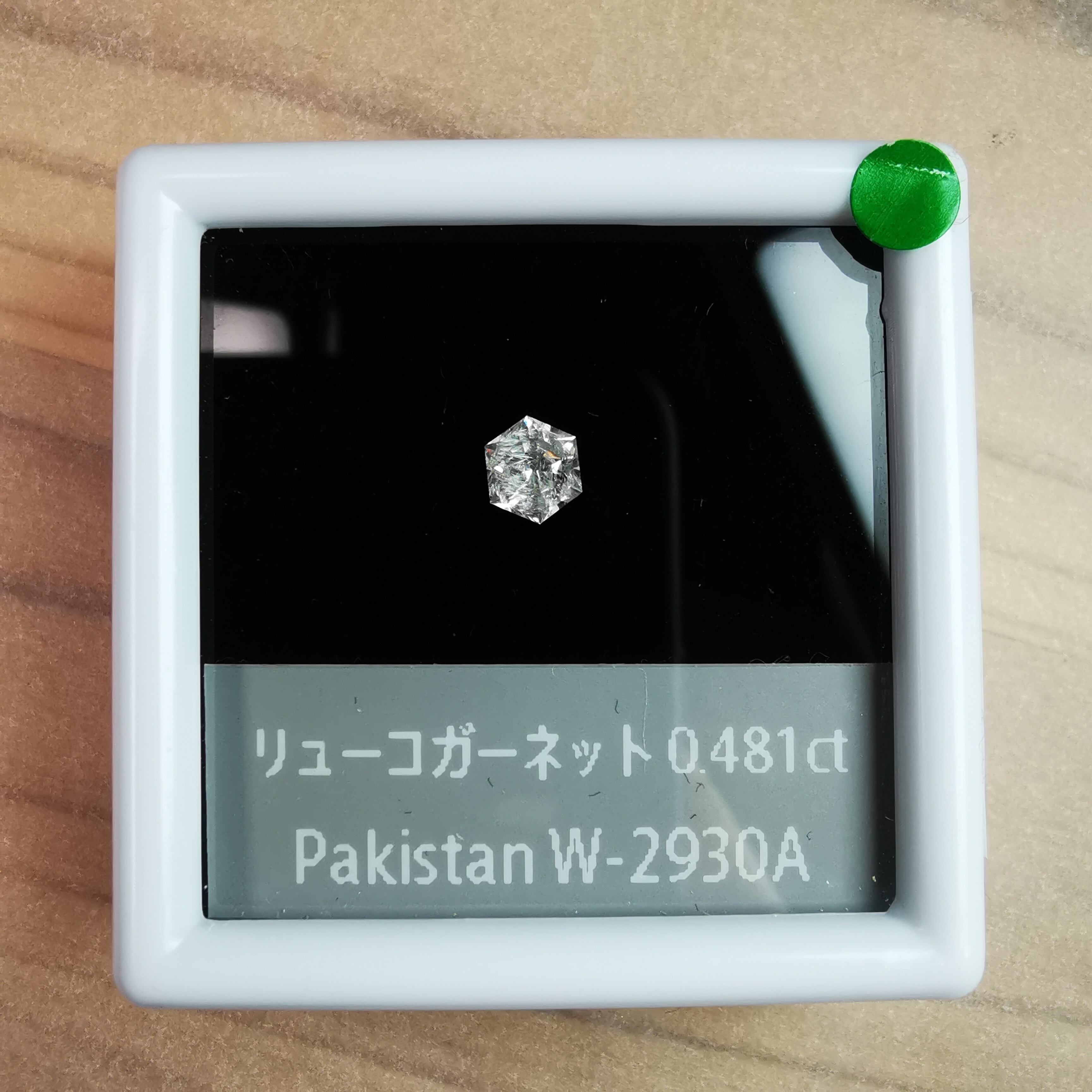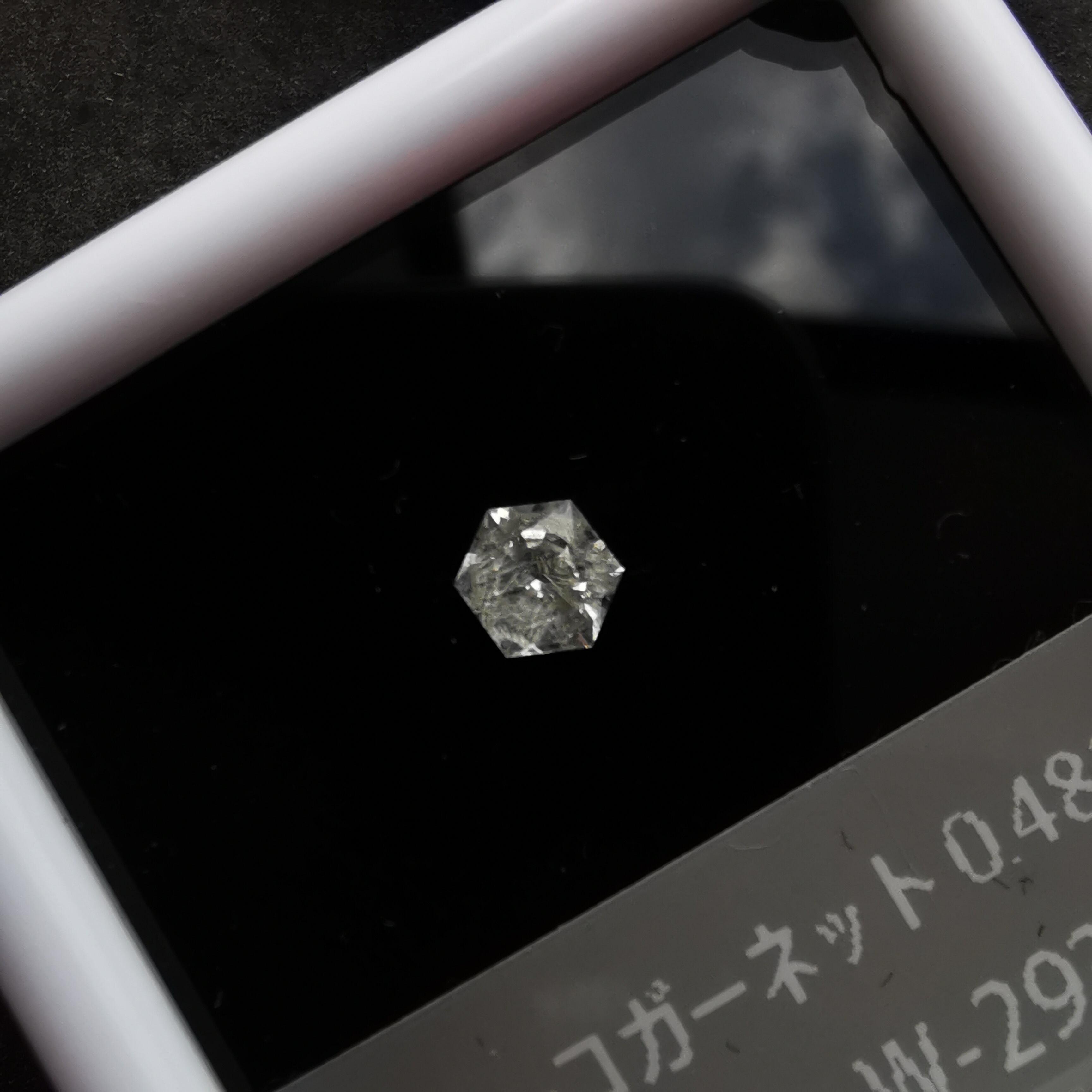 カラーレスのホワイトグロシュラーガーネットで、リューコガーネットとも呼ばれている珍しいタイプの一石です。