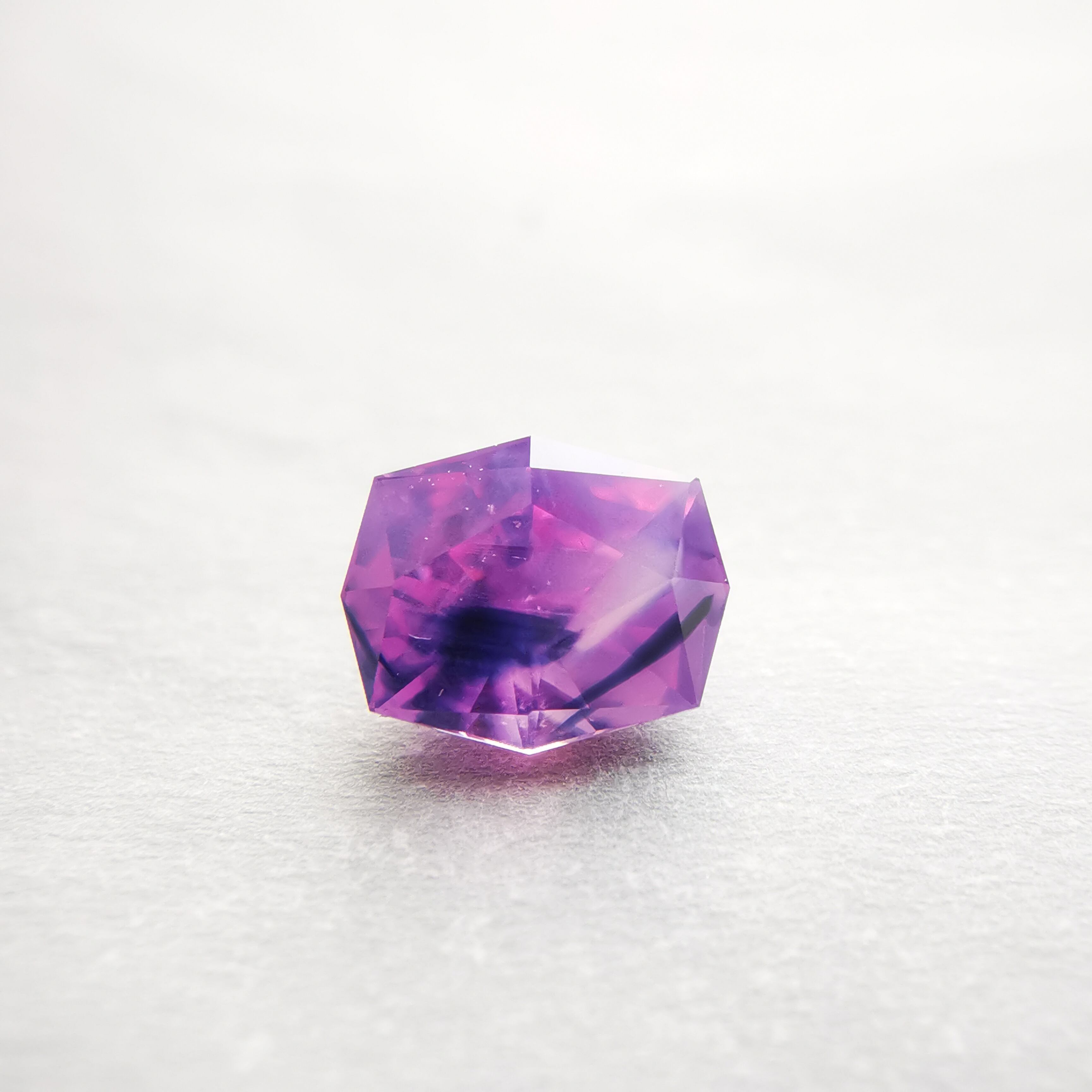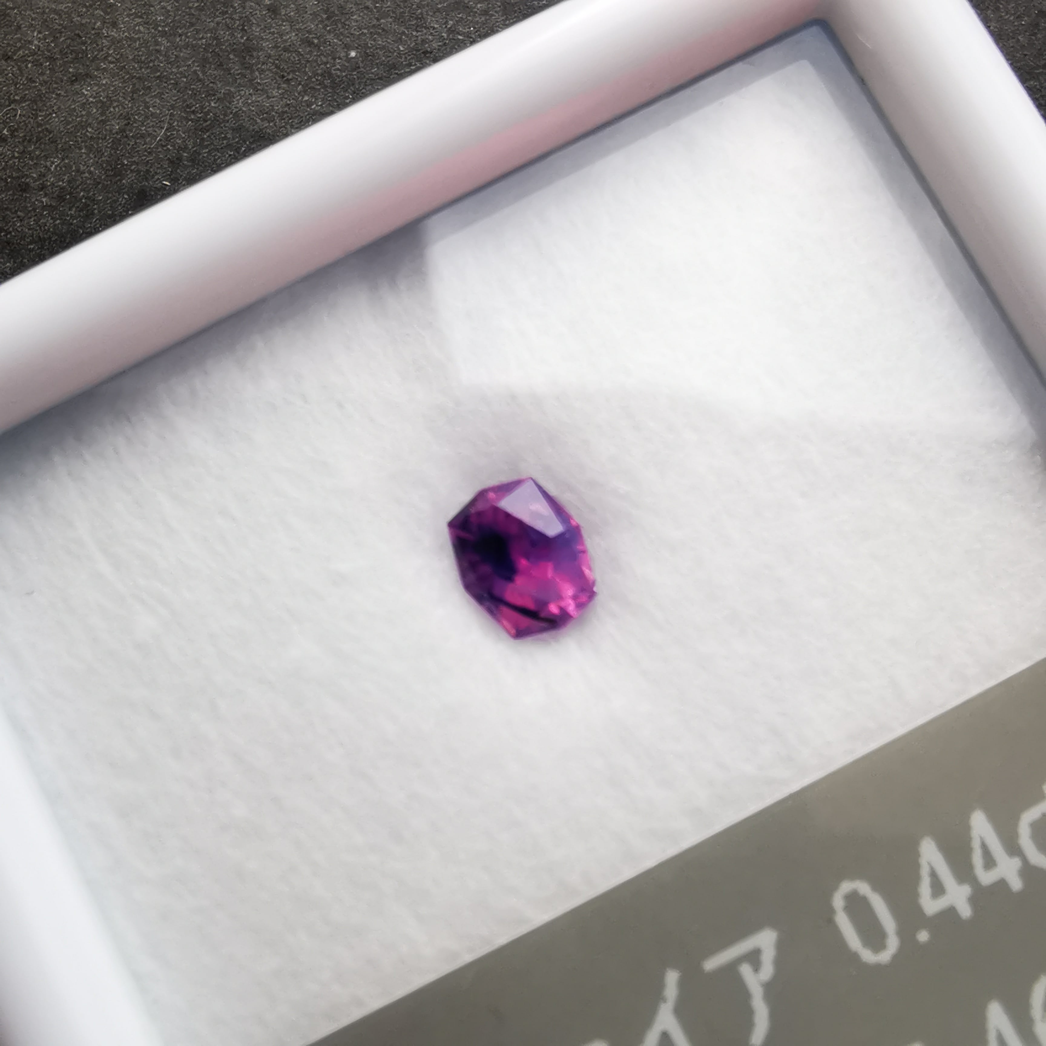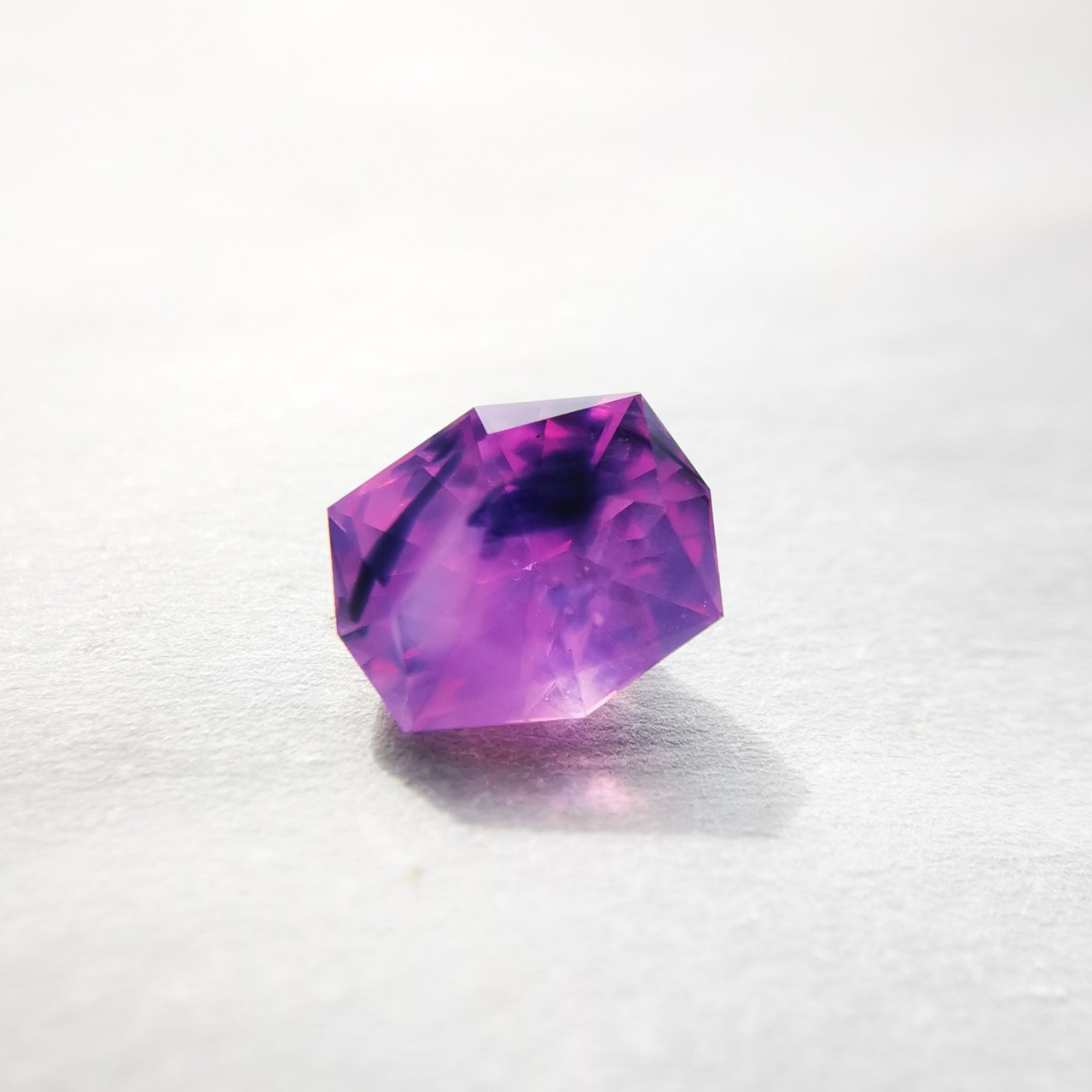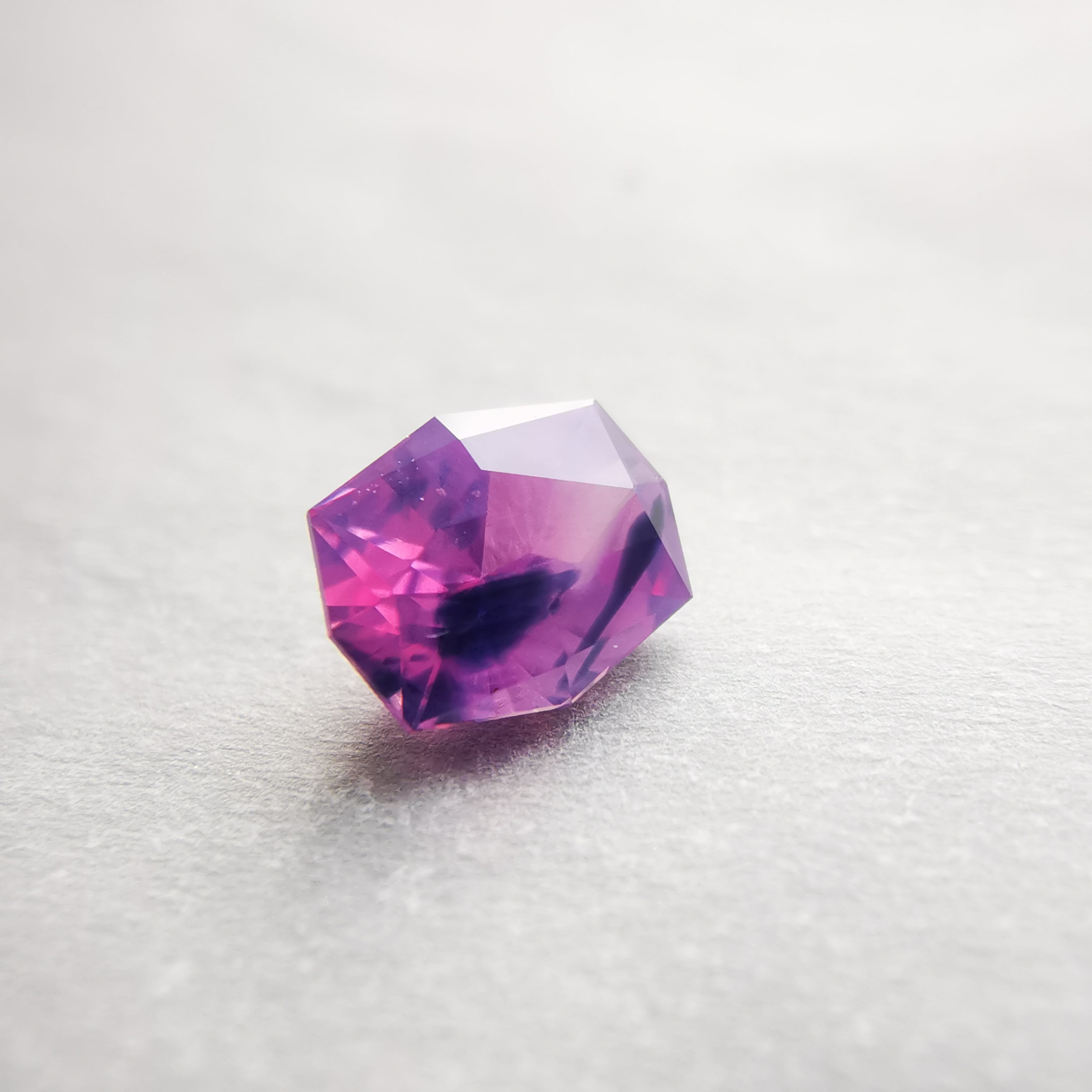 明るい赤紫/フクシアピンクと濃紺のざっくりとしたバイカラーに、ミルクを一滴垂らしたようなサファイアです。