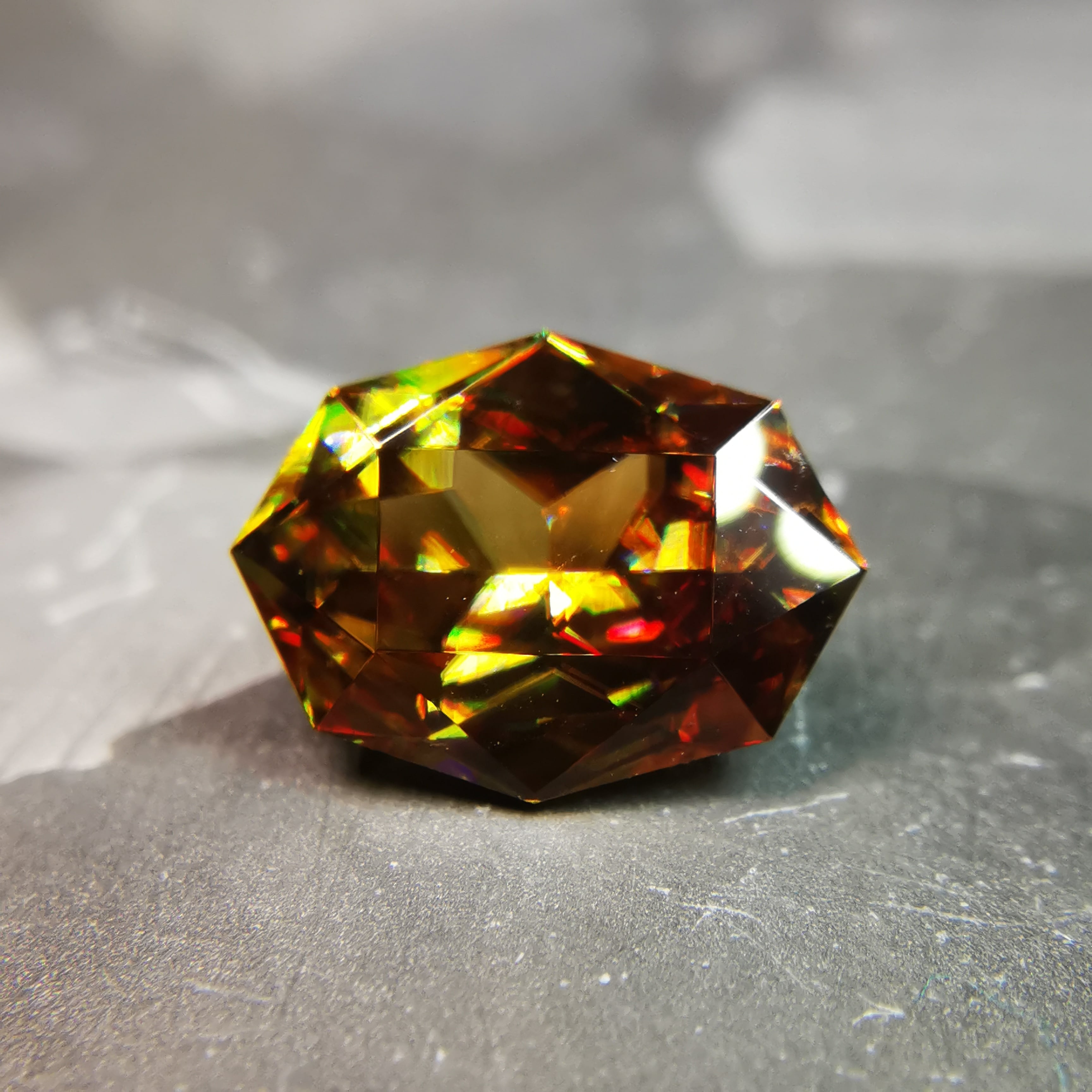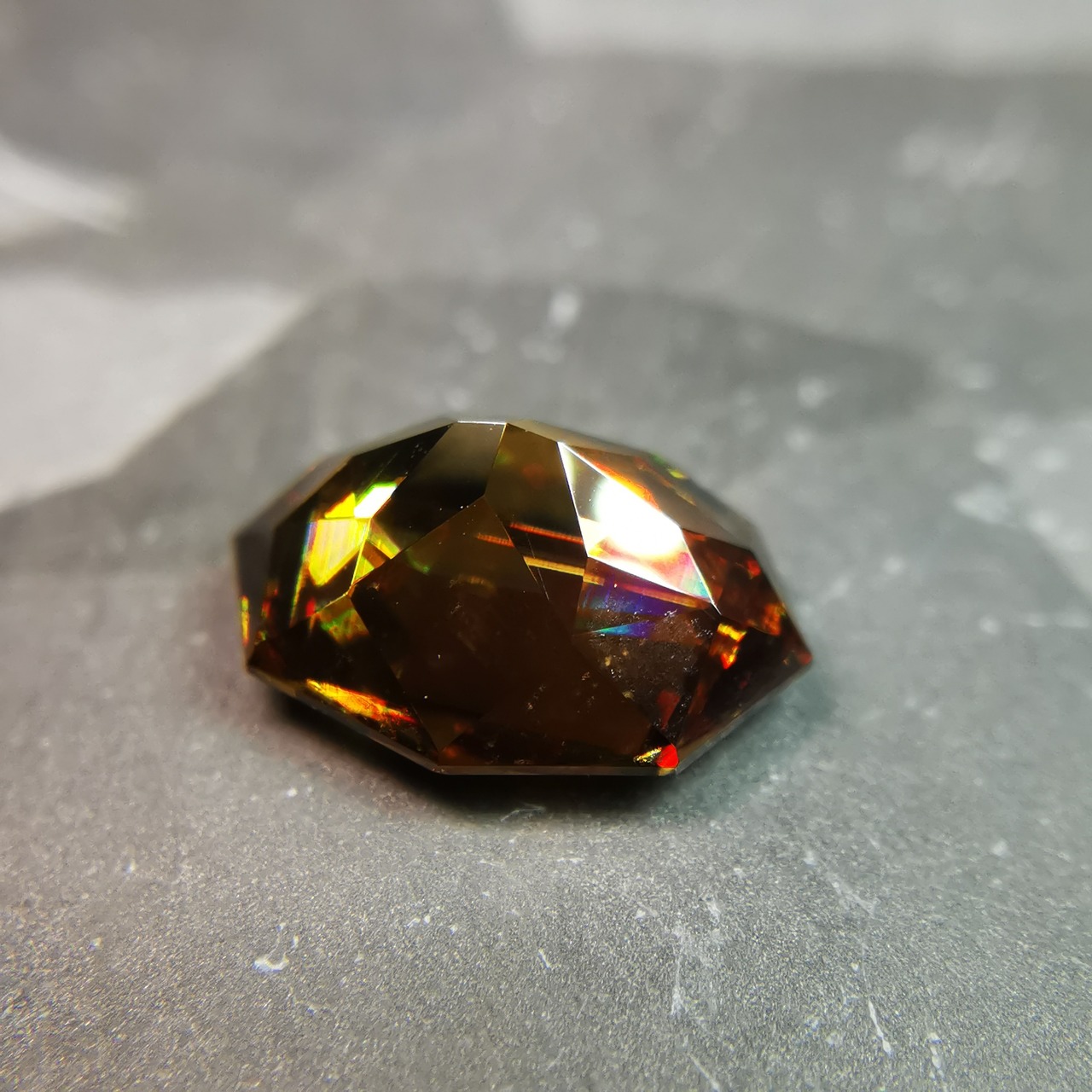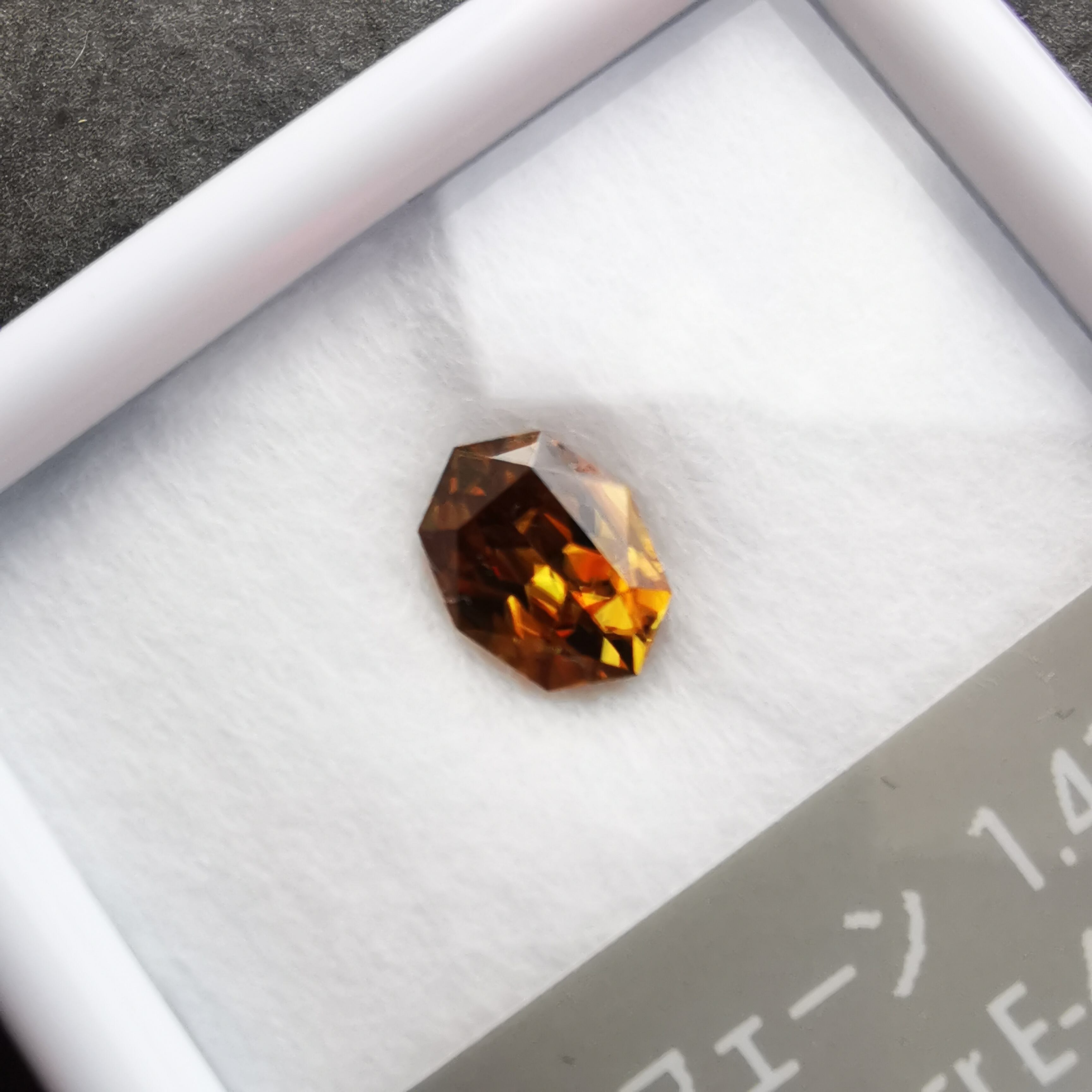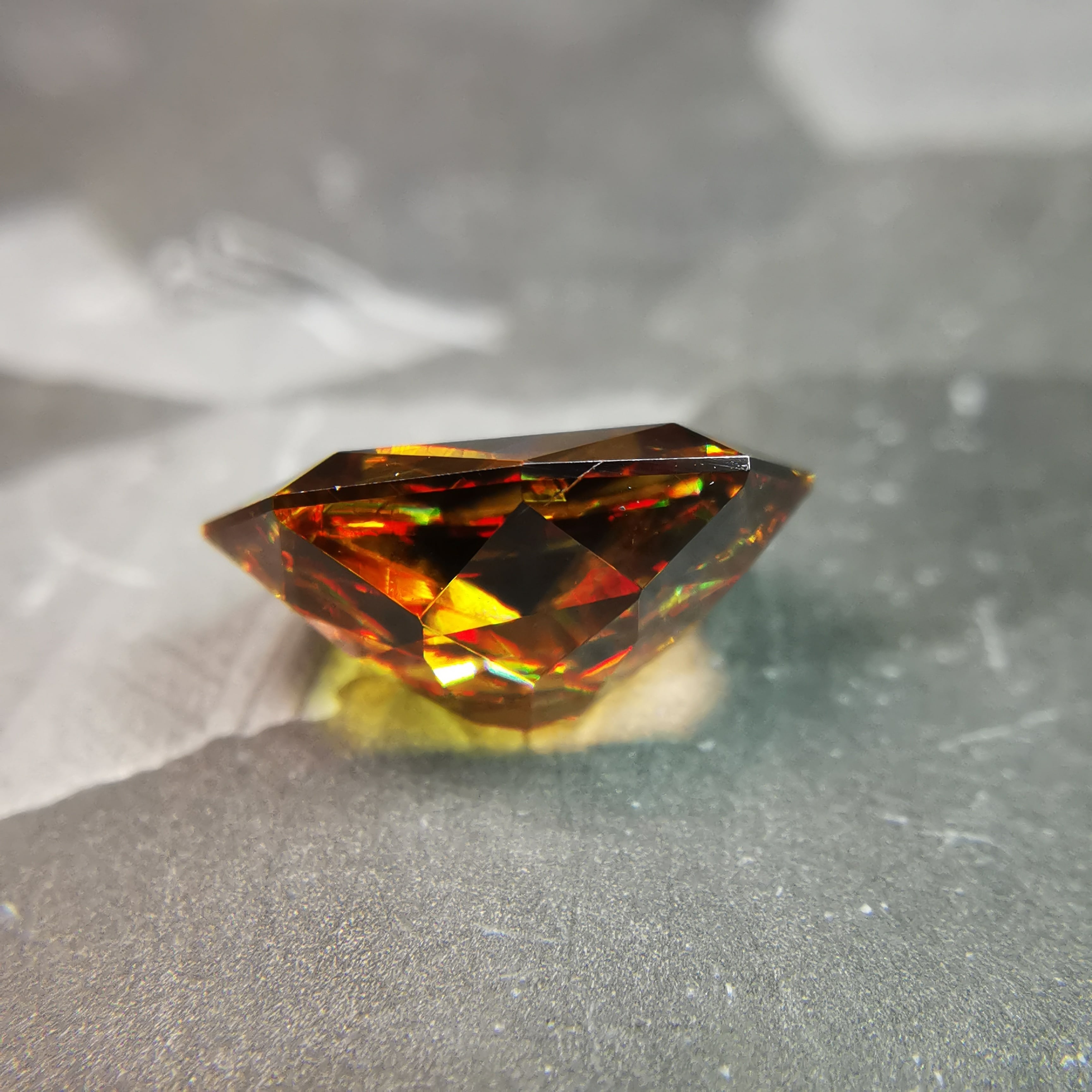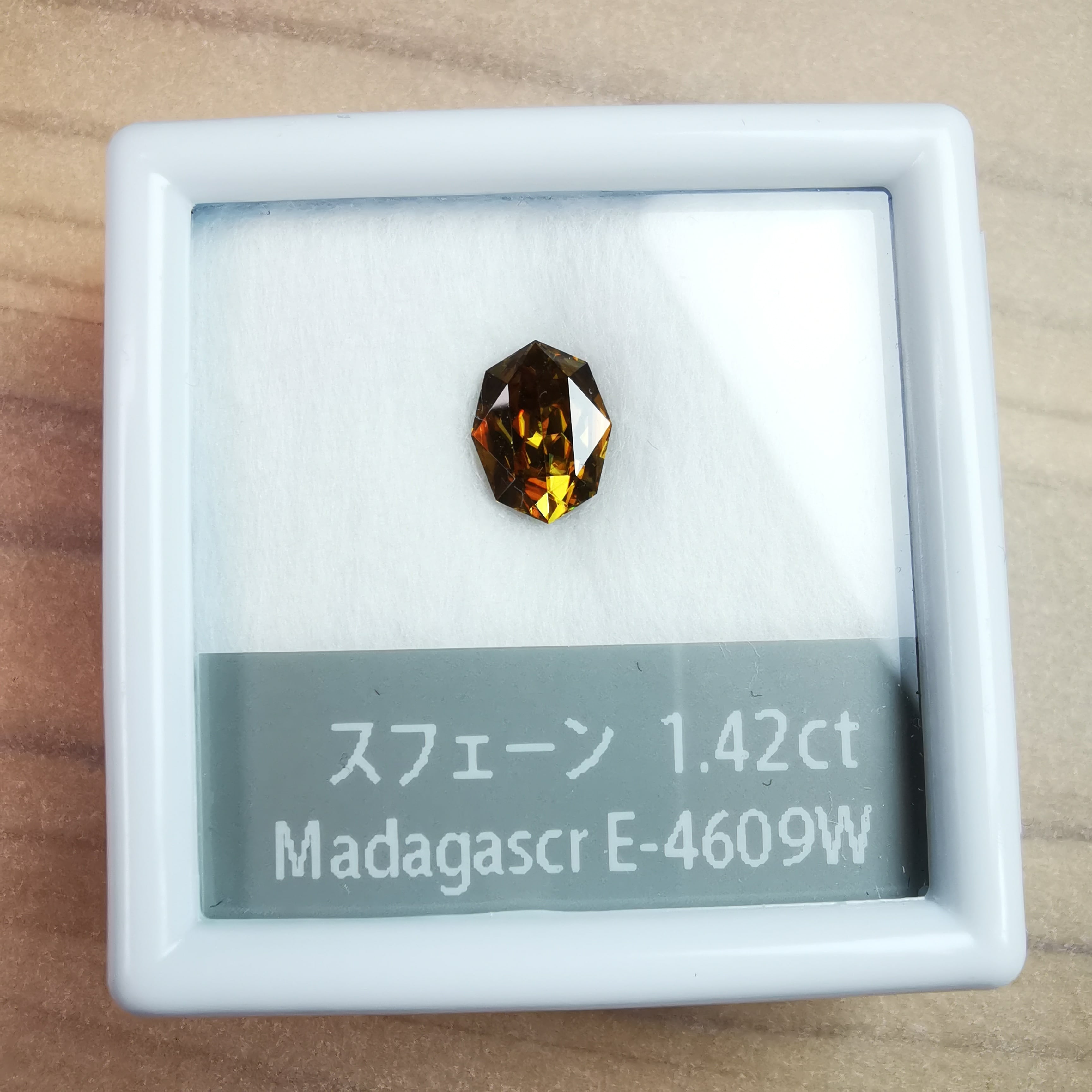 褐色の石から、山吹色のきらめきと虹色のファイアがきらめくスフェーンです。