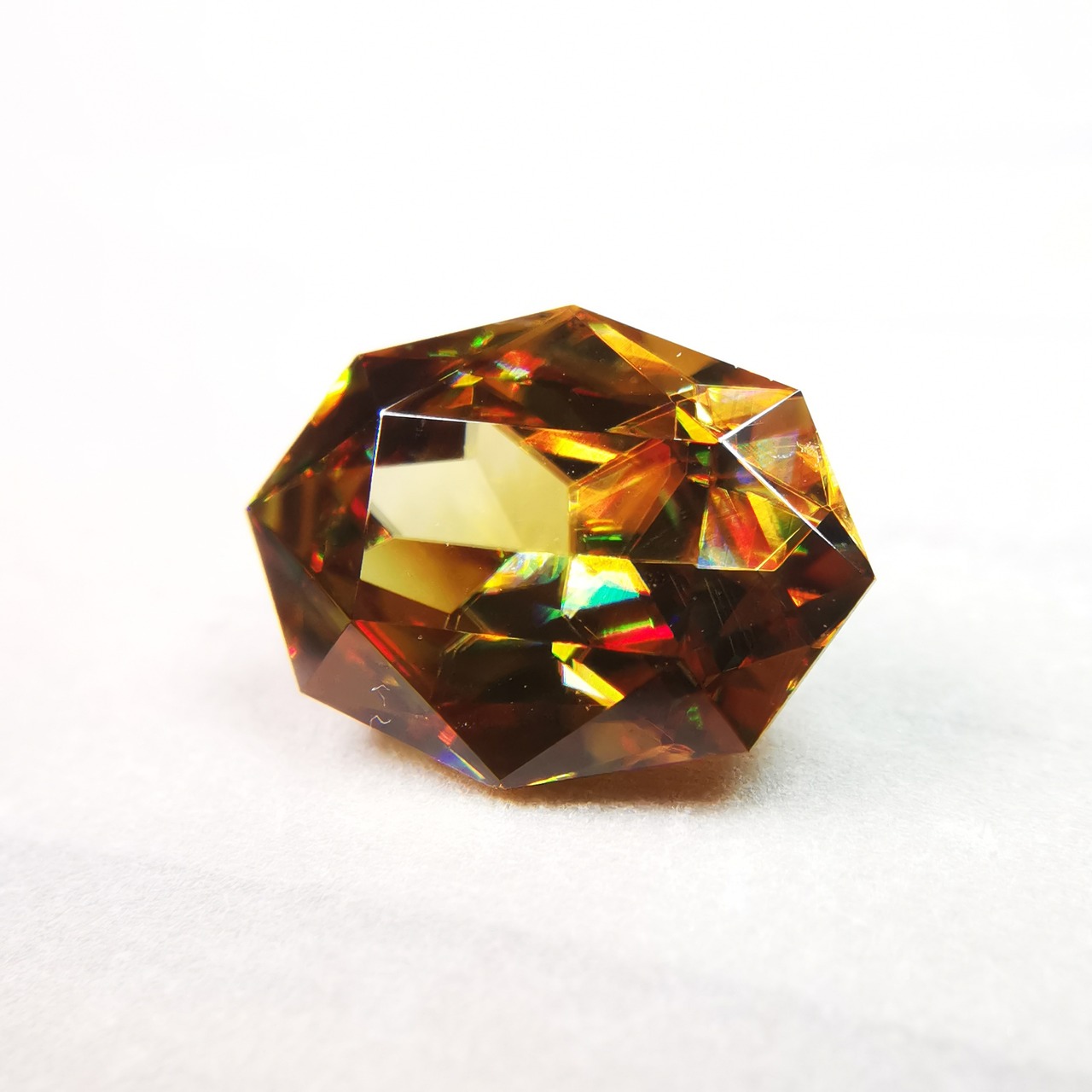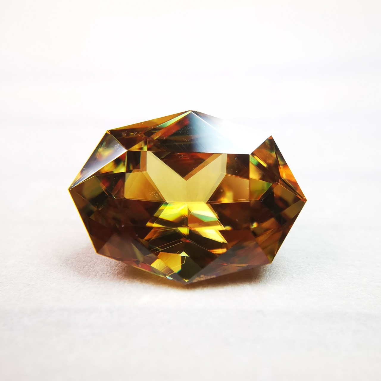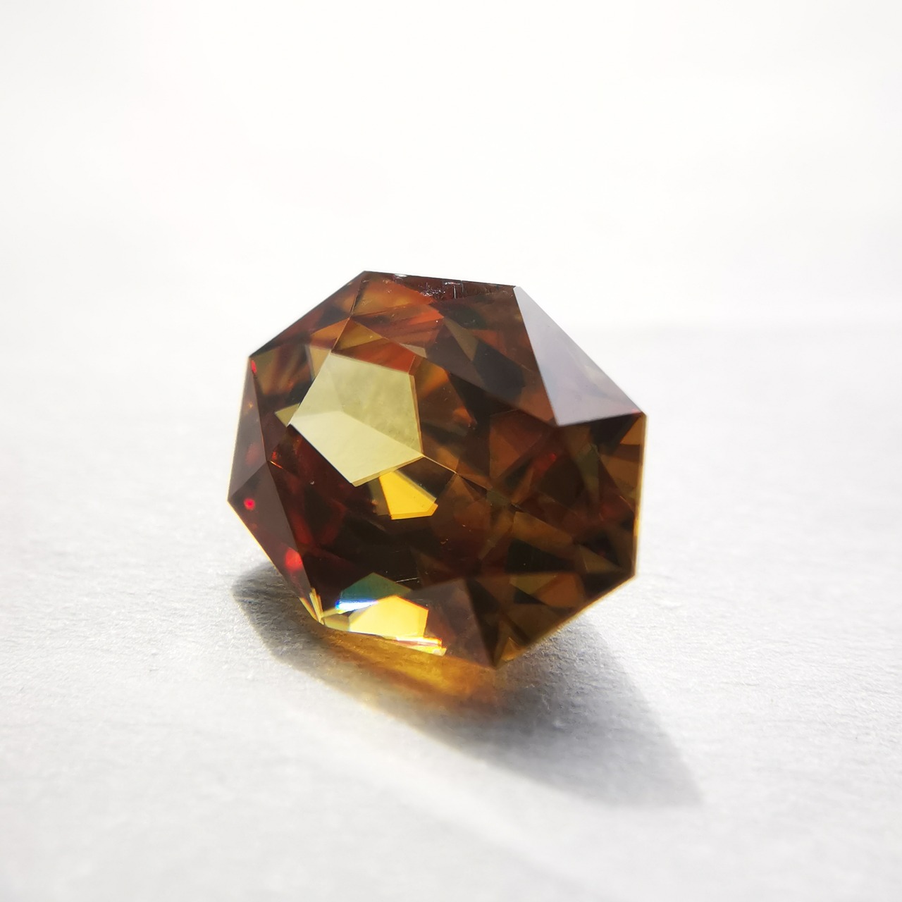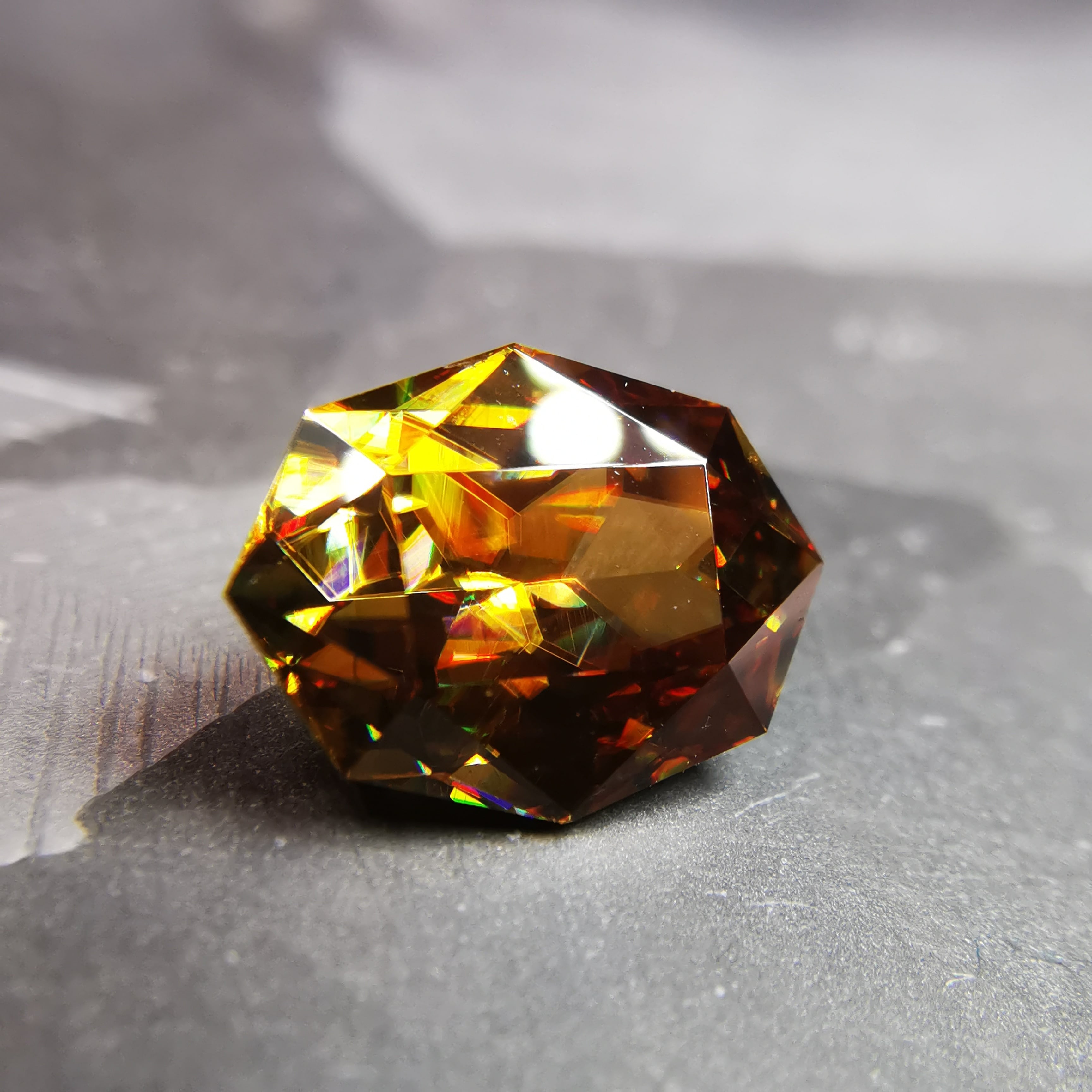 褐色の石から、山吹色のきらめきと虹色のファイアがきらめくスフェーンです。
