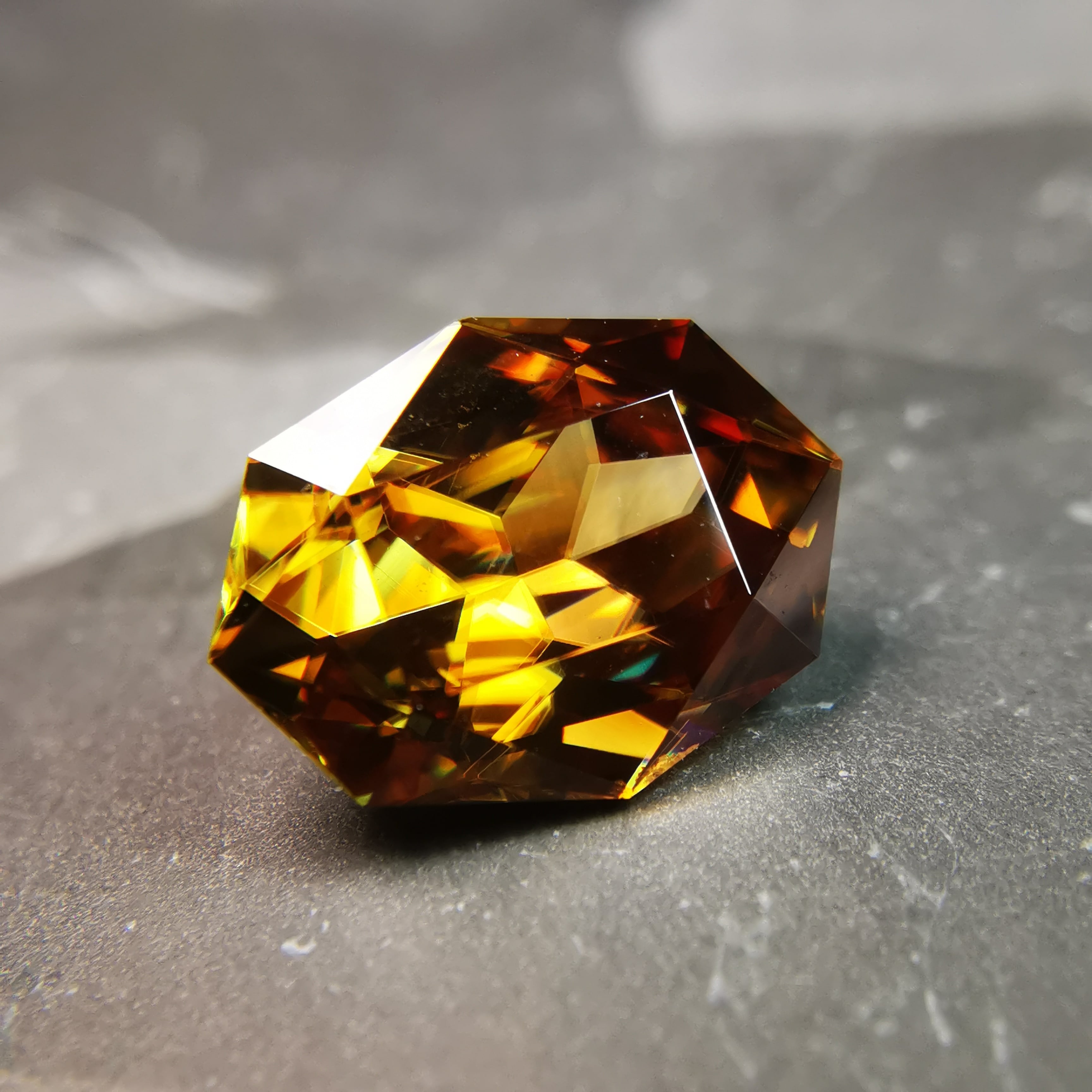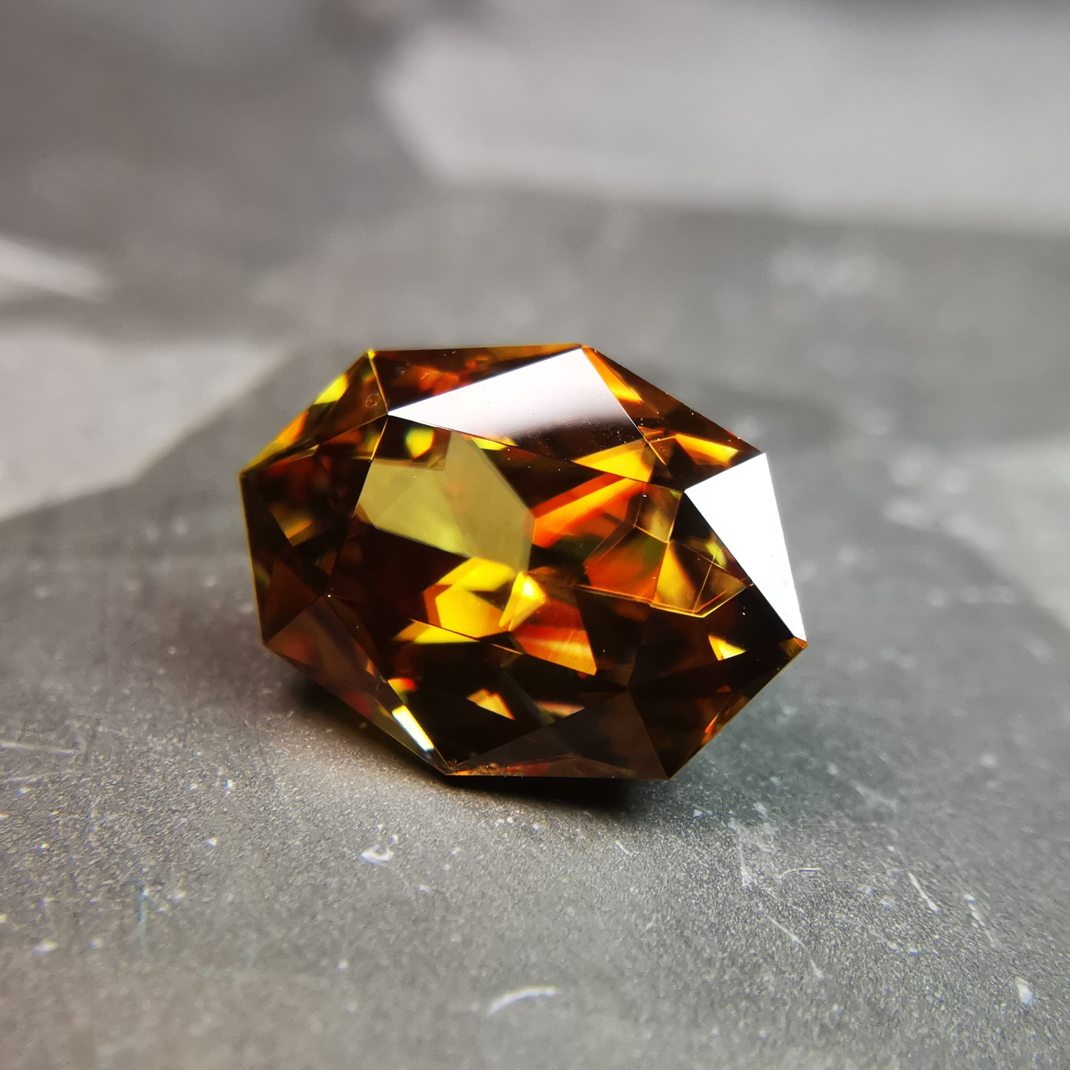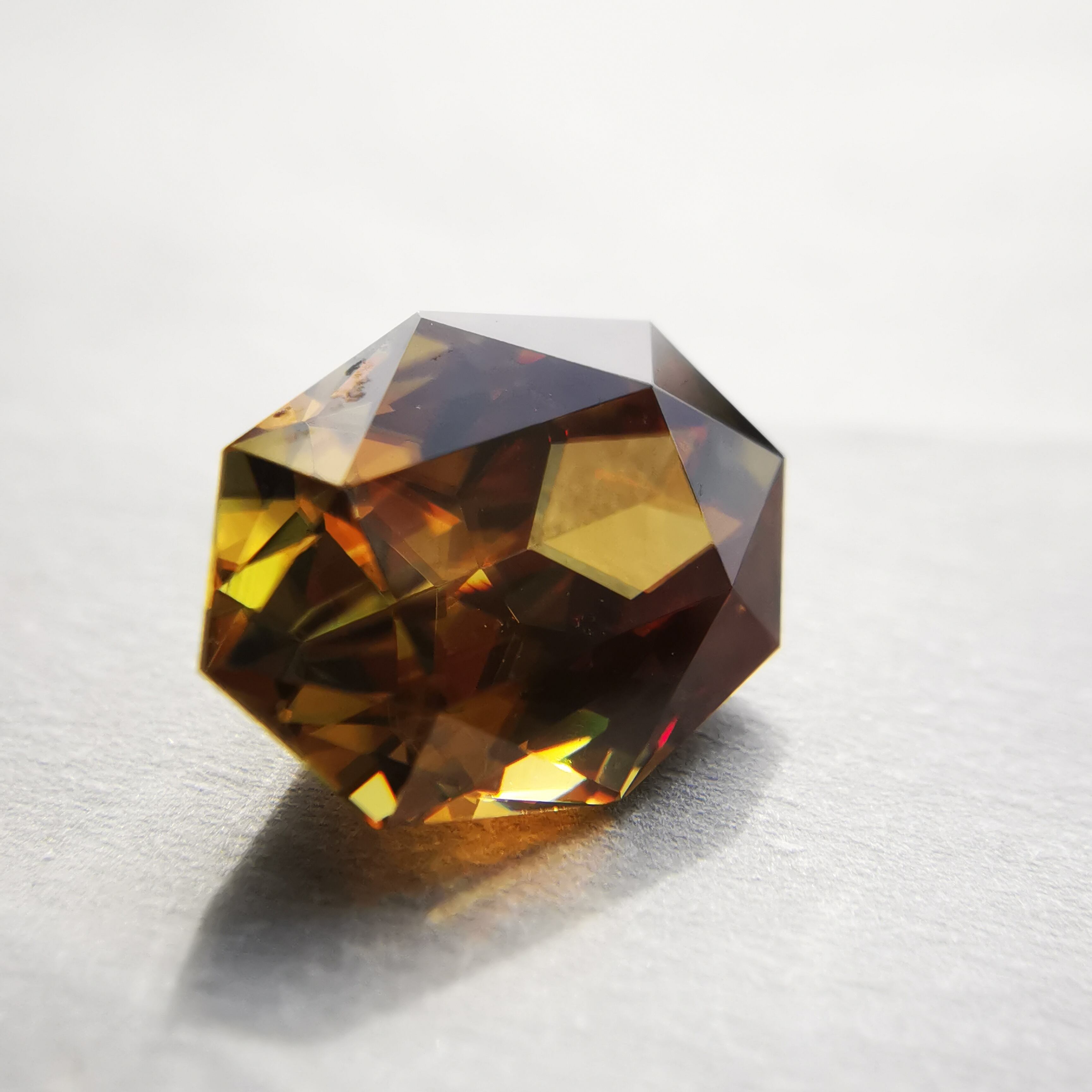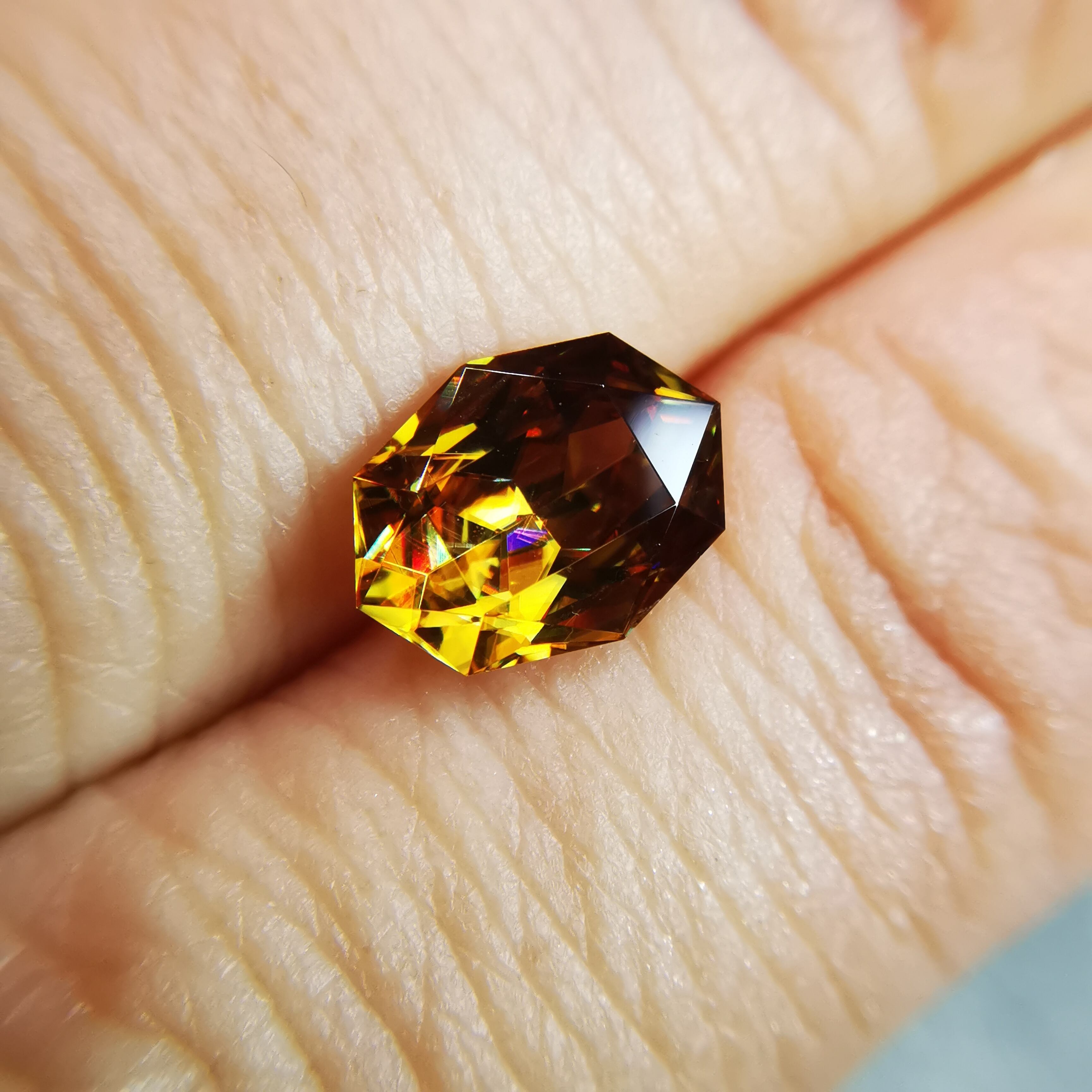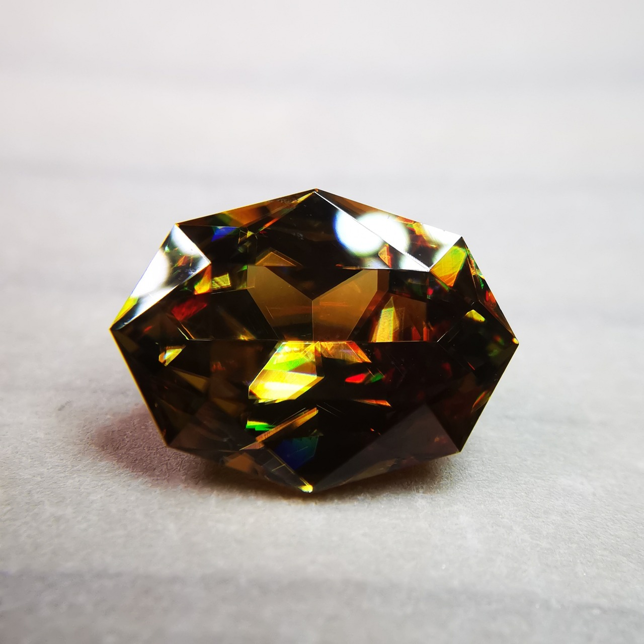 褐色の石から、山吹色のきらめきと虹色のファイアがきらめくスフェーンです。