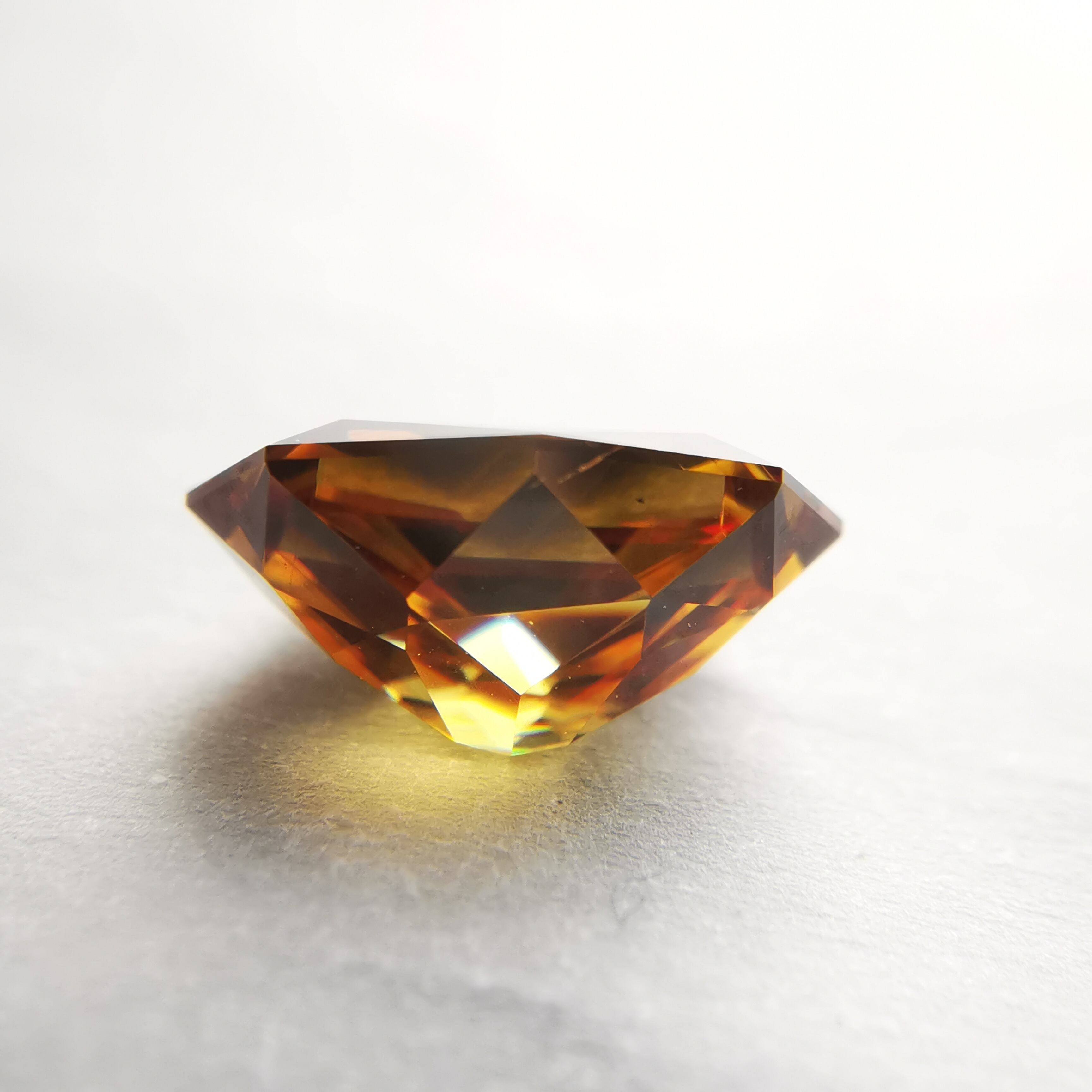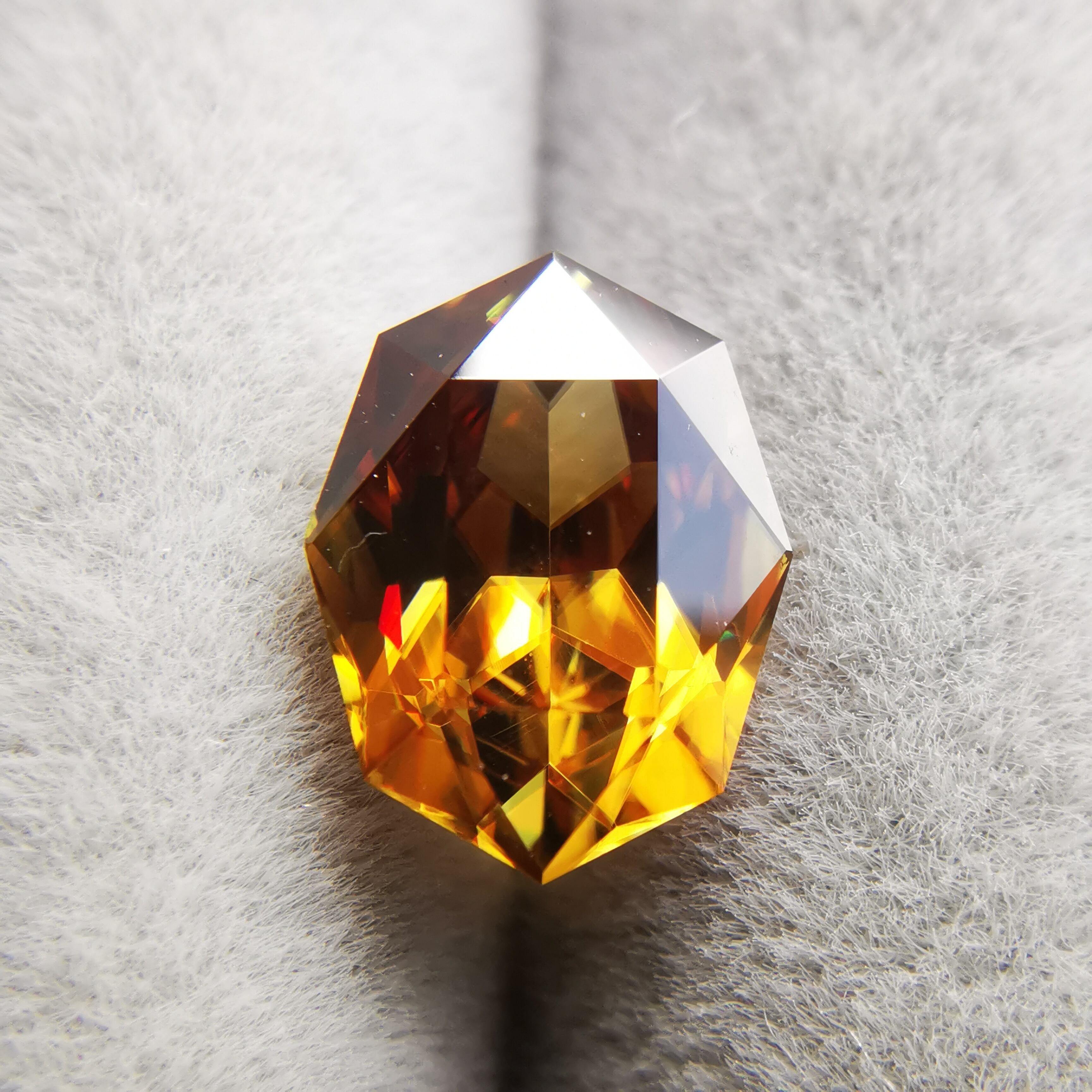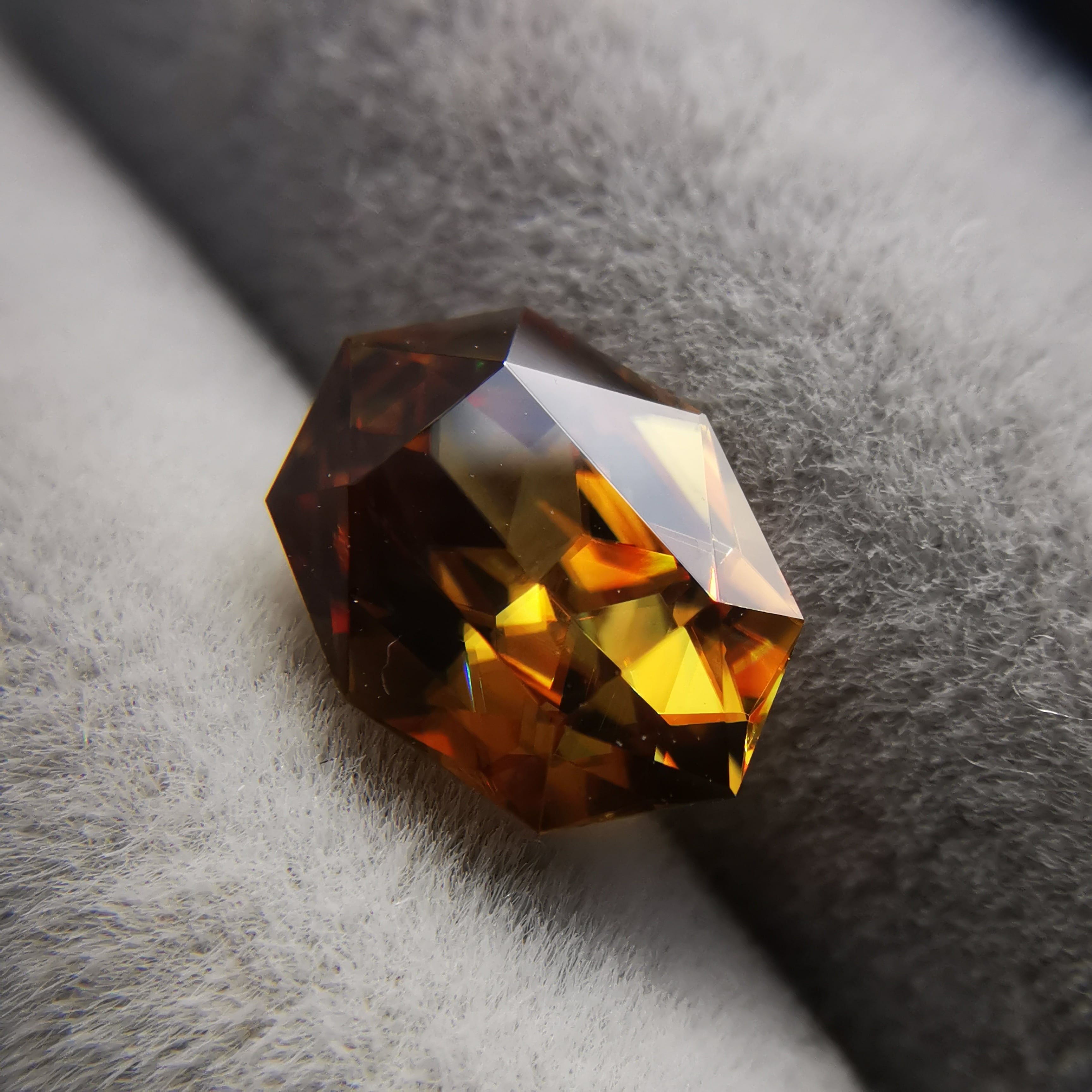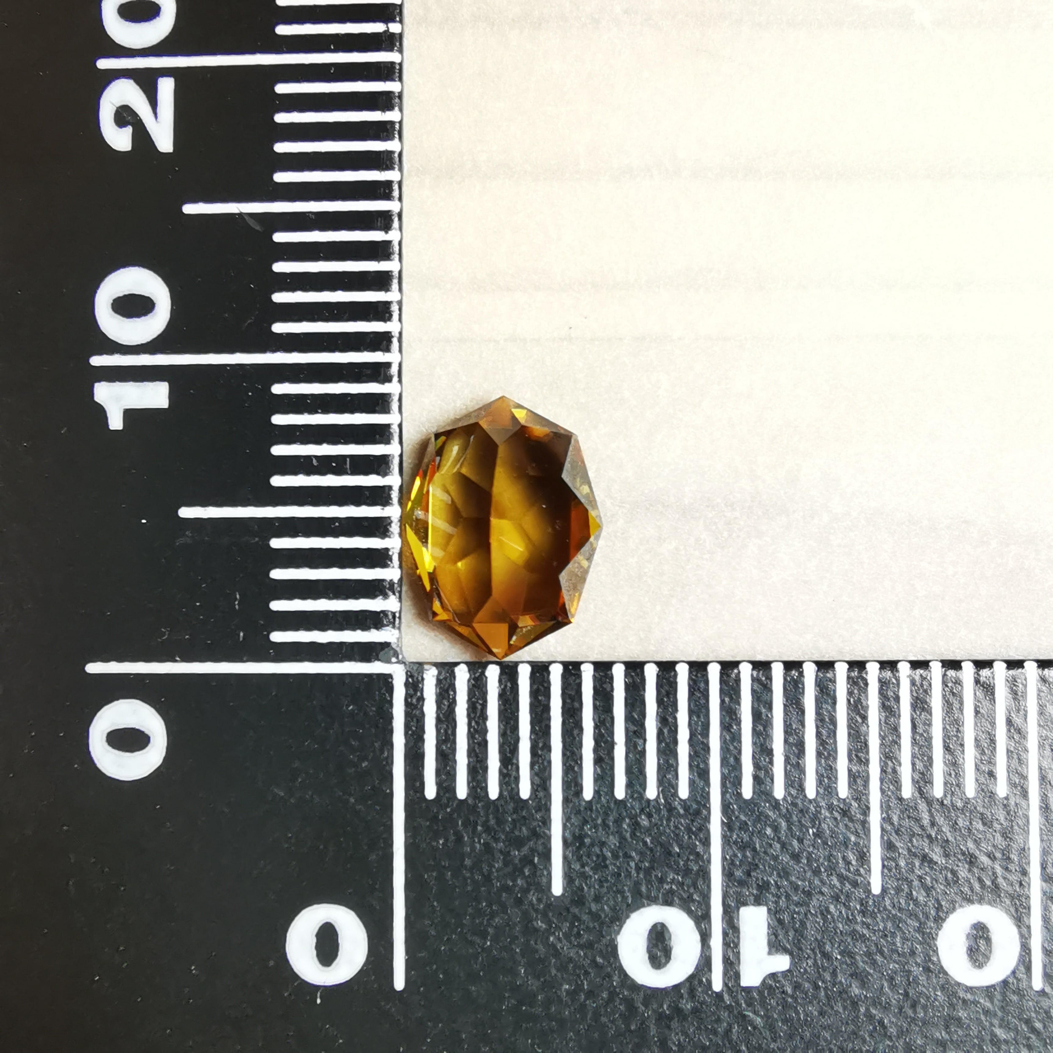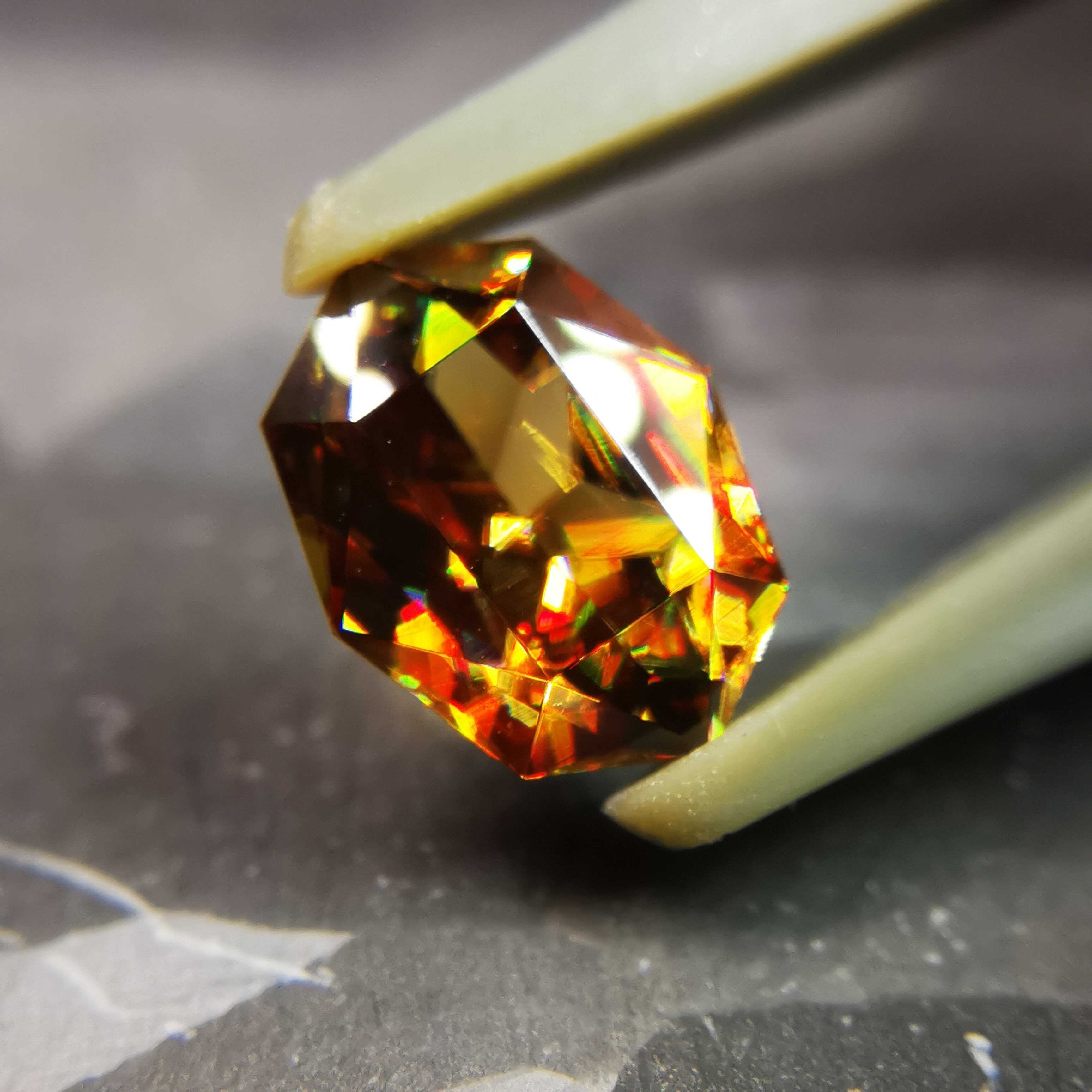 褐色の石から、山吹色のきらめきと虹色のファイアがきらめくスフェーンです。