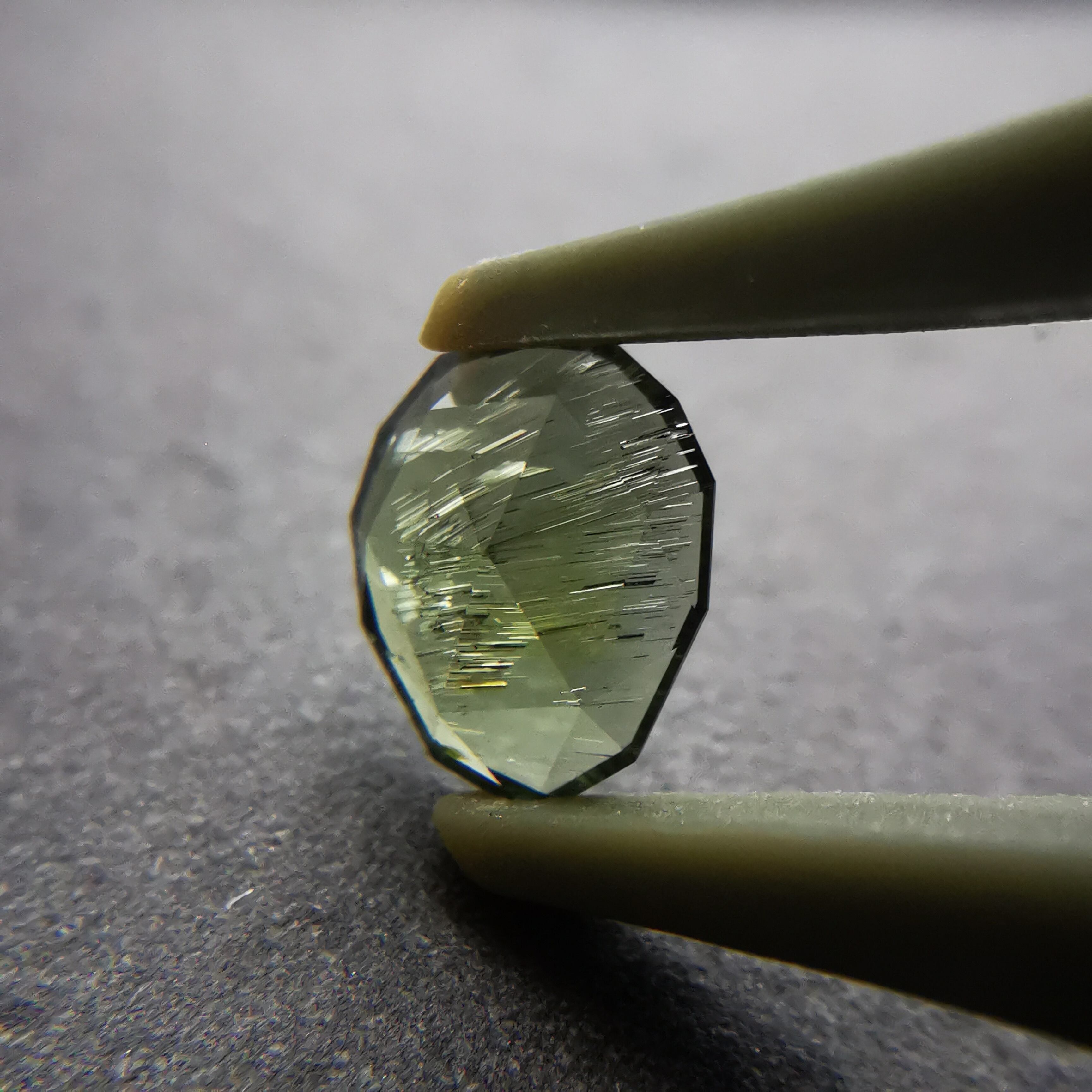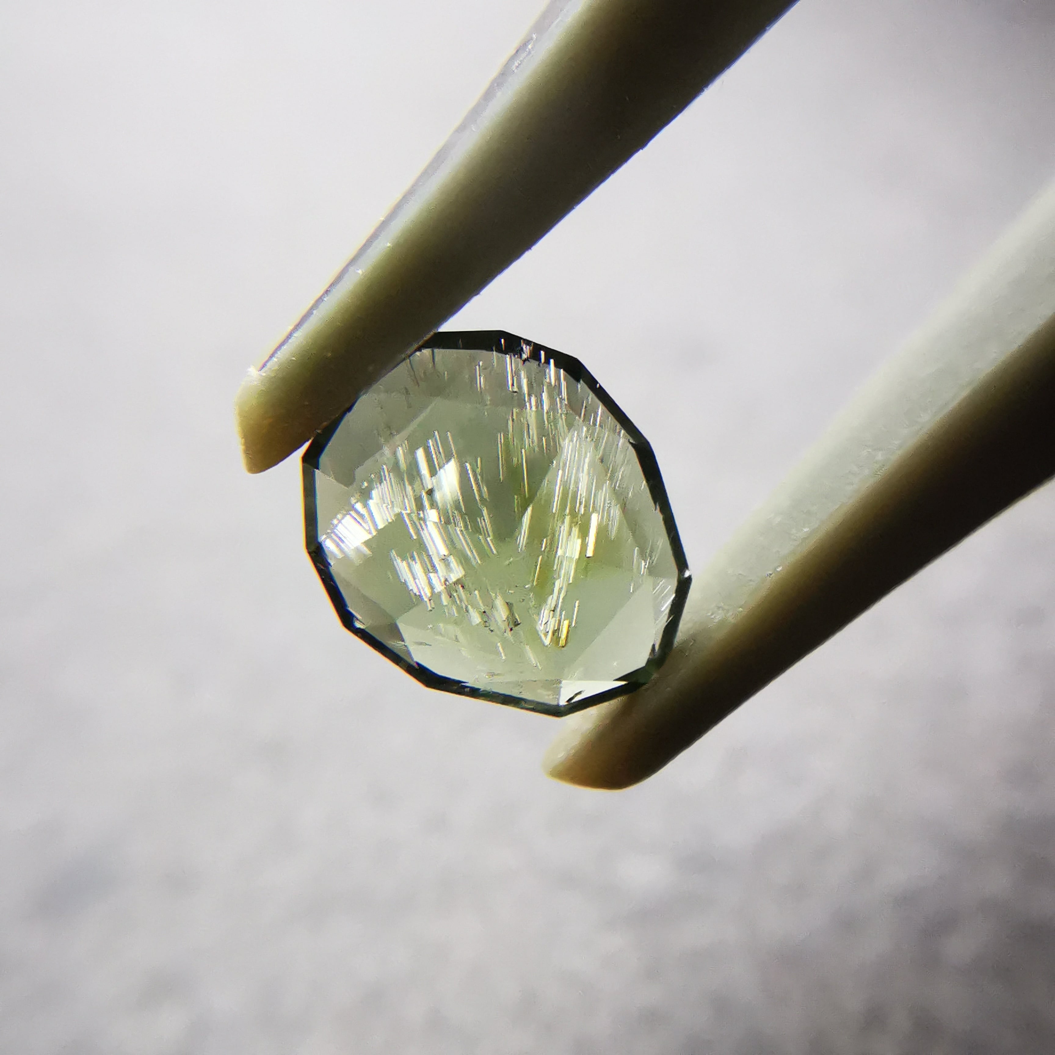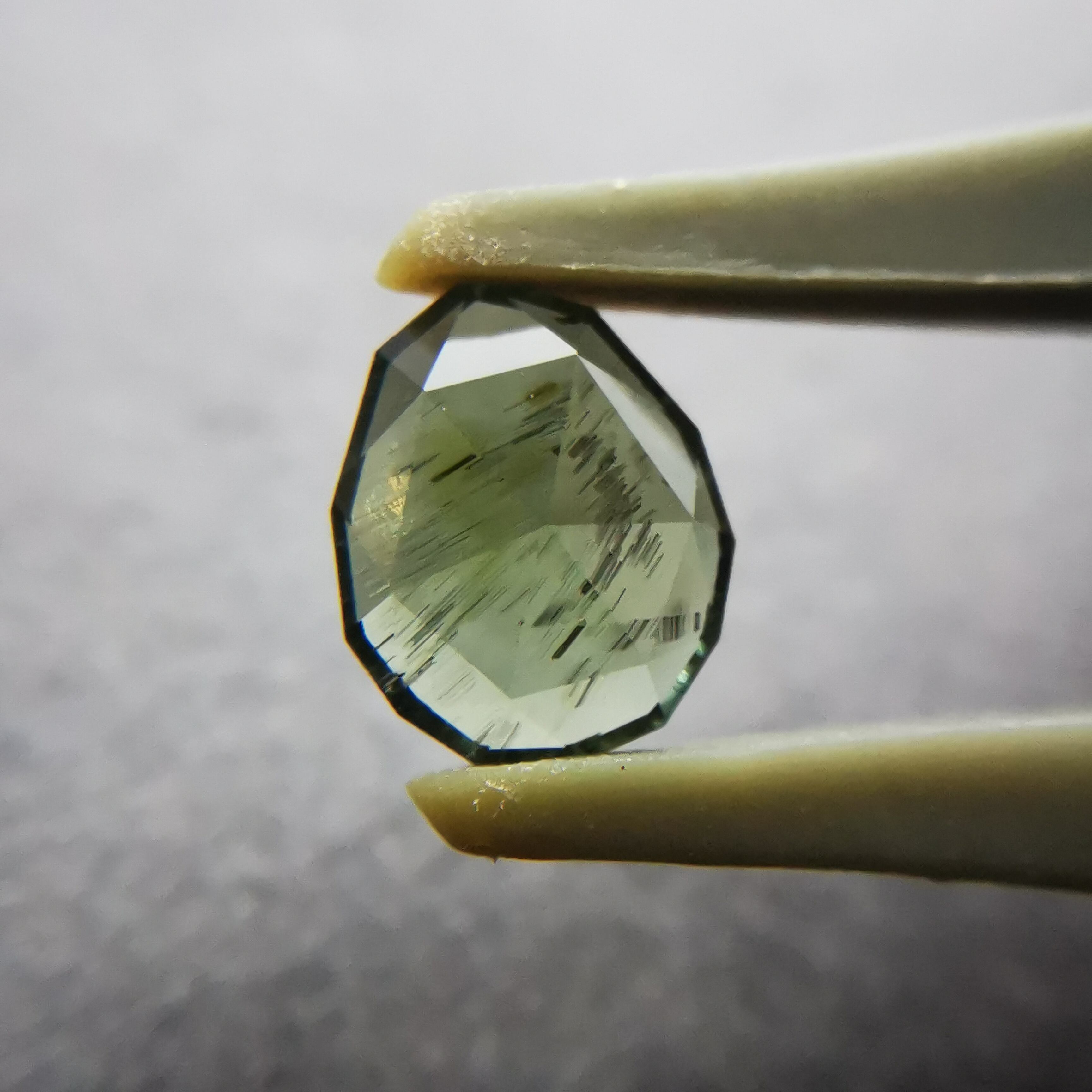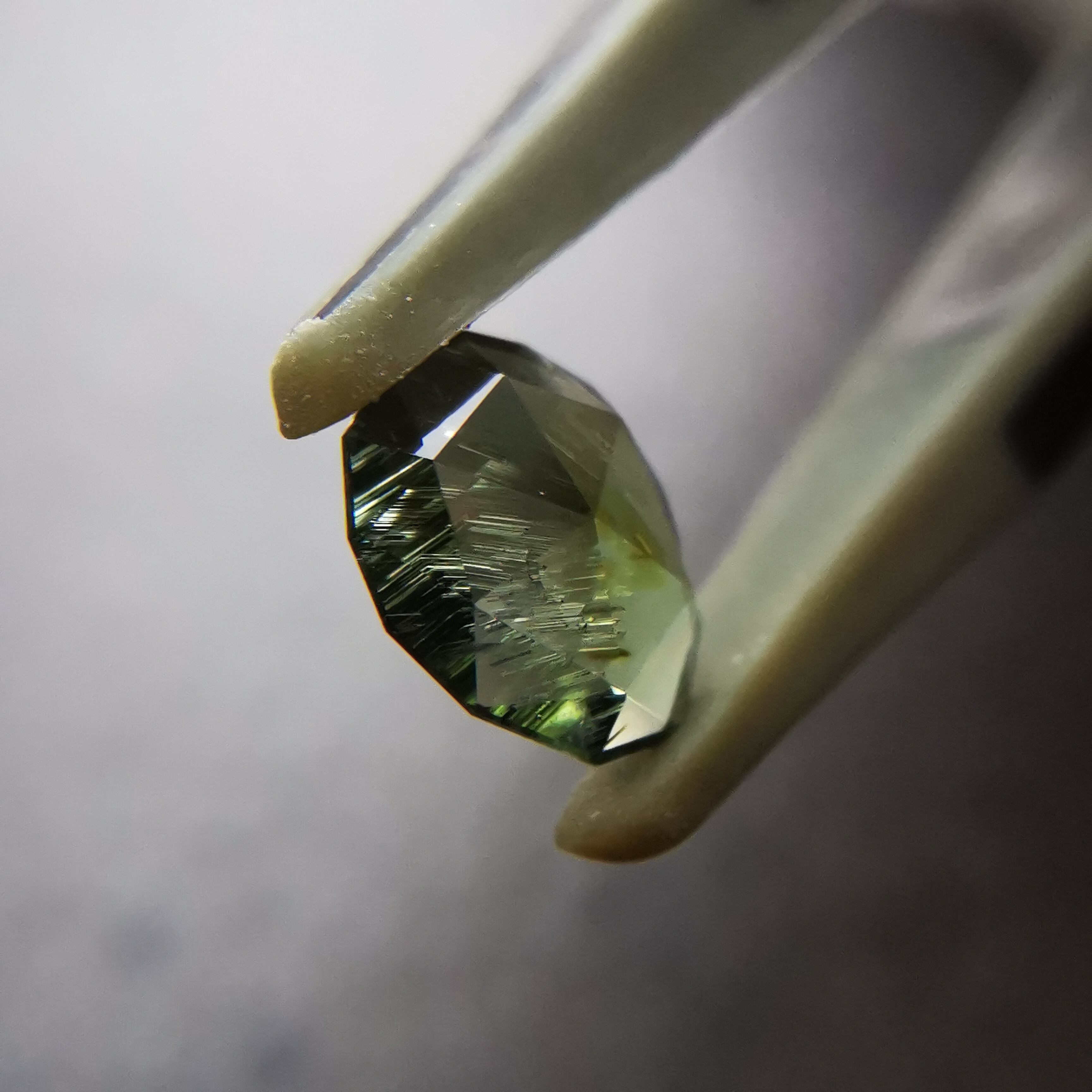 トルマリンキャッツアイに見られるような、針状のインクルージョン、チューブインクルージョンが全体にまばらに入っています。