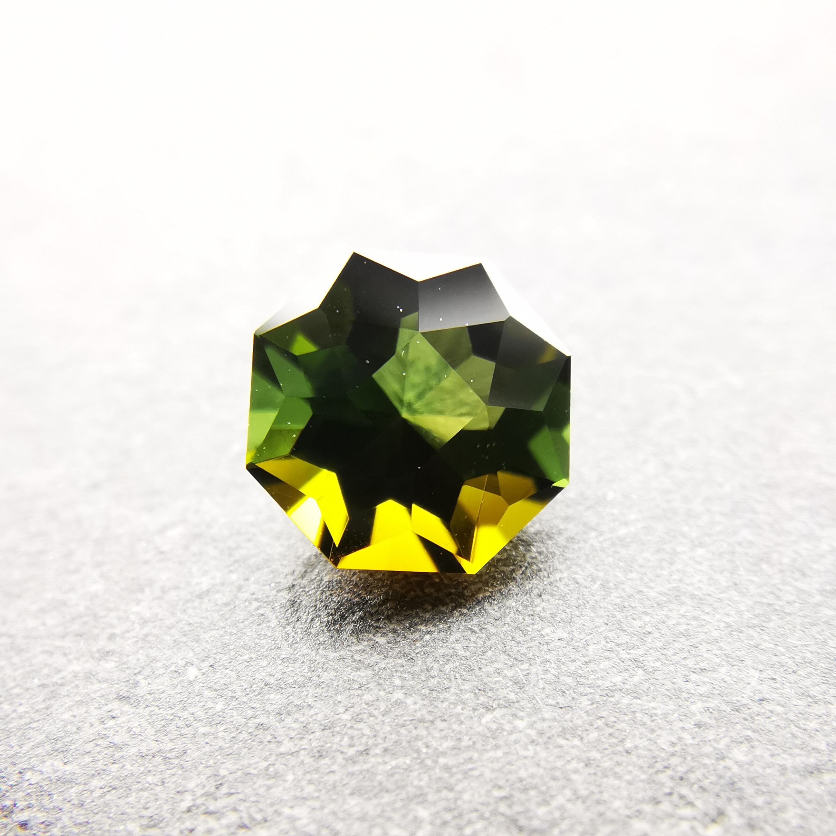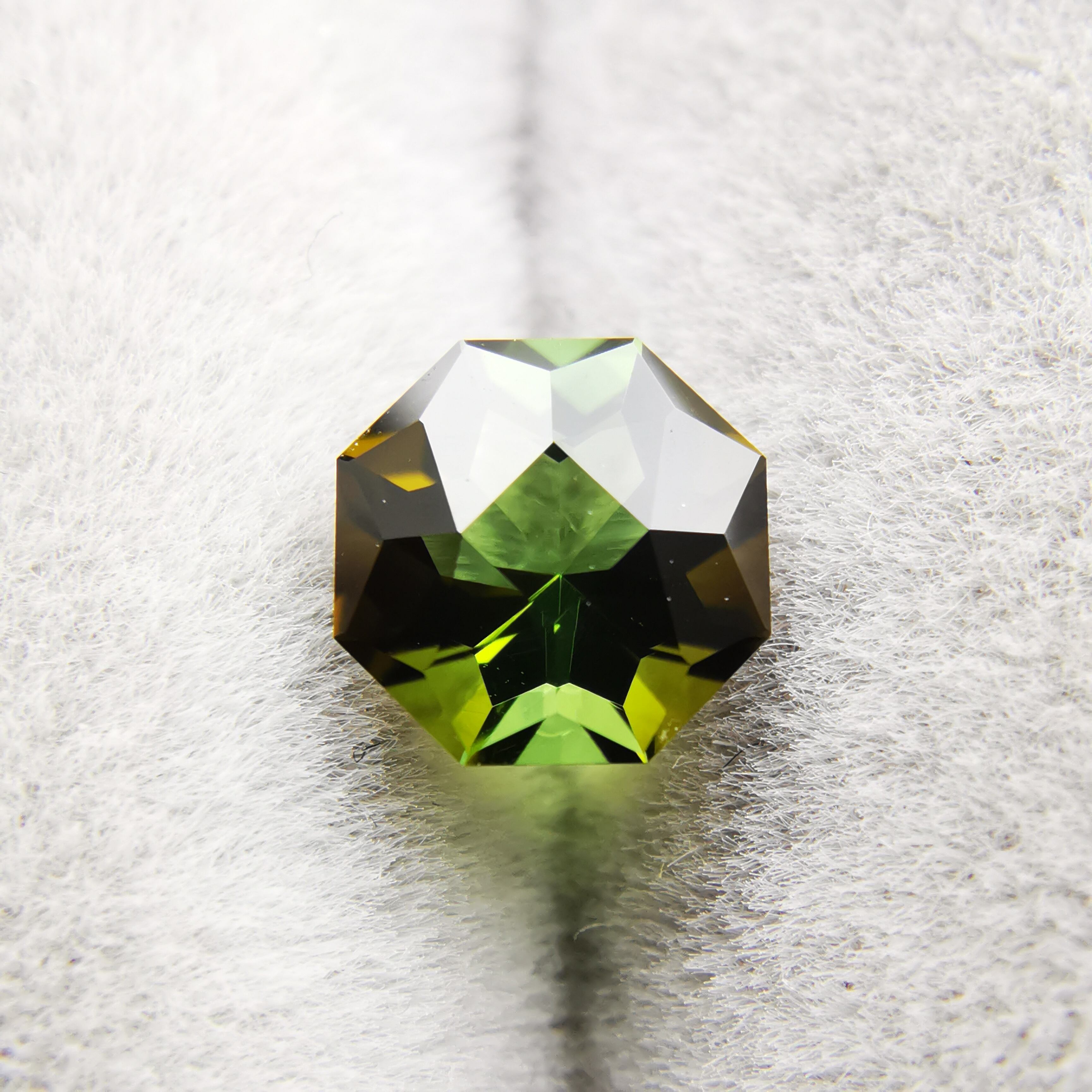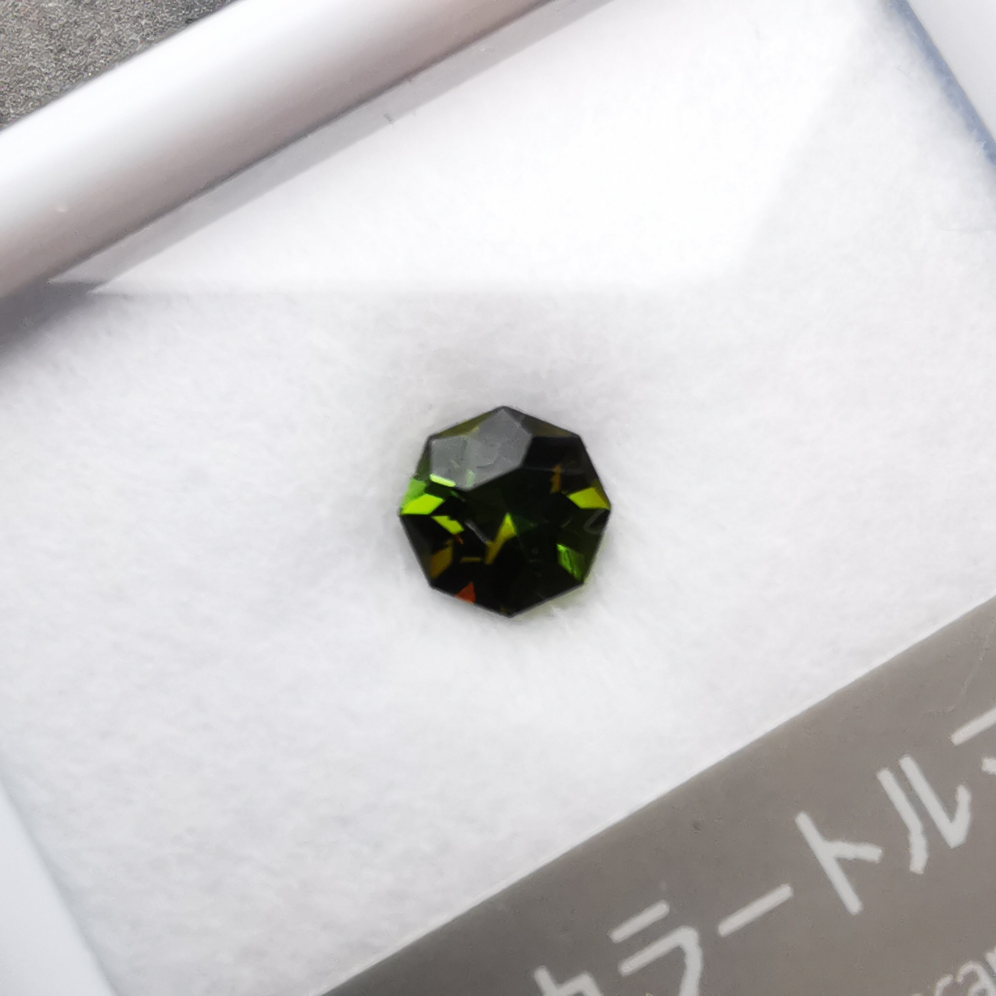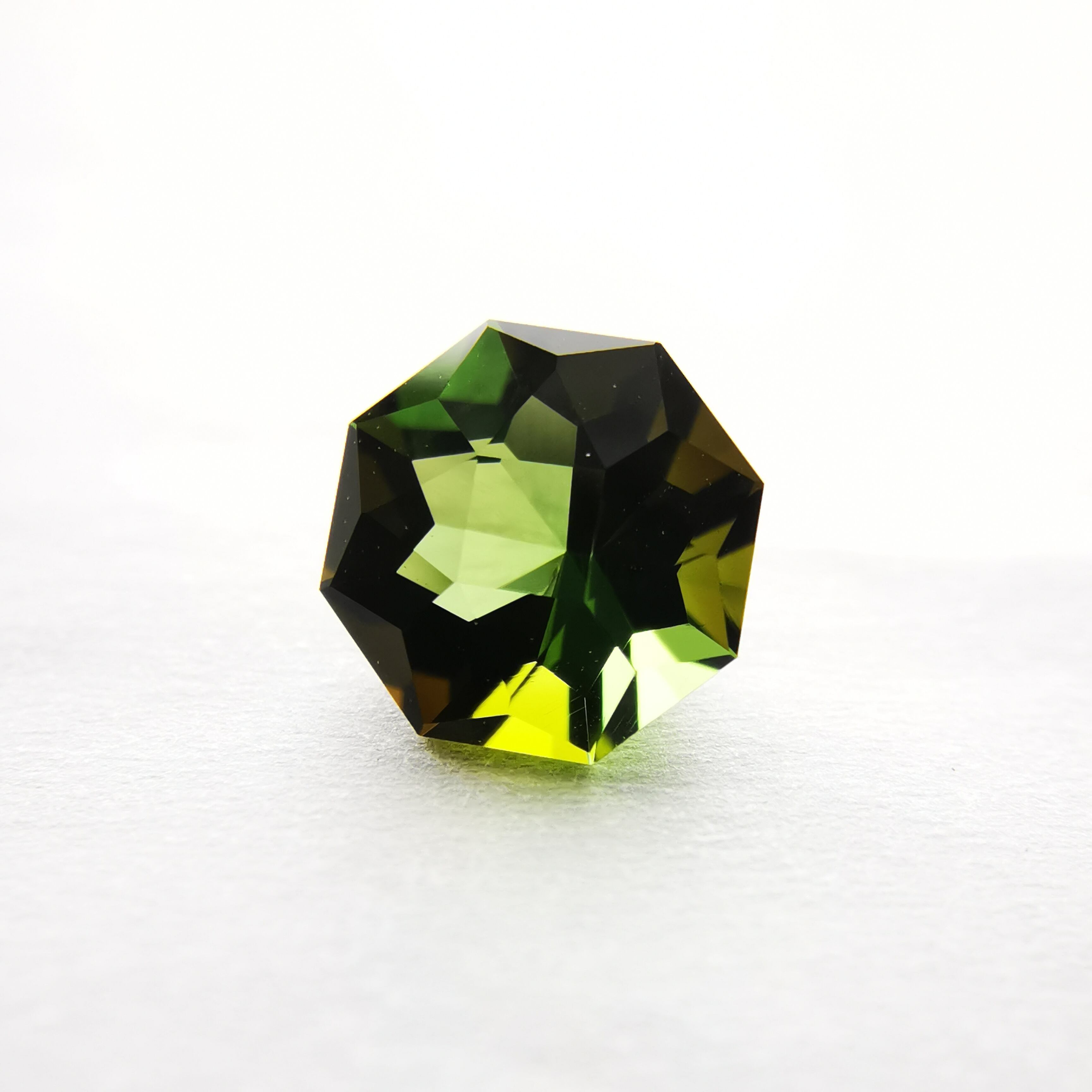 バイカラートルマリンかと思いましたが、どこから見ても色の境目が分からず、多色性による見え方かもしれません。