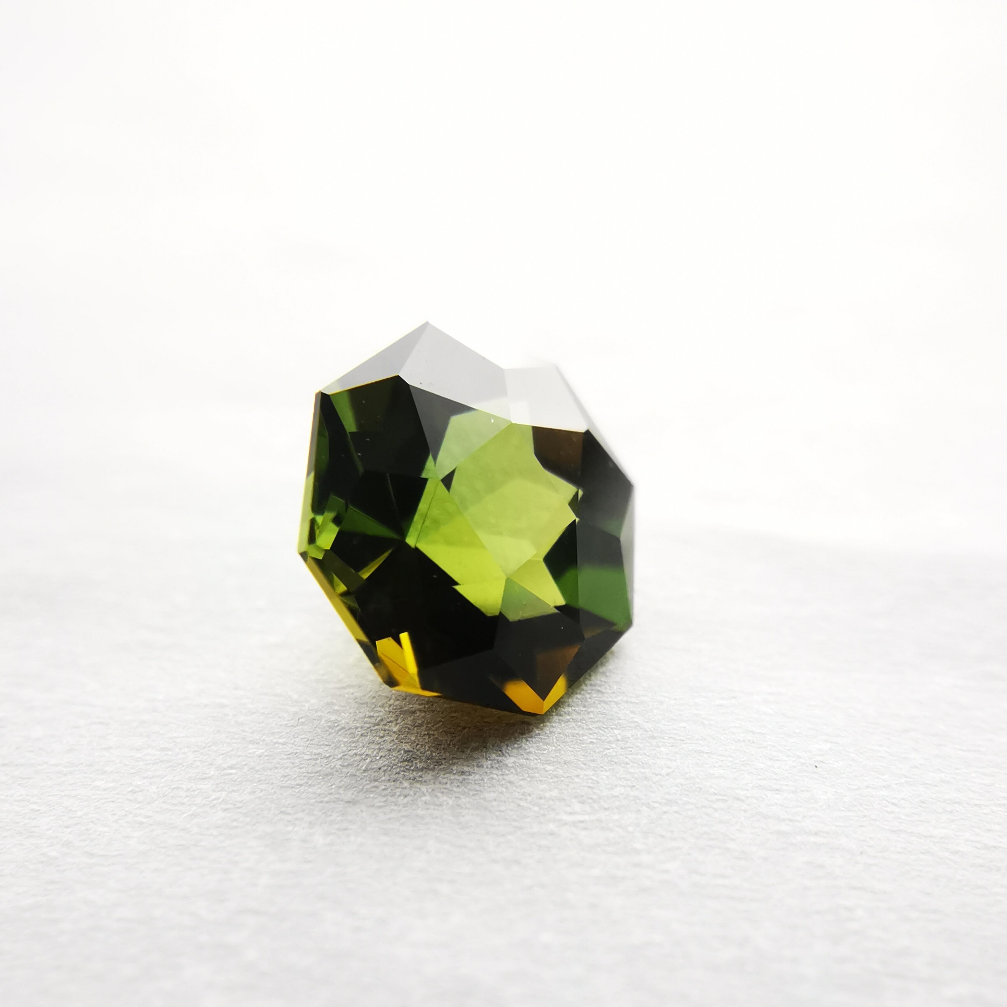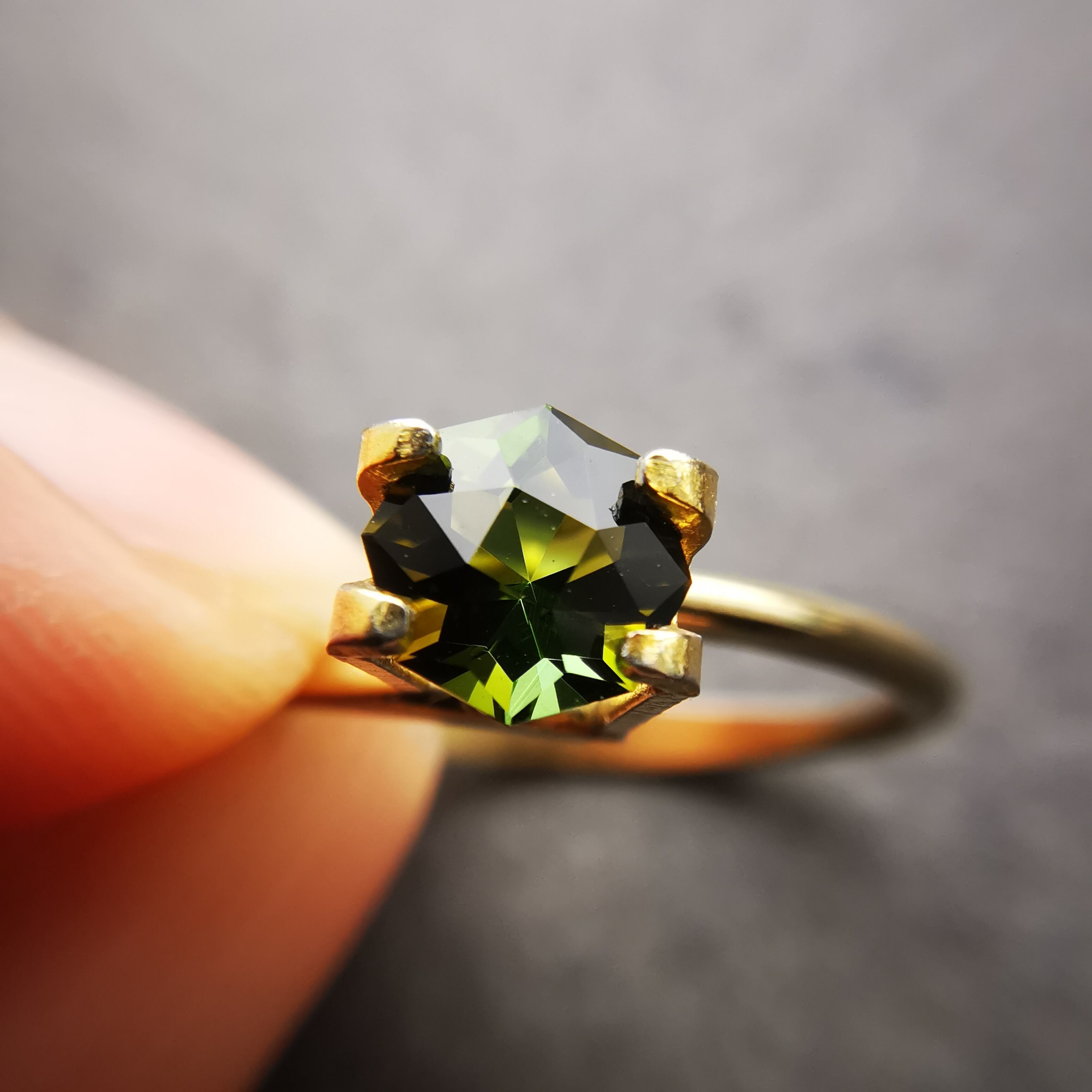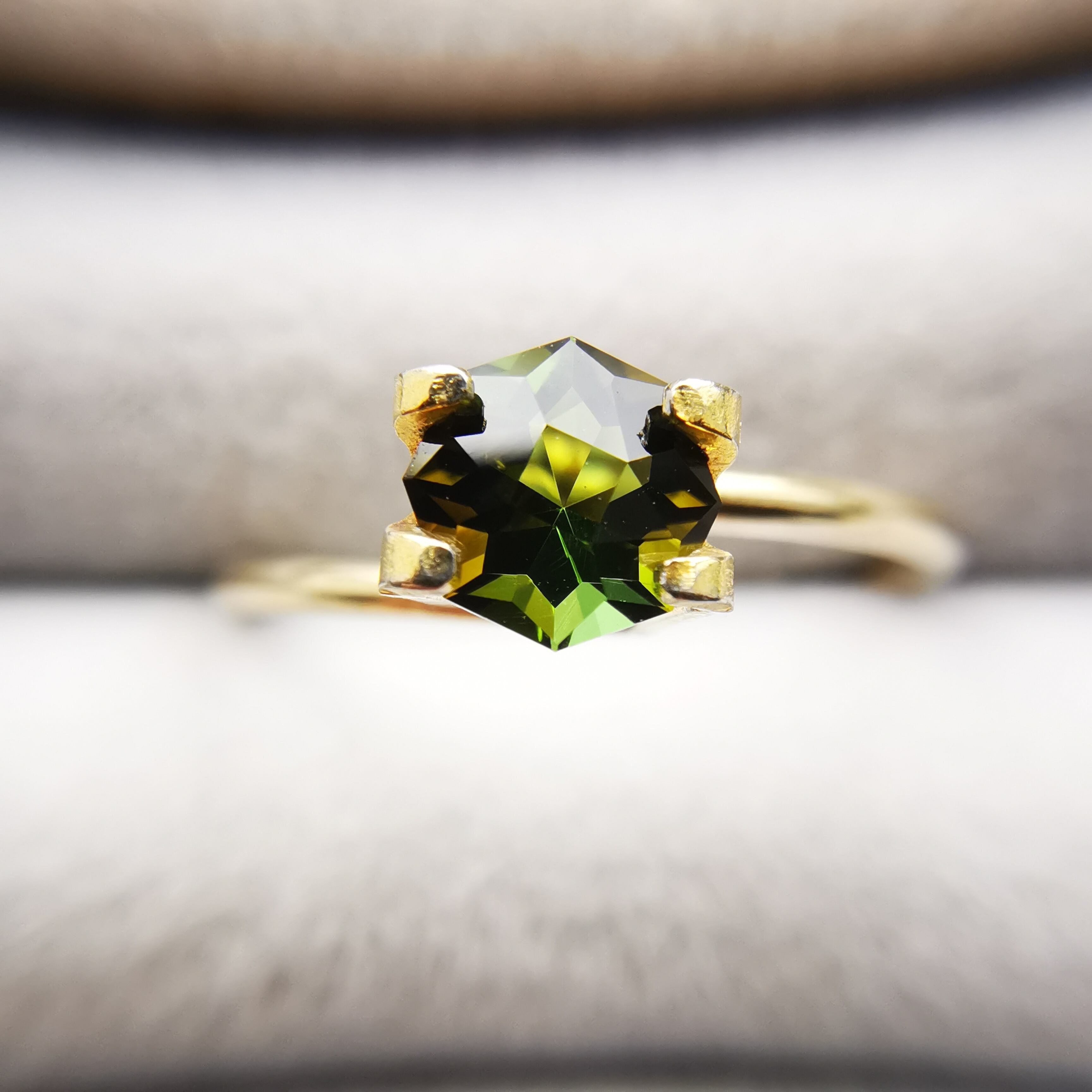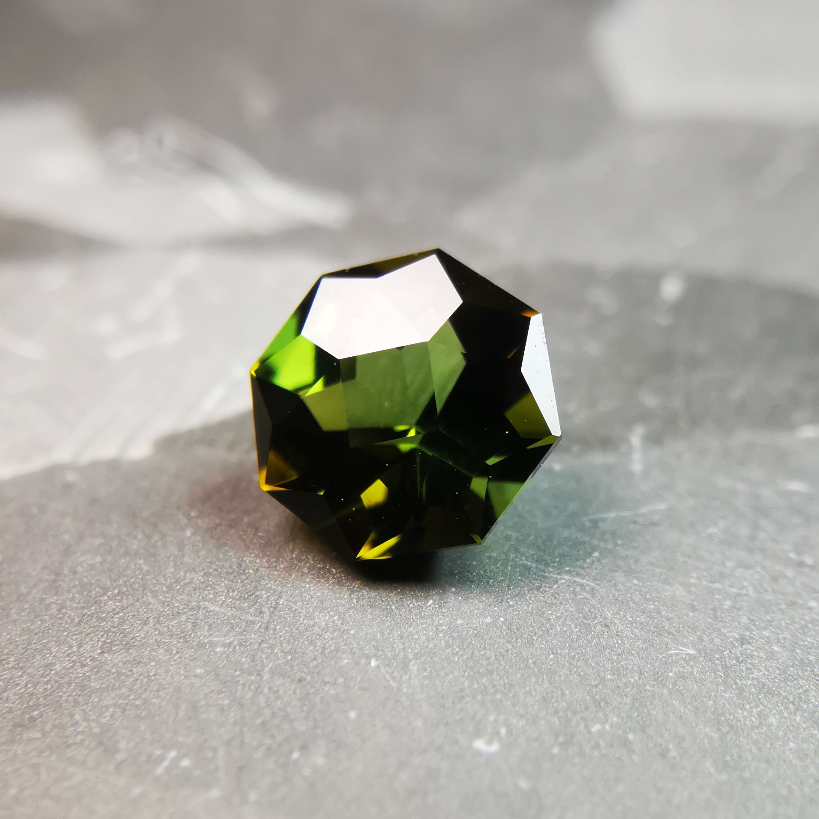 バイカラートルマリンかと思いましたが、どこから見ても色の境目が分からず、多色性による見え方かもしれません。