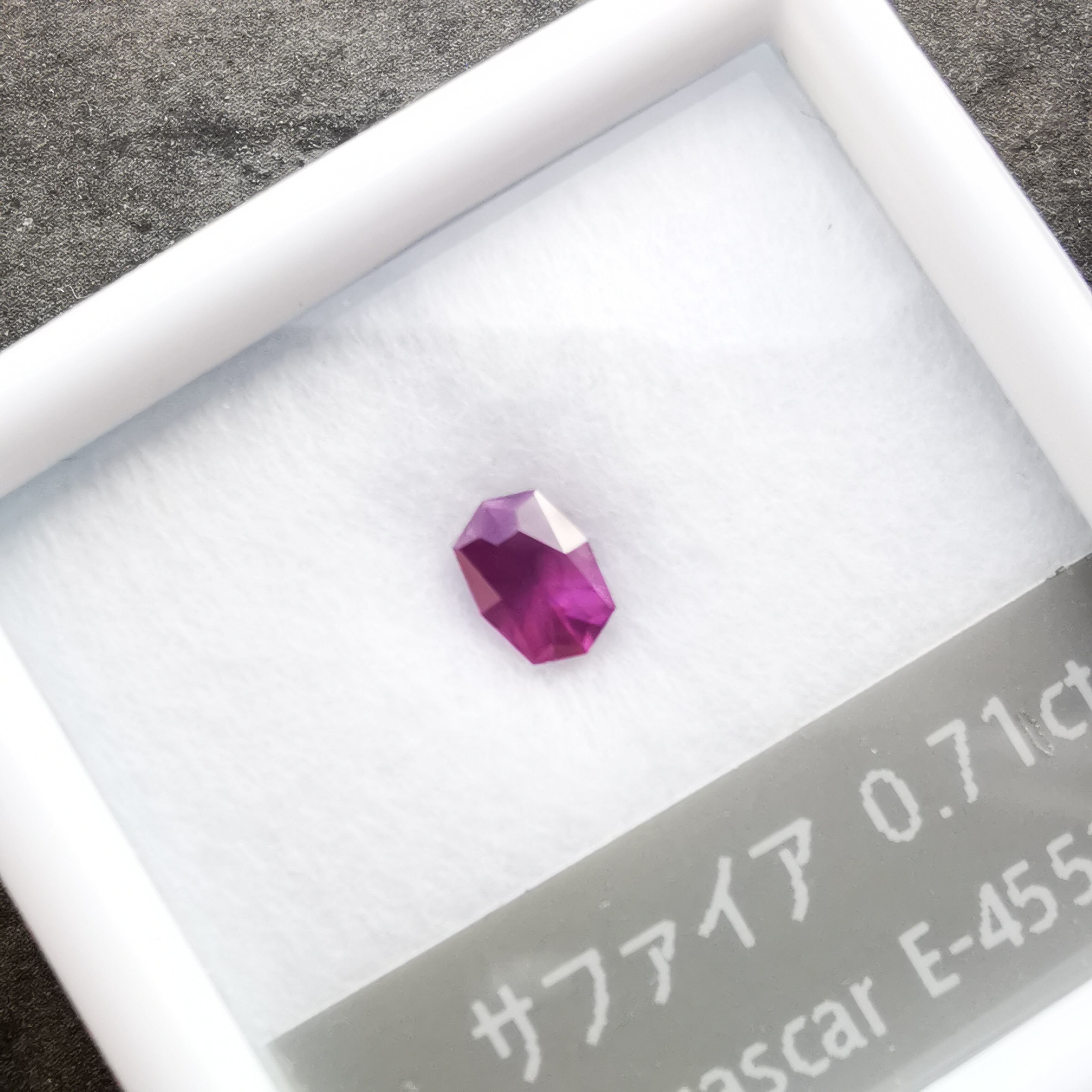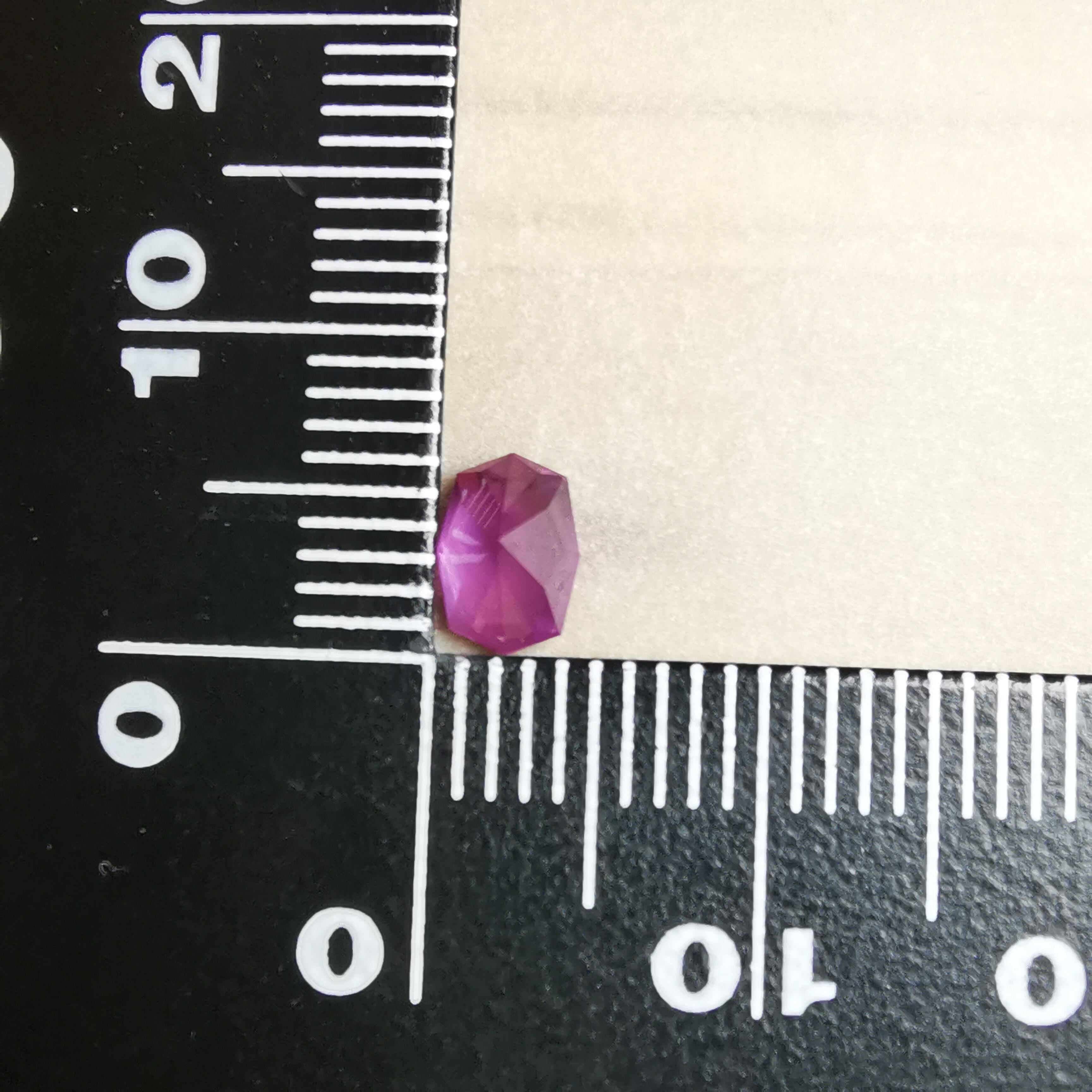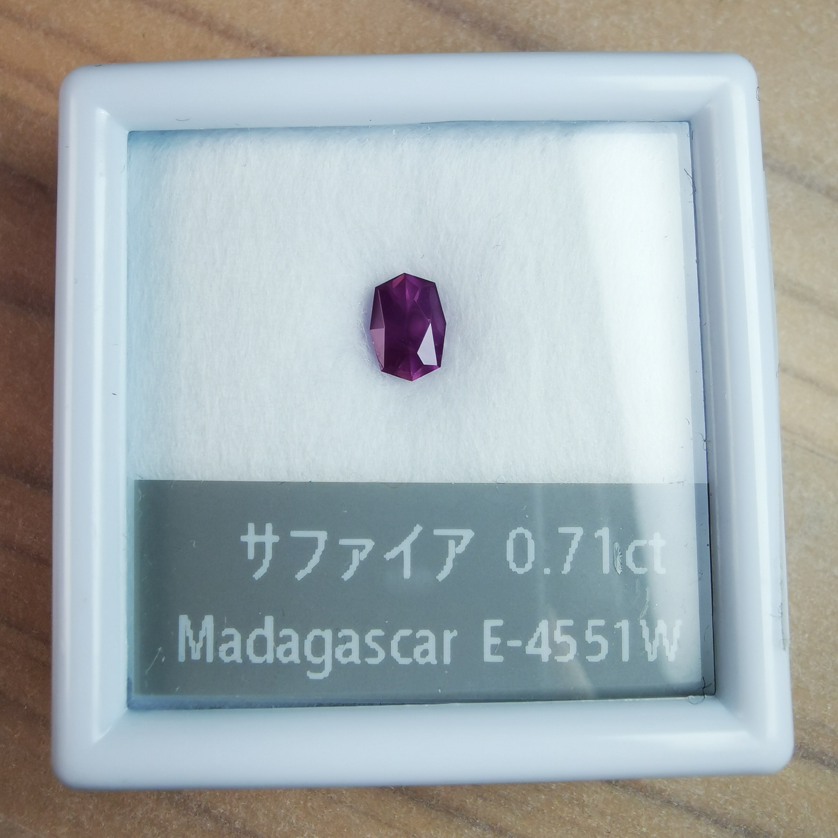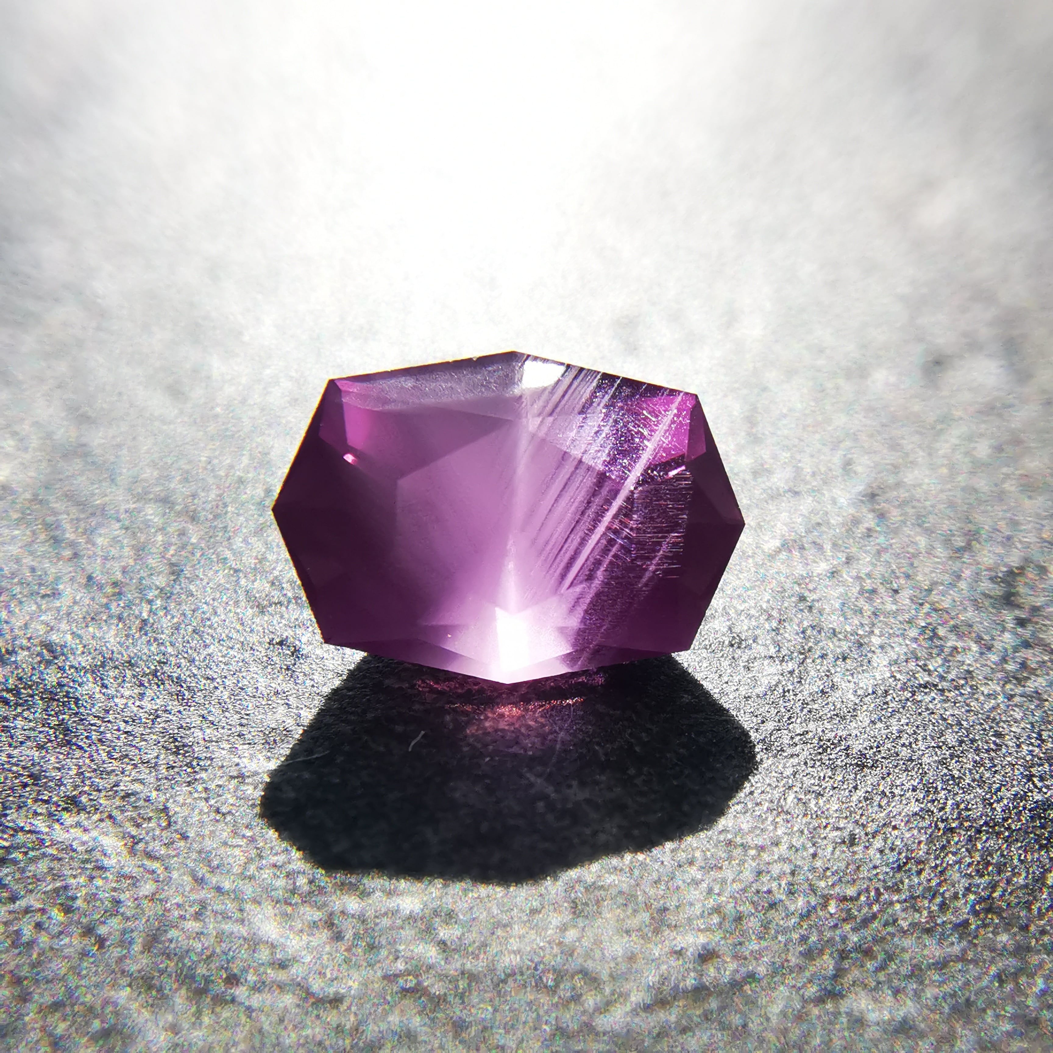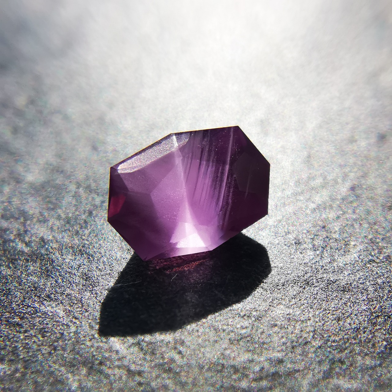 くすんだ赤紫/チリアンパープルで、内部にシルキーなインクルージョンがありやや不透明な一石です。