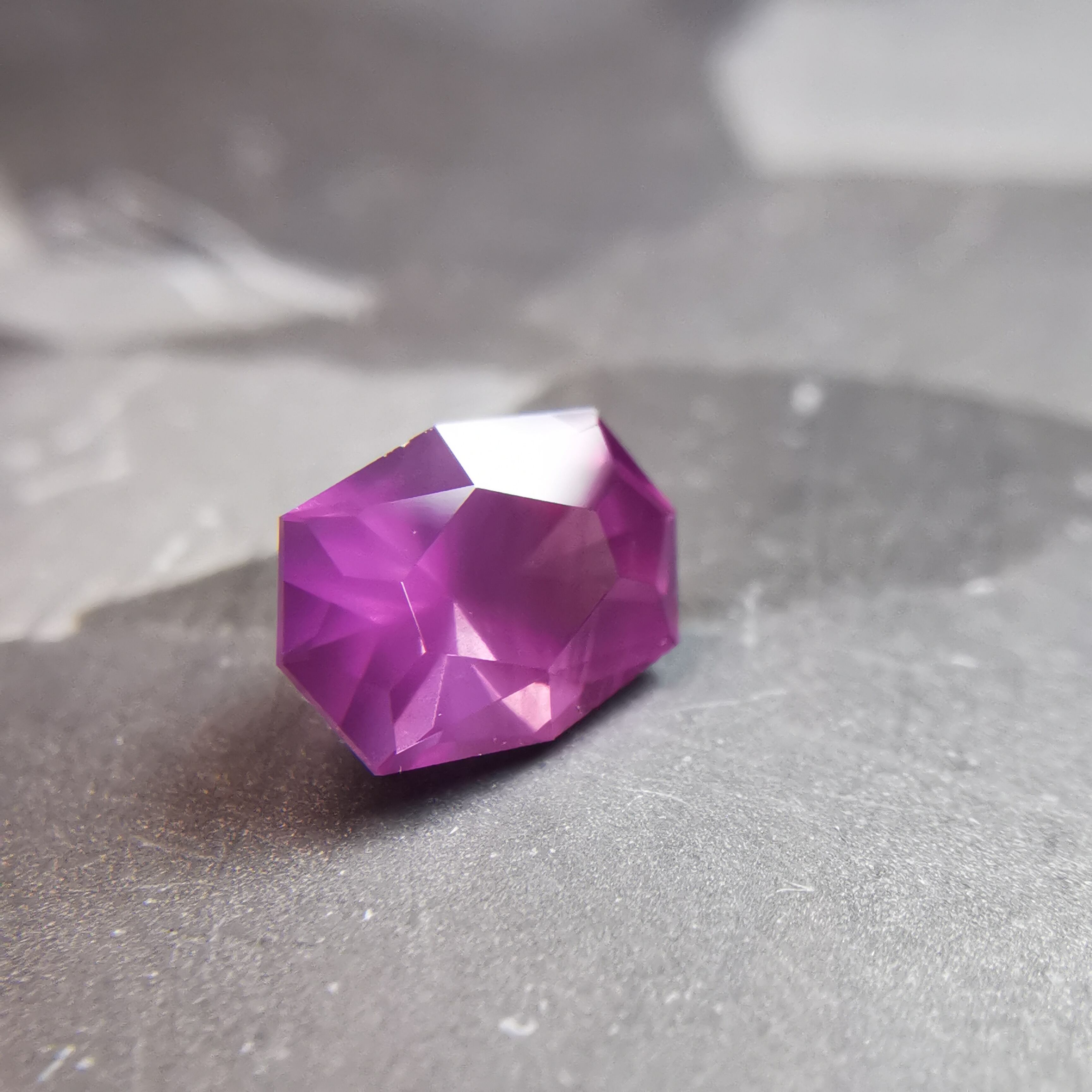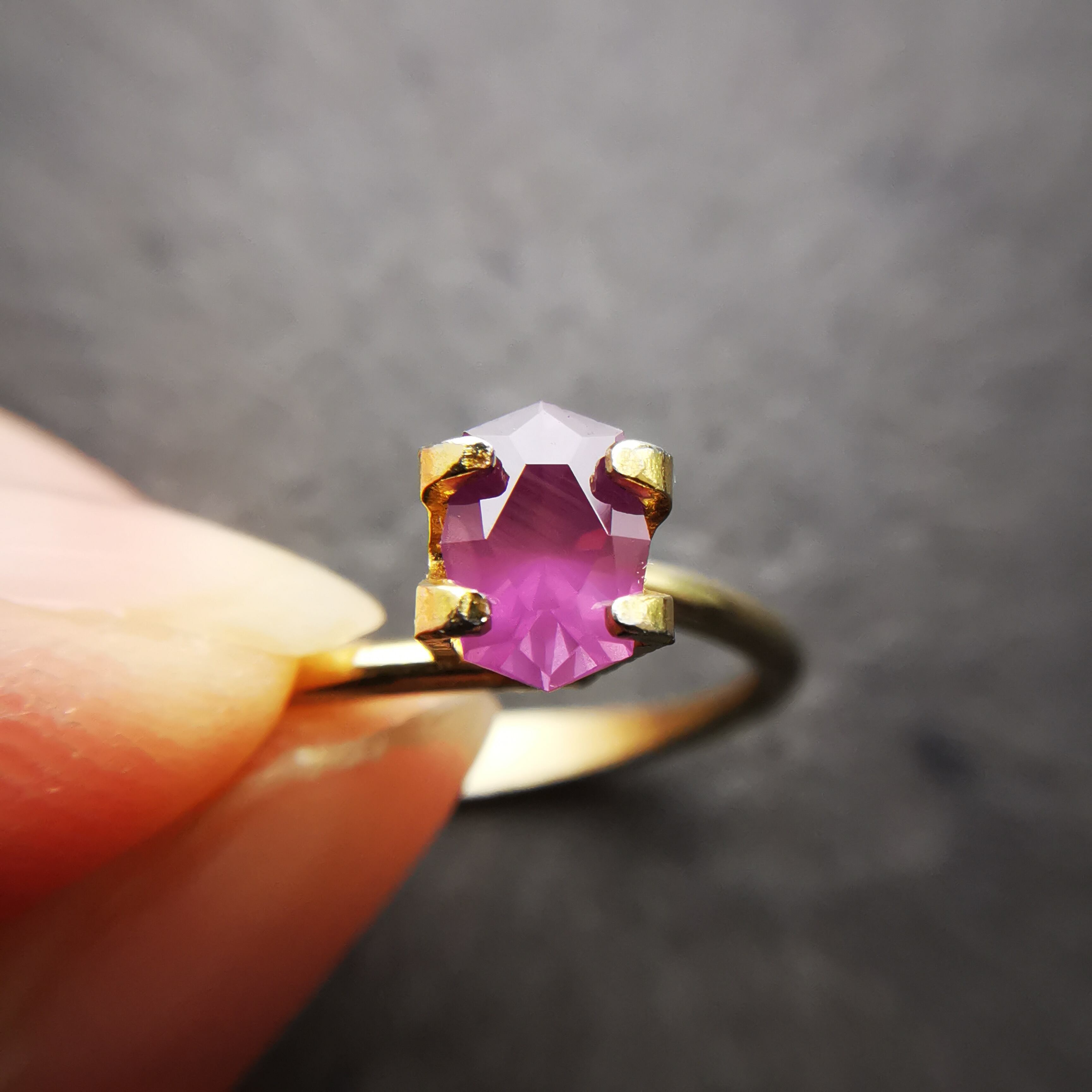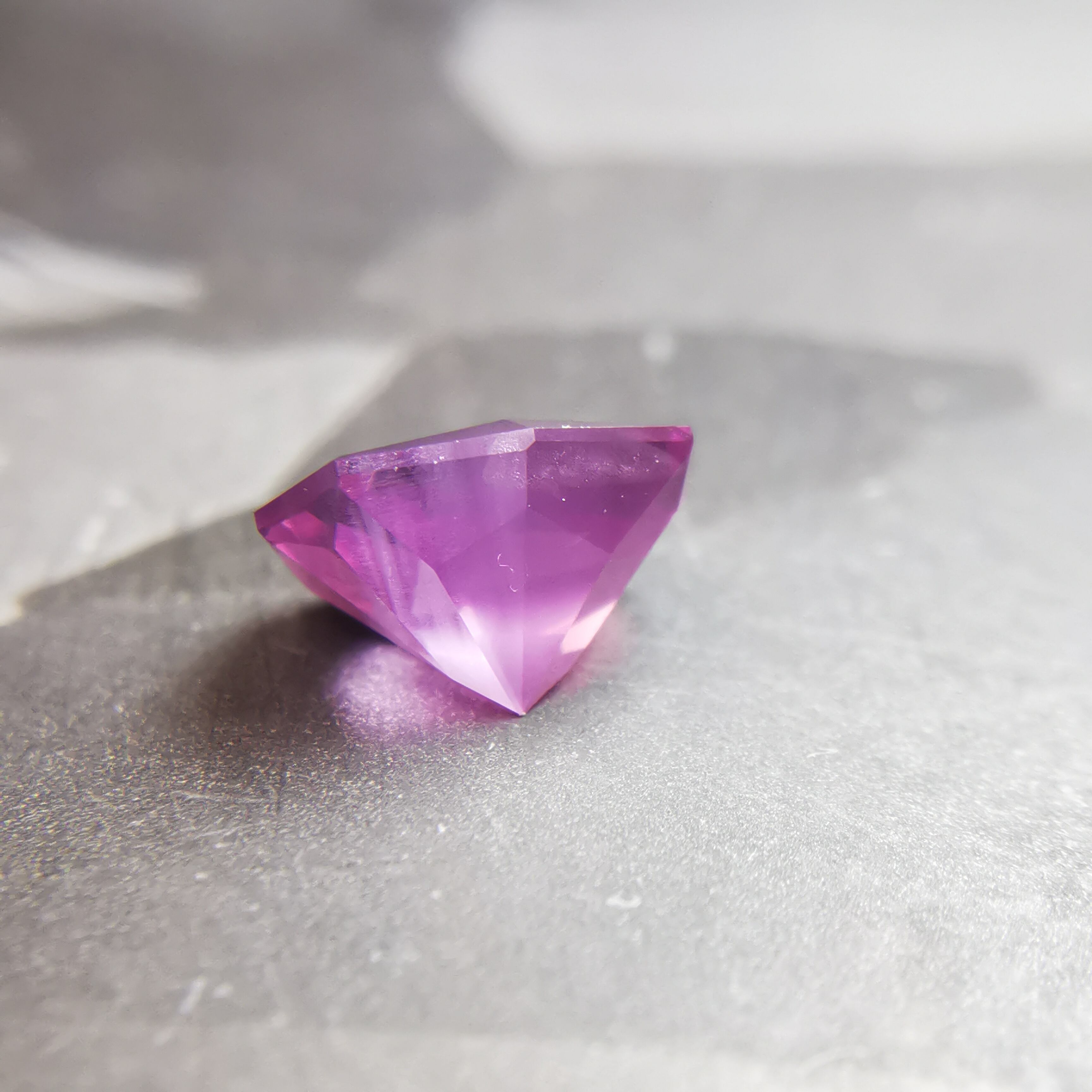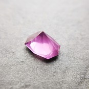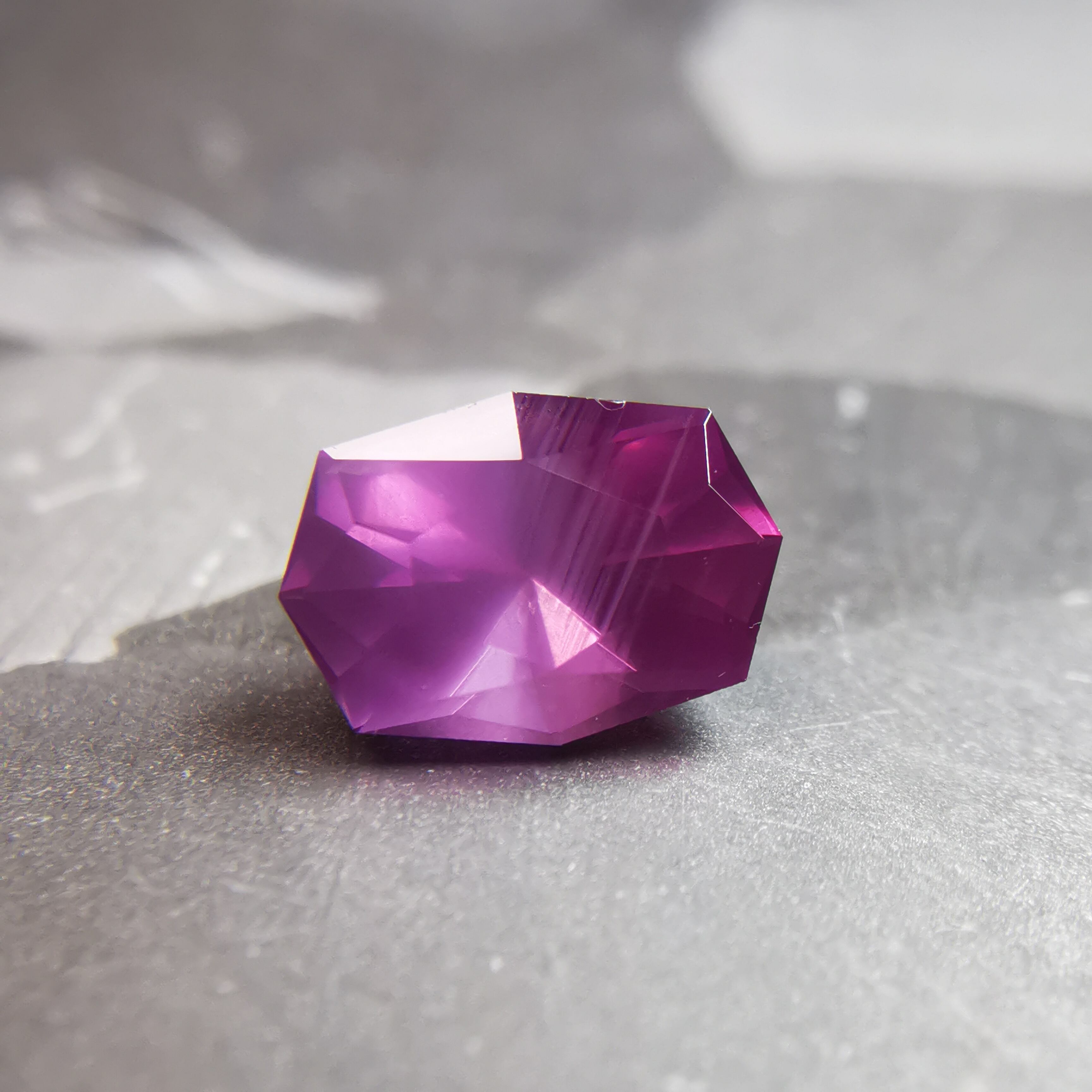 くすんだ赤紫/チリアンパープルで、内部にシルキーなインクルージョンがありやや不透明な一石です。