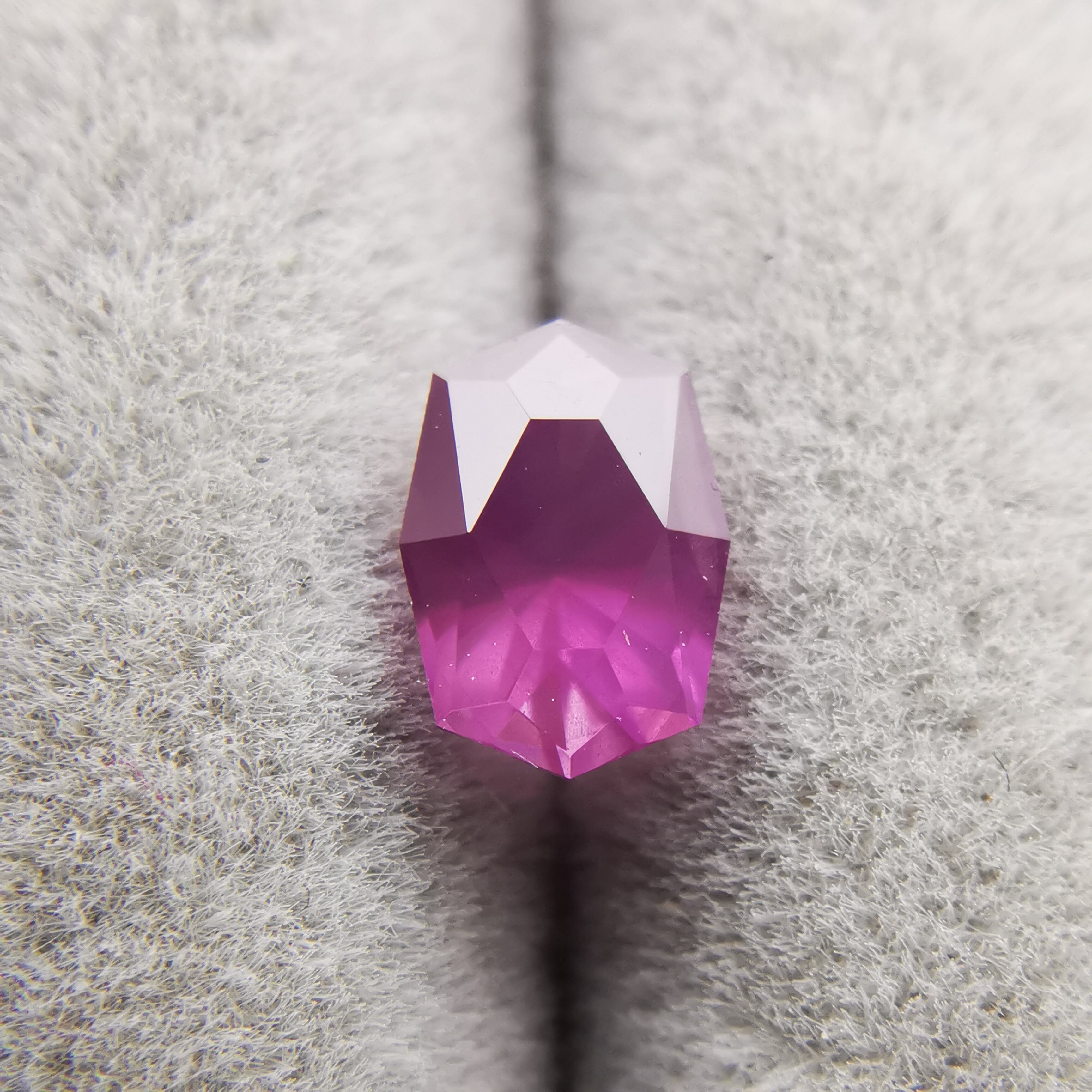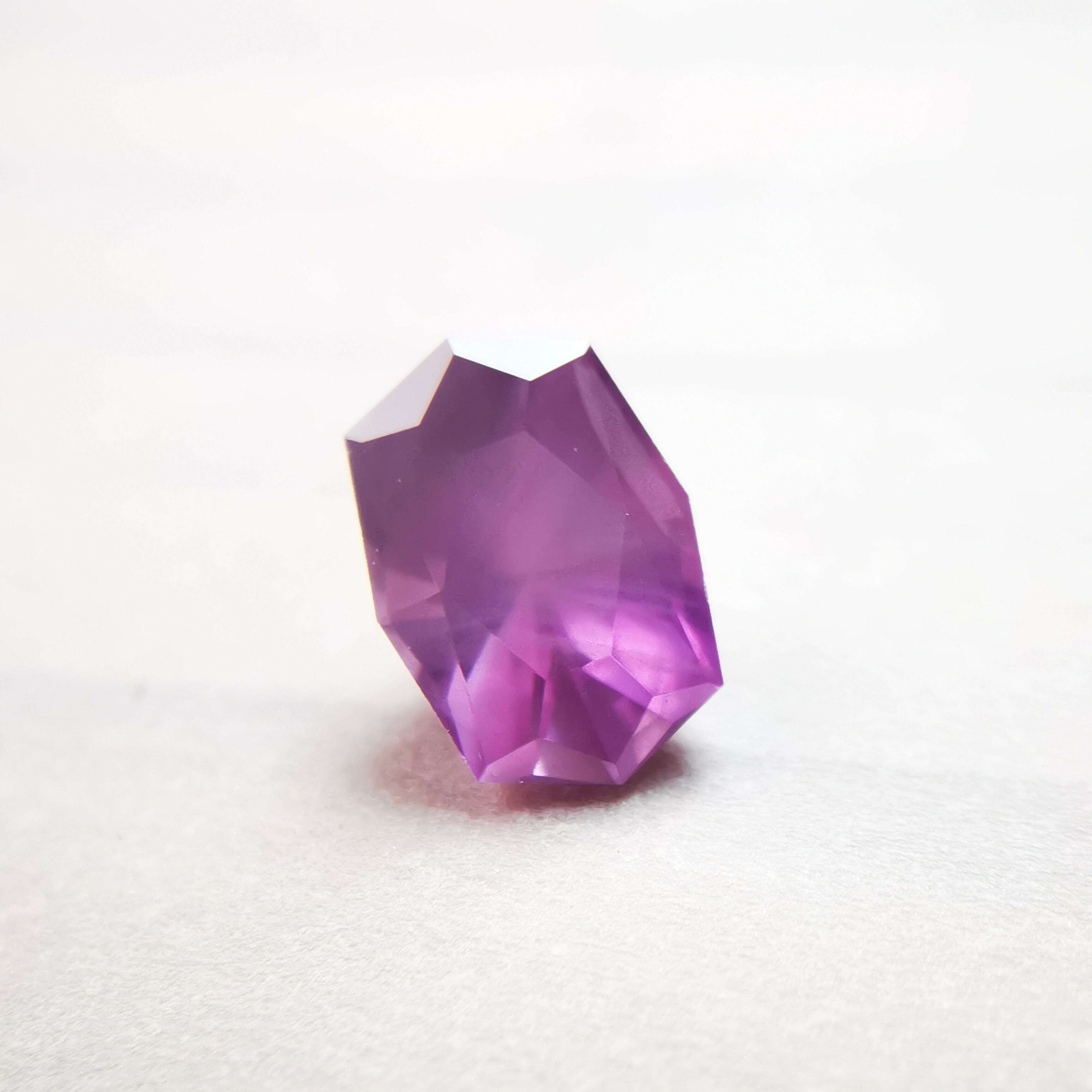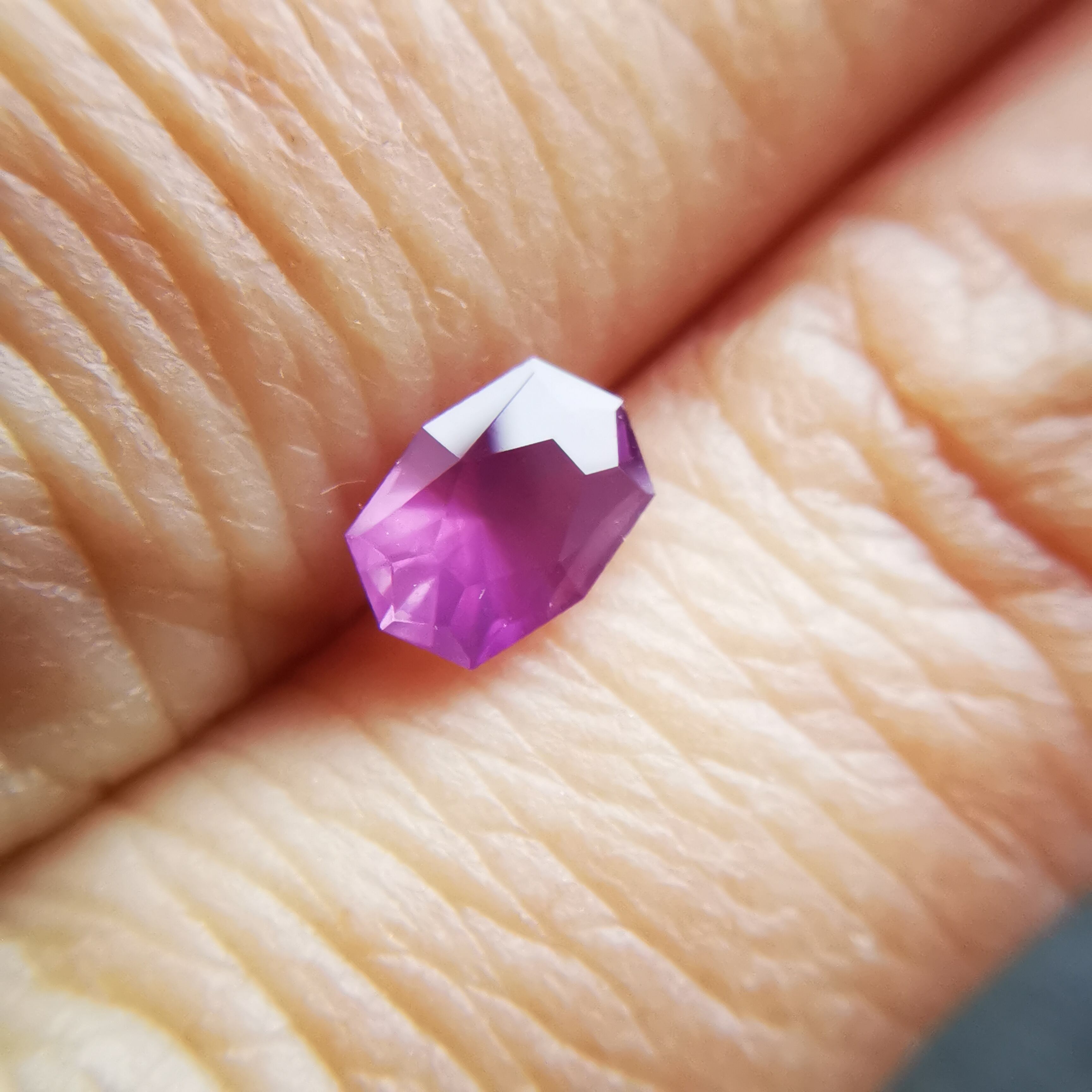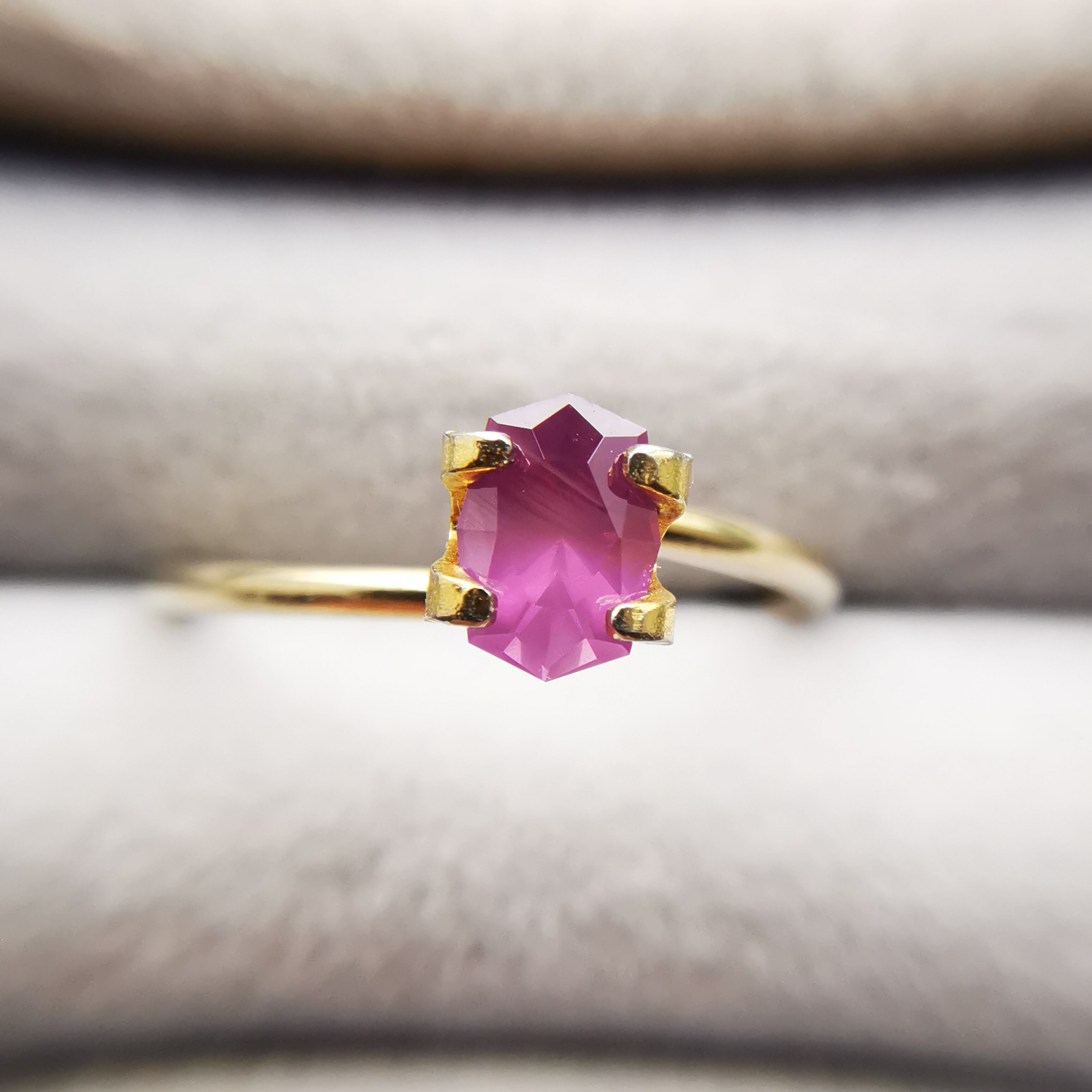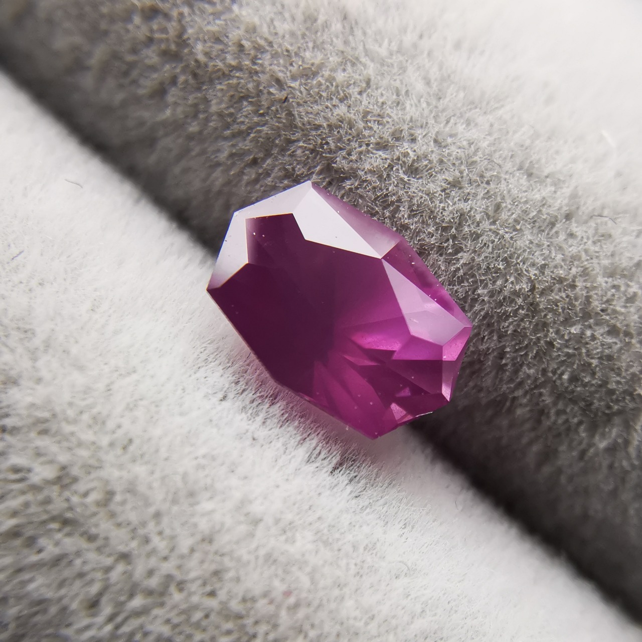 くすんだ赤紫/チリアンパープルで、内部にシルキーなインクルージョンがありやや不透明な一石です。