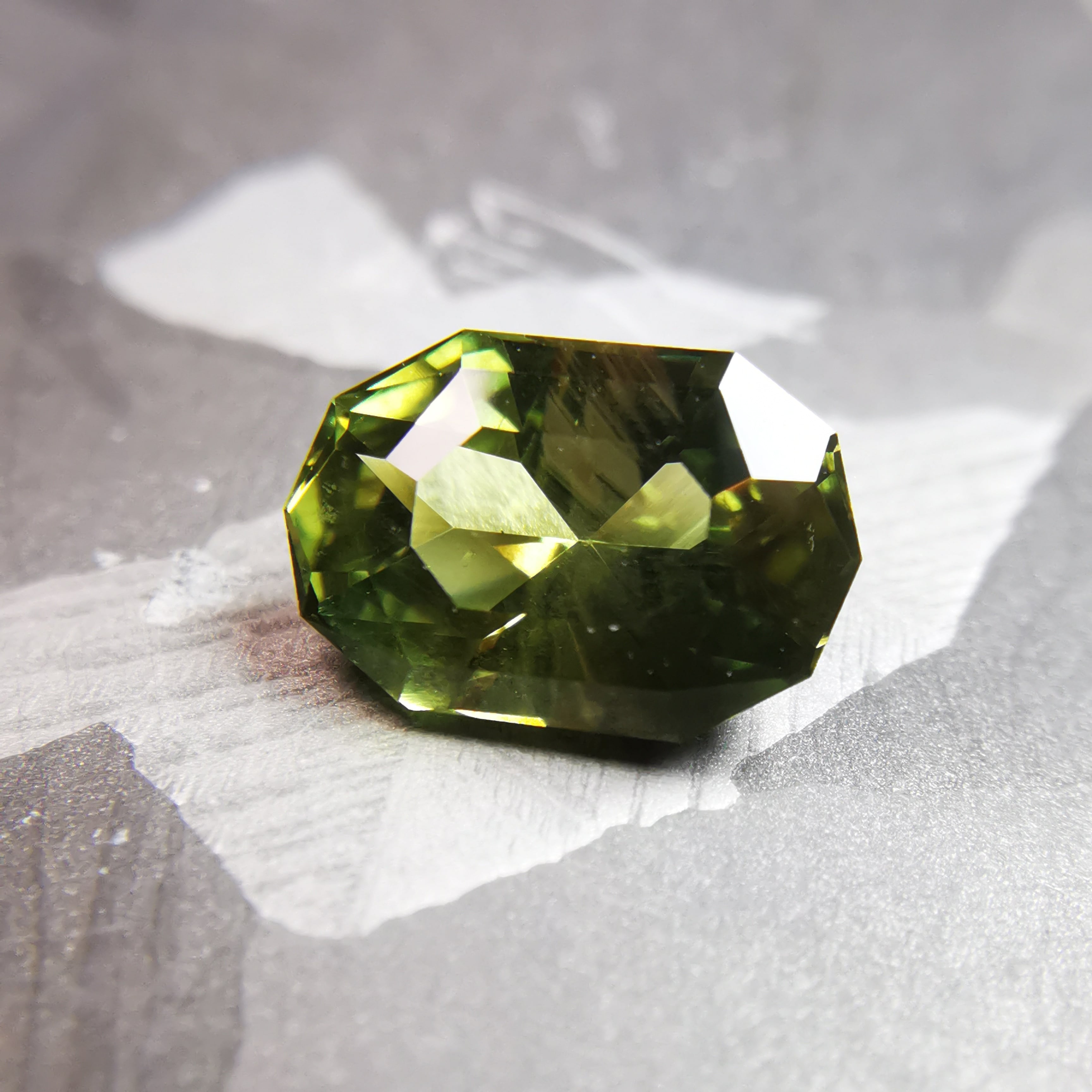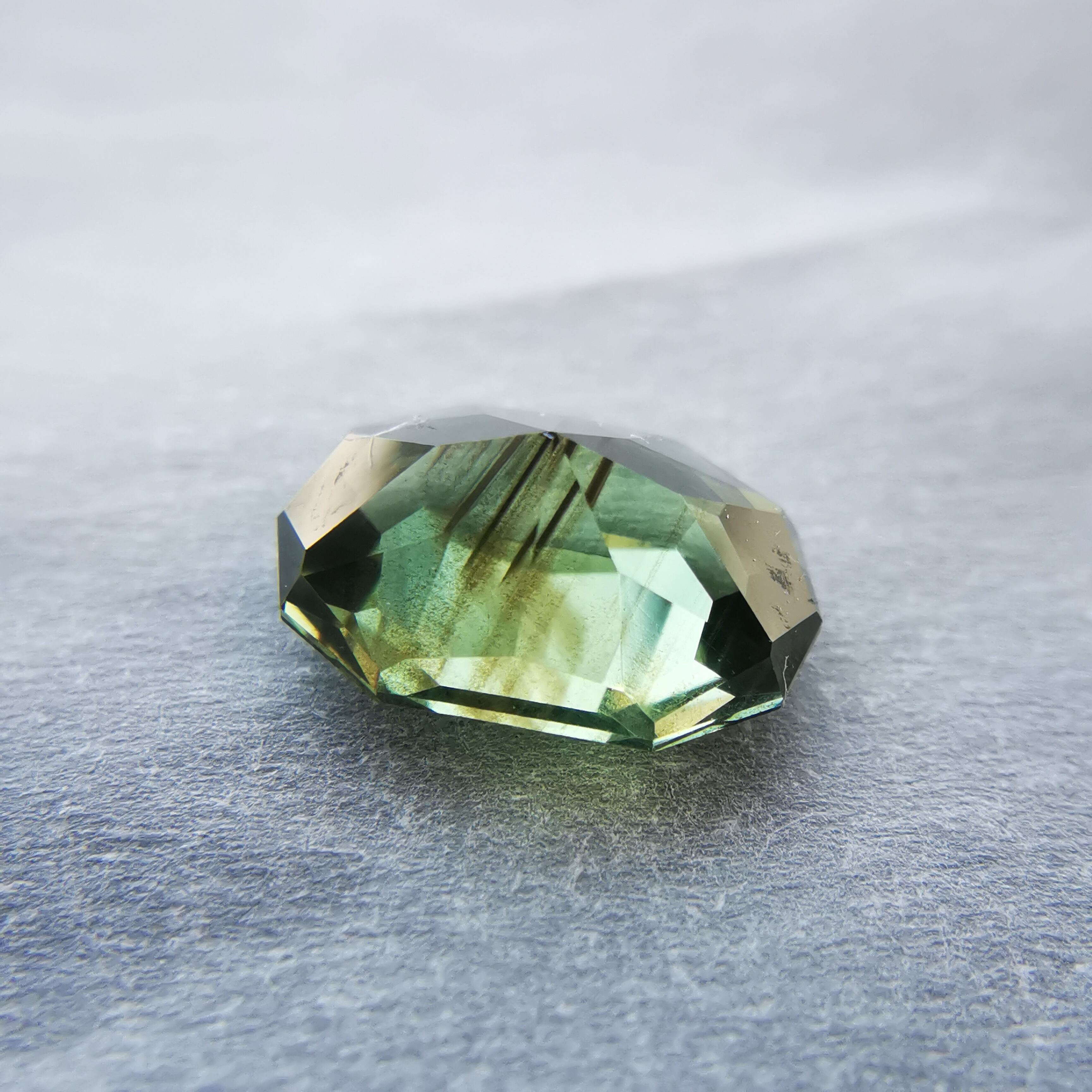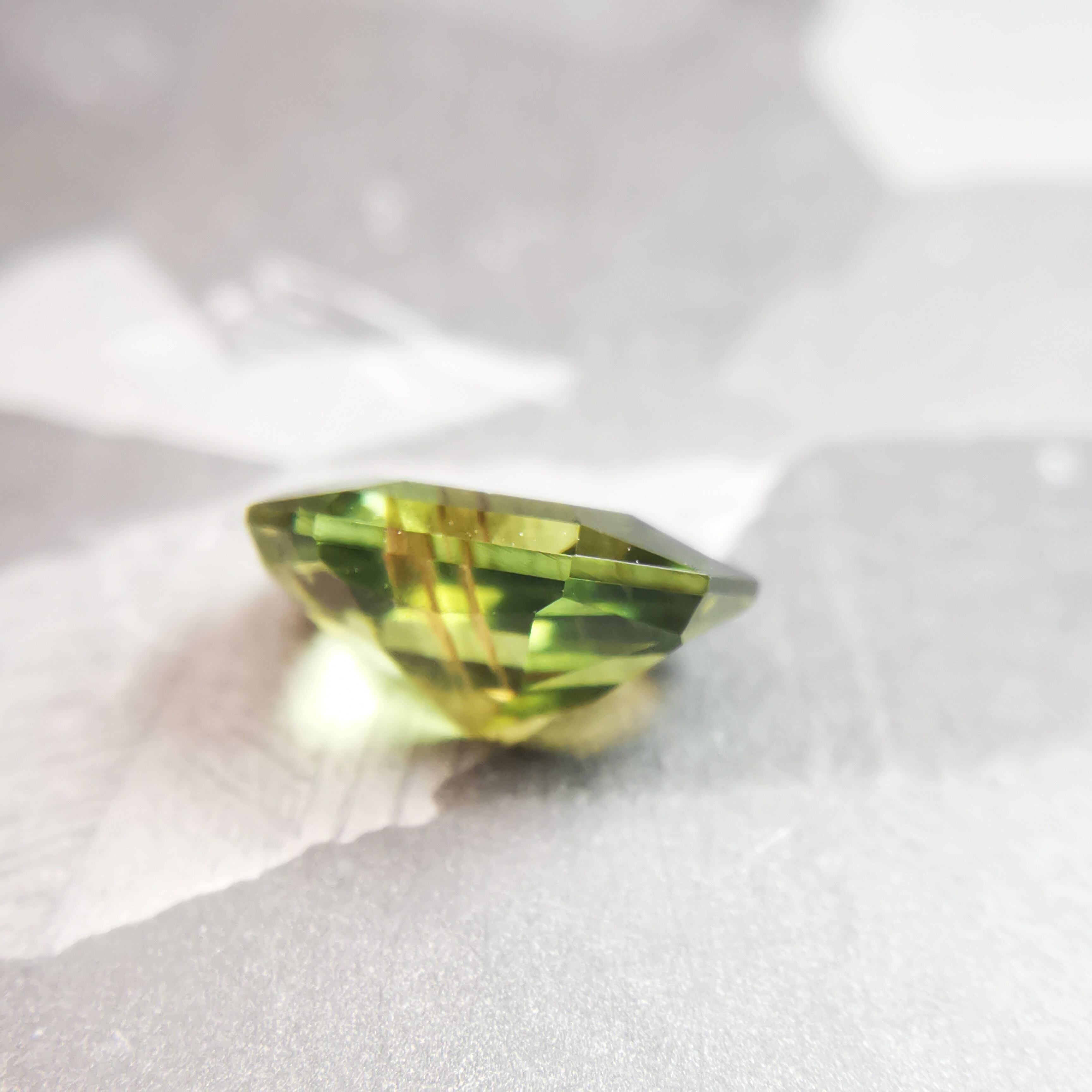 シャンパンカラーにきらめくシルクインクルージョンが幾筋か入っていて、黄緑のきらめきにちょっとしたスパイスのような効果を加えています。