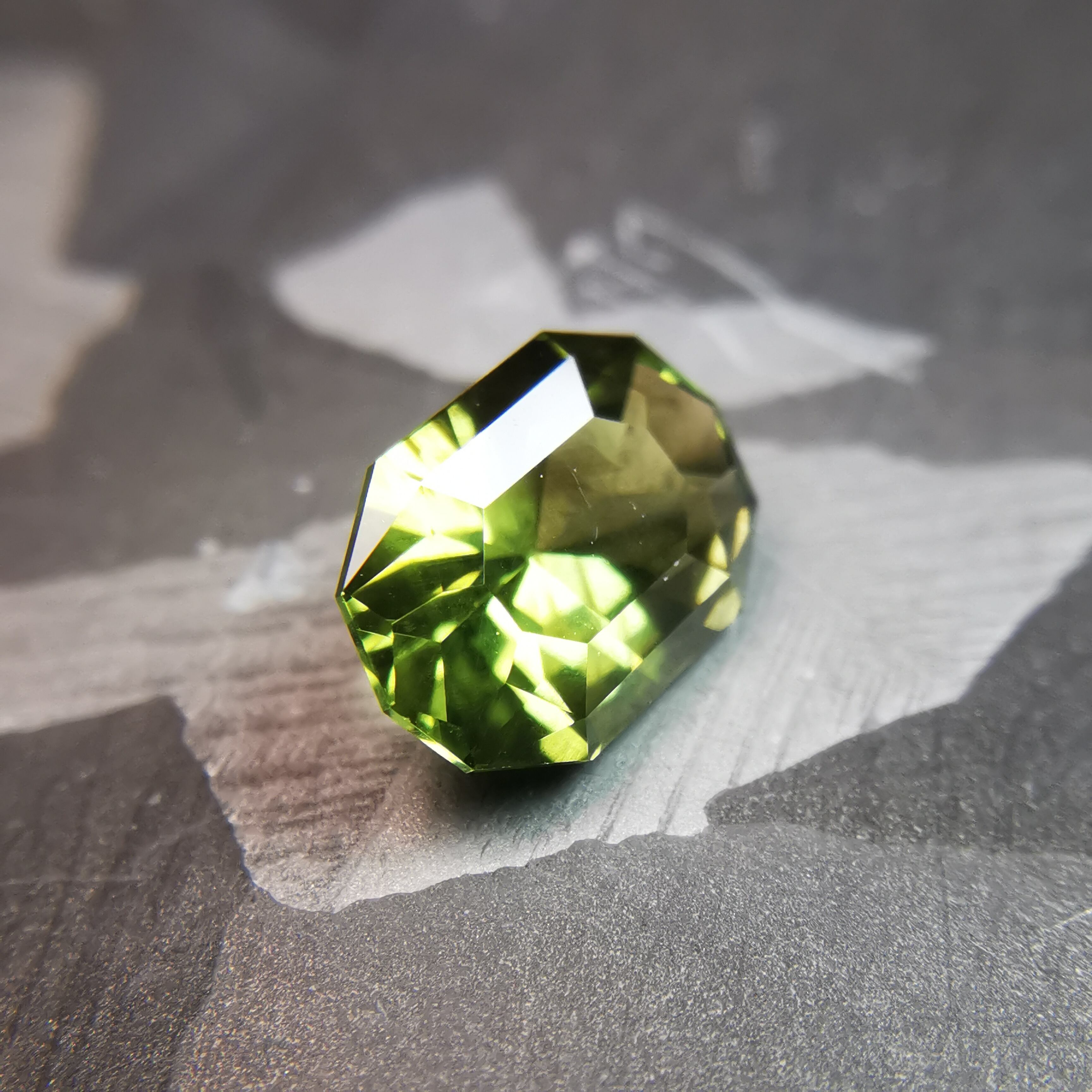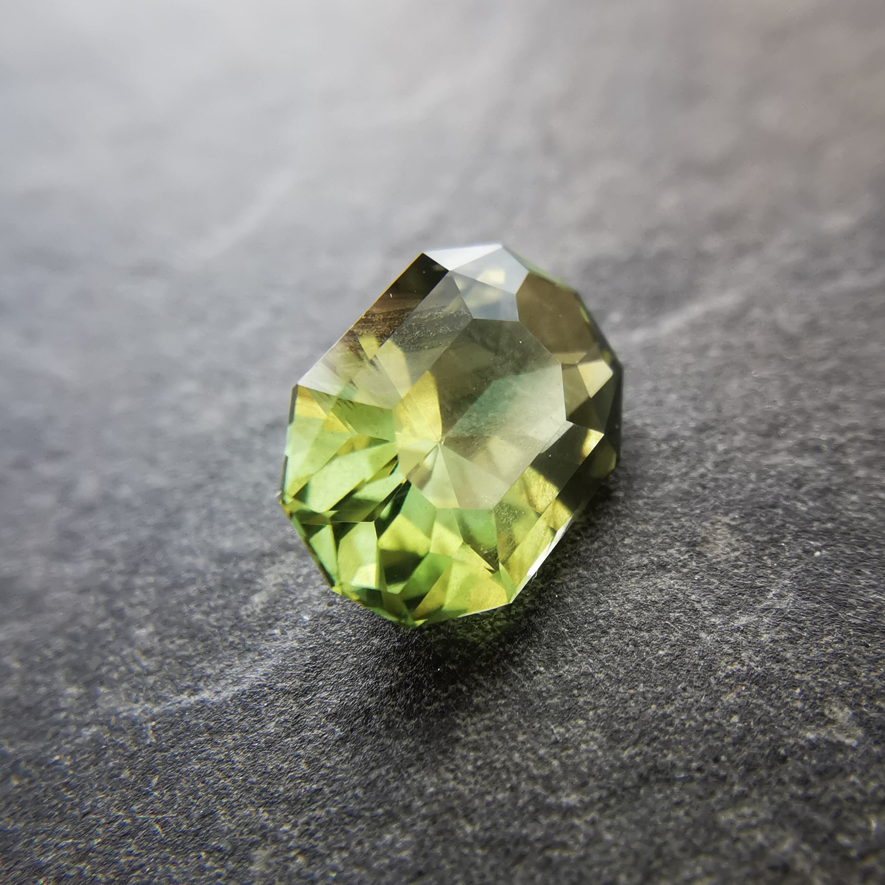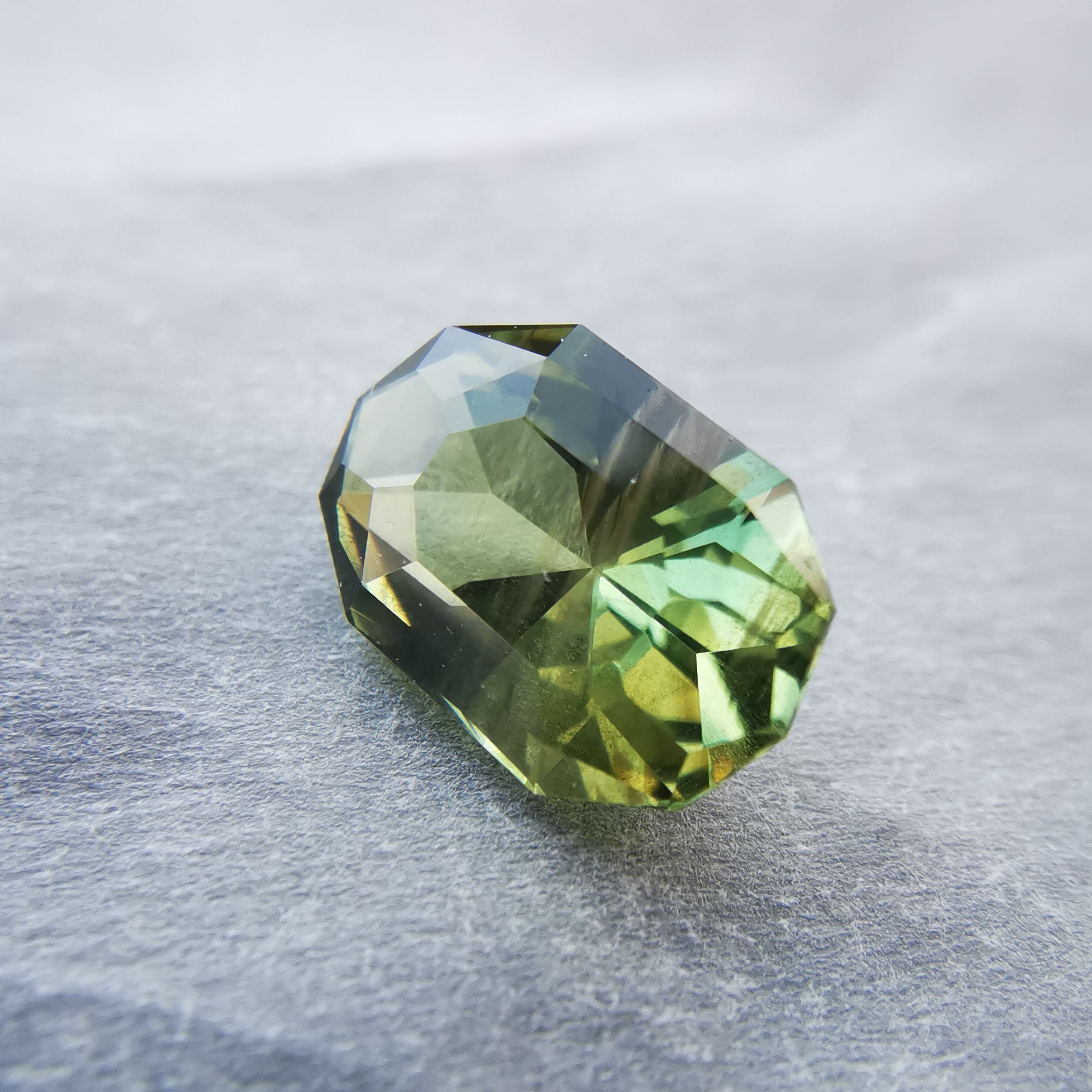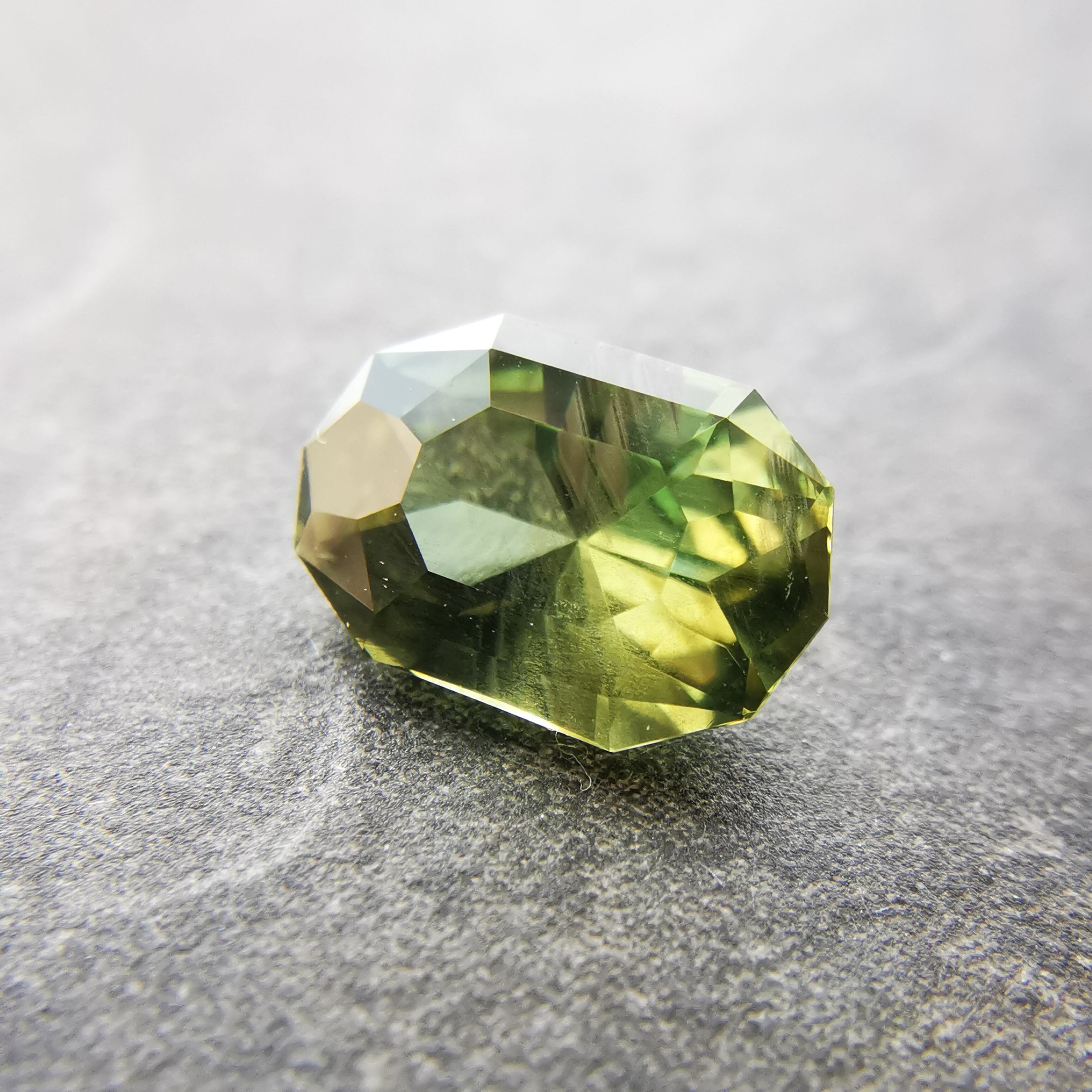 シャンパンカラーにきらめくシルクインクルージョンが幾筋か入っていて、黄緑のきらめきにちょっとしたスパイスのような効果を加えています。