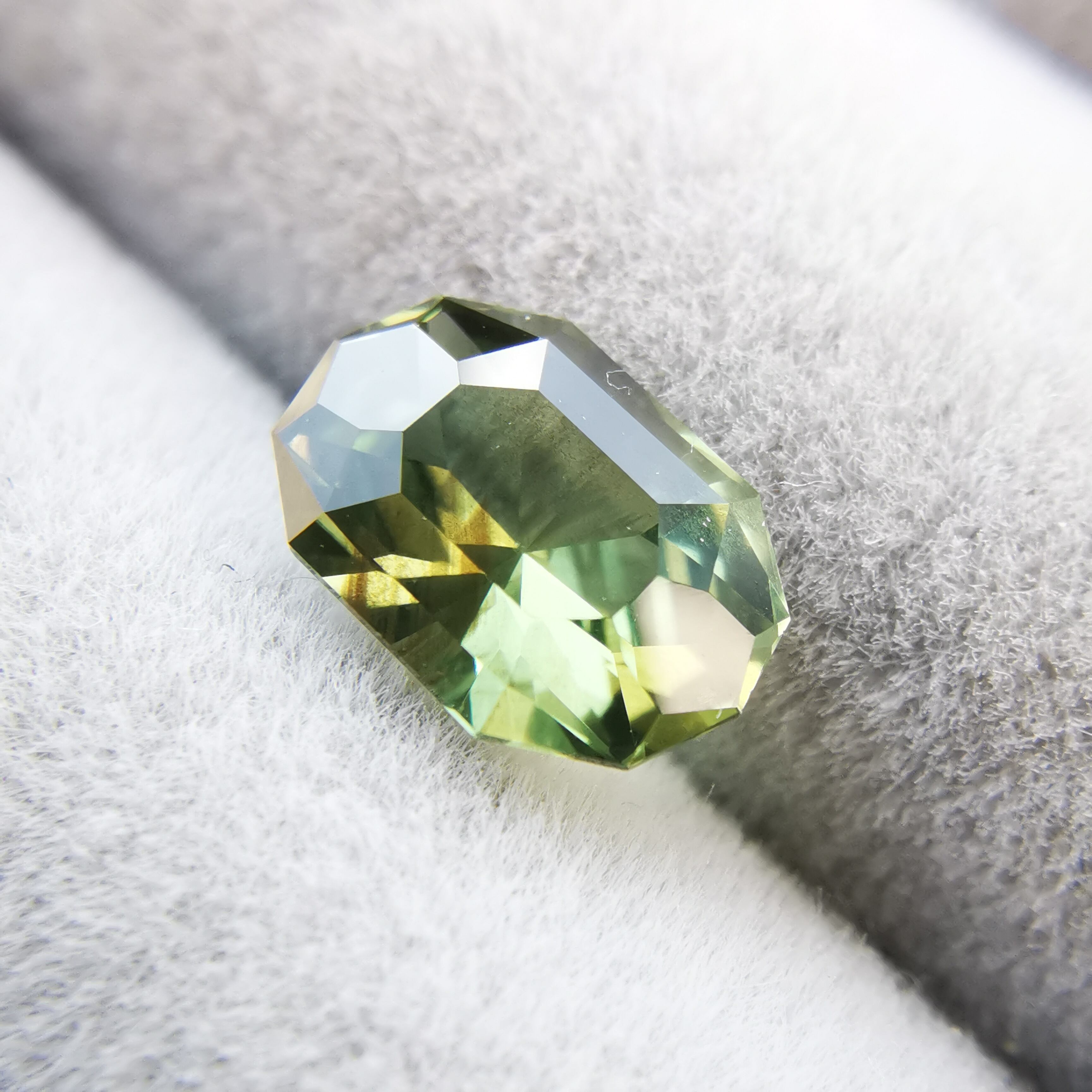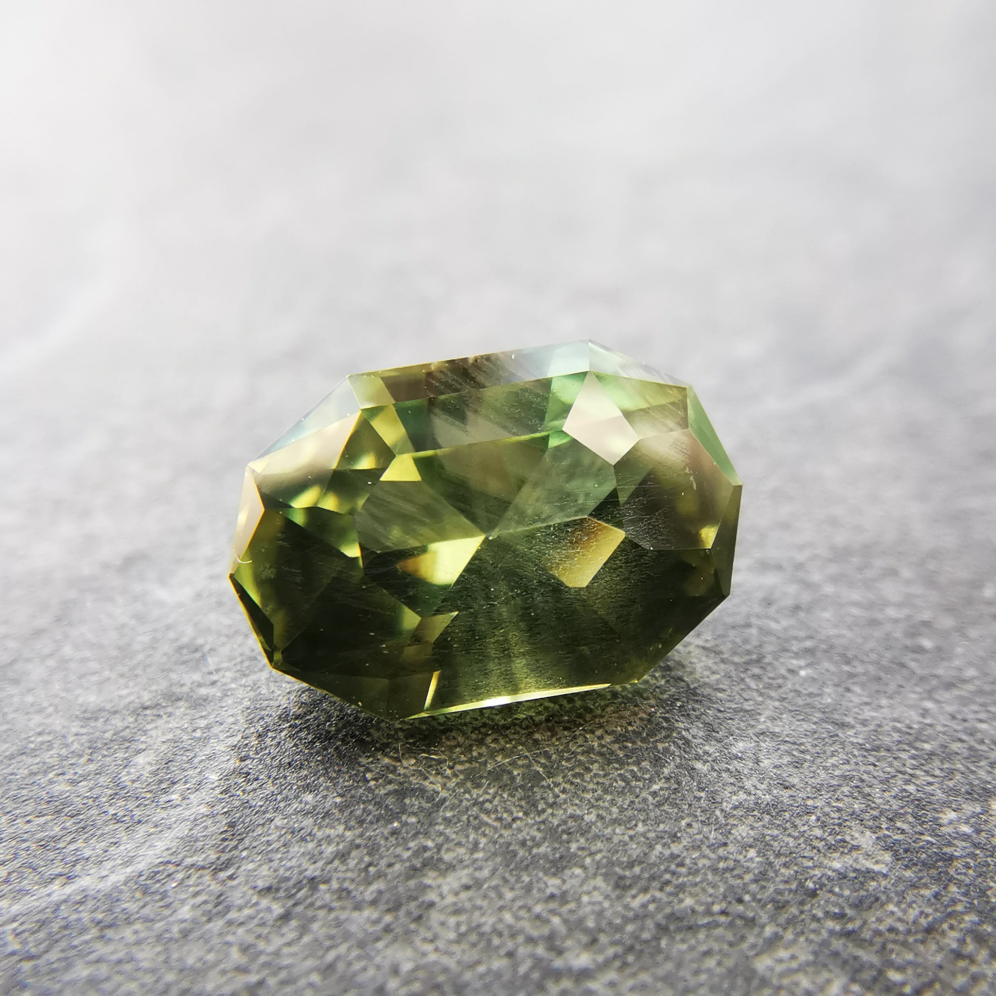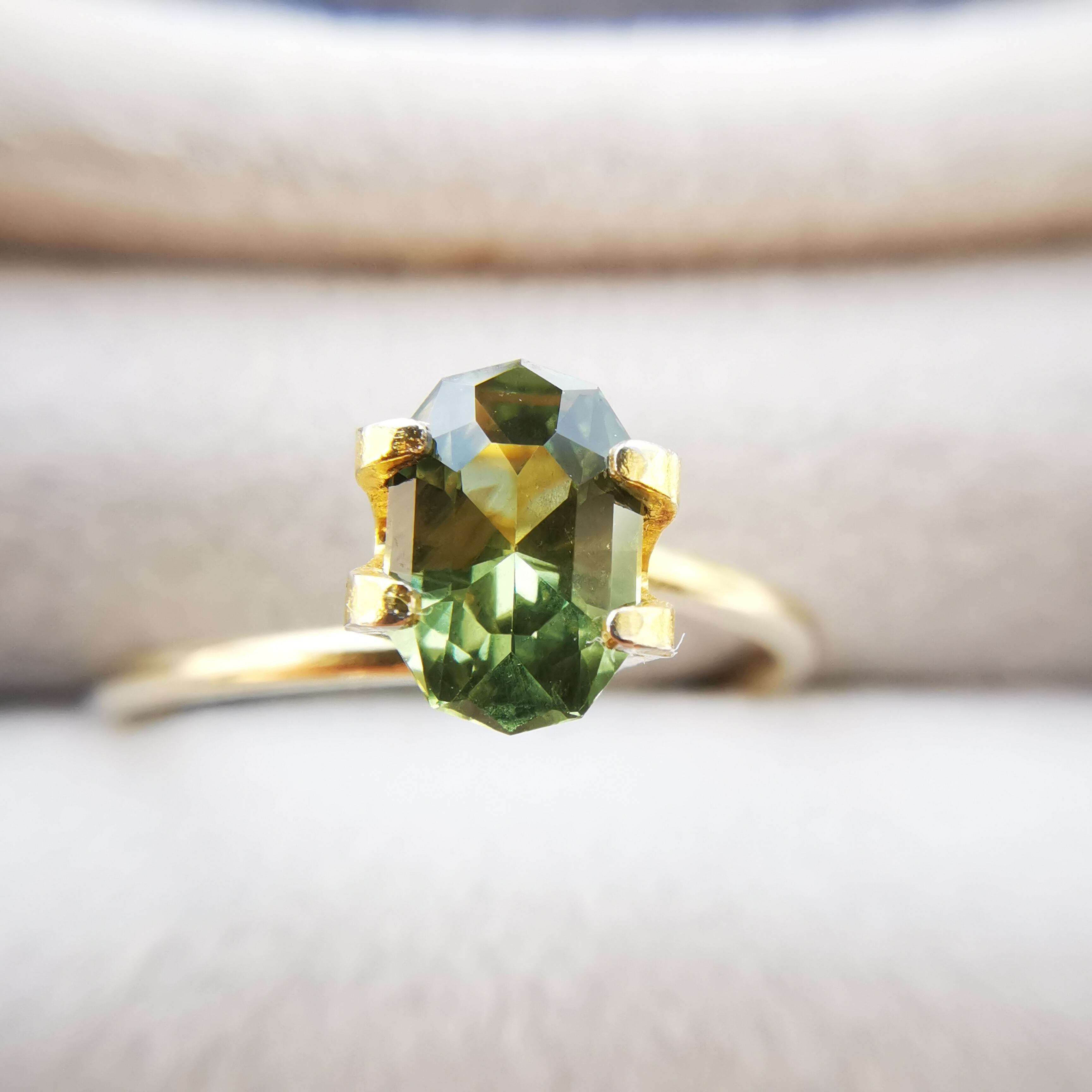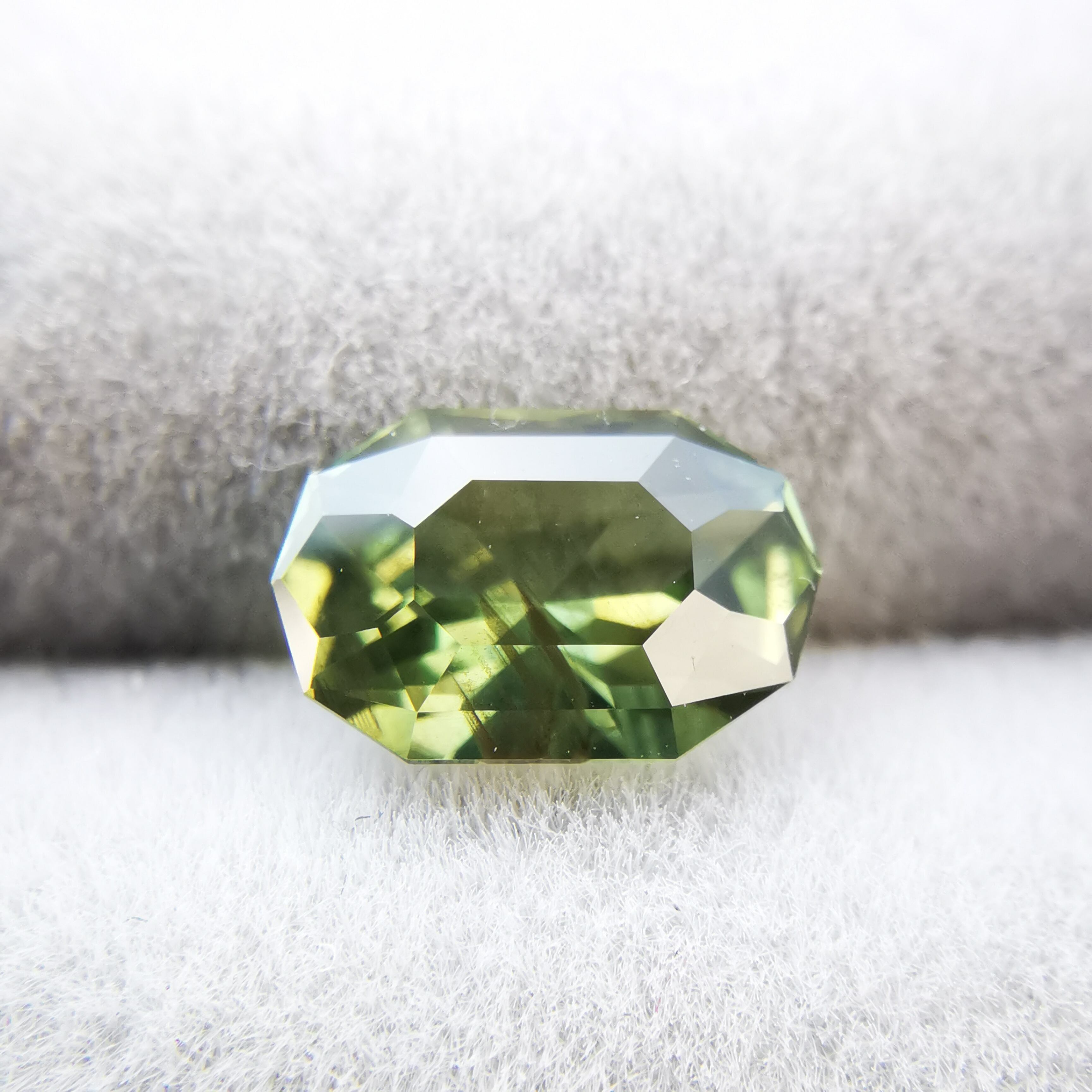 くすんだ黄緑/松葉色のサファイアから爽やかな黄緑の輝きがこぼれます。