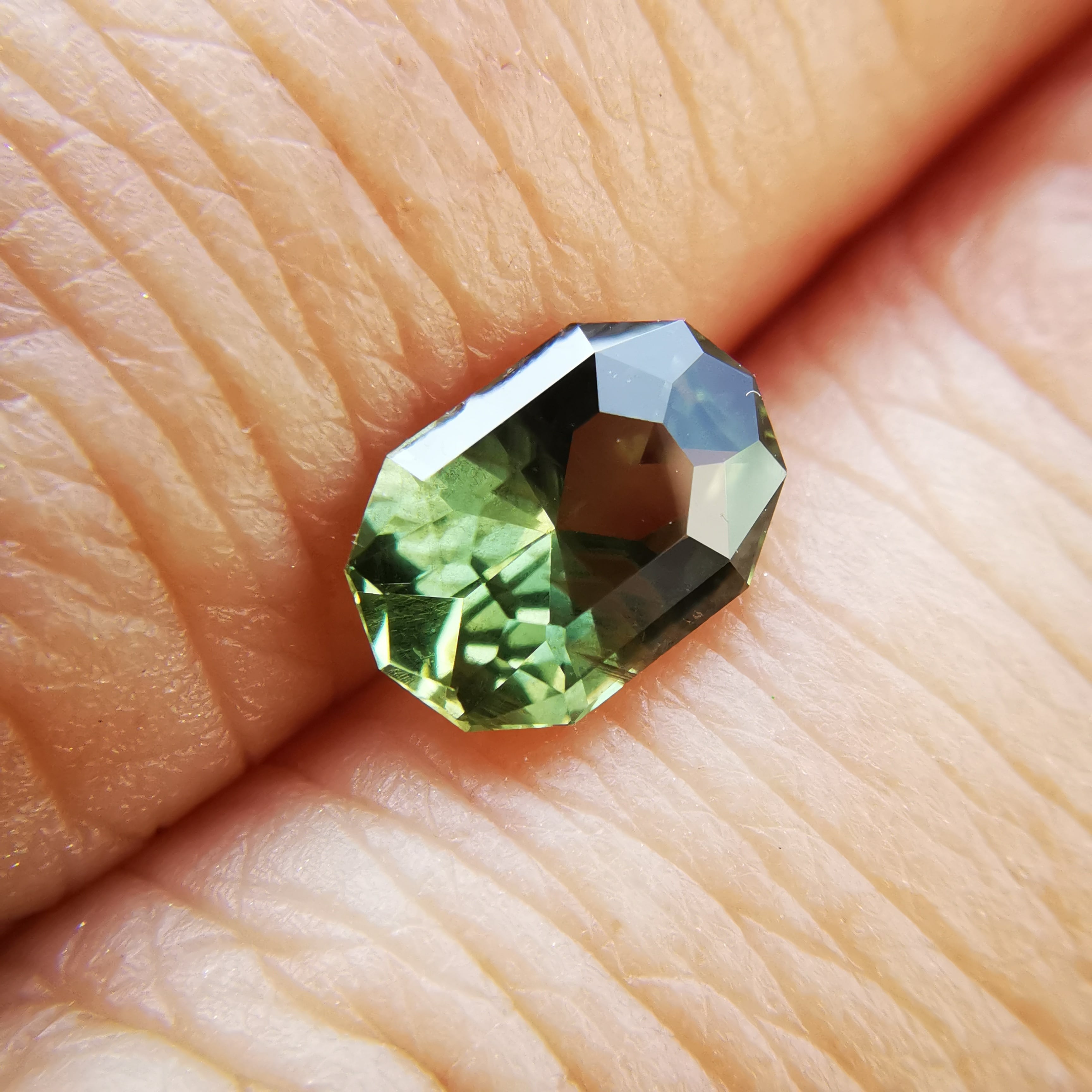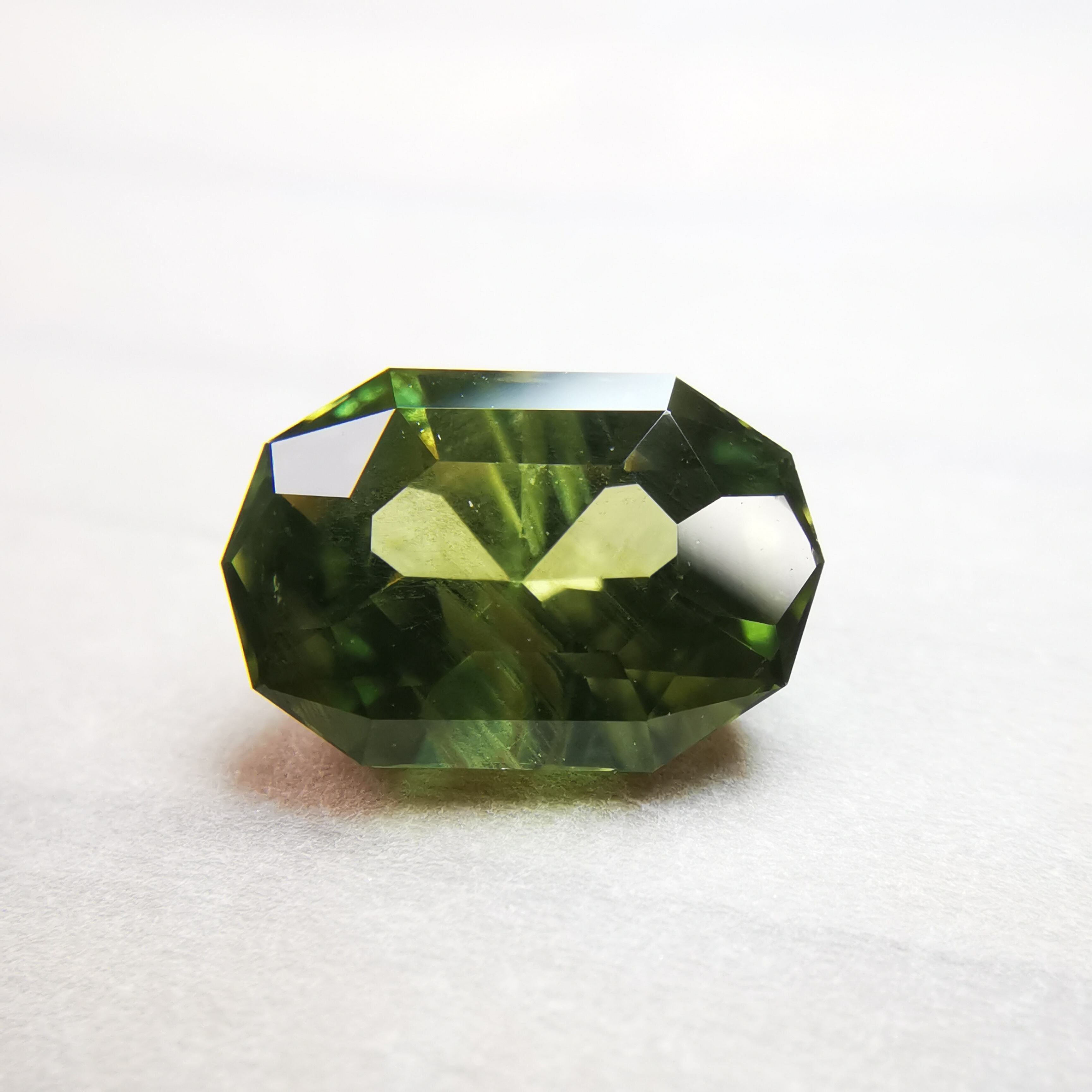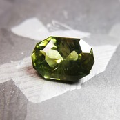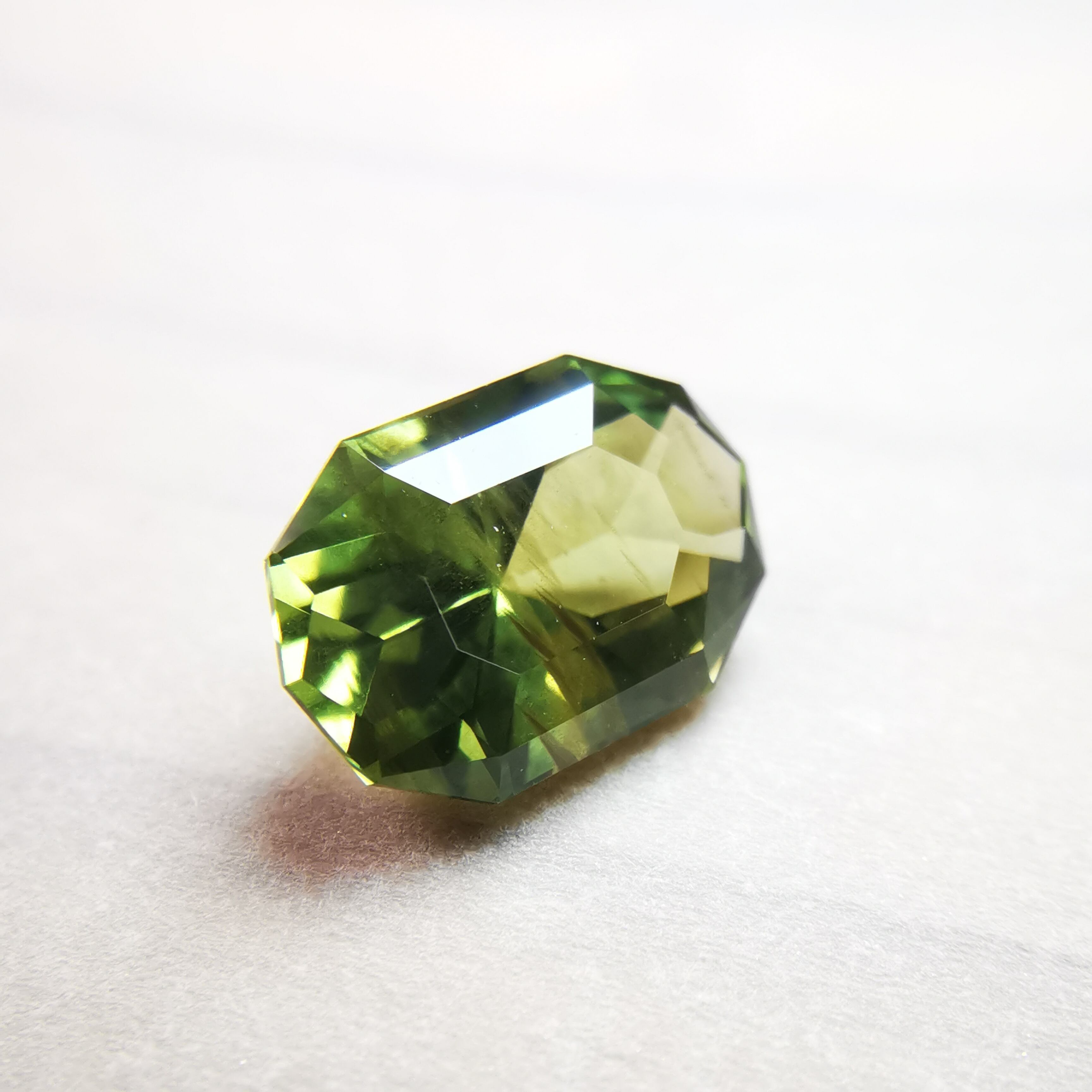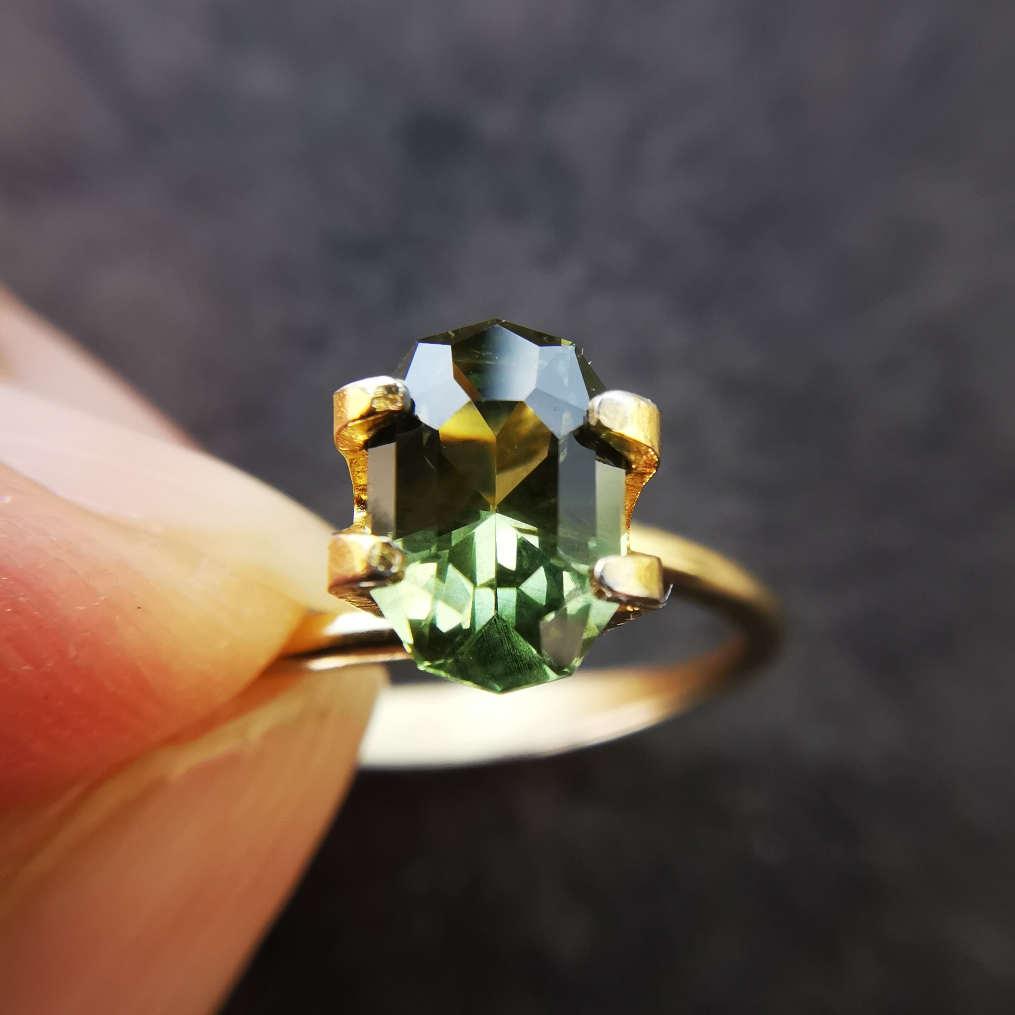 くすんだ黄緑/松葉色のサファイアから爽やかな黄緑の輝きがこぼれます。