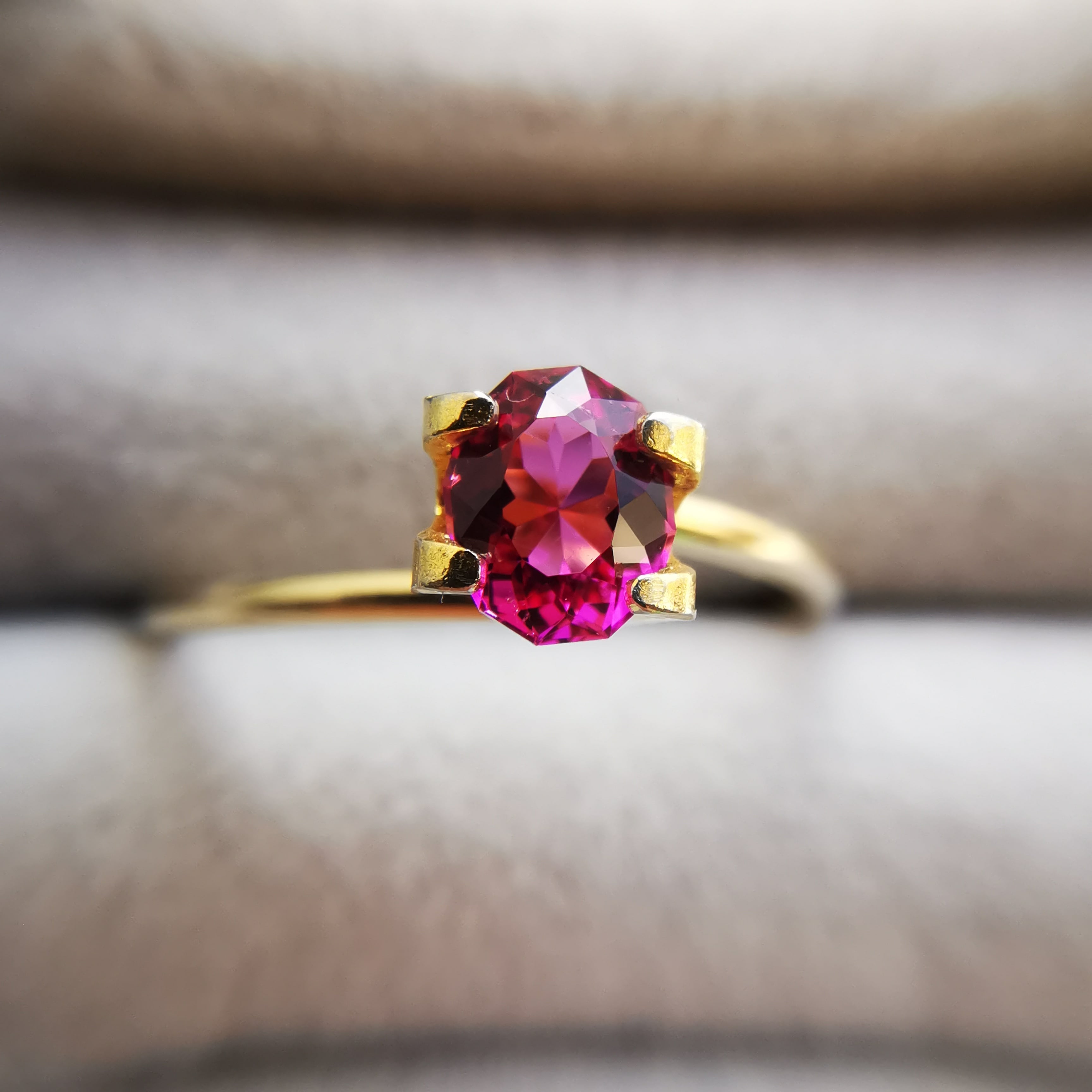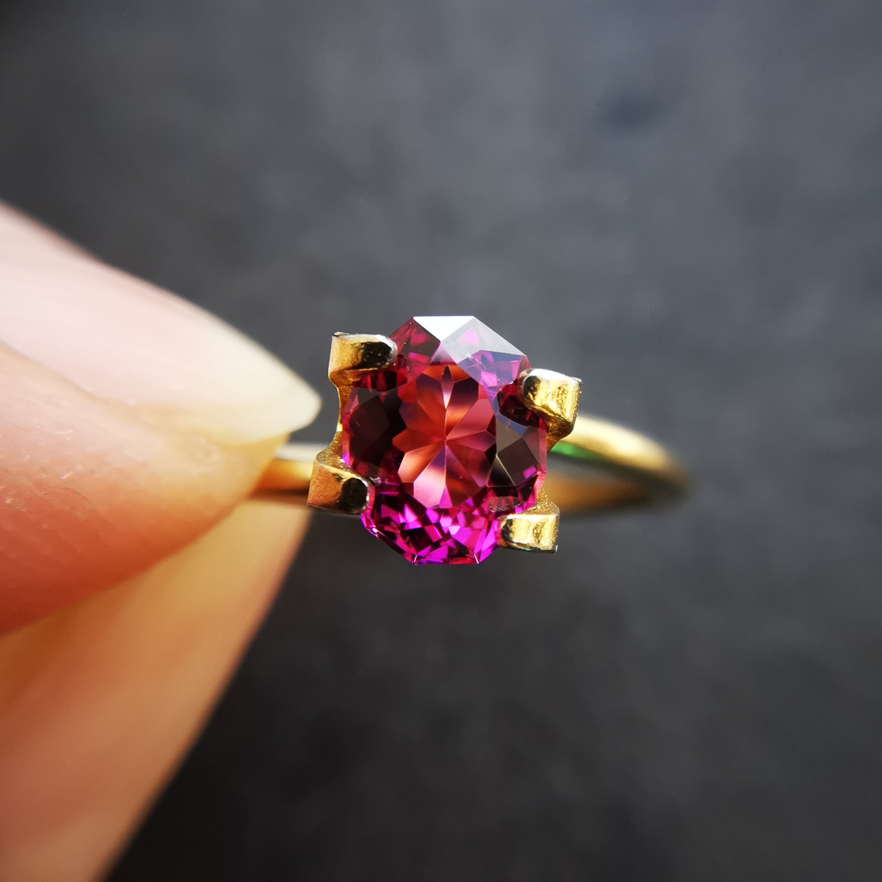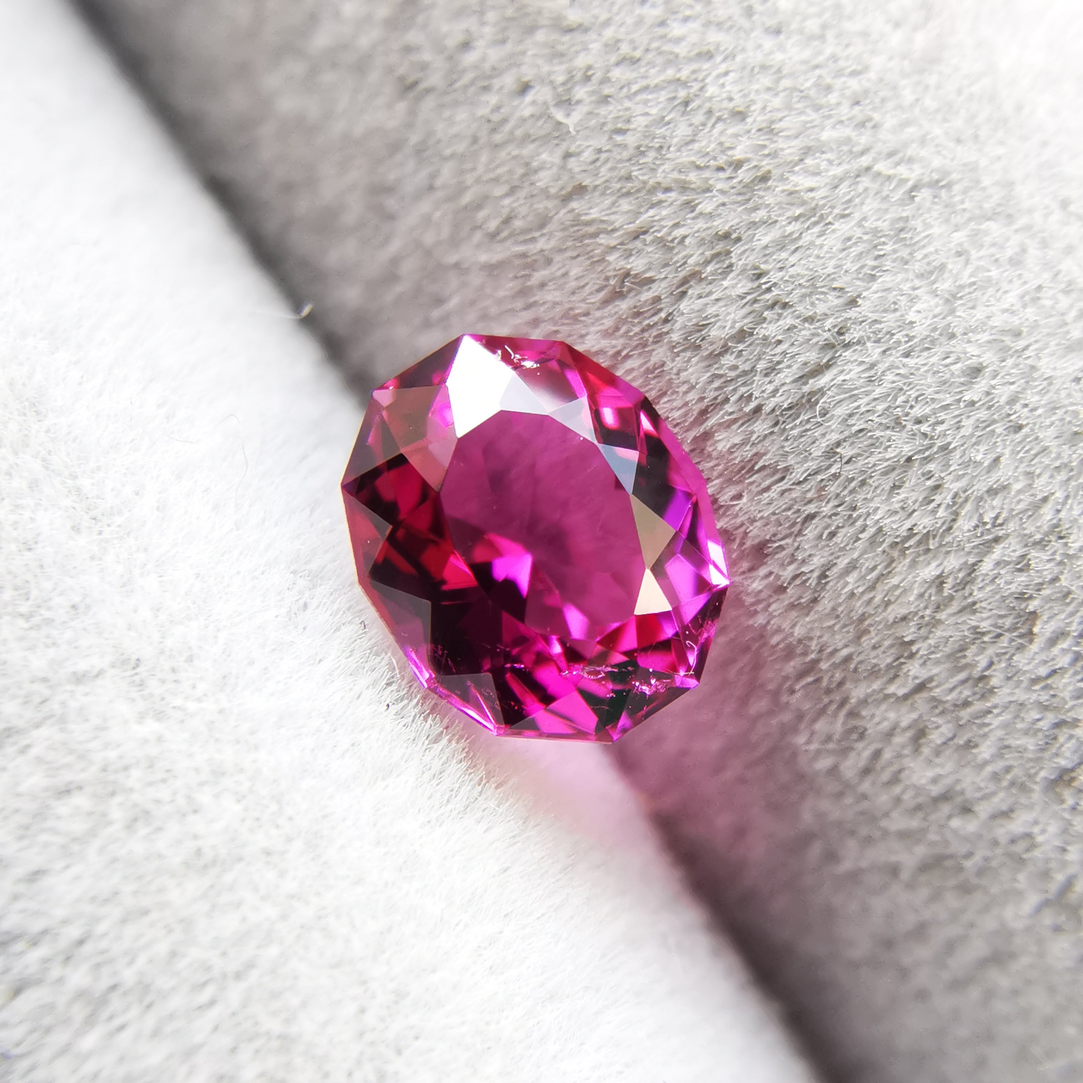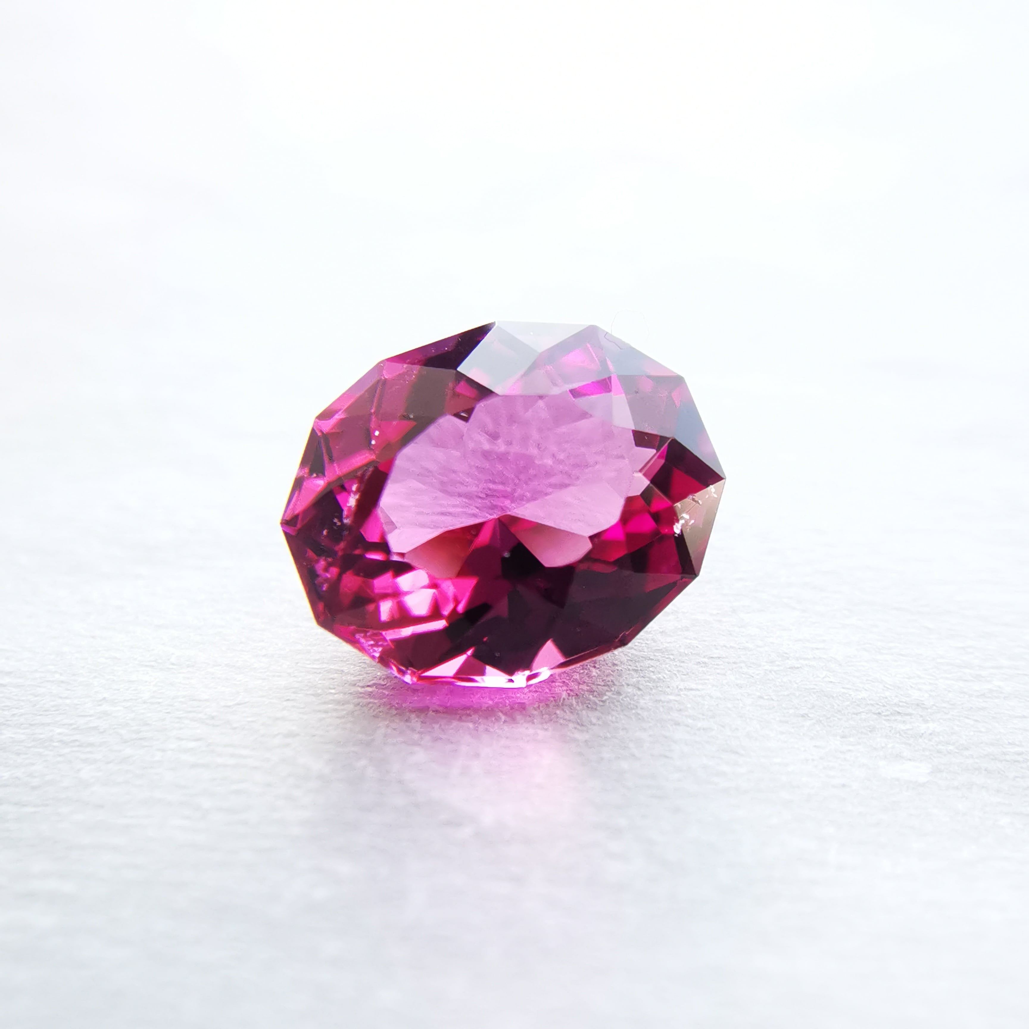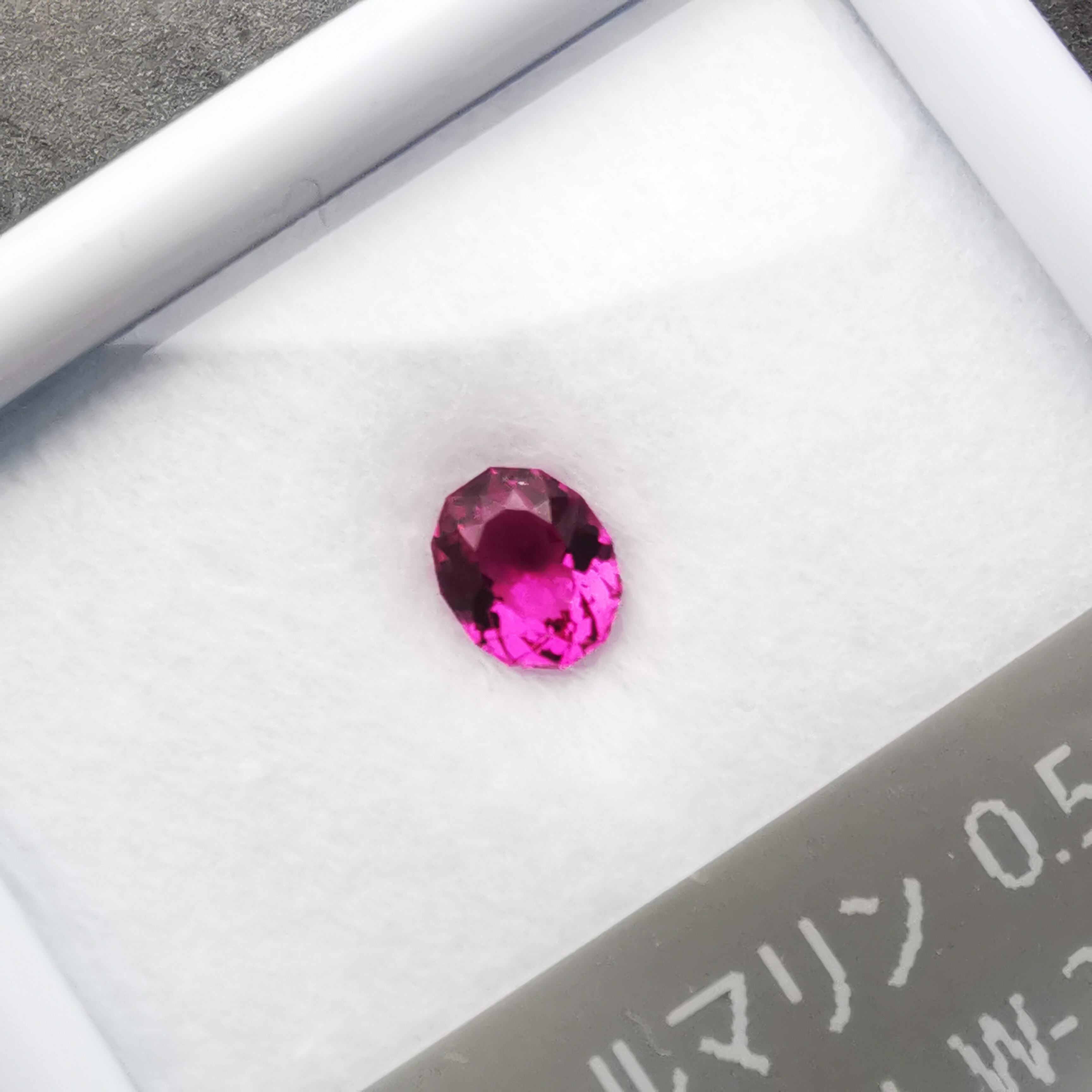 一見、ルビーかと思うような鮮やかなピンクですが、ルビーのような色の強烈さよりも、うるうると繊細なきらめきが印象に残るところに、トルマリンらしさが表れています。