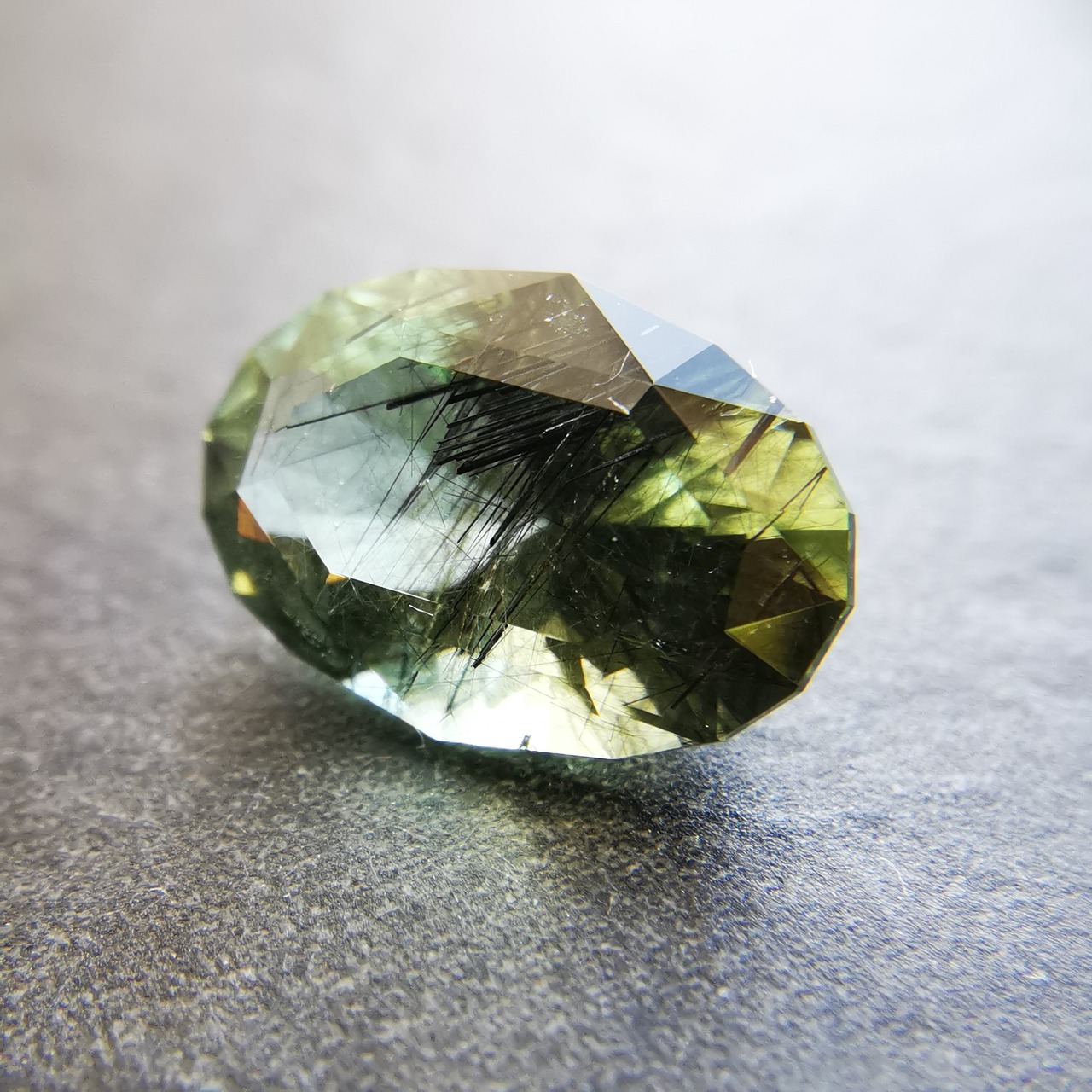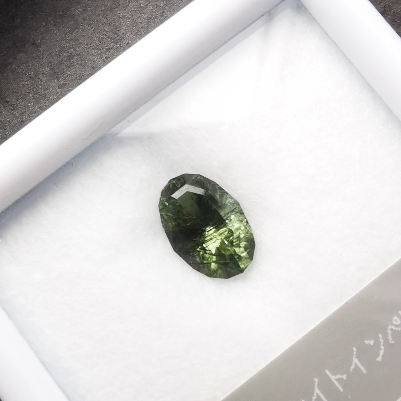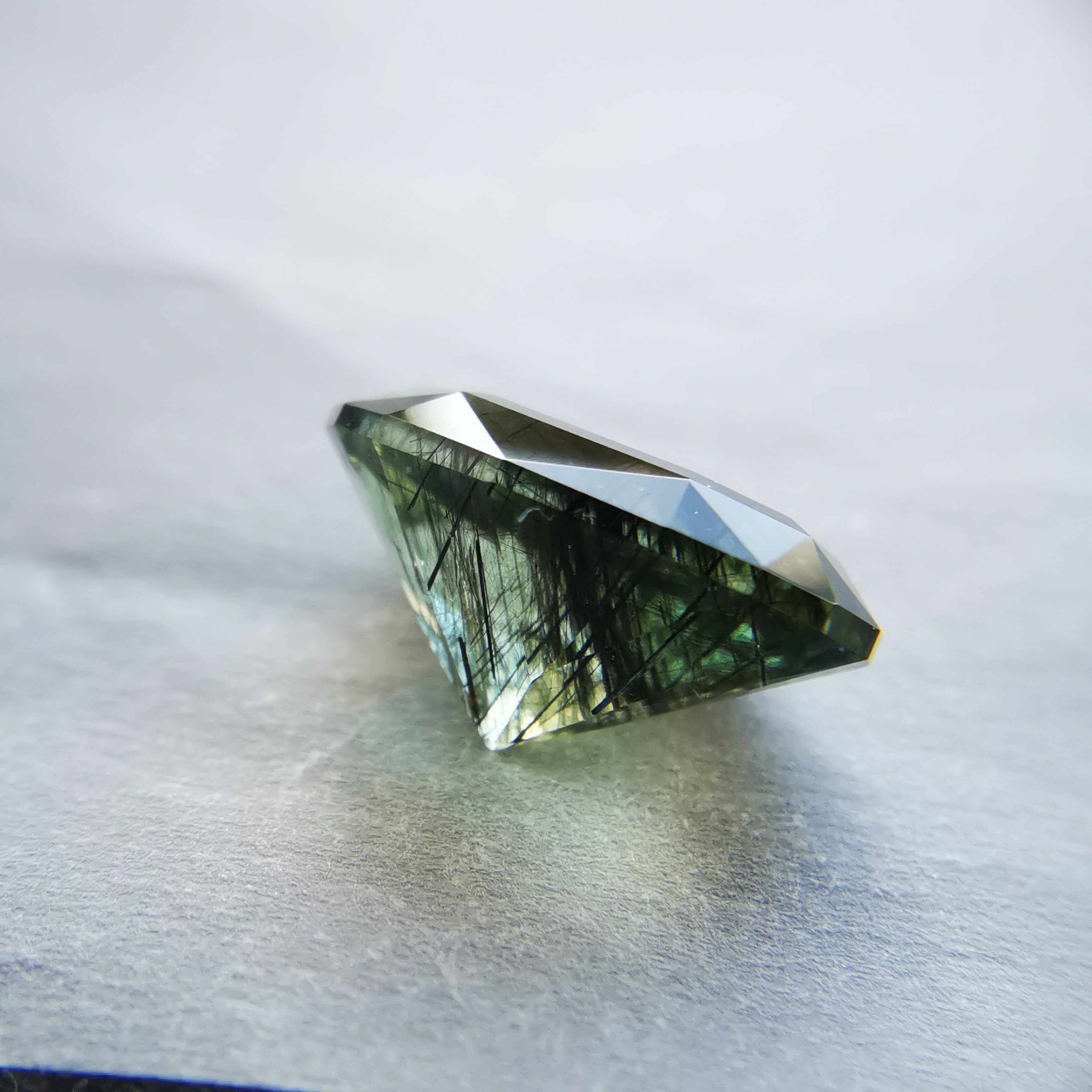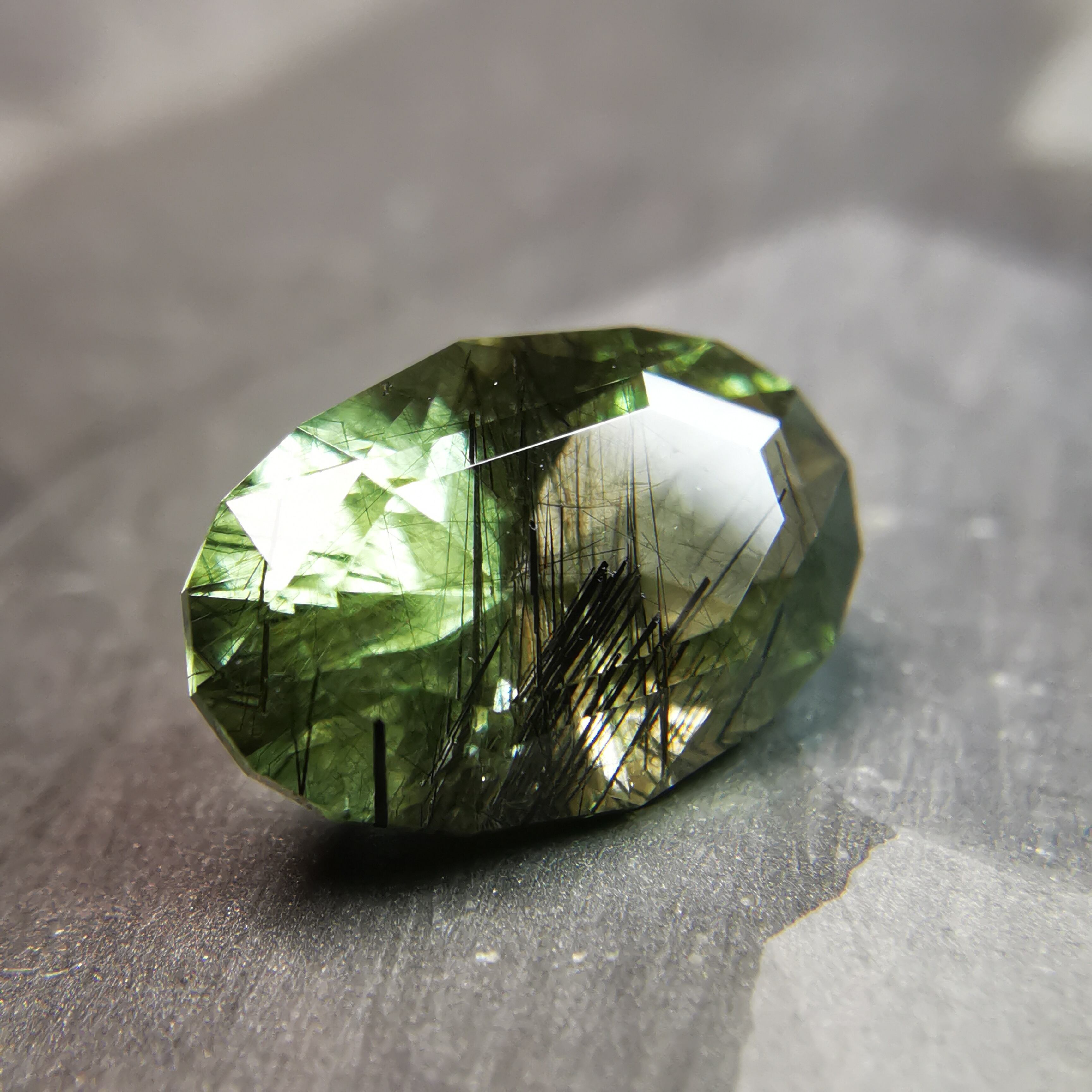 帯のように石の中程にインクルージョンが集まっていて、中心部は黒く、両端からは落ち着いたグリーンのきらめきが黒い針の隙間からこぼれてきます。