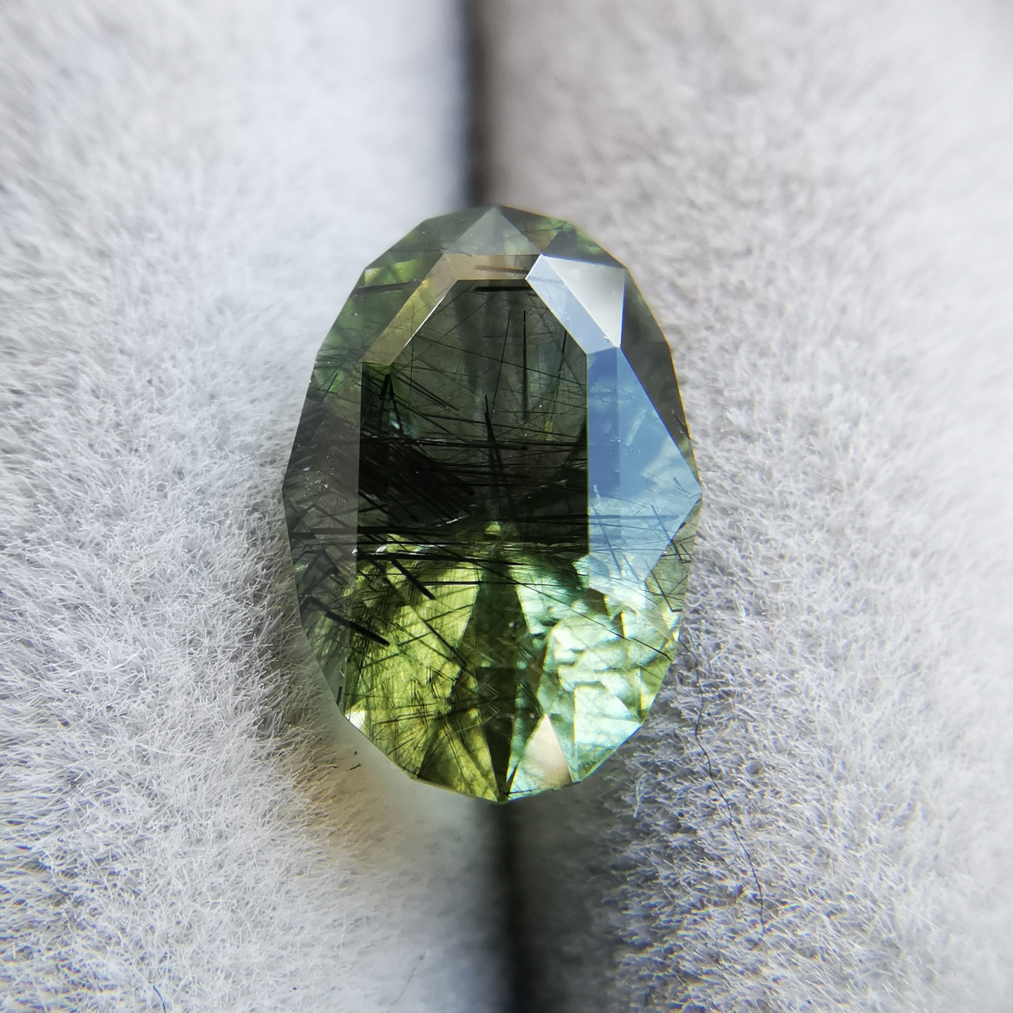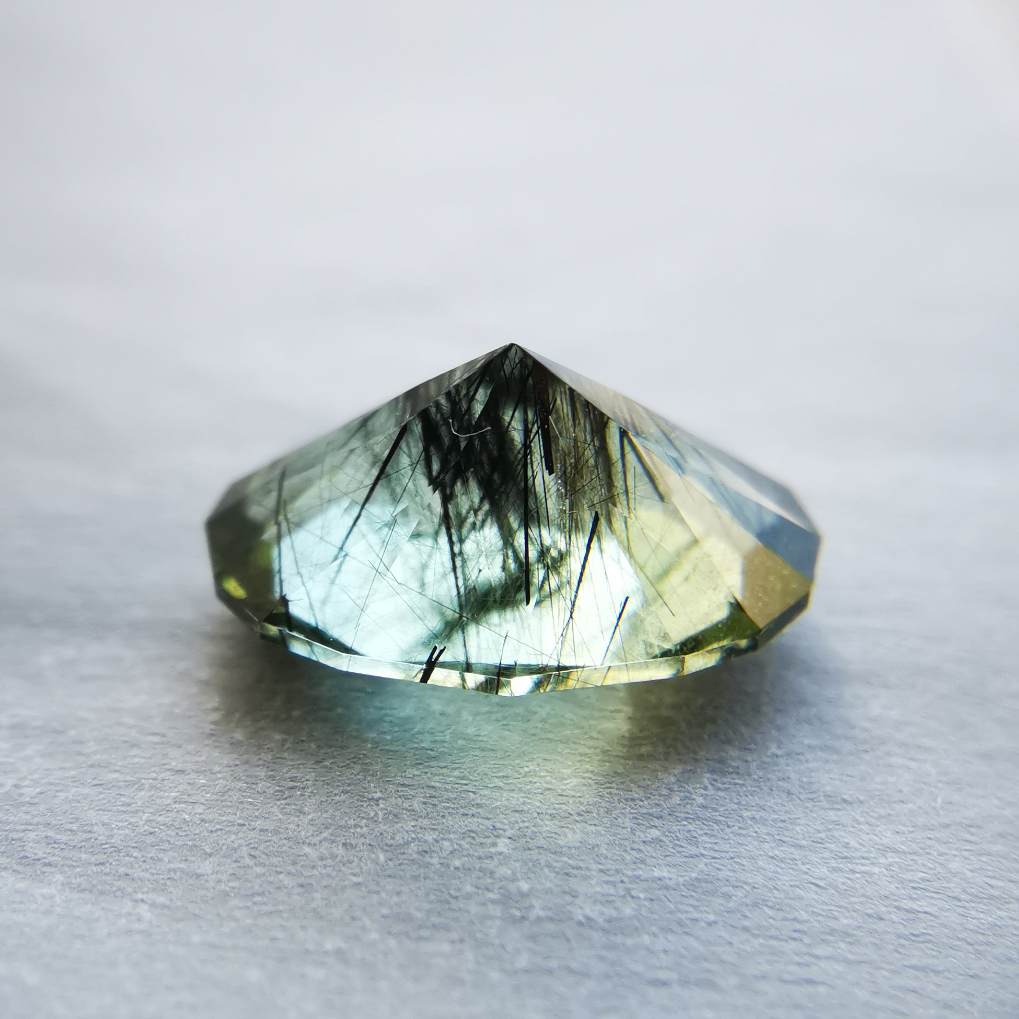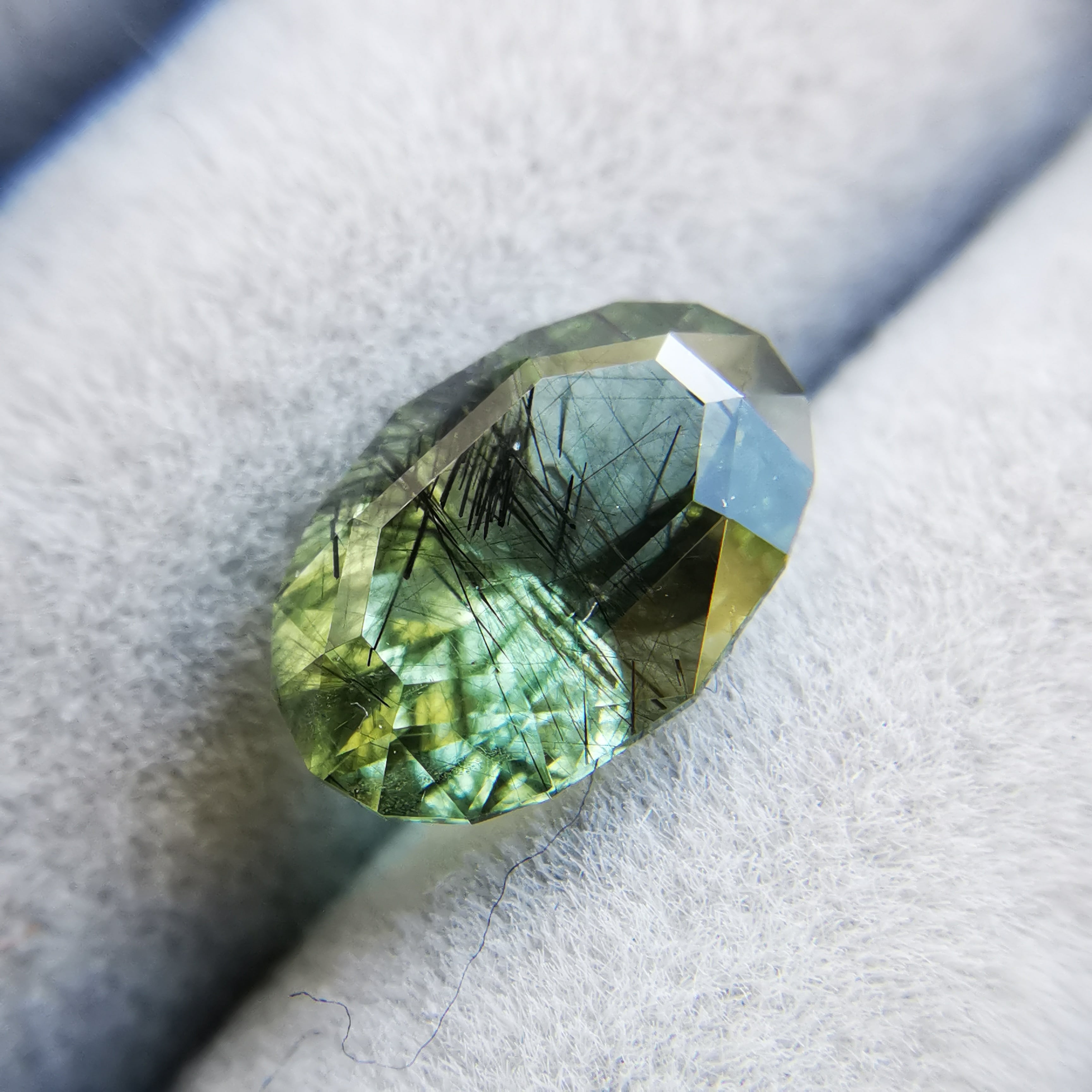 帯のように石の中程にインクルージョンが集まっていて、中心部は黒く、両端からは落ち着いたグリーンのきらめきが黒い針の隙間からこぼれてきます。