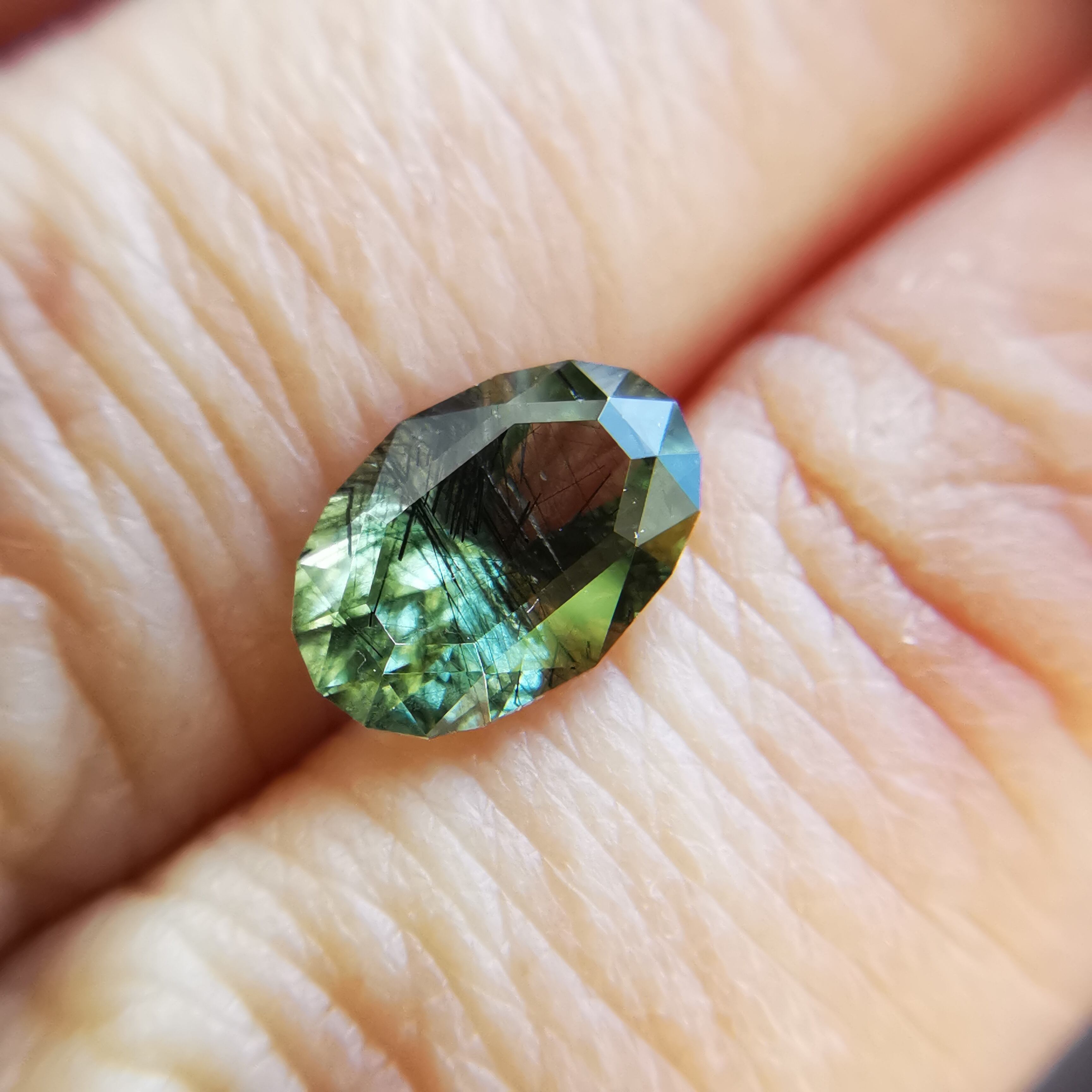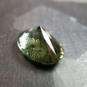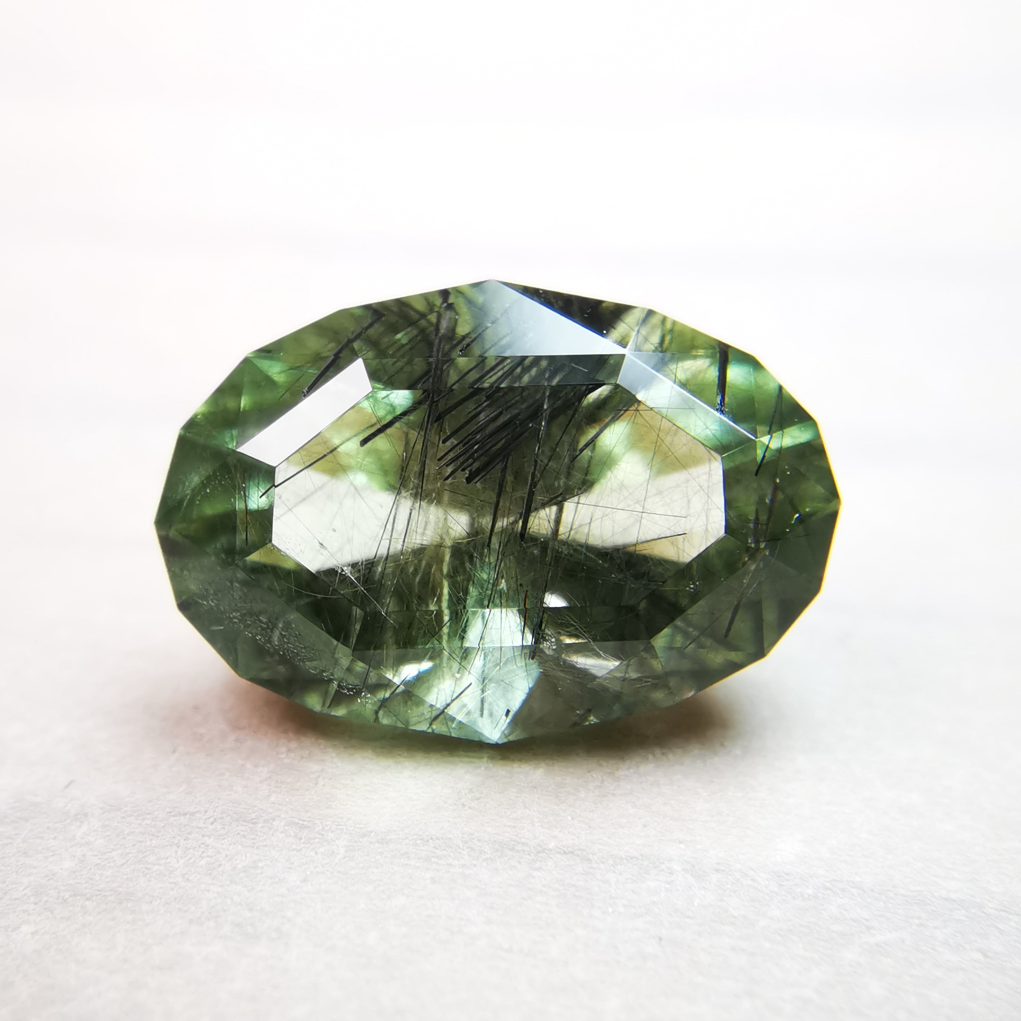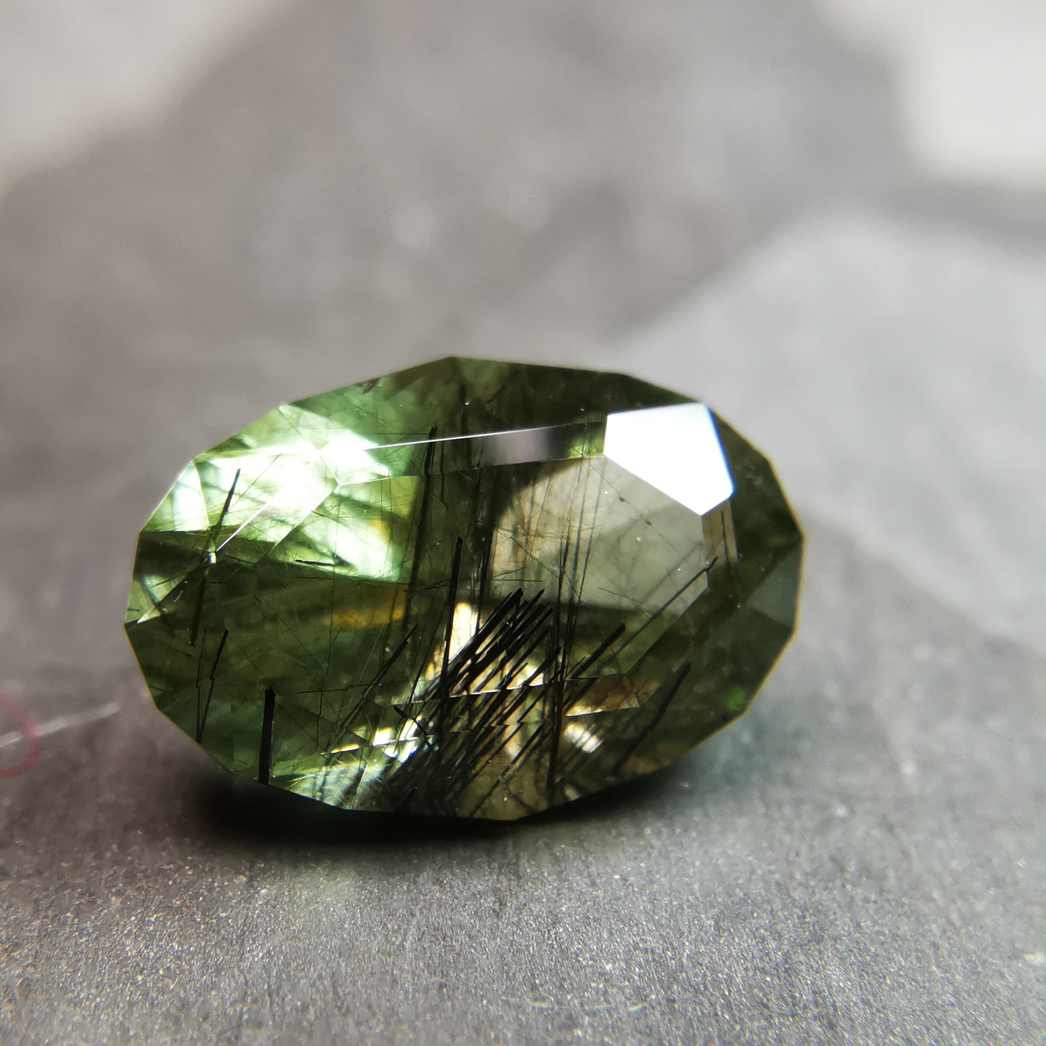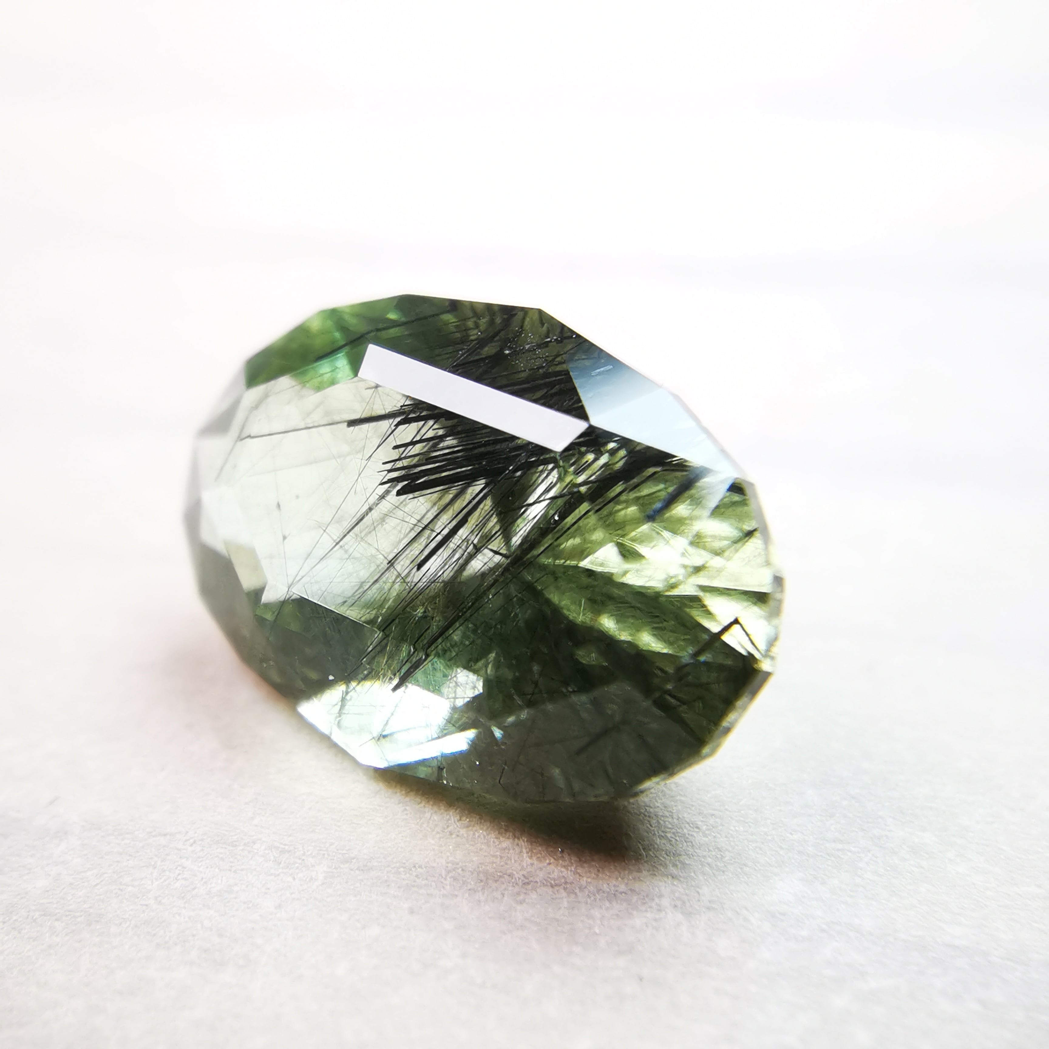 帯のように石の中程にインクルージョンが集まっていて、中心部は黒く、両端からは落ち着いたグリーンのきらめきが黒い針の隙間からこぼれてきます。
