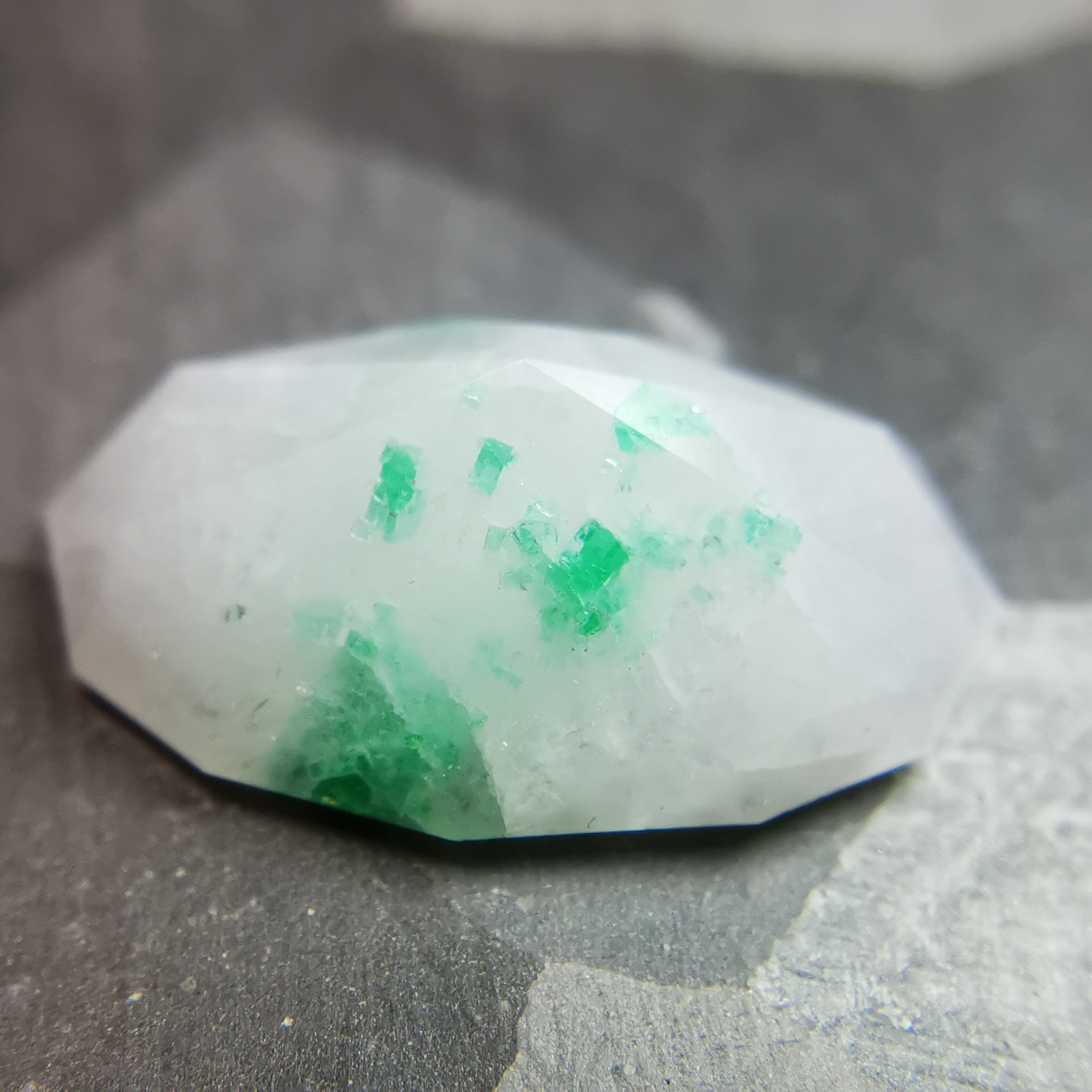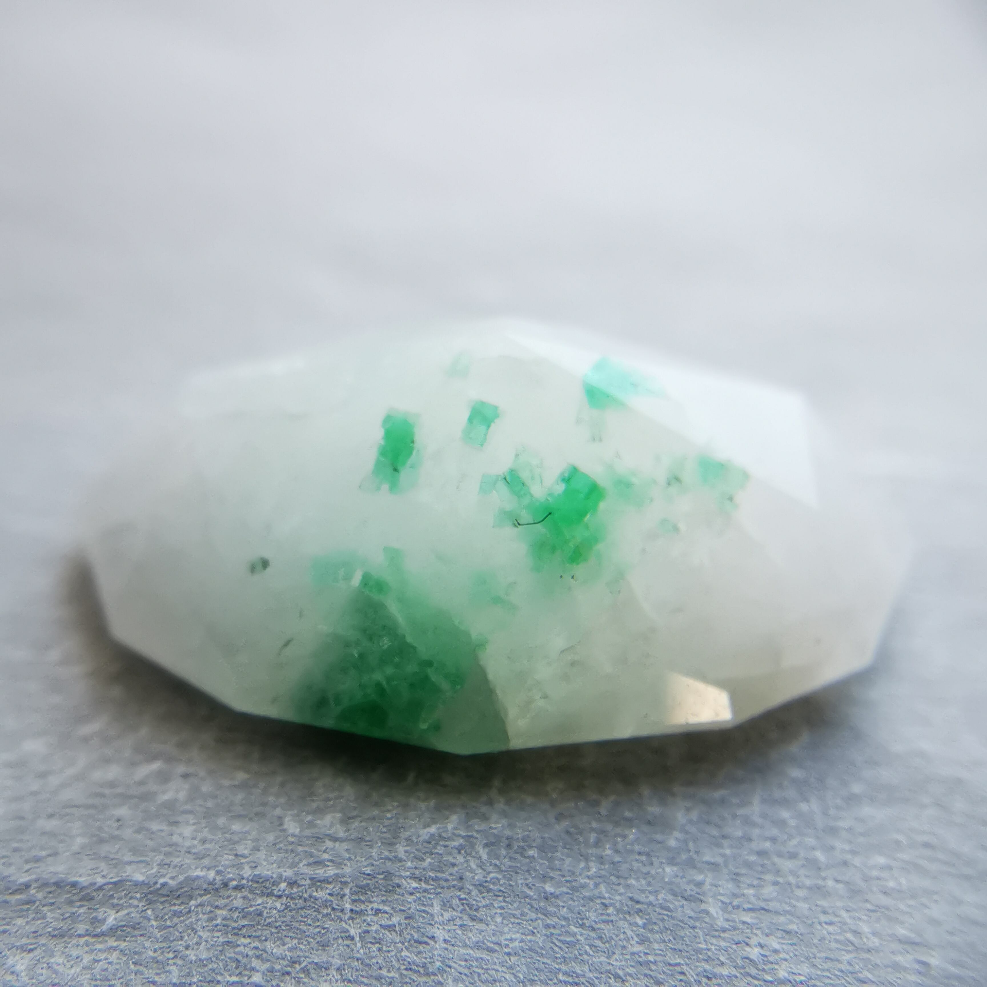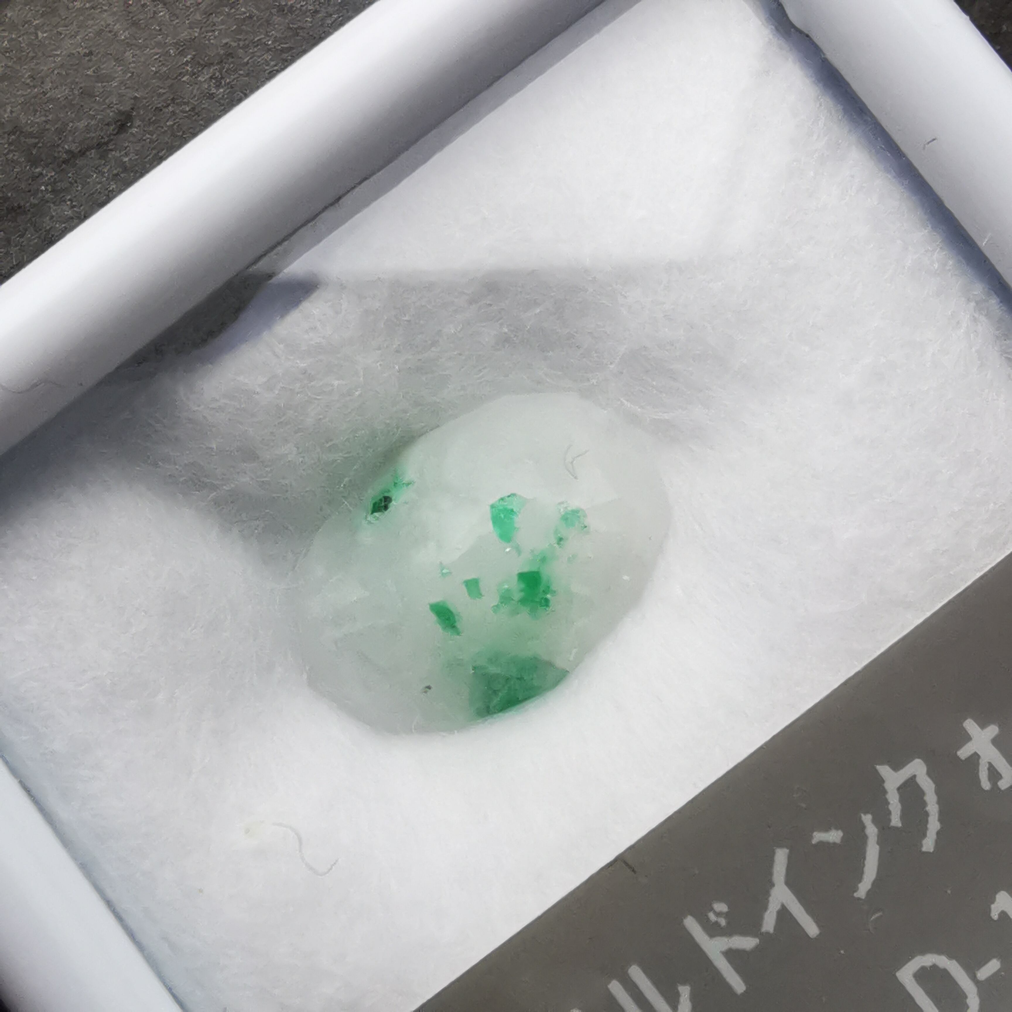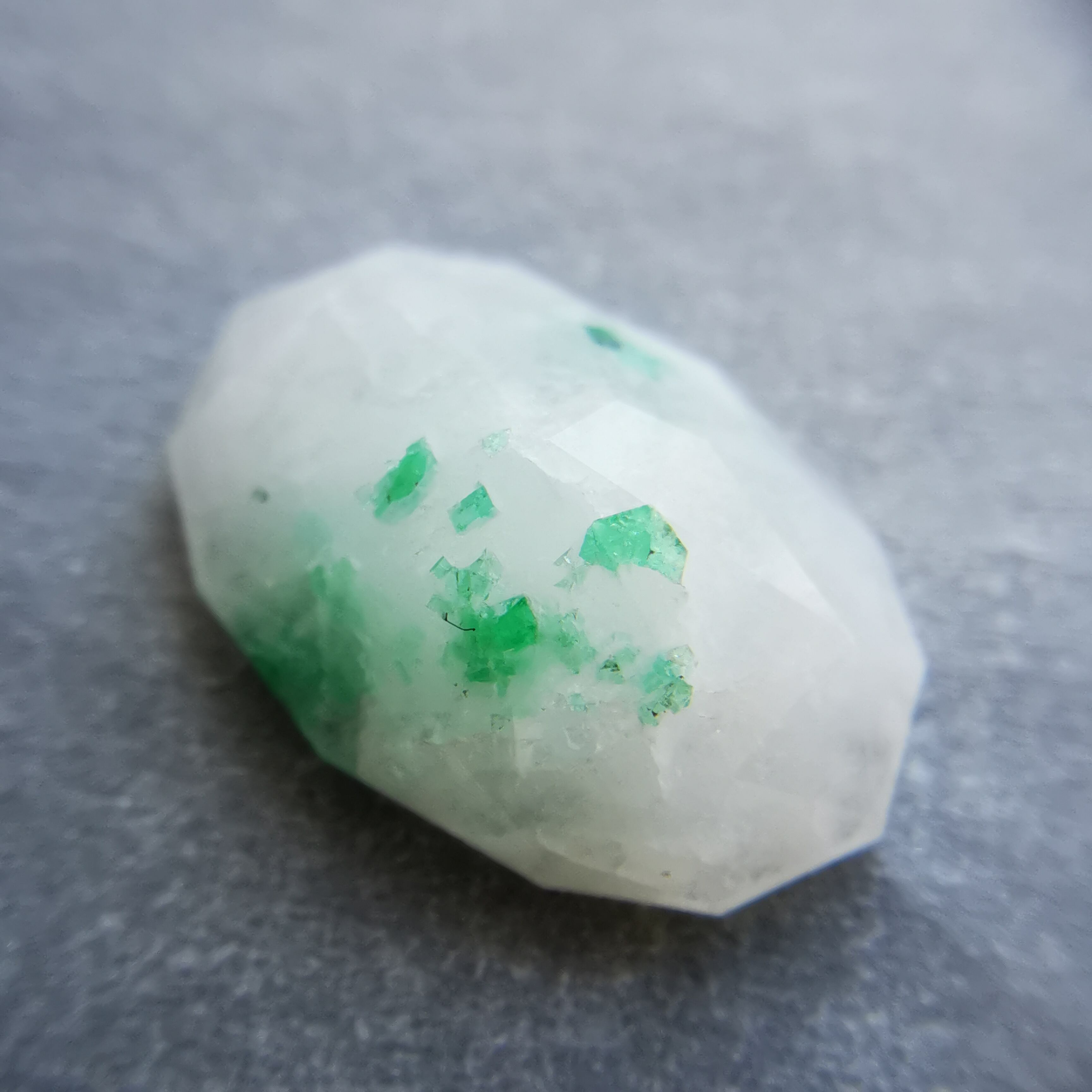 不透明な白いクォーツに、鮮やかなグリーンのエメラルドが散りばめられたエメラルドインクォーツです。