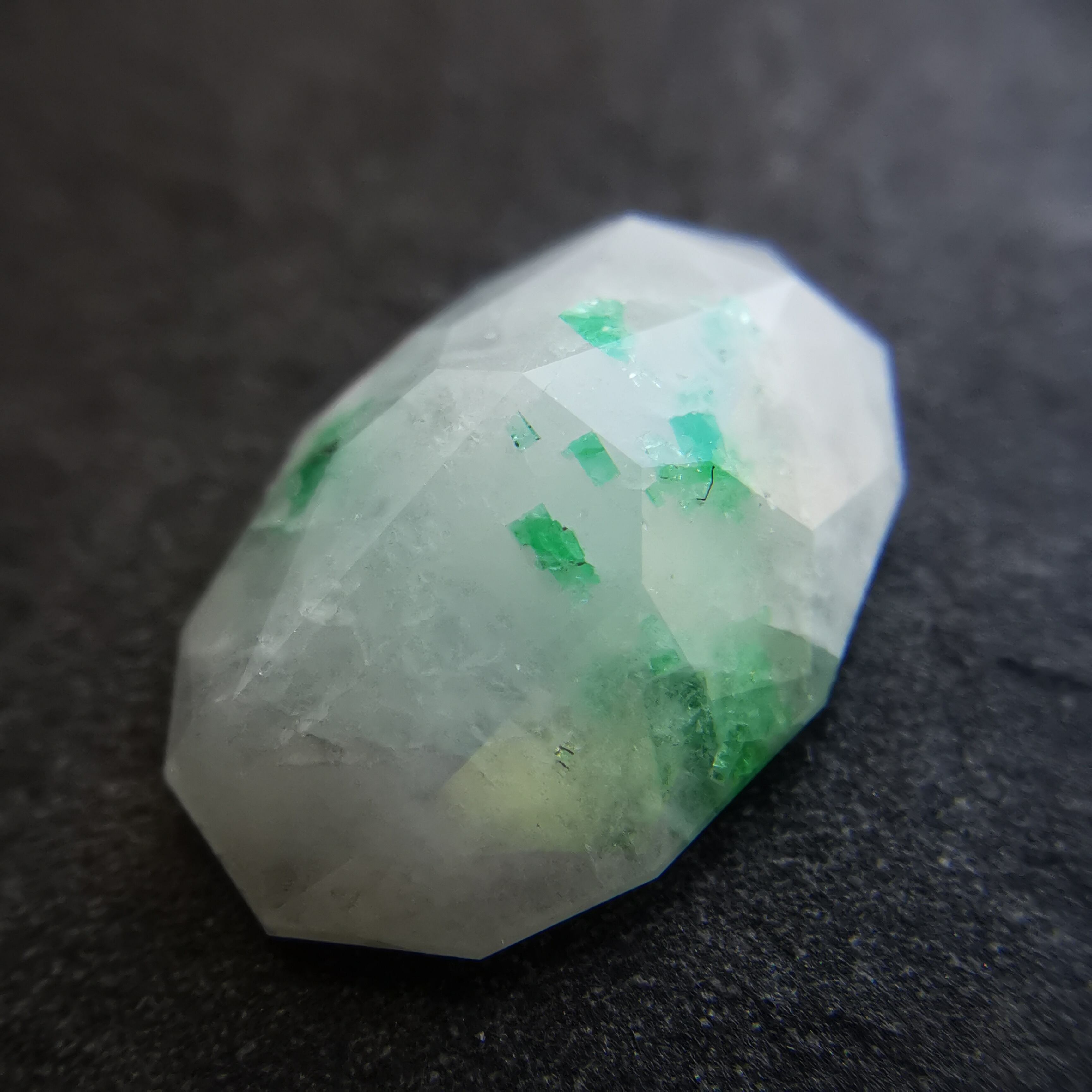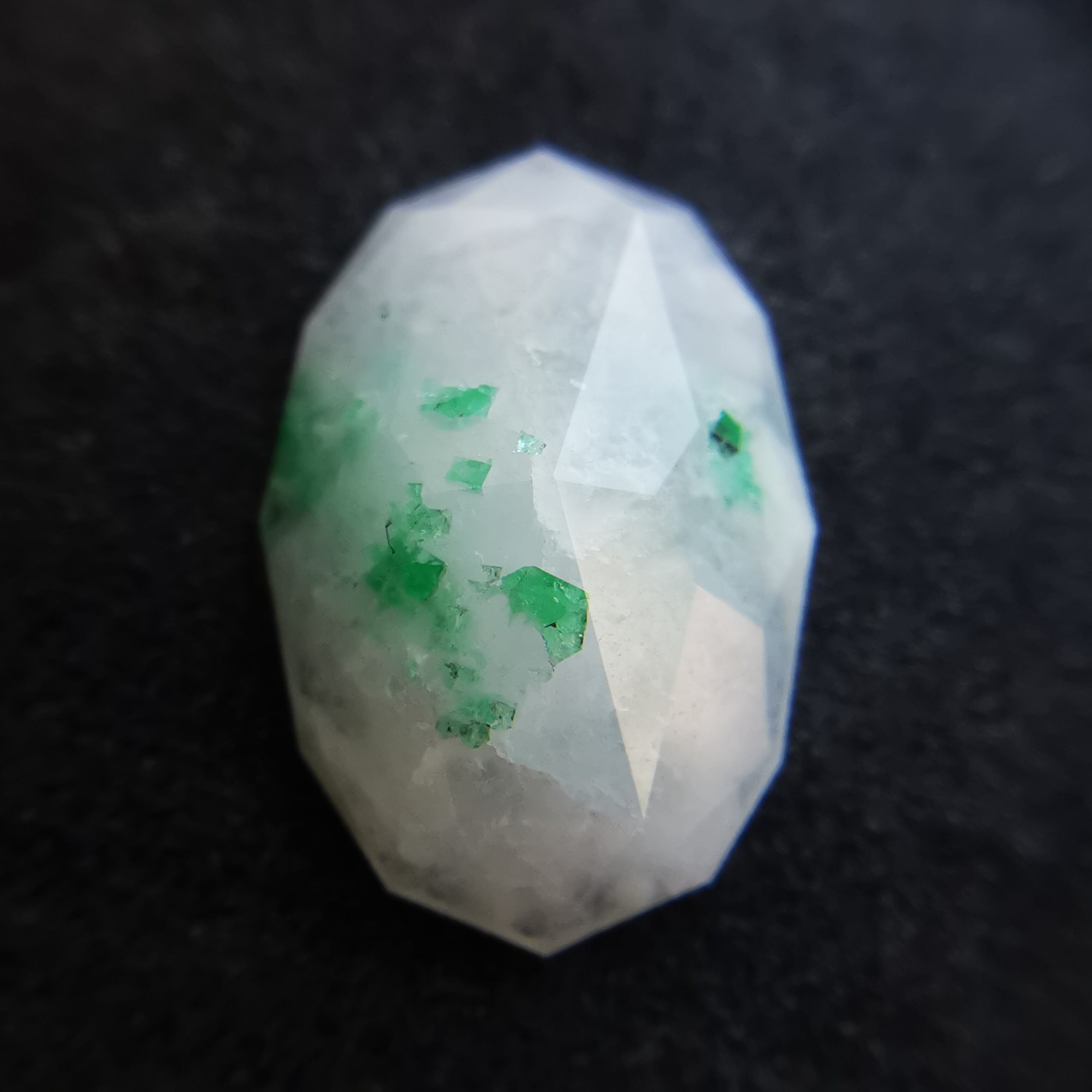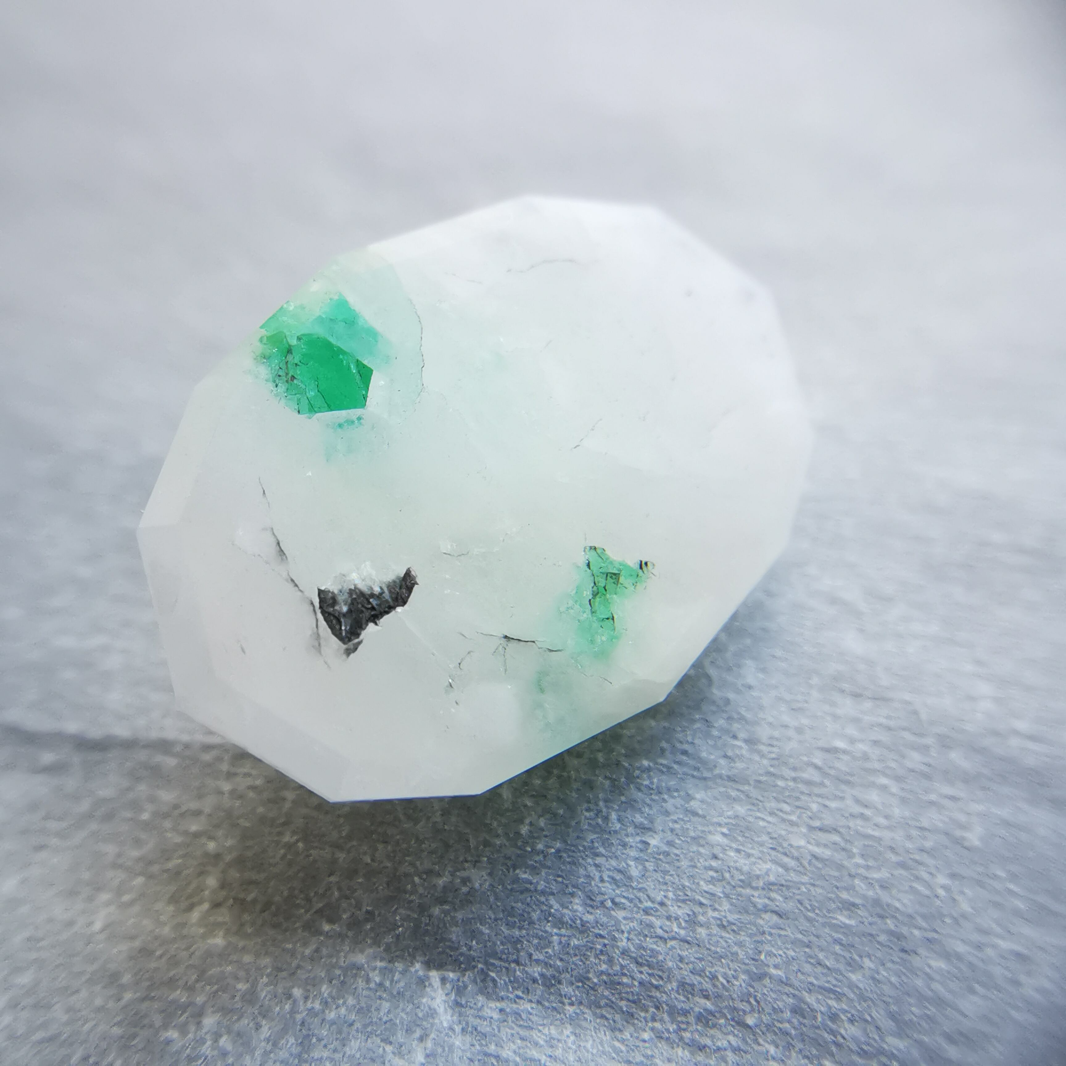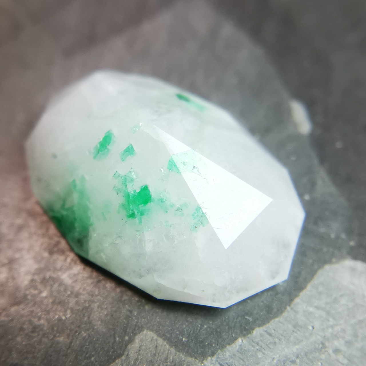 不透明な白いクォーツに、鮮やかなグリーンのエメラルドが散りばめられたエメラルドインクォーツです。