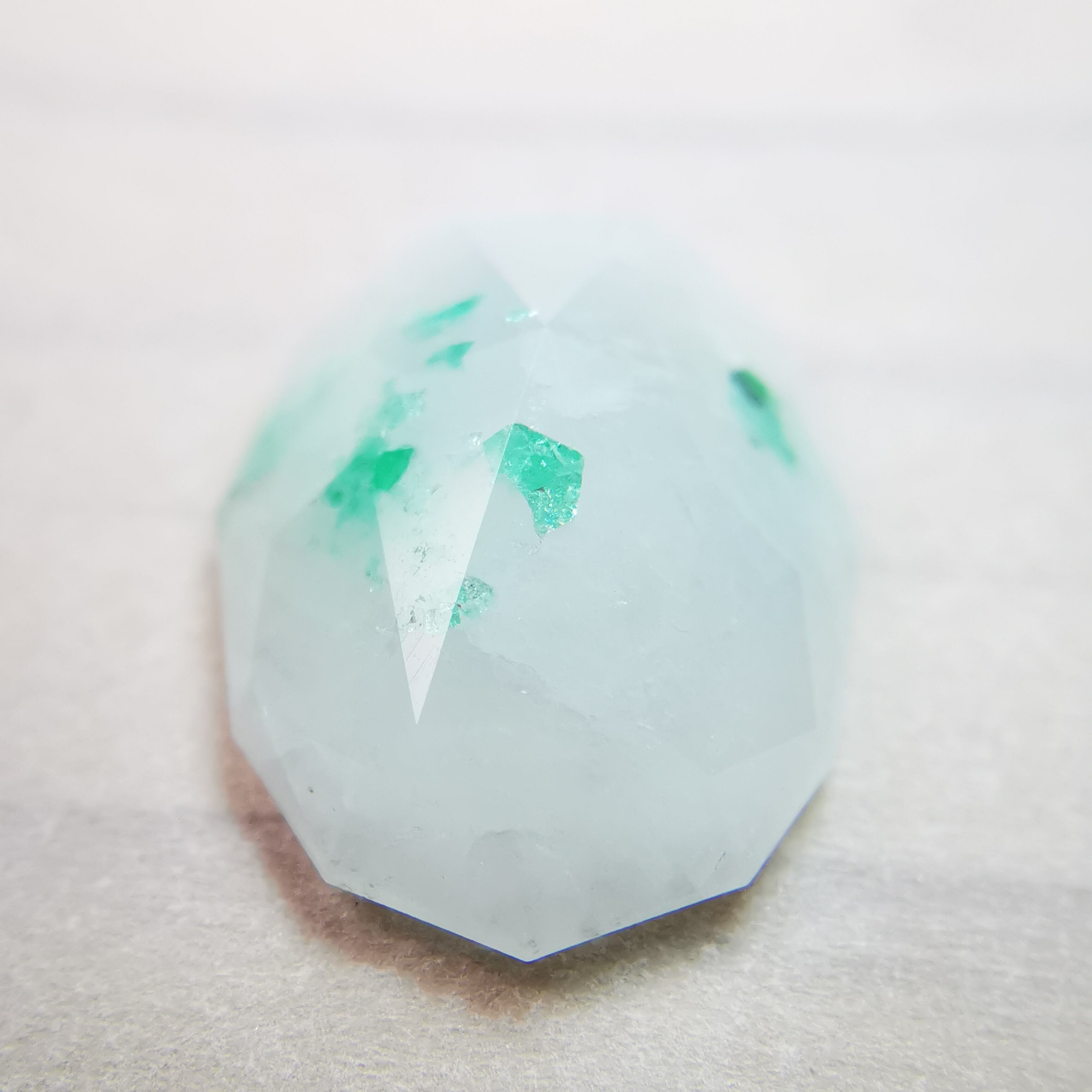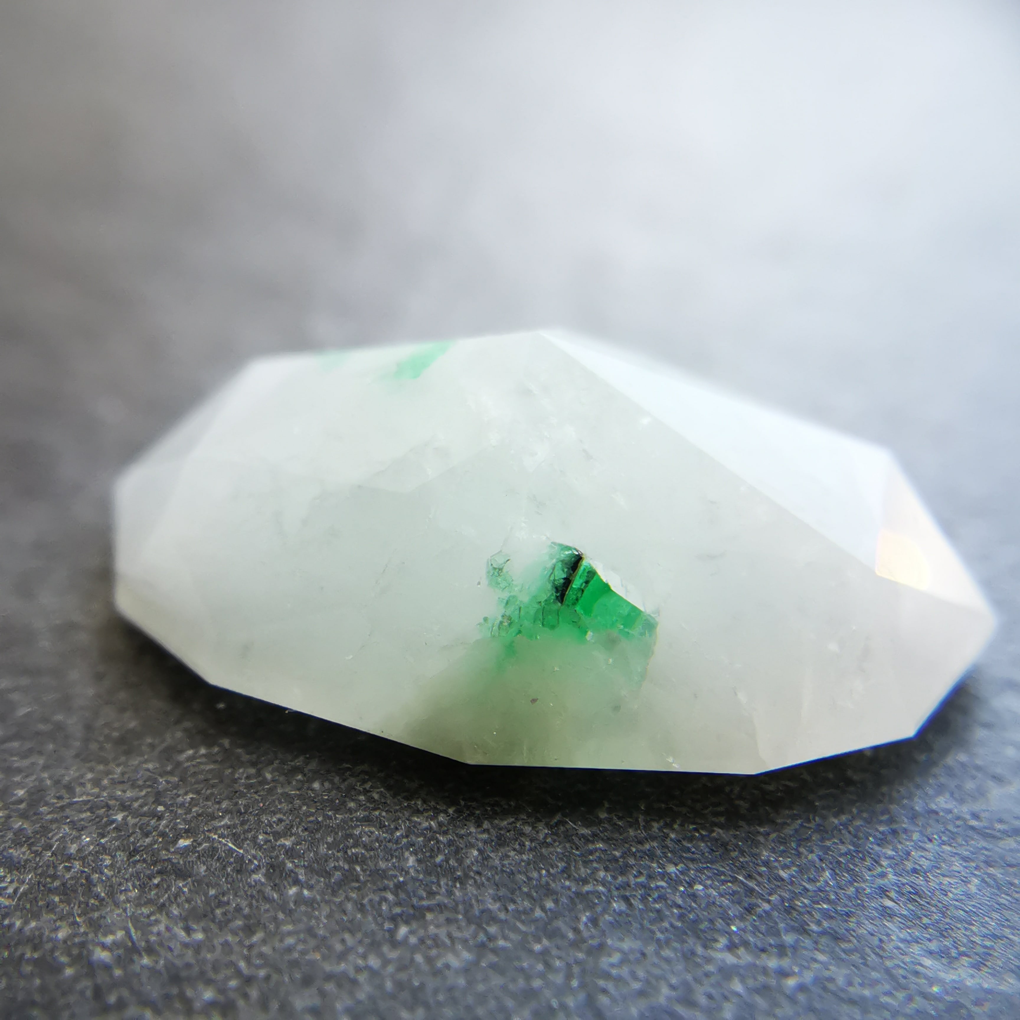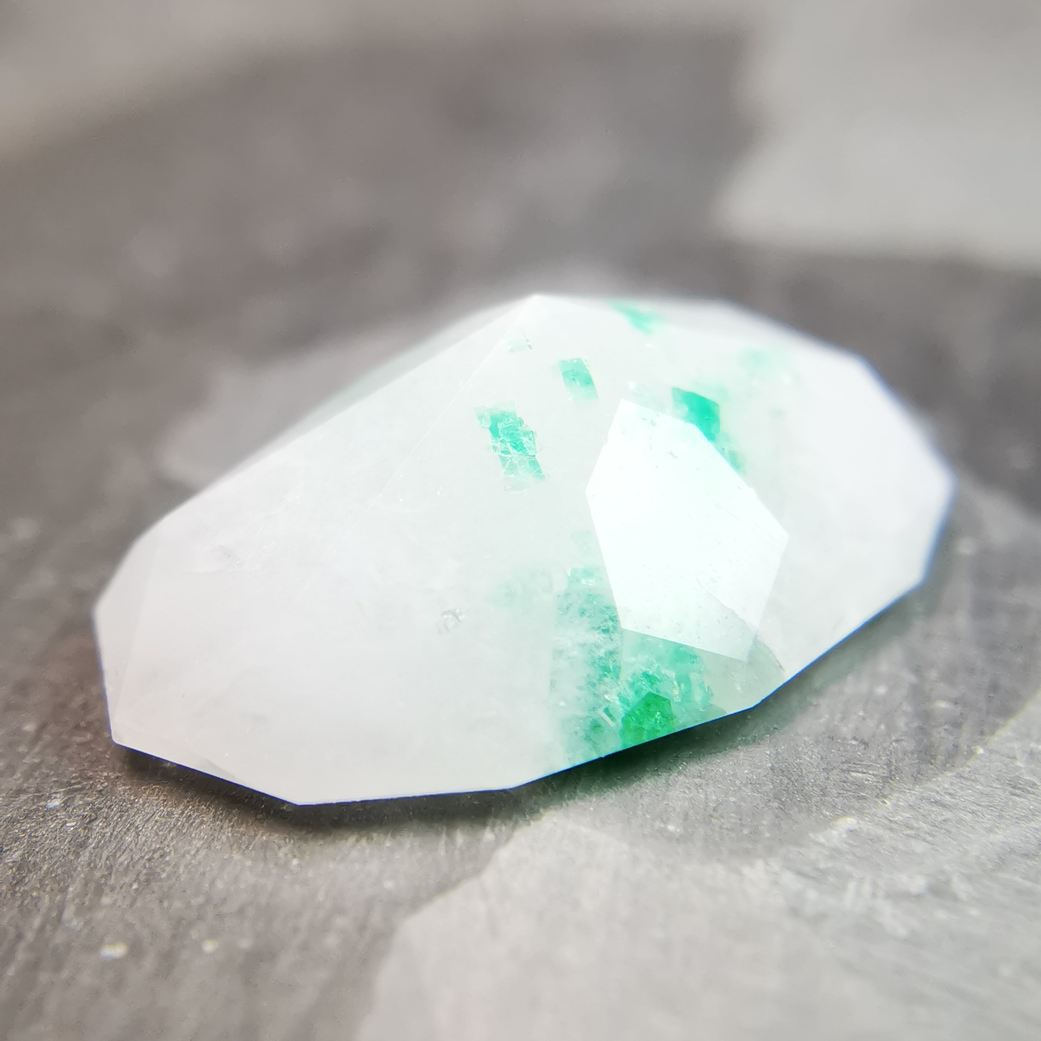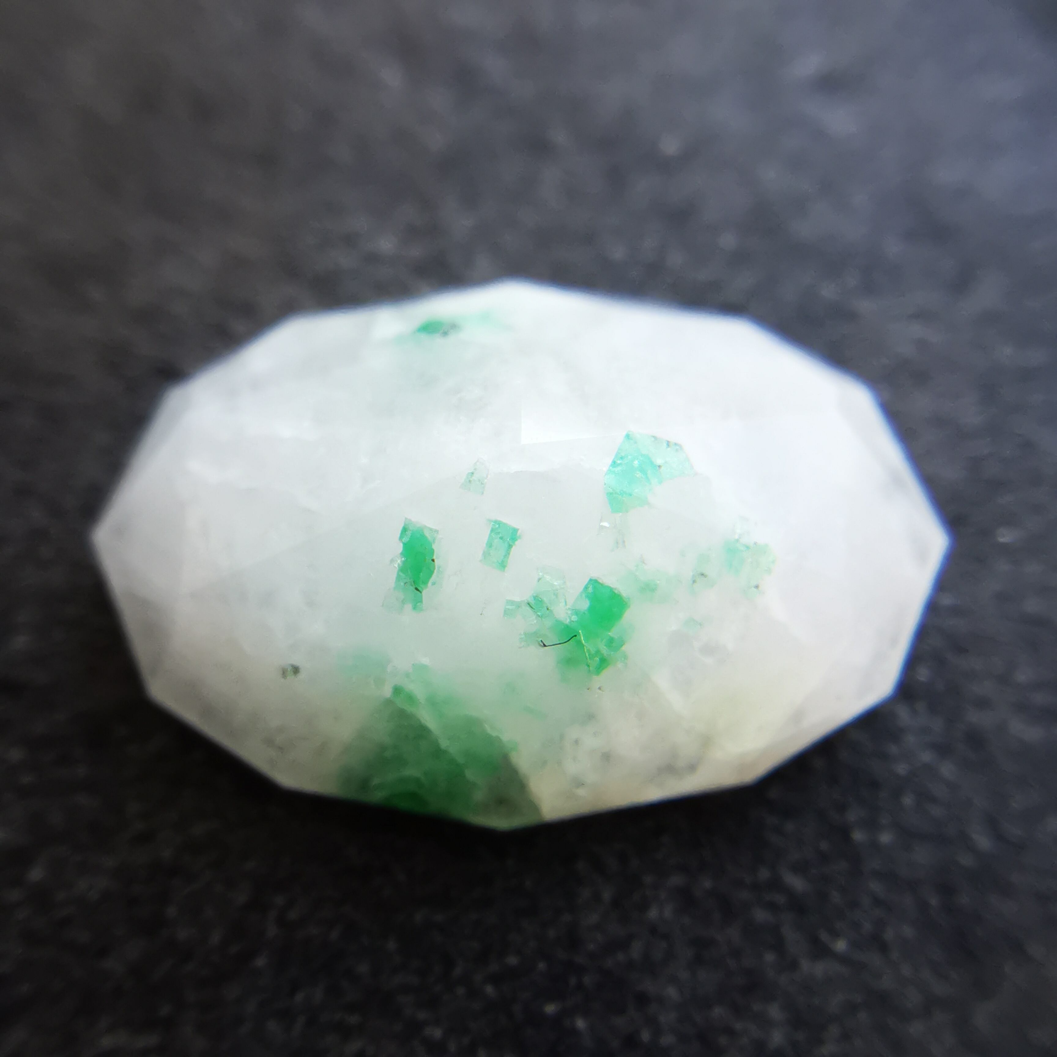 不透明な白いクォーツに、鮮やかなグリーンのエメラルドが散りばめられたエメラルドインクォーツです。