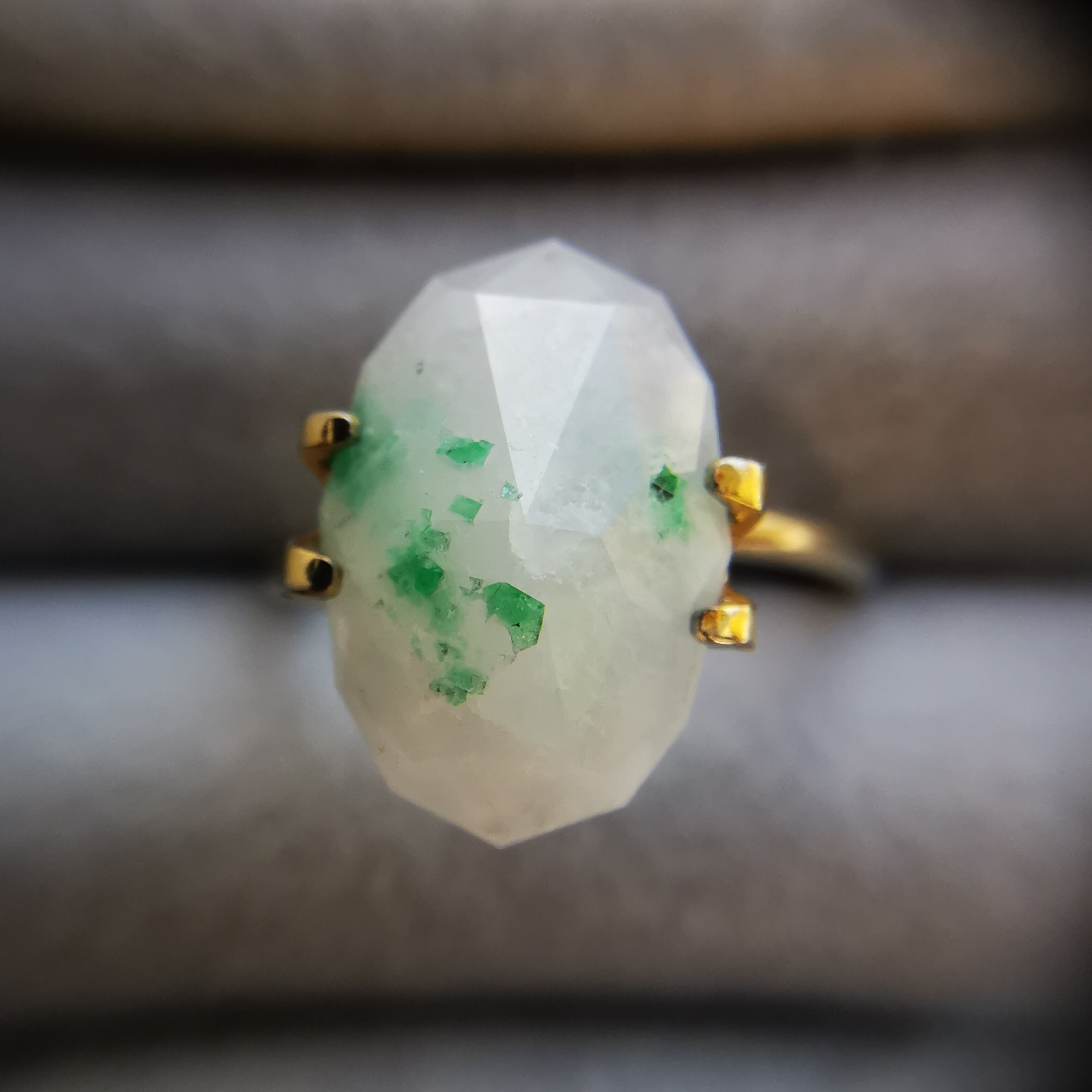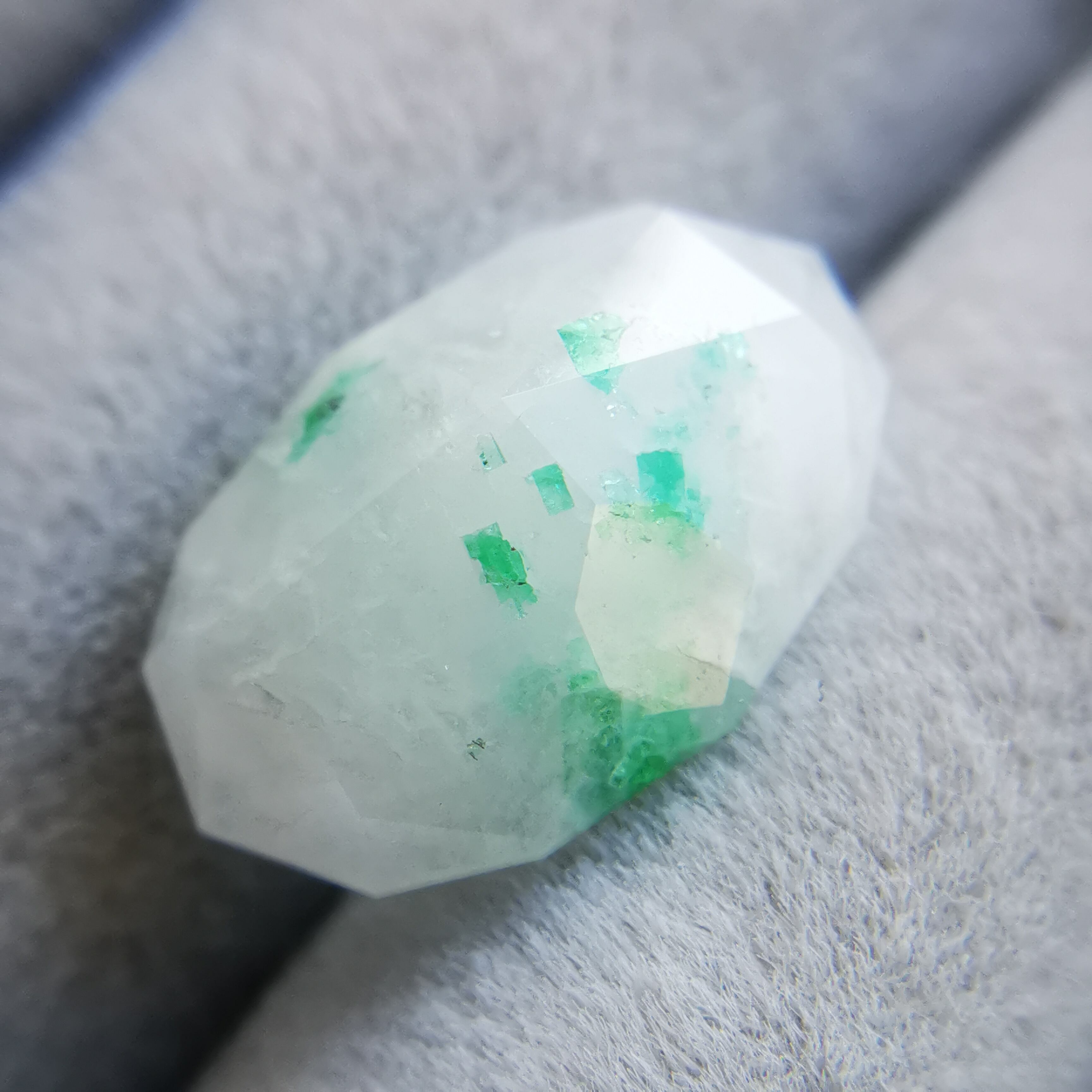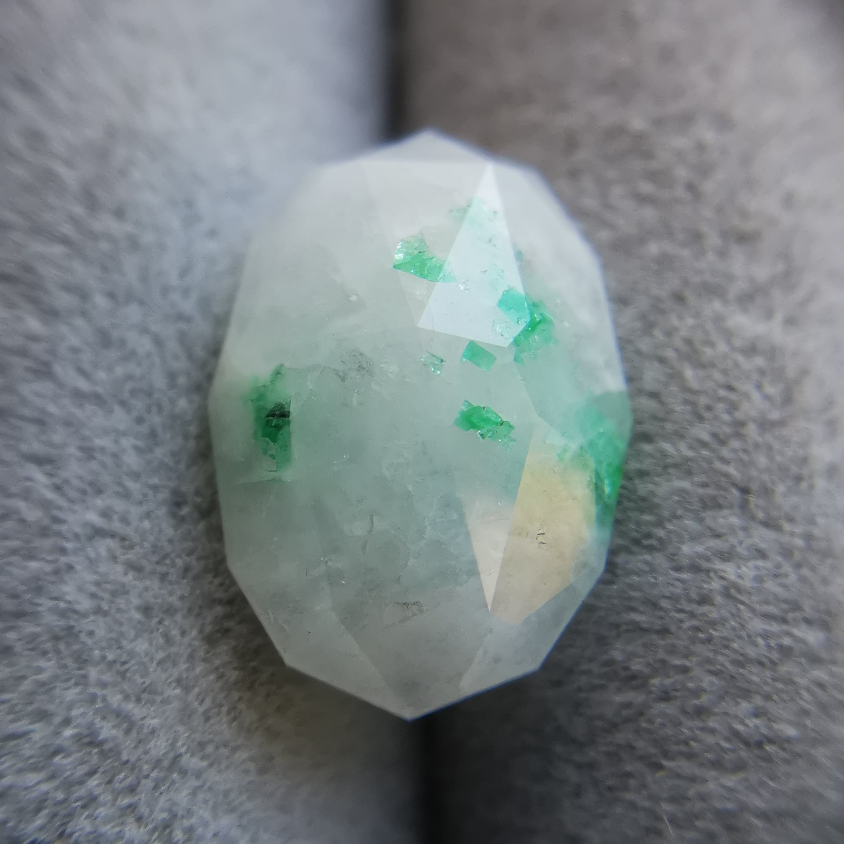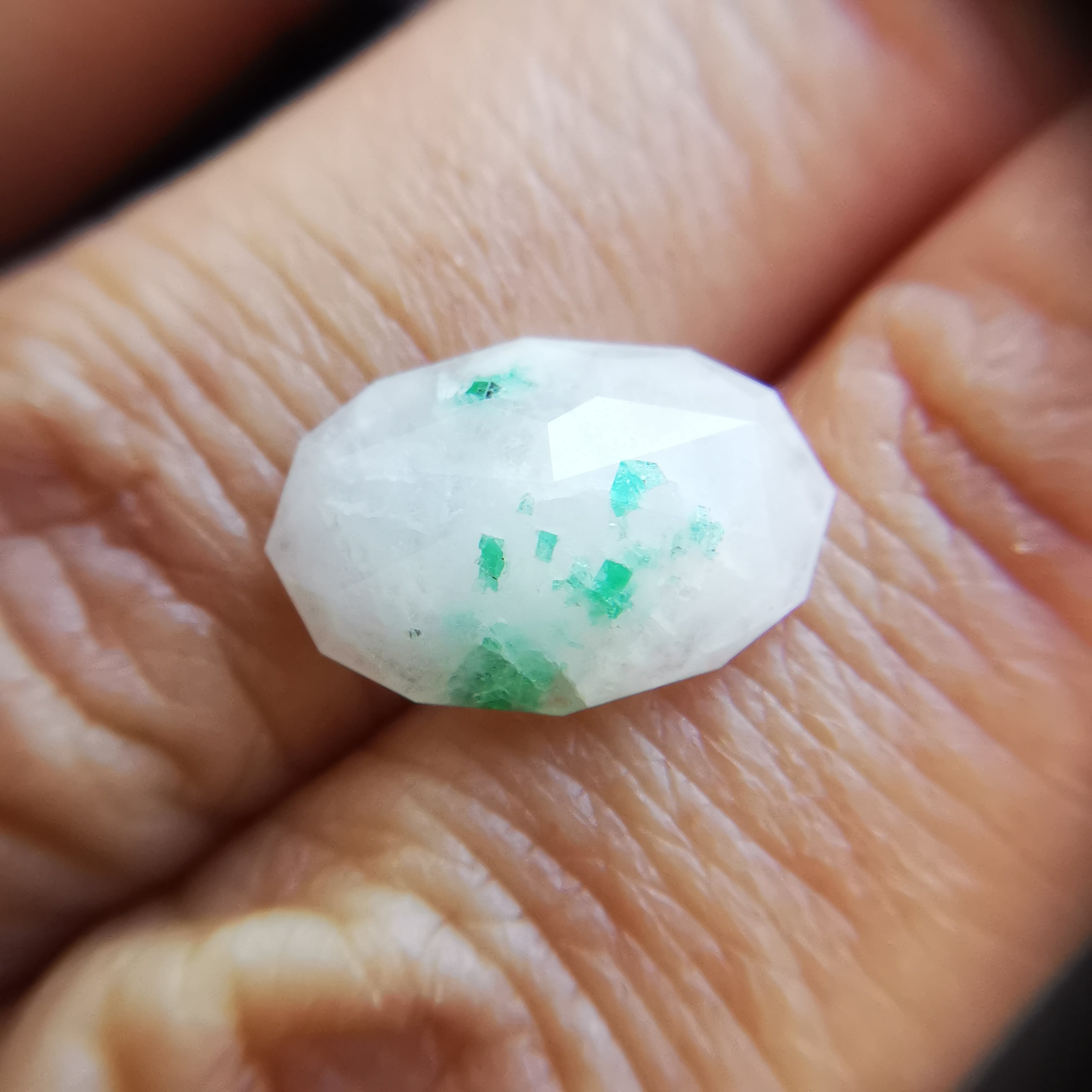 不透明な白いクォーツに、鮮やかなグリーンのエメラルドが散りばめられたエメラルドインクォーツです。