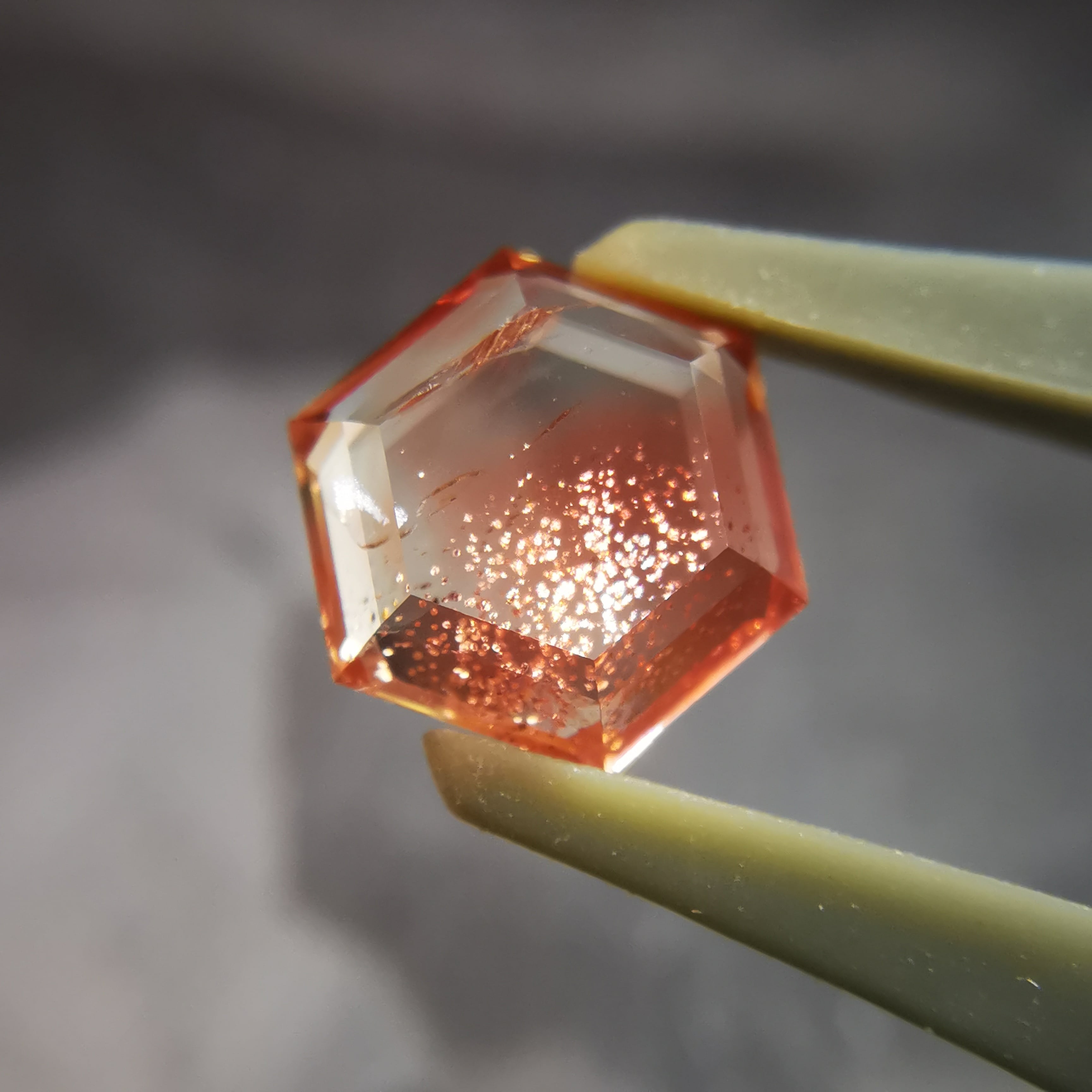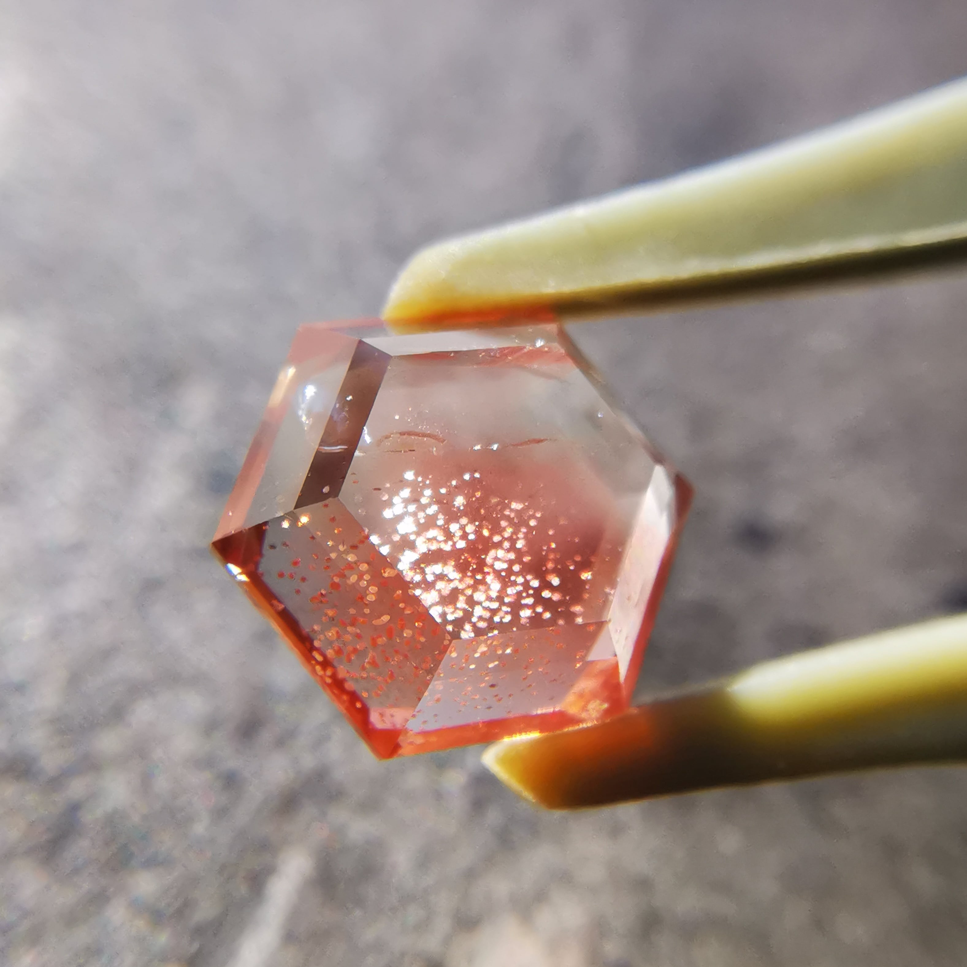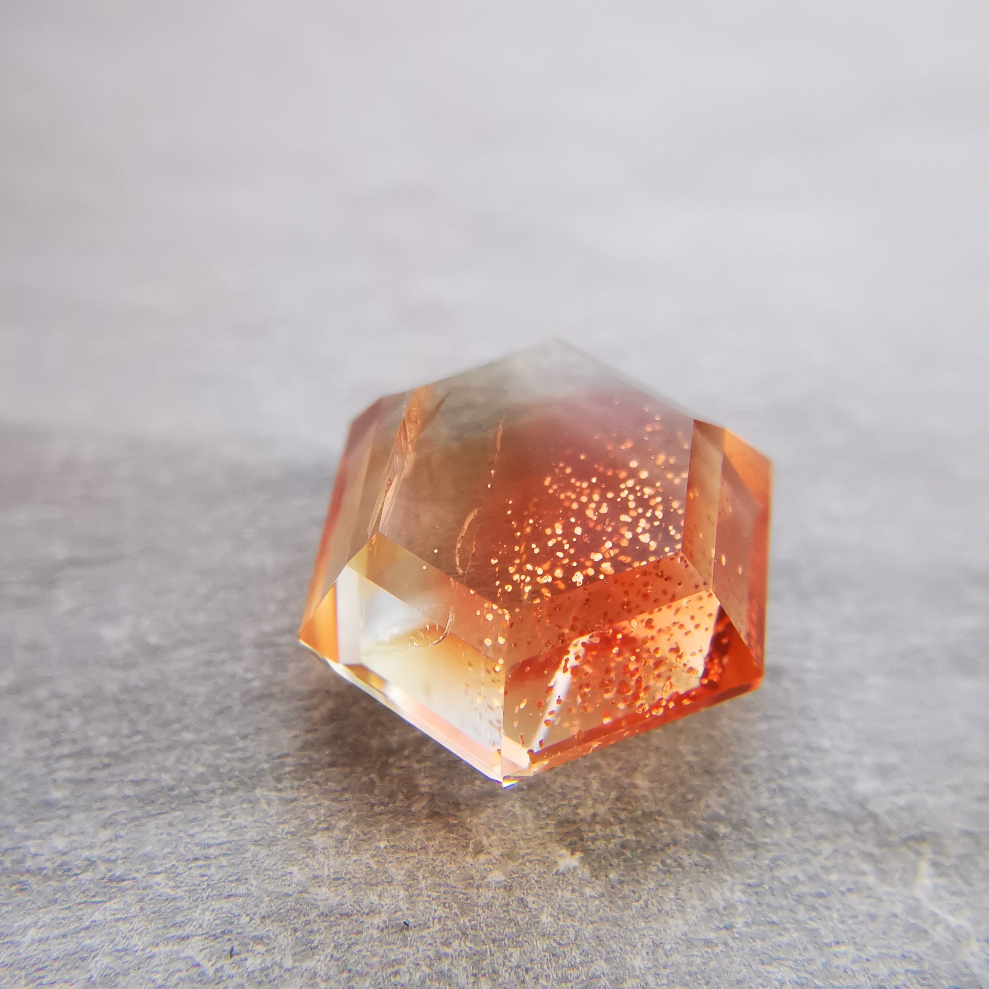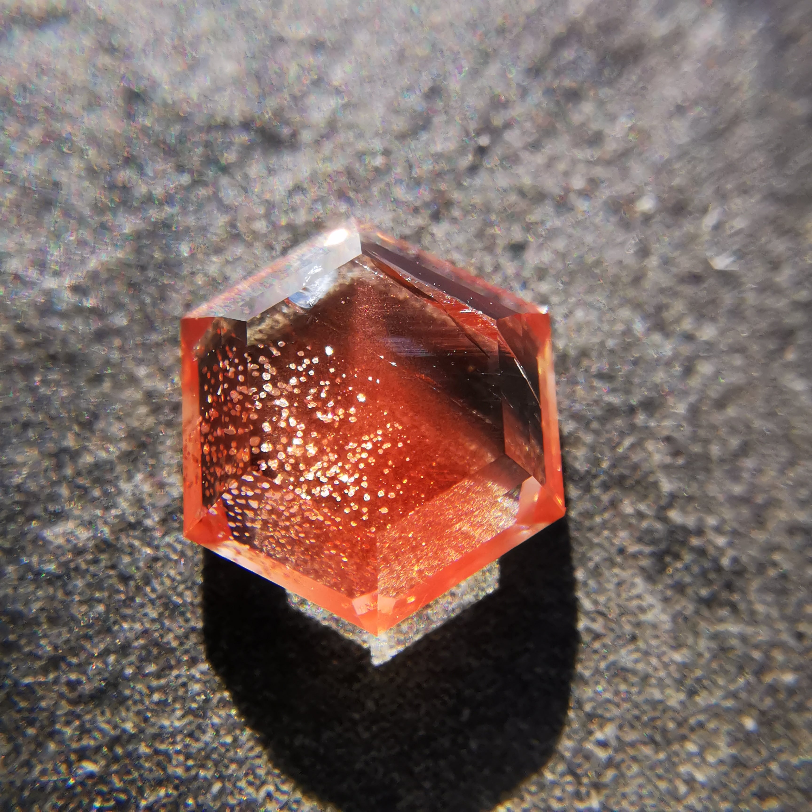 じわりと広がるコパーレッドの上に、パラリと振りかけたような大きめな粒のアベンチュレッセンスがきらめくオレゴンサンストーンです。