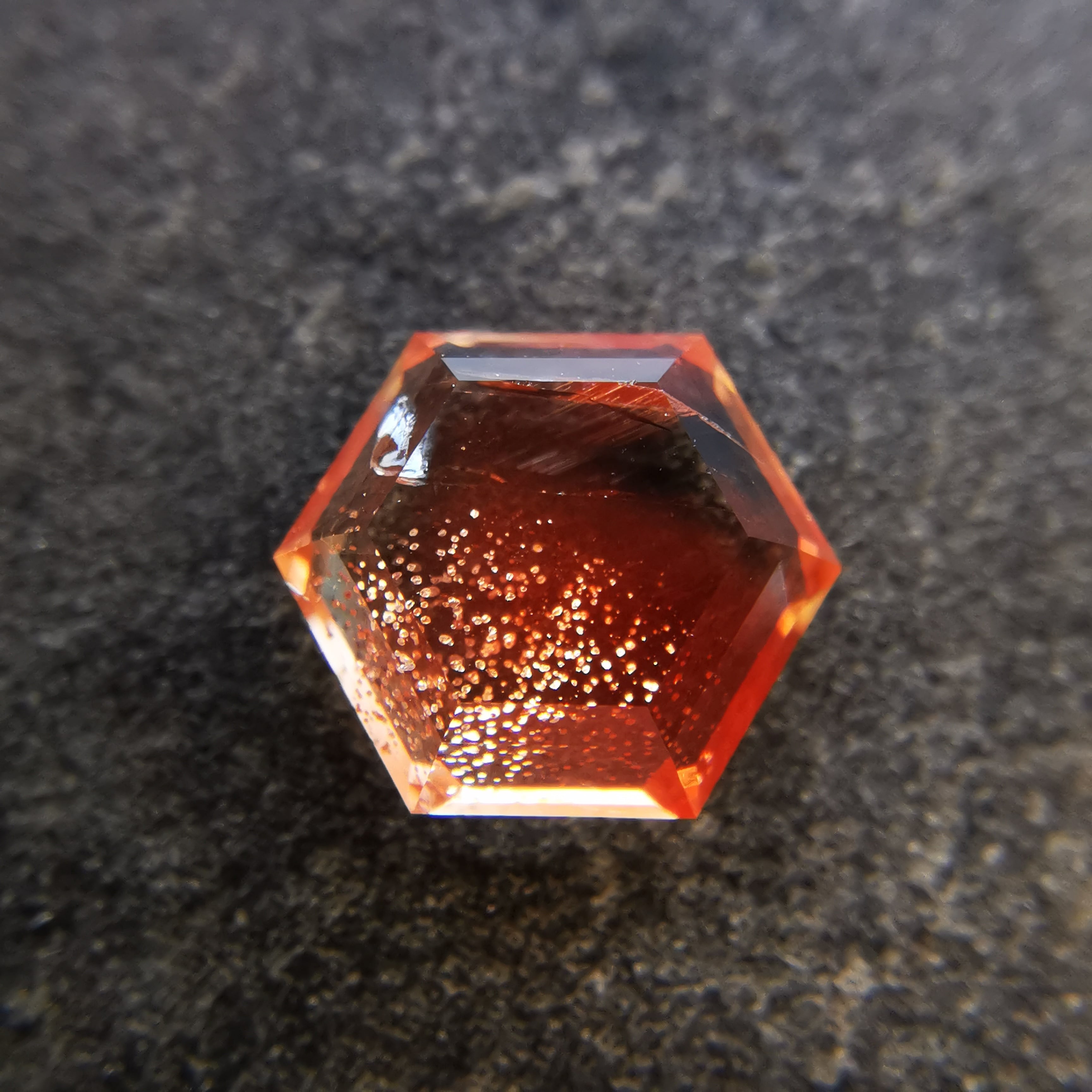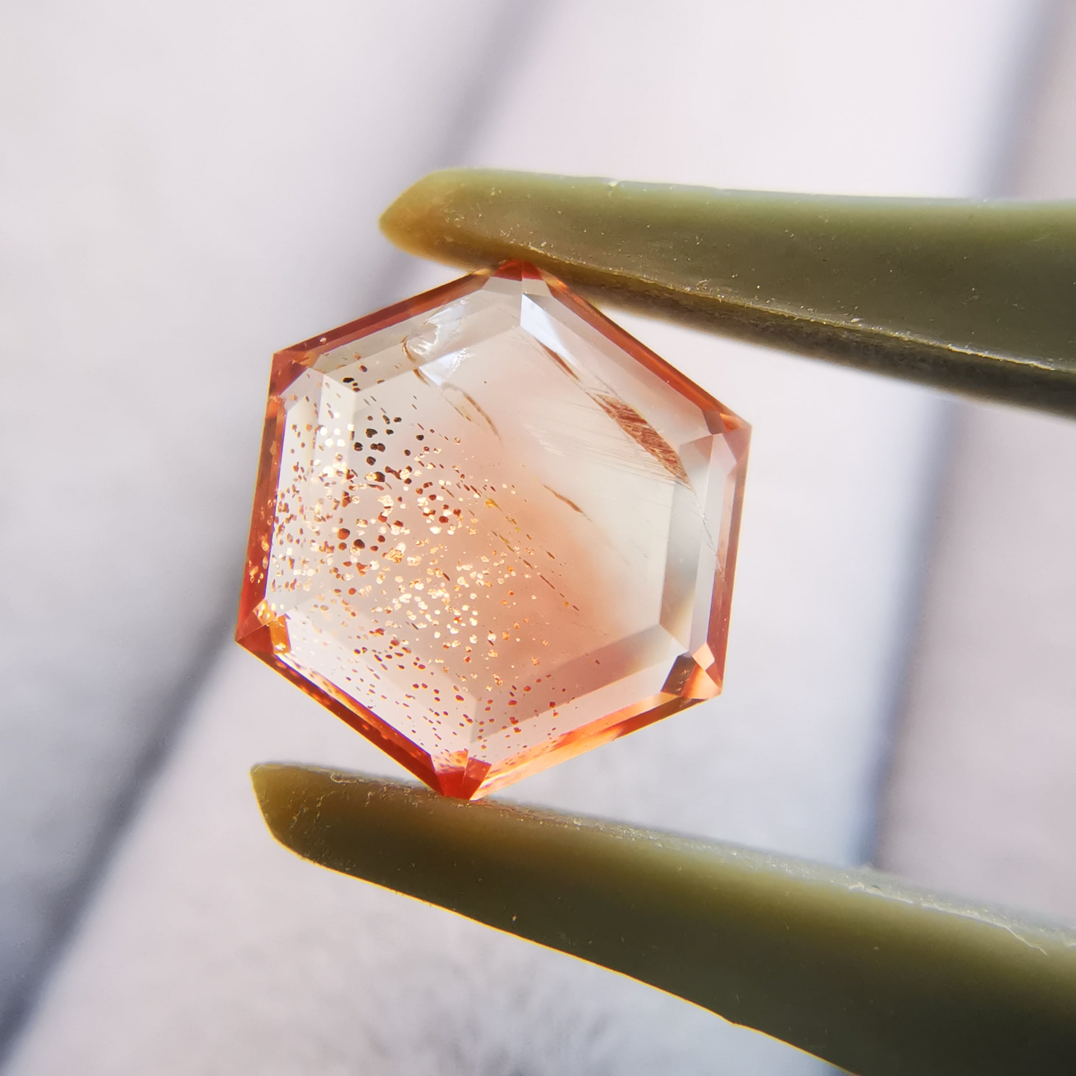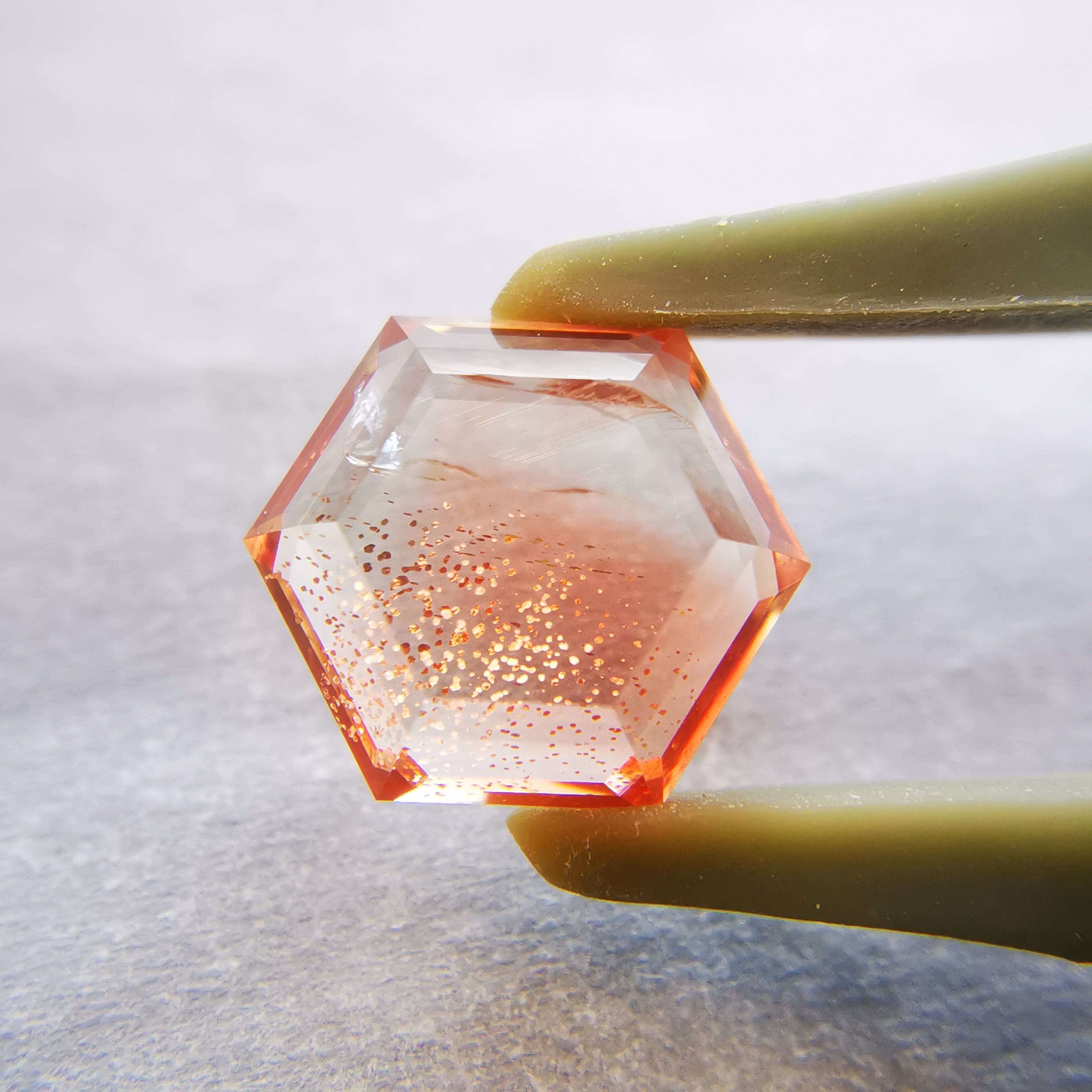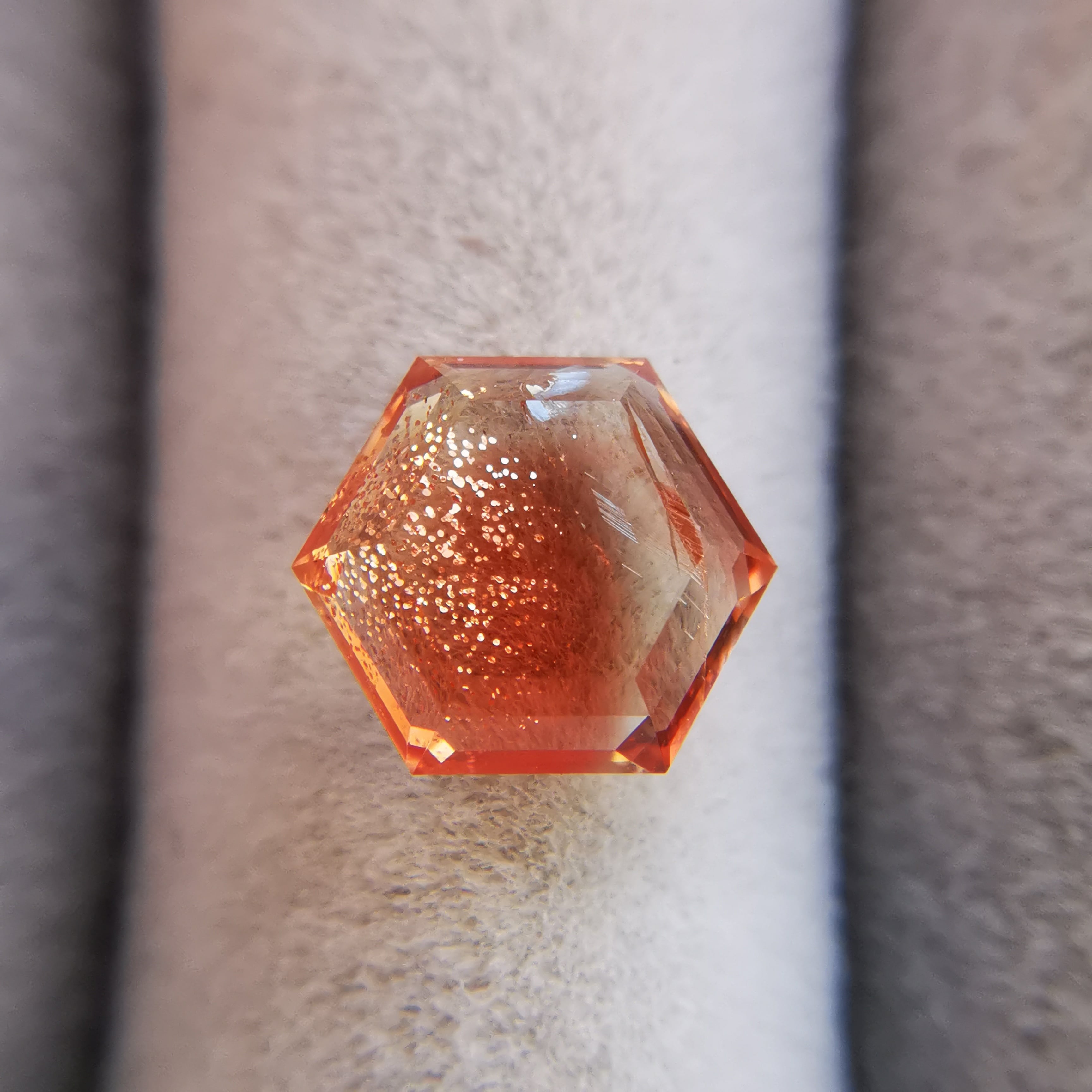 じわりと広がるコパーレッドの上に、パラリと振りかけたような大きめな粒のアベンチュレッセンスがきらめくオレゴンサンストーンです。