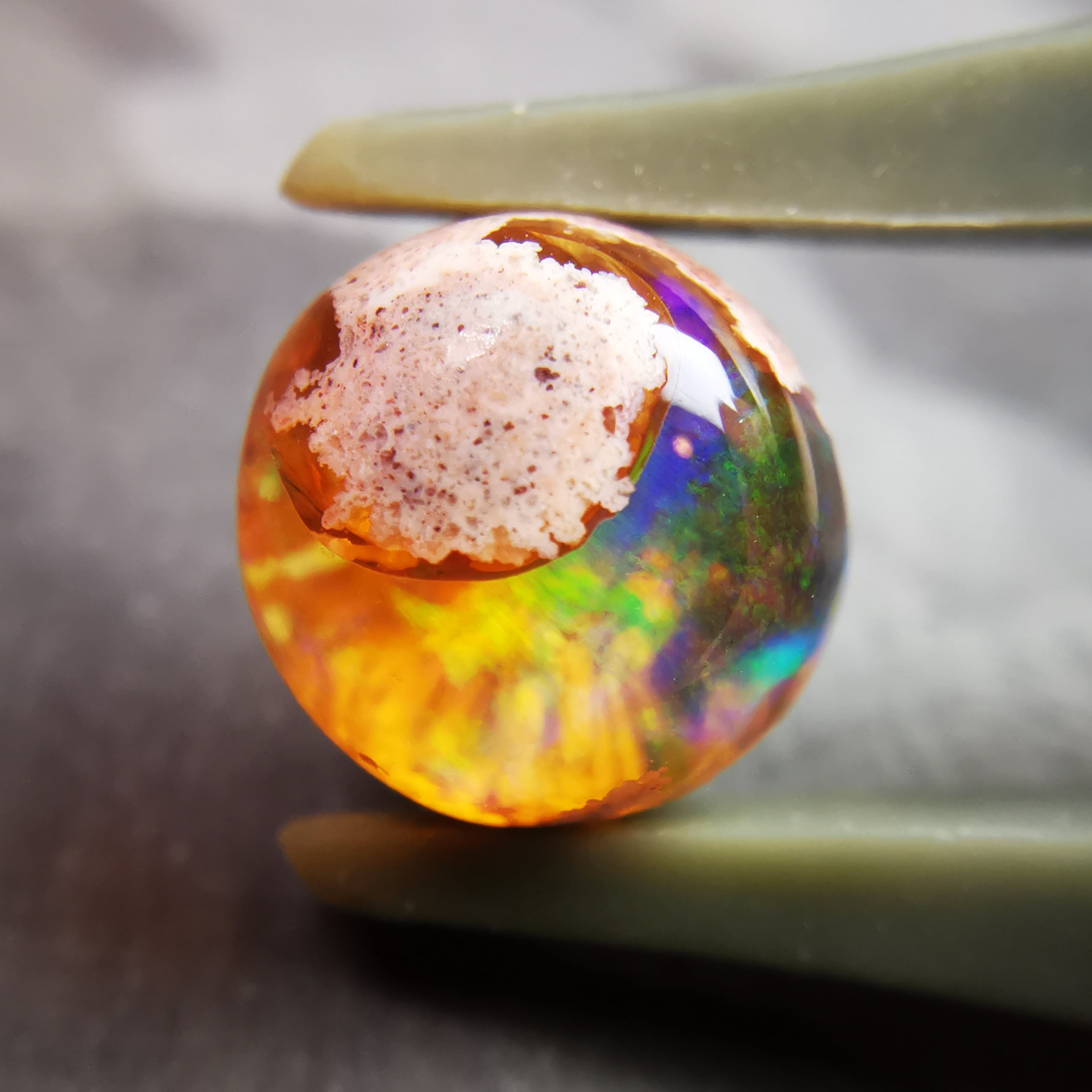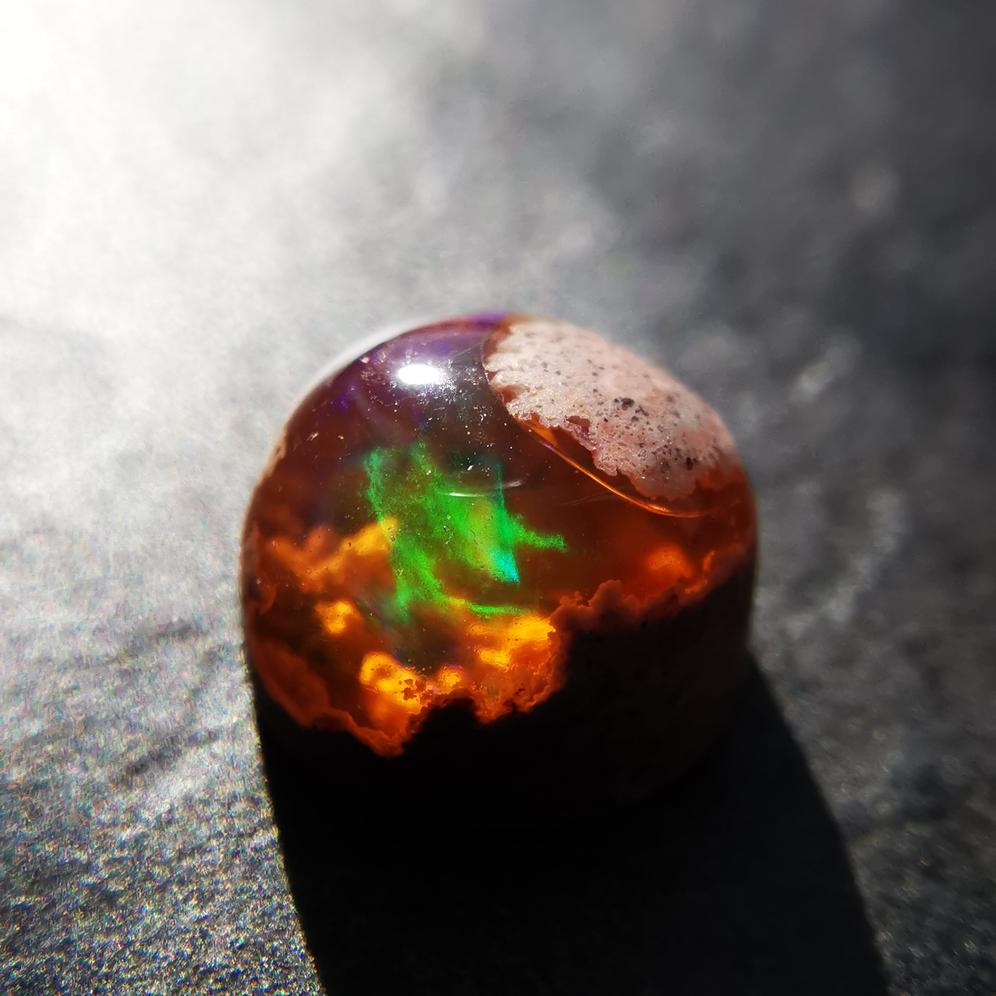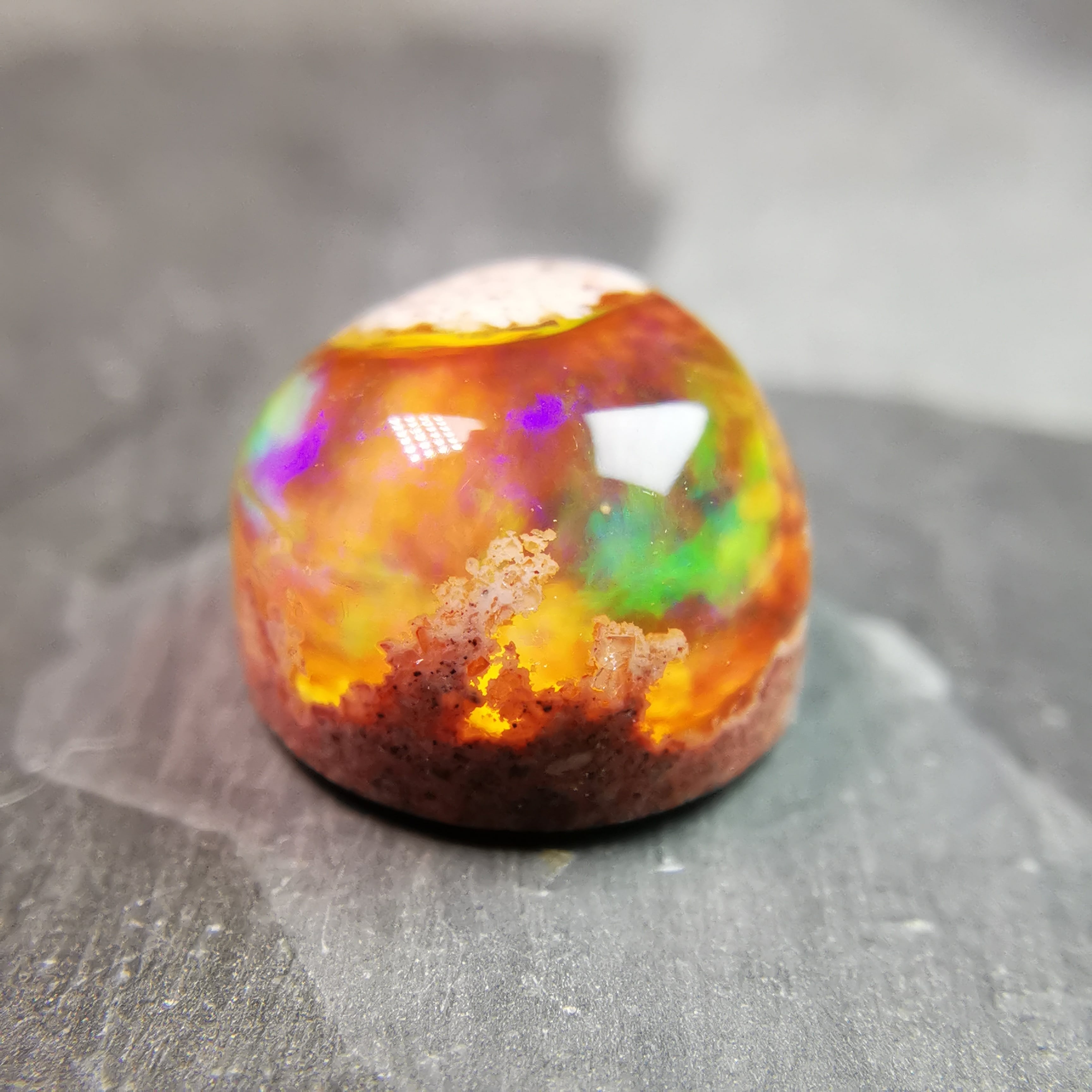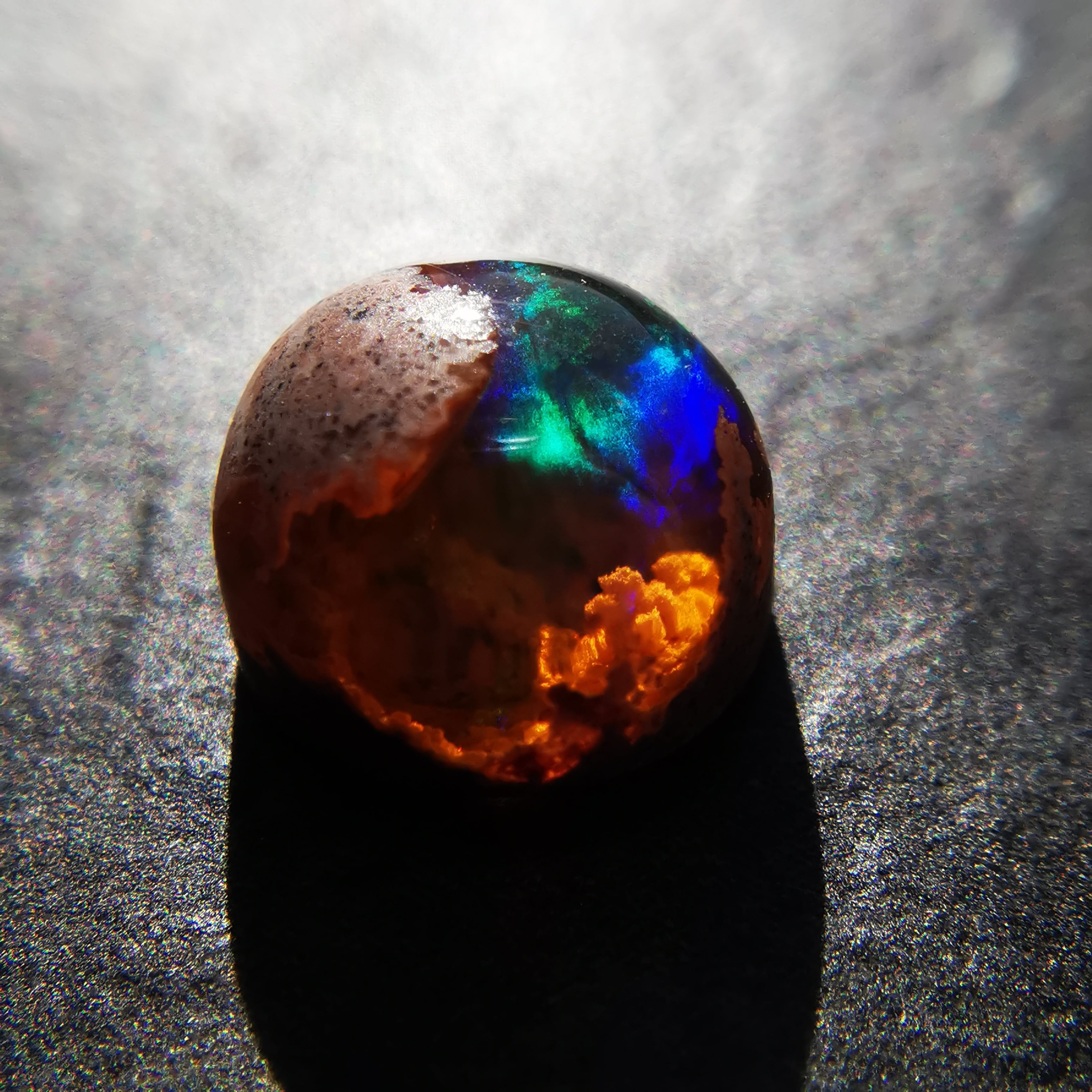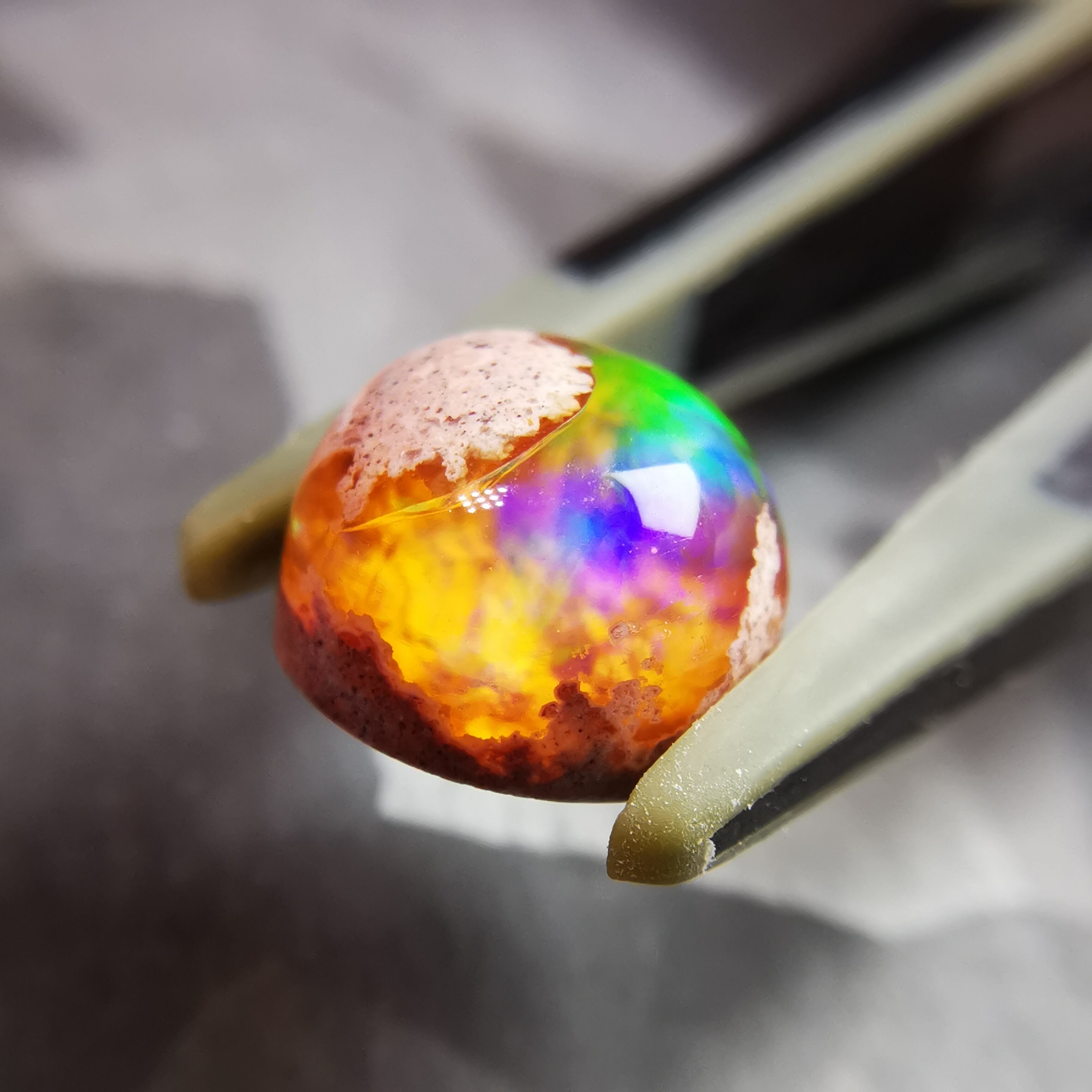 透明感のあるオパール部分の表面に、青や緑や黄色の遊色がメラメラと揺らめくように現れます。