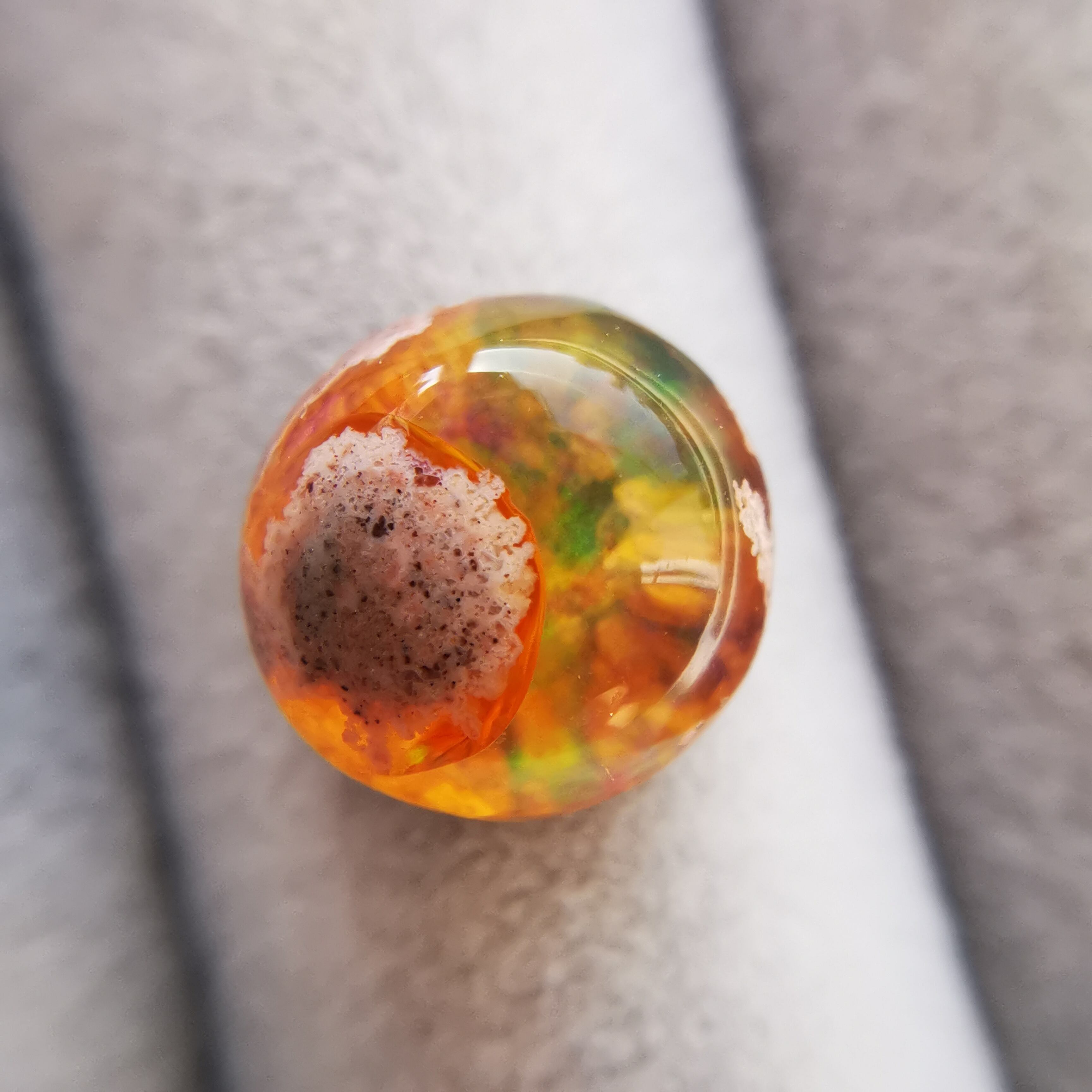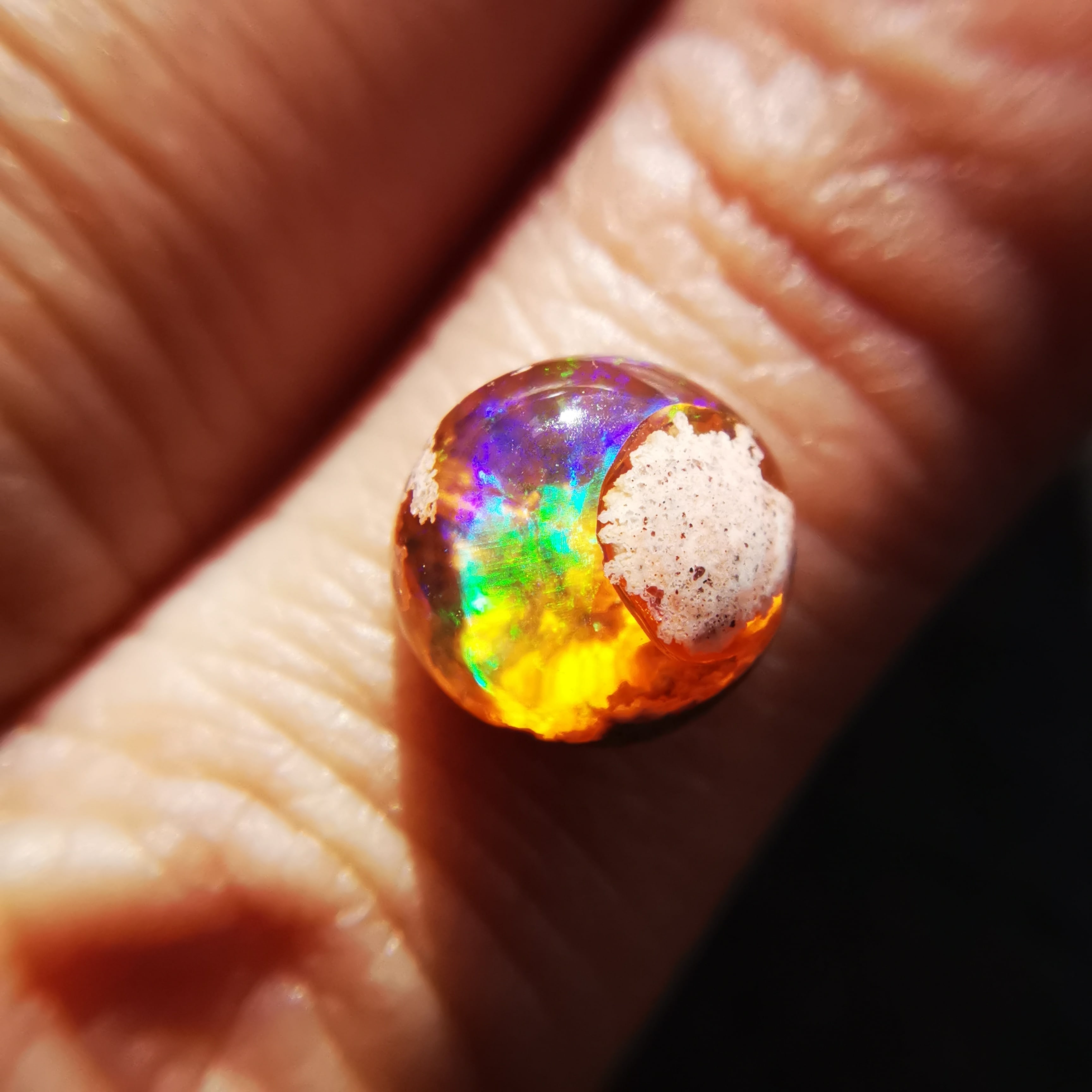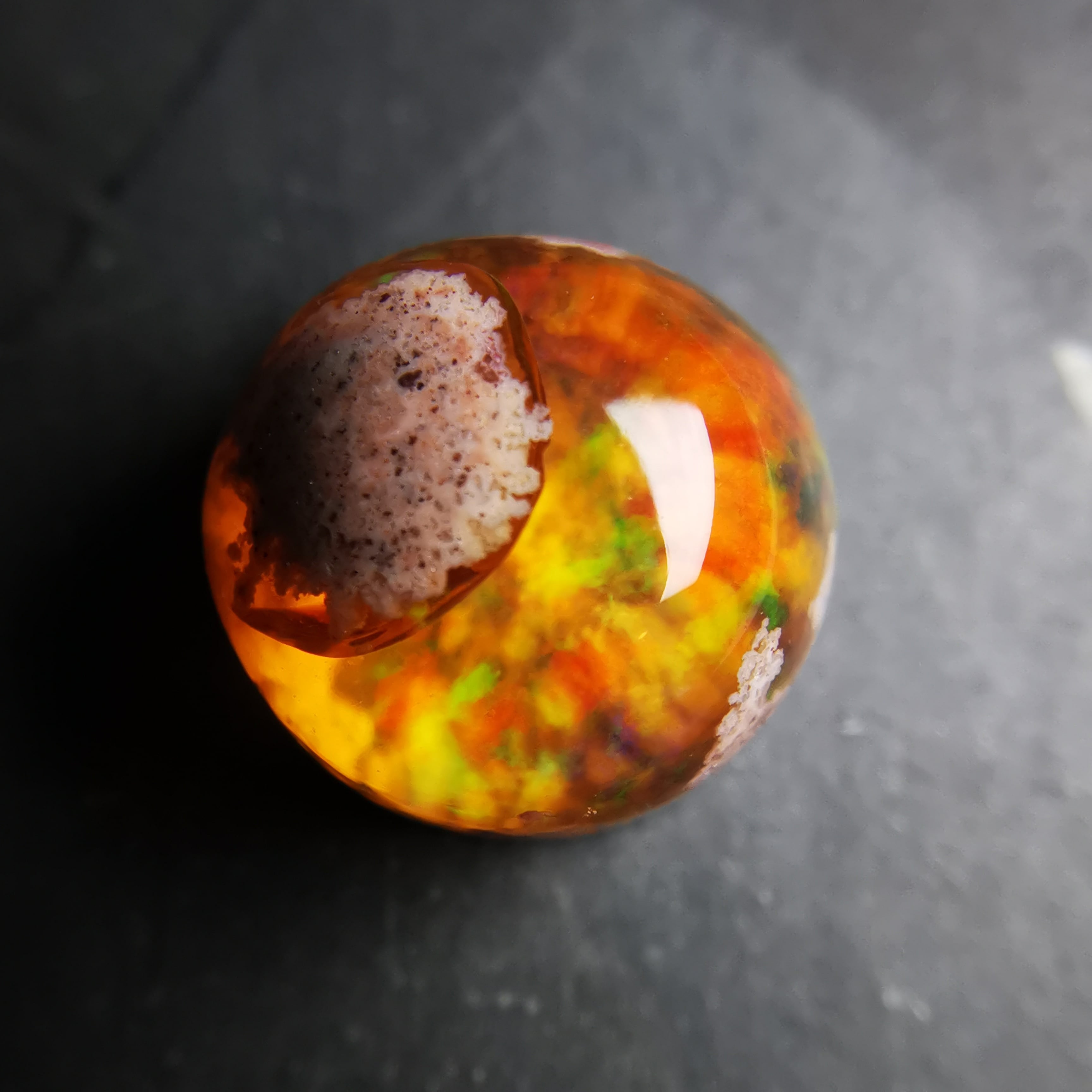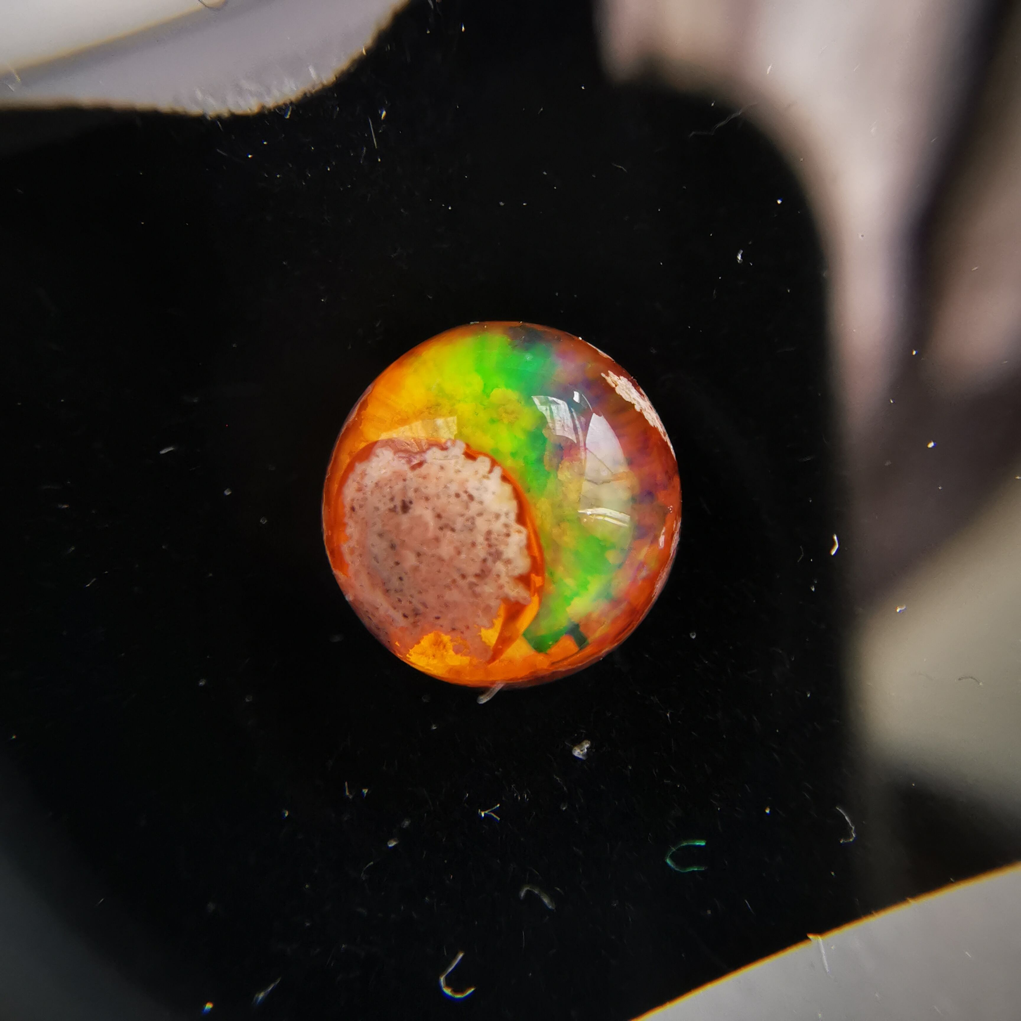 透明感のあるオパール部分の表面に、青や緑や黄色の遊色がメラメラと揺らめくように現れます。