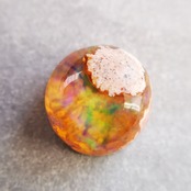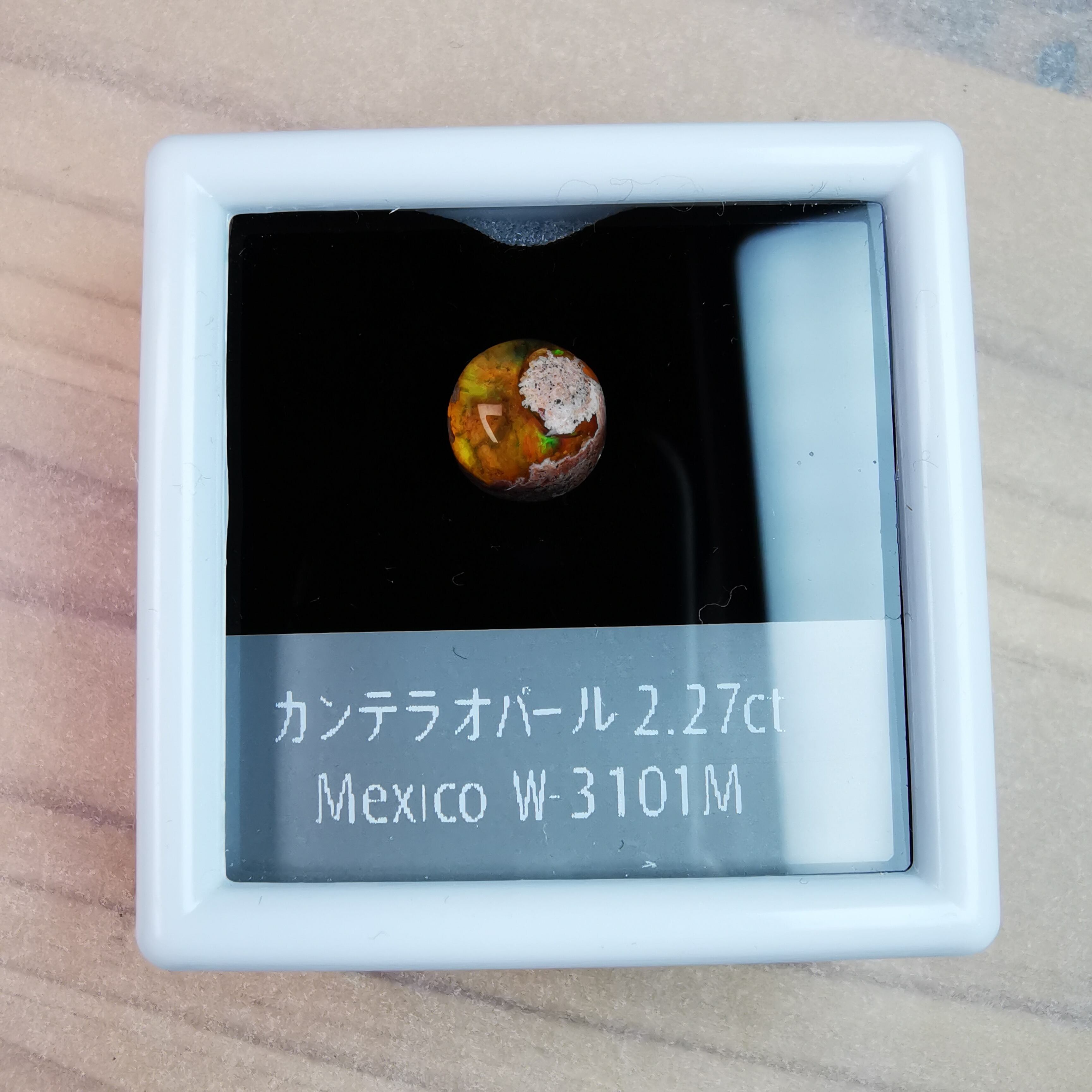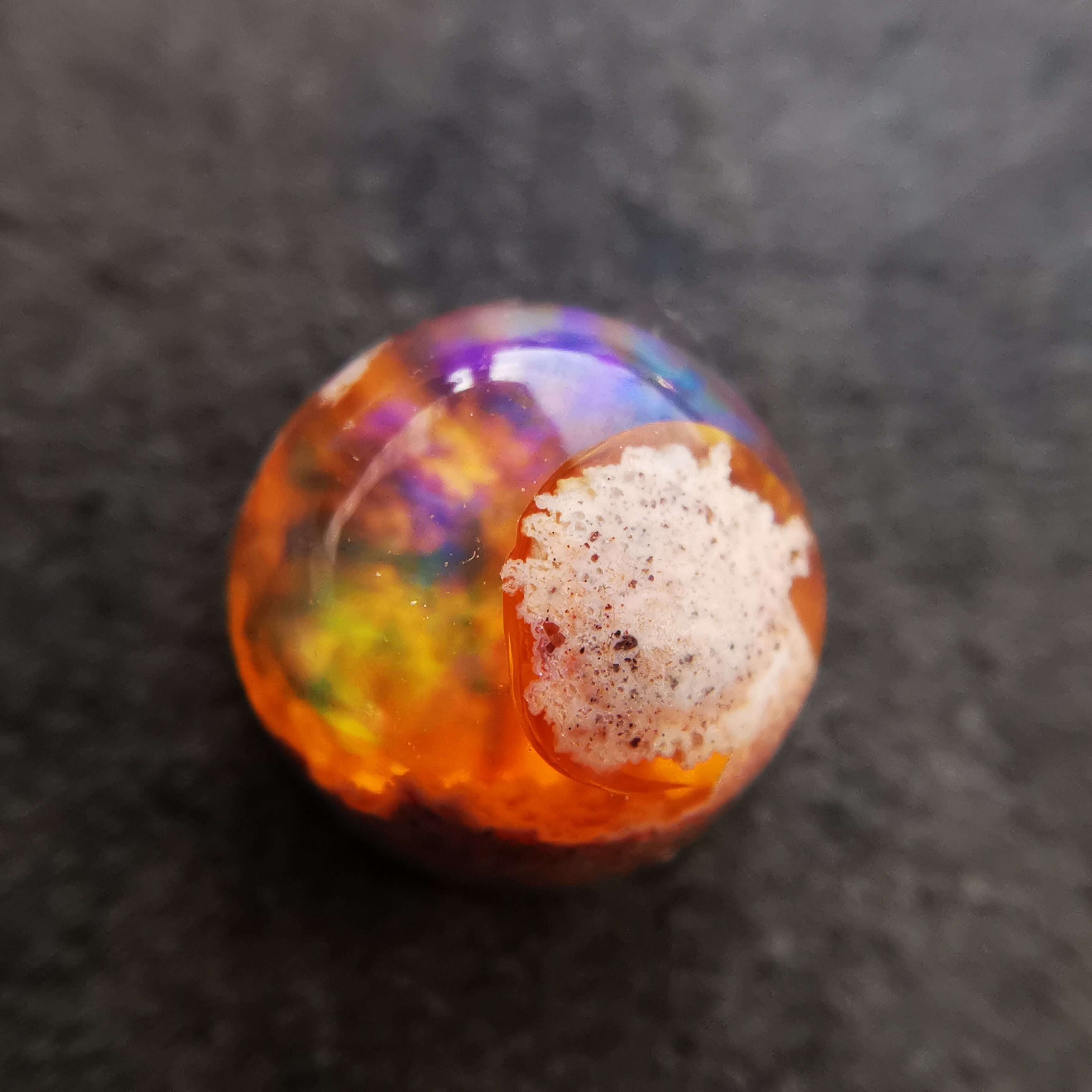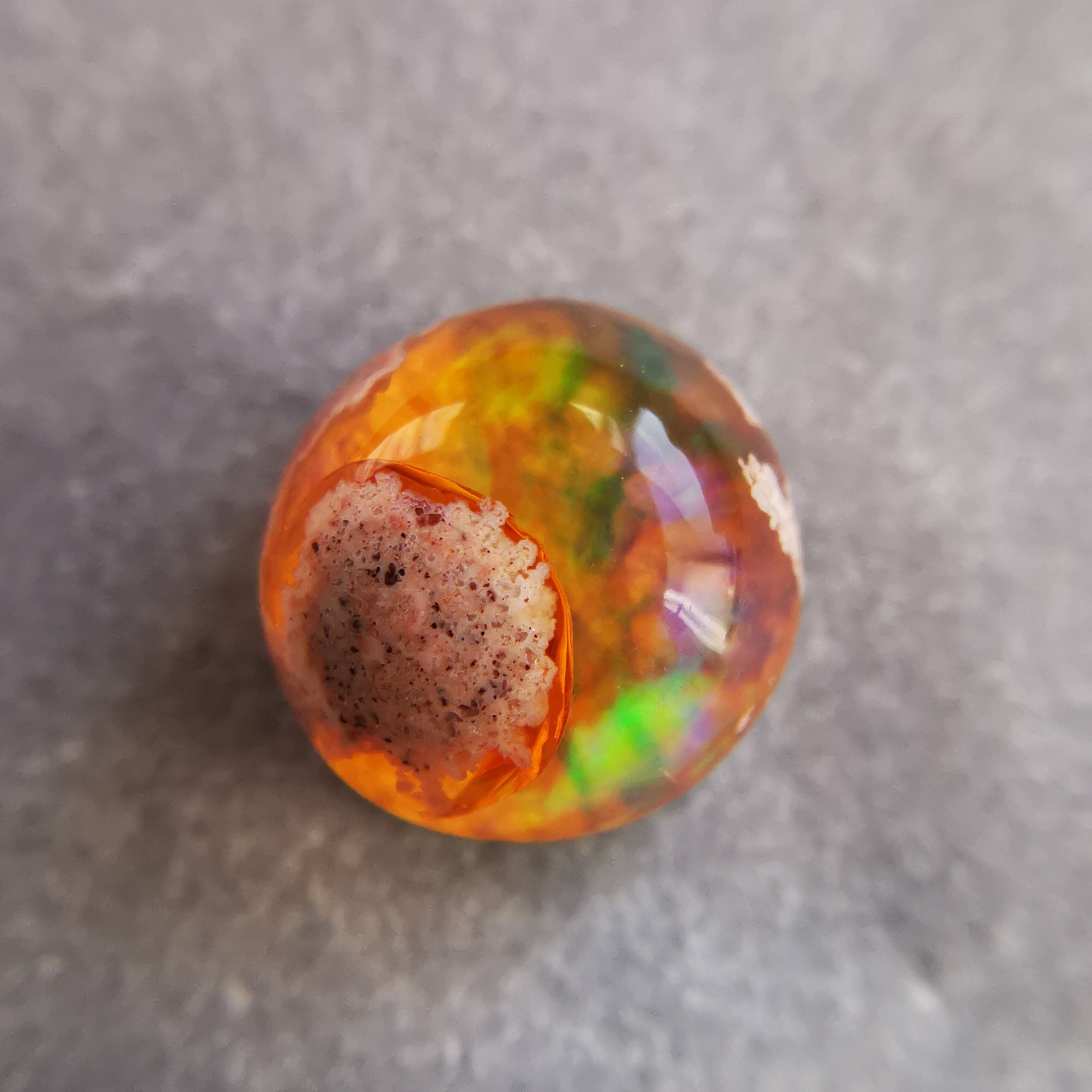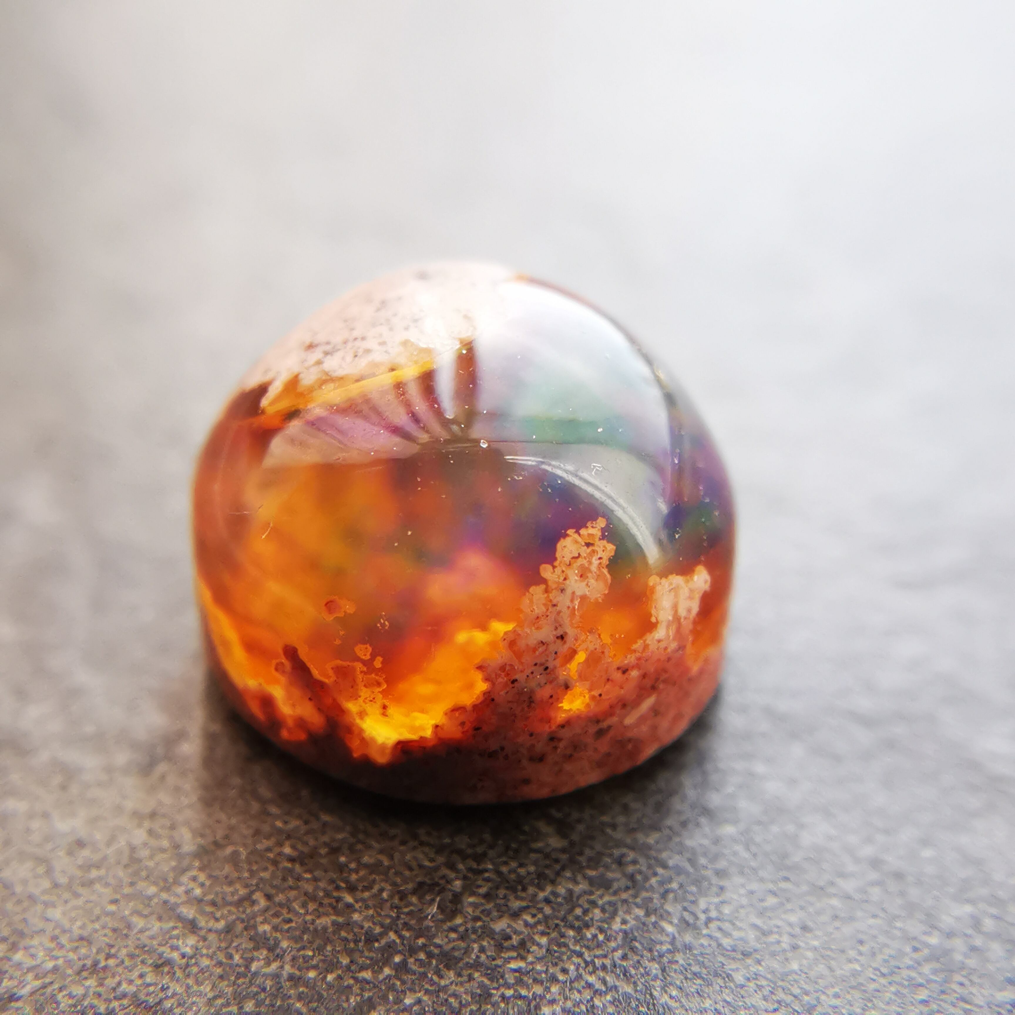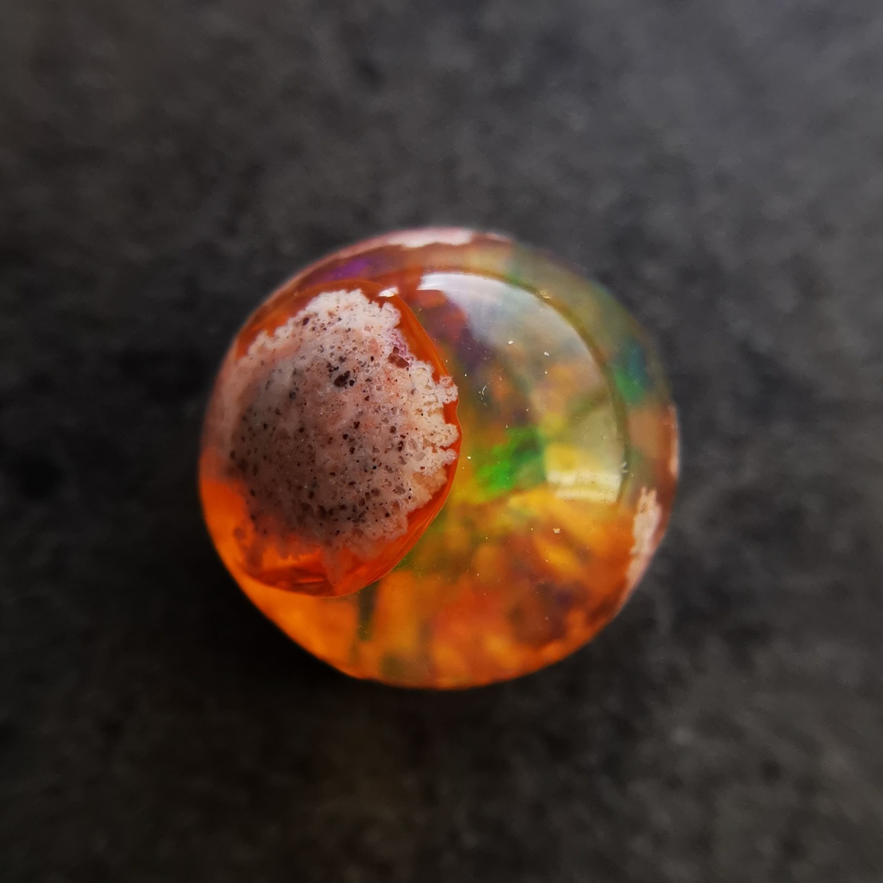 透明感のあるオパール部分の表面に、青や緑や黄色の遊色がメラメラと揺らめくように現れます。