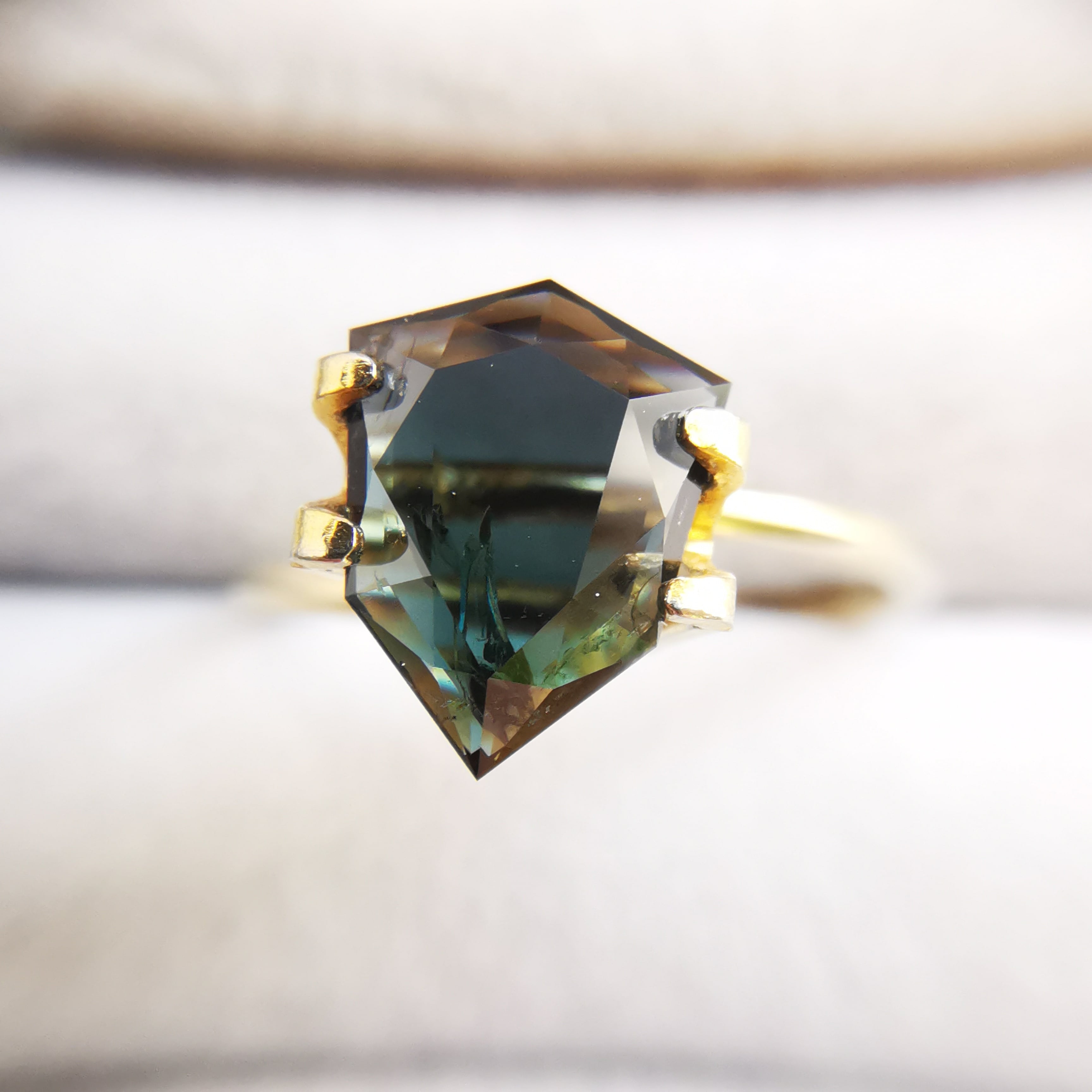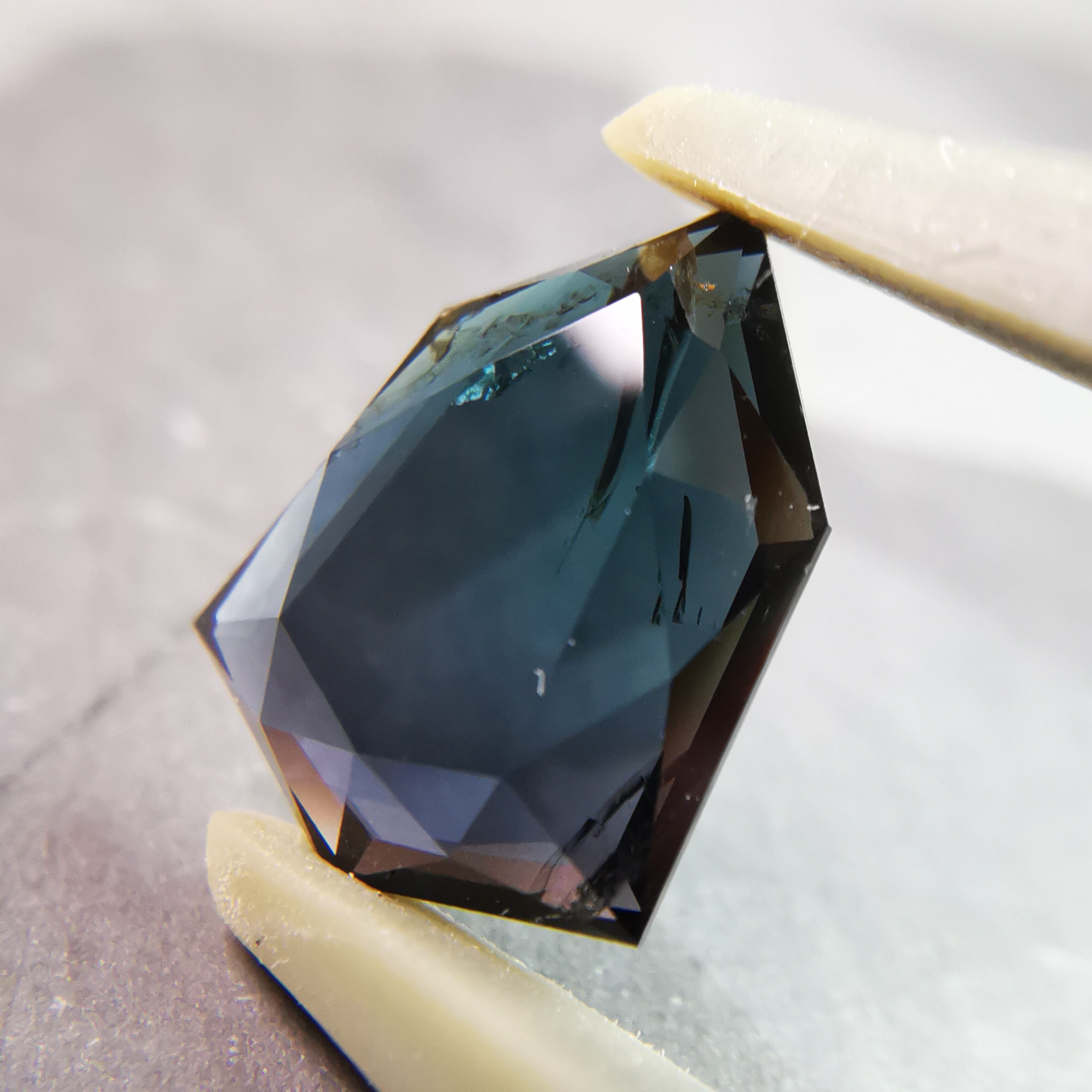 光に透かして見ると、暗い青みの緑/ビリヤードグリーンと、暗い灰みの紫/滅紫色のバイカラーになっていることが分かります。