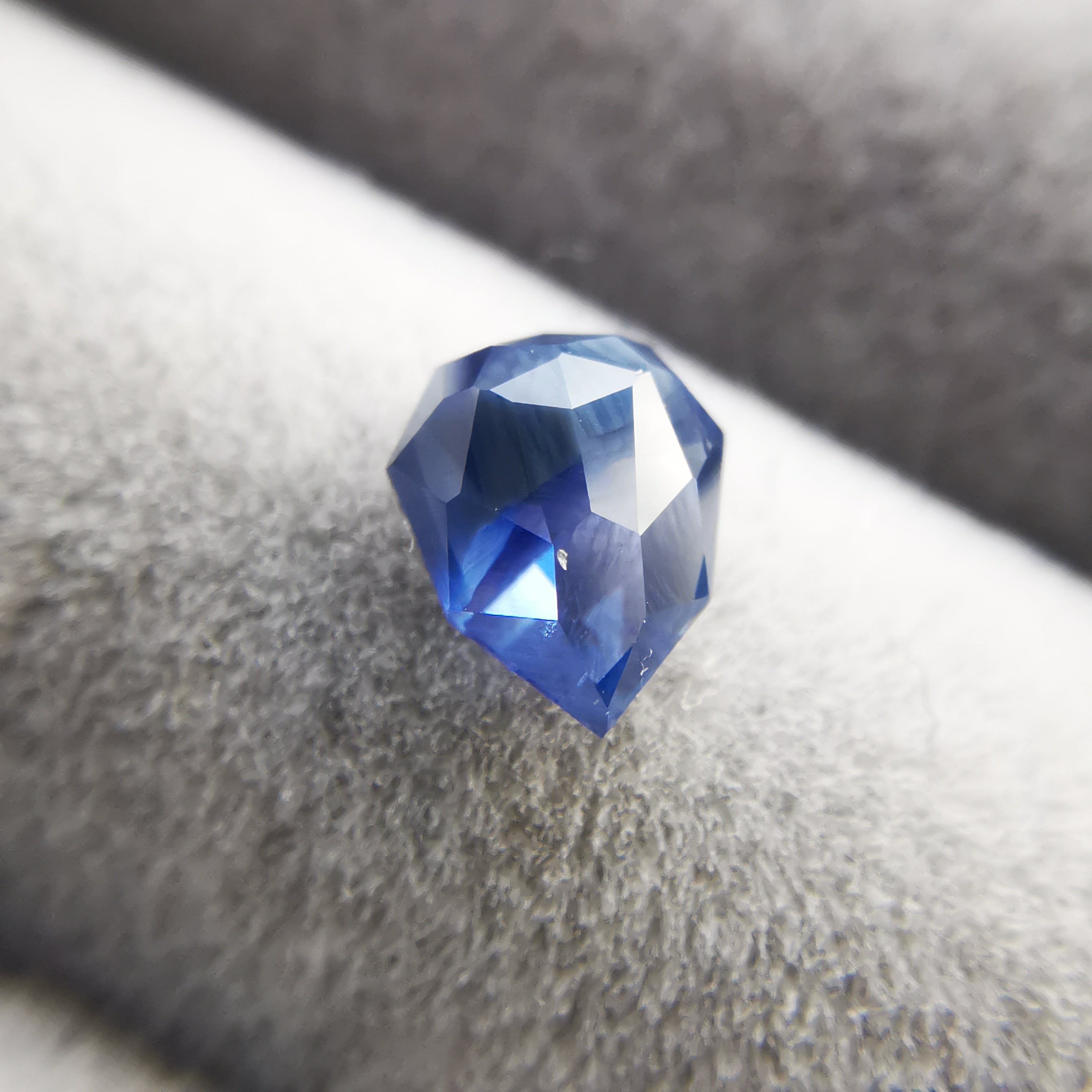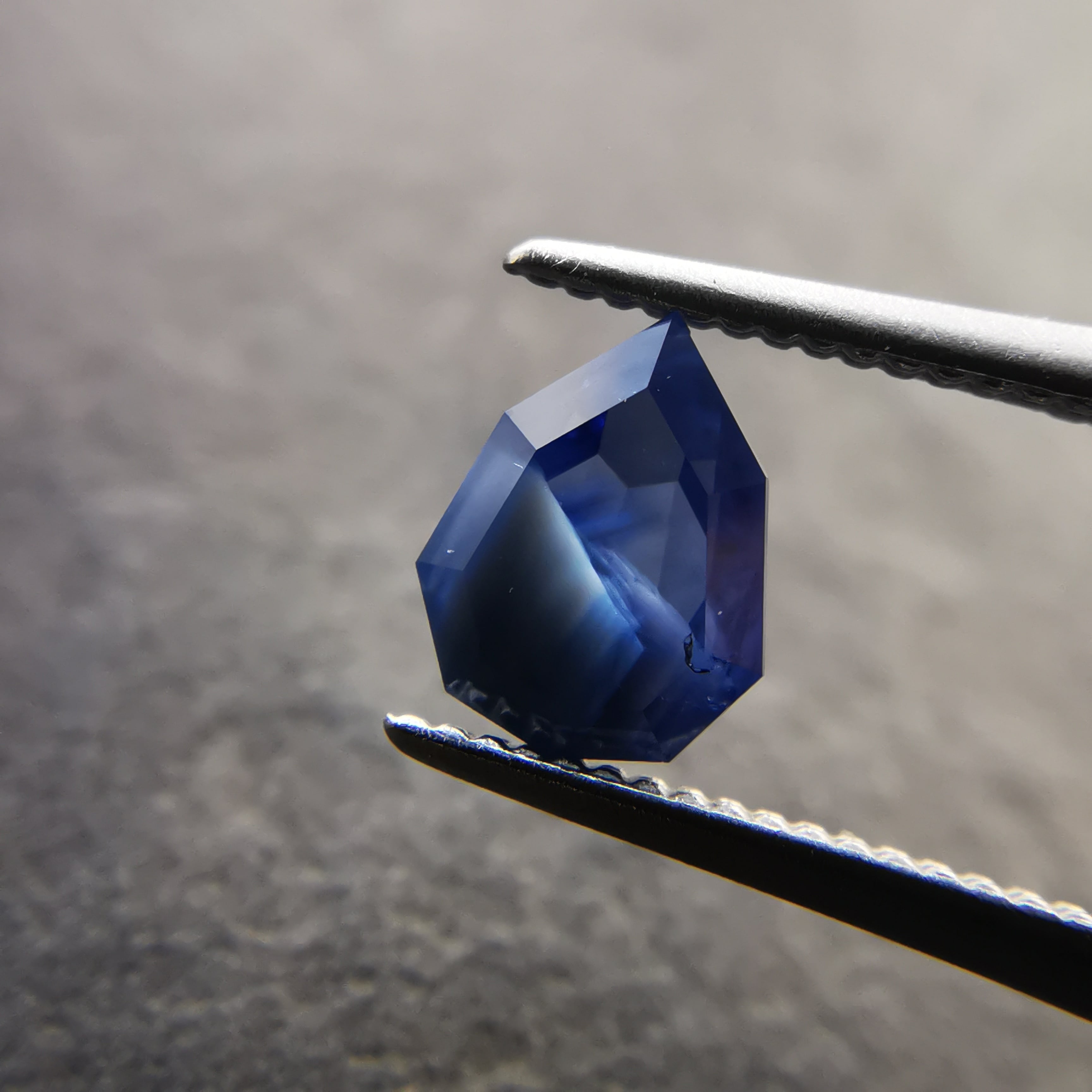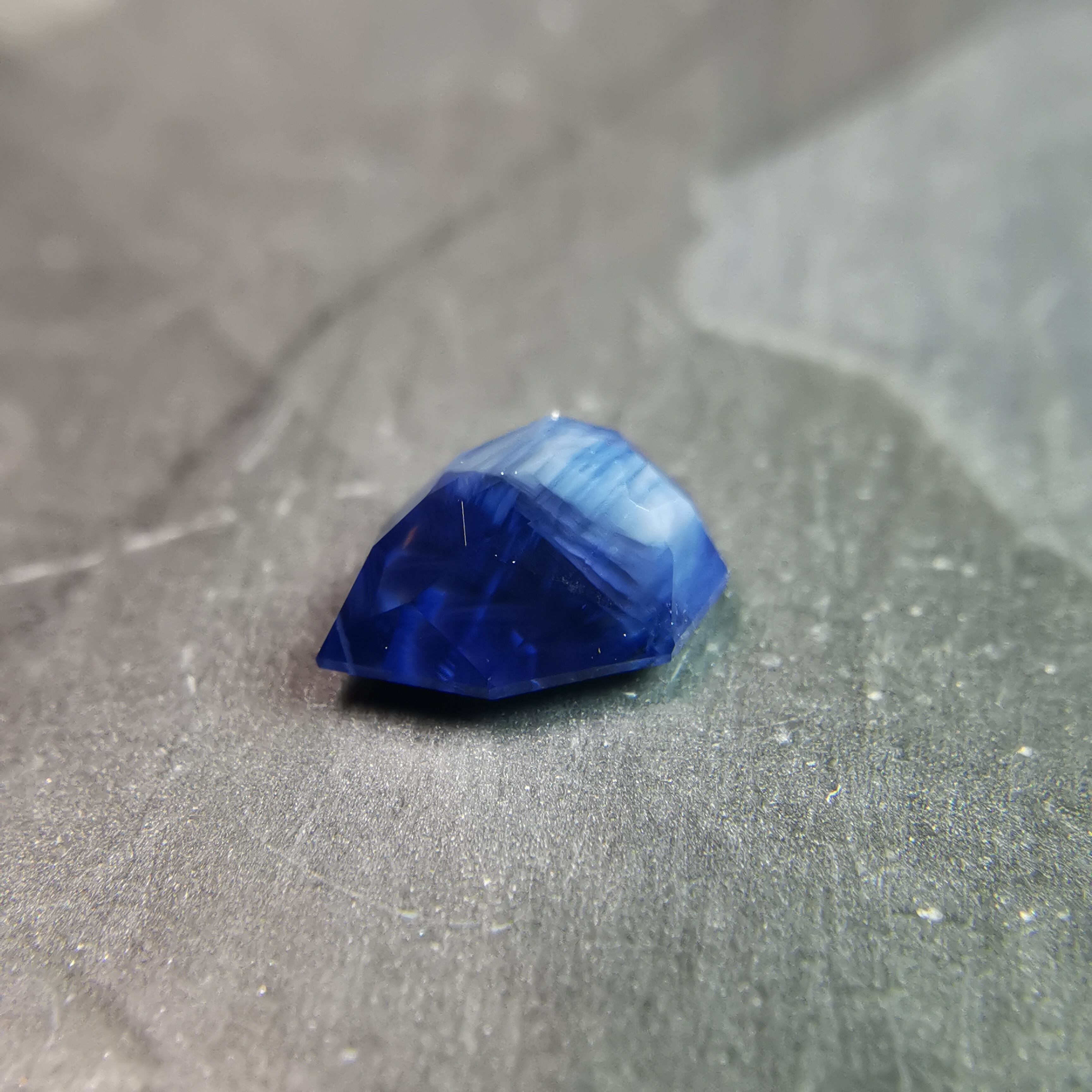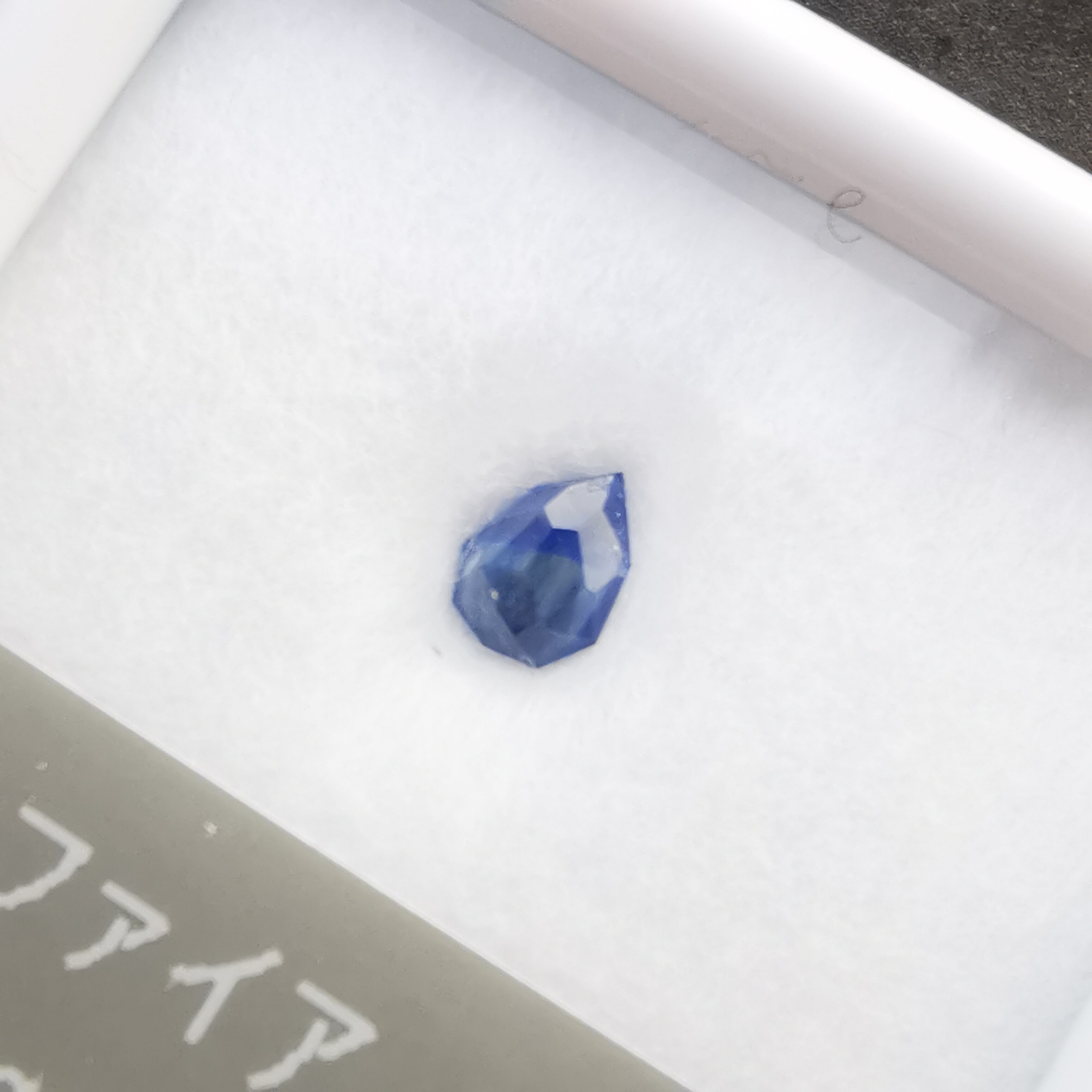 淡い瑠璃紺色に濃厚な不透明なブルーグレーが入ったサファイアです。
